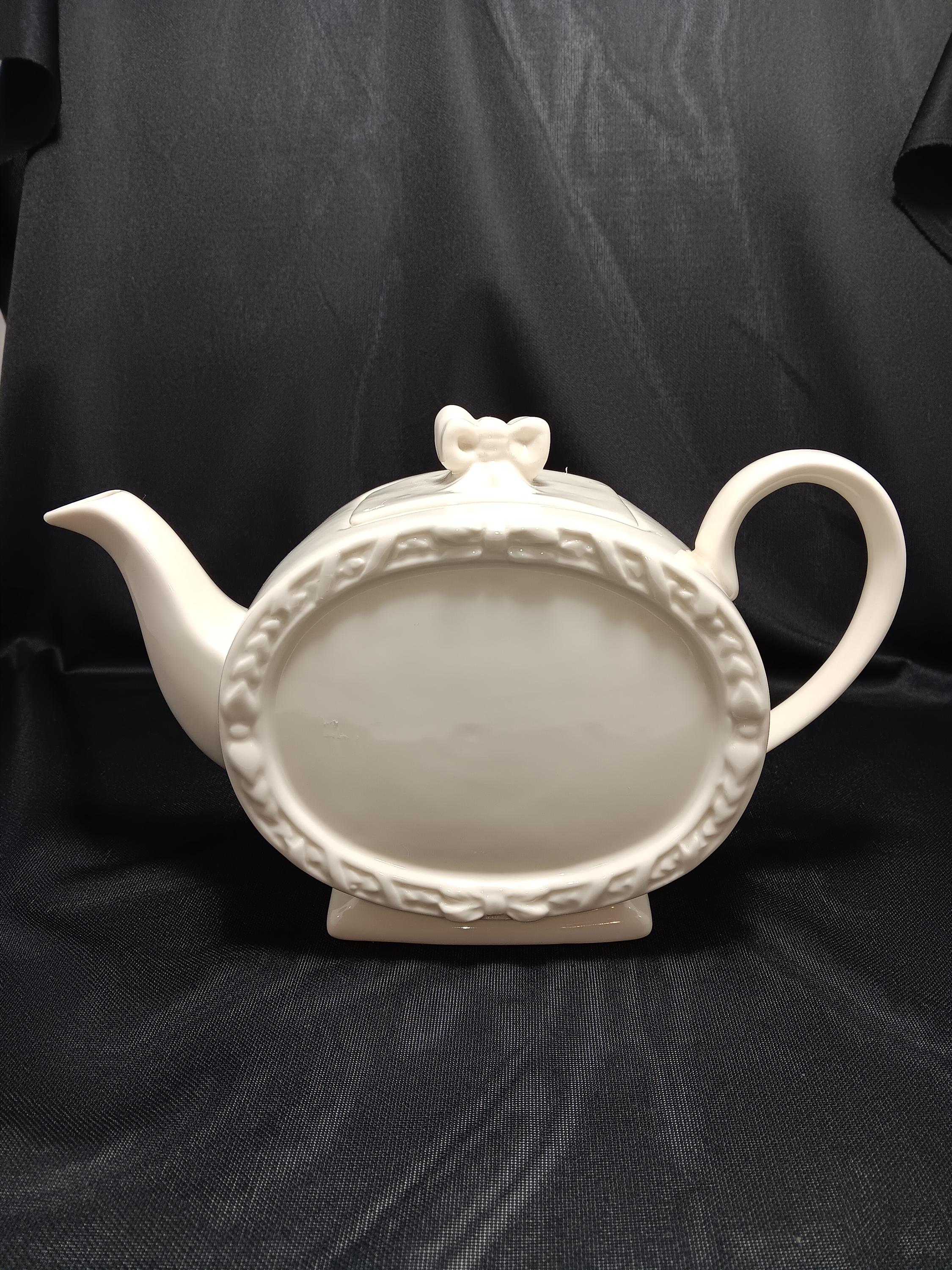 Beautiful Godinger Co. tea pot is sweetly designed with ribbons and bows. The elegance of this piece is perfect with any decor or a bridal table. Vintage 70's rare find oval shape done in Ivory glaze tea pot is everything! Measures 6" tall and 5.5" diameter. Holds about 3/4 of a quart.