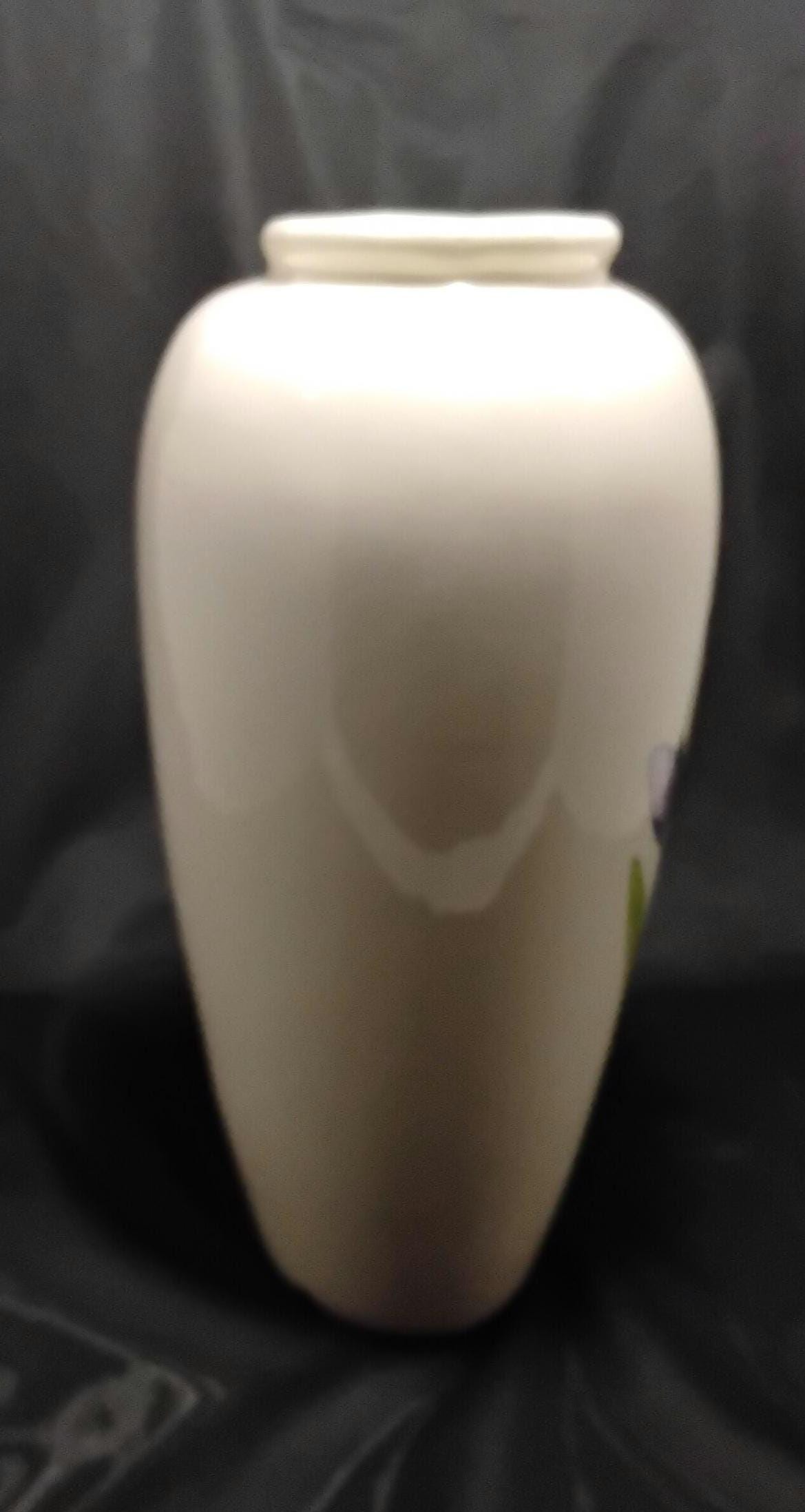 This vintage lovely vase is handmade, handpainted pottery. The Iris flower is simply done in vibrate colors of greens and purples against a cream color glaze. Simple hobbyist piece done beautifully. 11"tall, 6.5" wide. Marked on bottom. Vintage 1998. No chips or crackes. Excellent condition.
