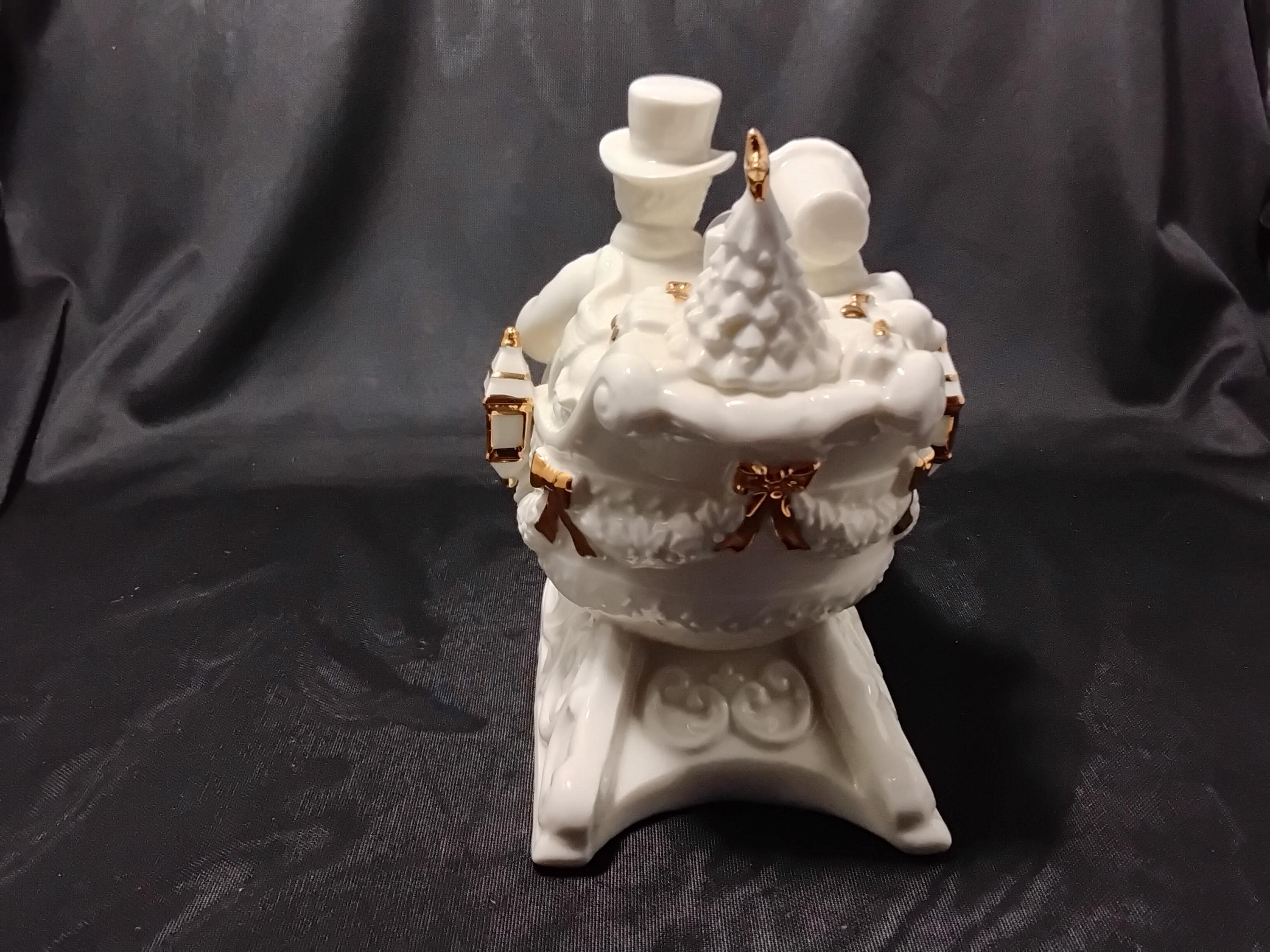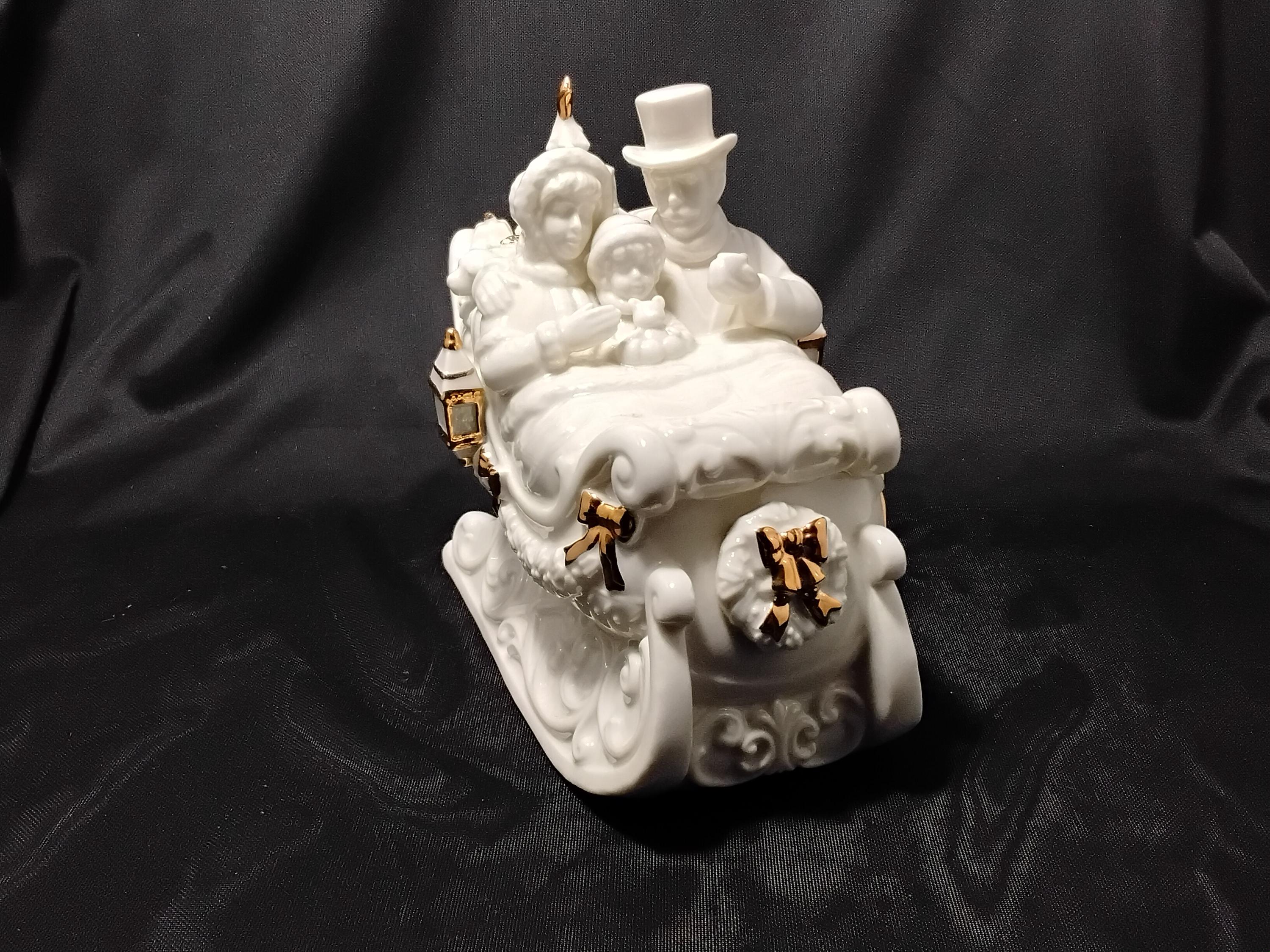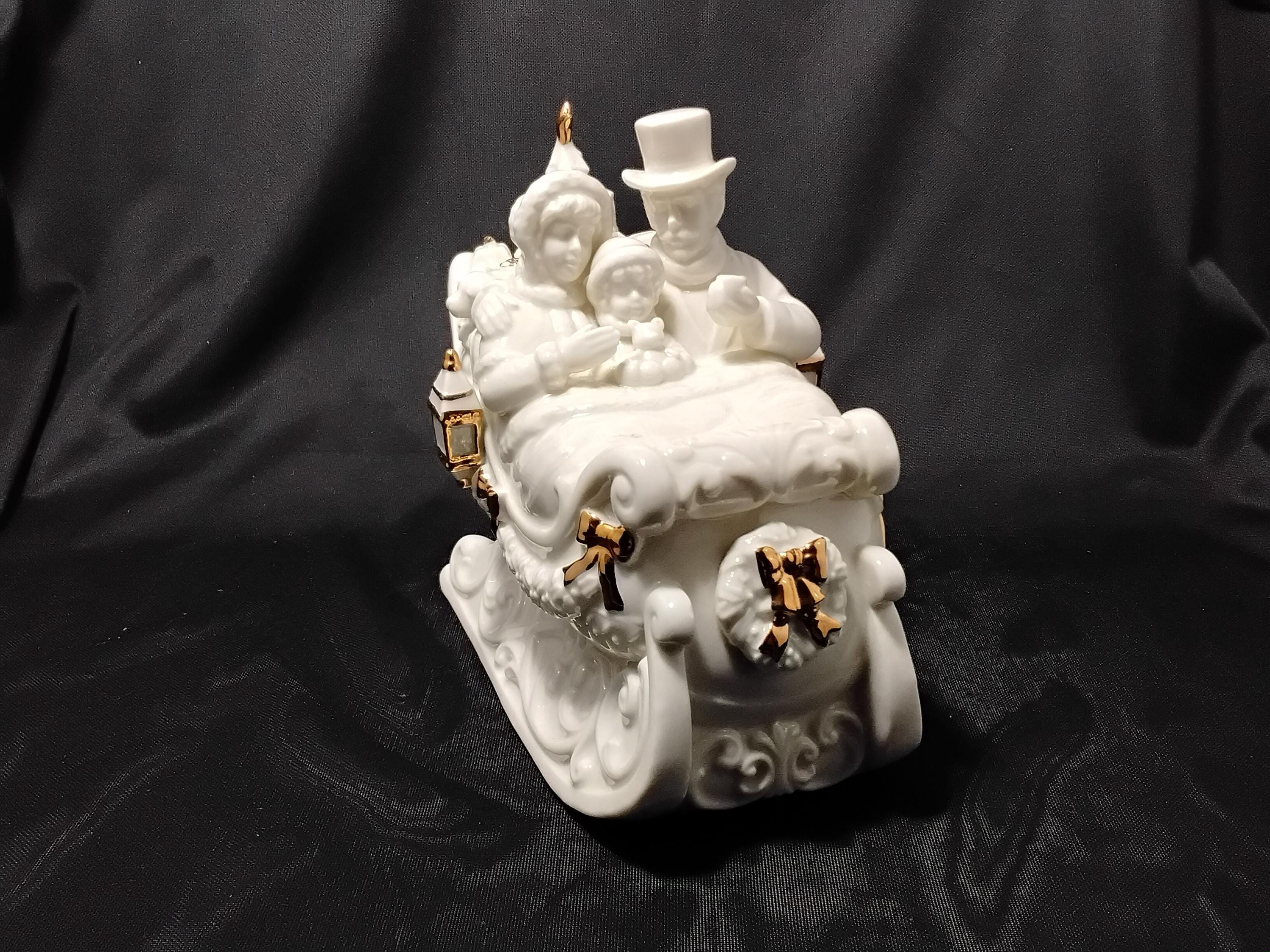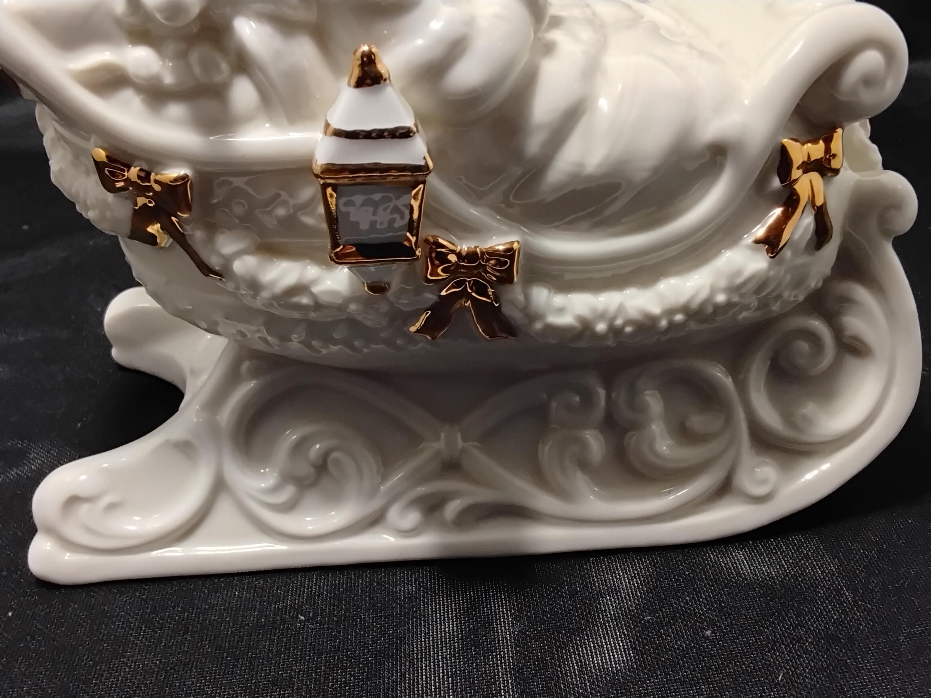 This unique collectors music box Christmas sleigh will be a stunning addition to your holiday decor. Made by Holly Tree China. Lots of beautiful detail and the gold trimmings are stand out gorgeous. Measures 7.5" tall and 7.5" long, 4.5" wide. Excellent condition no chips or cracks. Music box works great playing" Have Yourself a Merry Little Christmas."