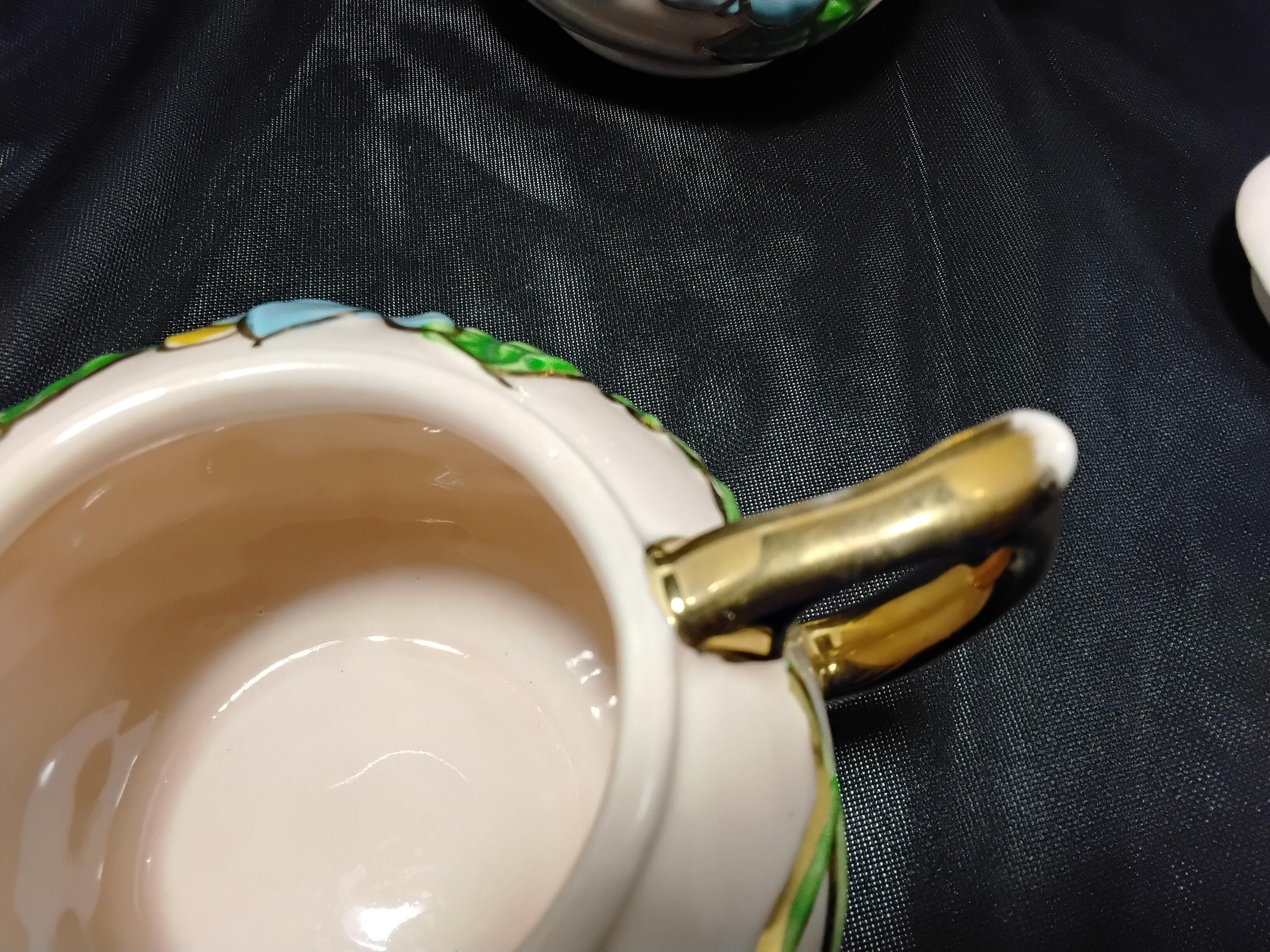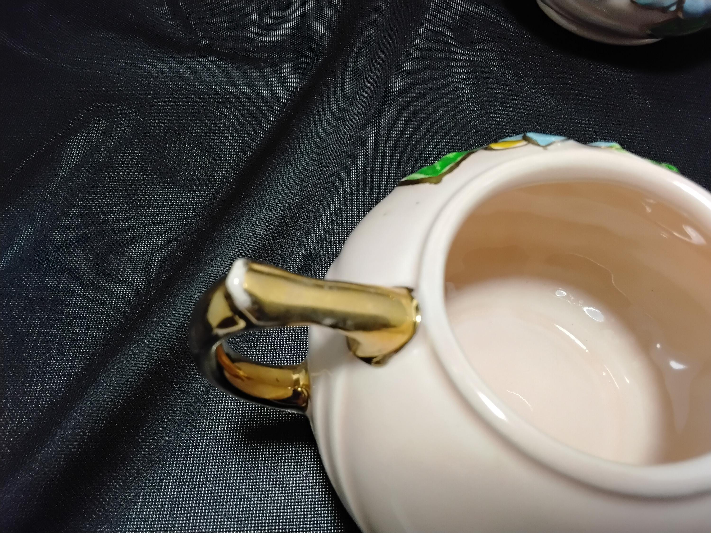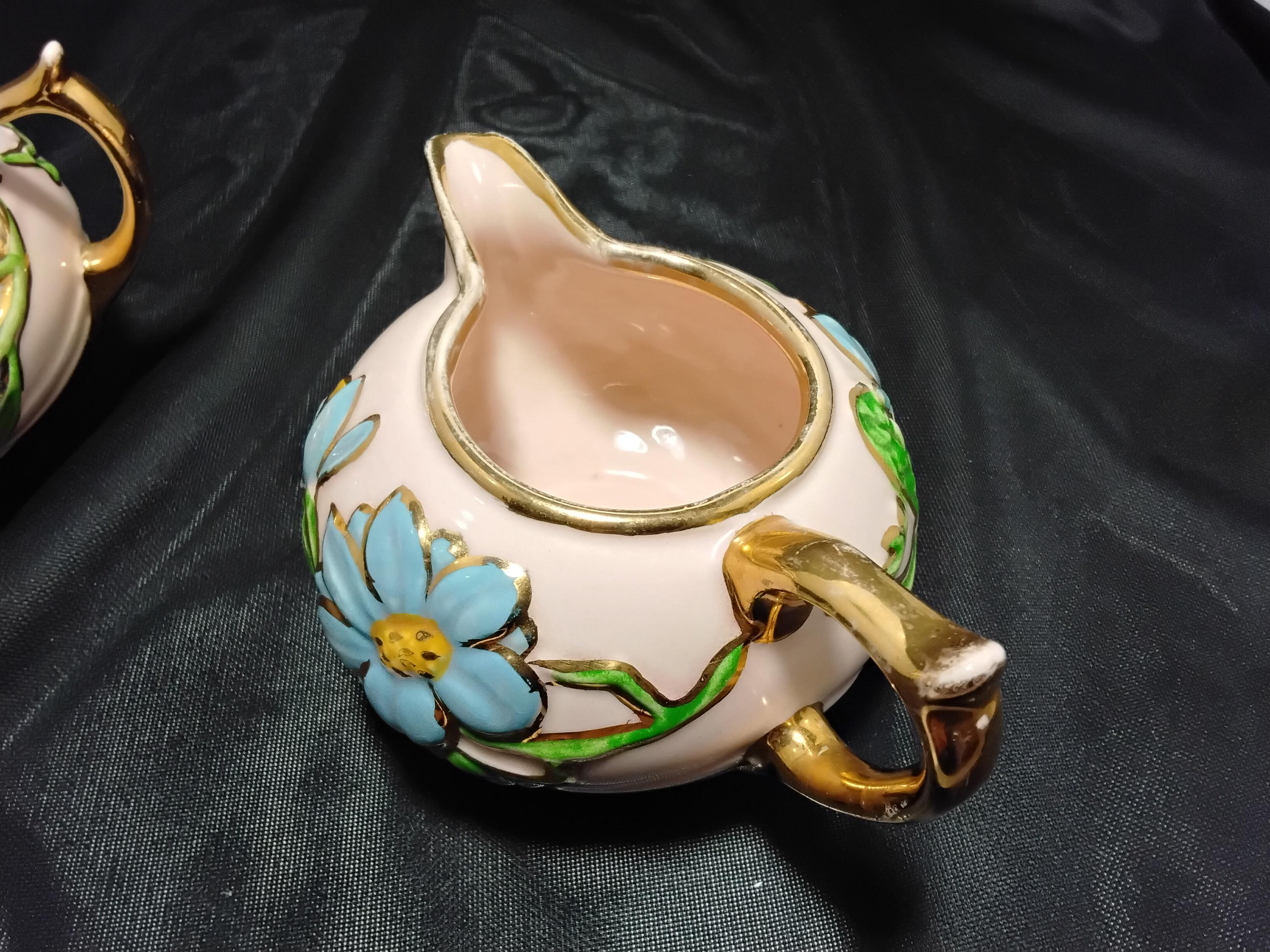 Vintage 1940's Hull Pottery Sugar and Creamer in Magnolia Blue with gold trim is for collectors or anyone to admire and add to there decor. Both pieces are marked on bottom. Im forgiving the fading on the gold trim i hope you can also. No chips or cracks. In very good condition considering the age. Lidded sugar bowl measures 4" tall and 4.5" wide. Creamer measures 3" tall and 4.5" wide. Glossy finish and gold trim makes an elegant appeal .