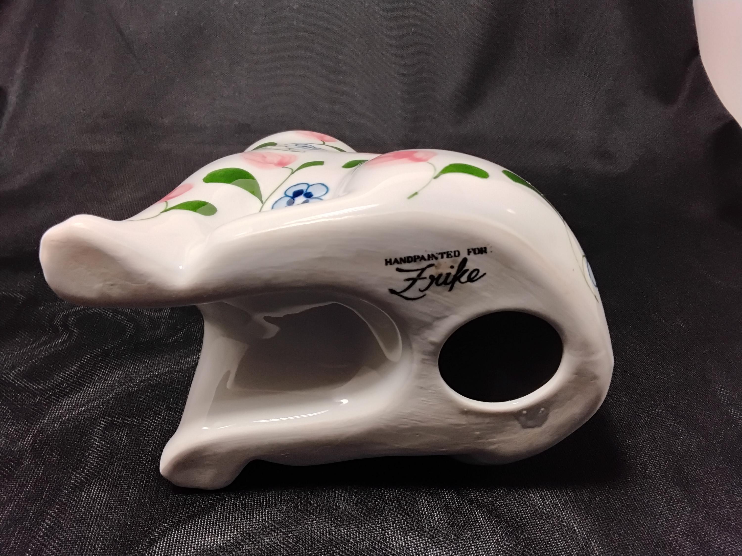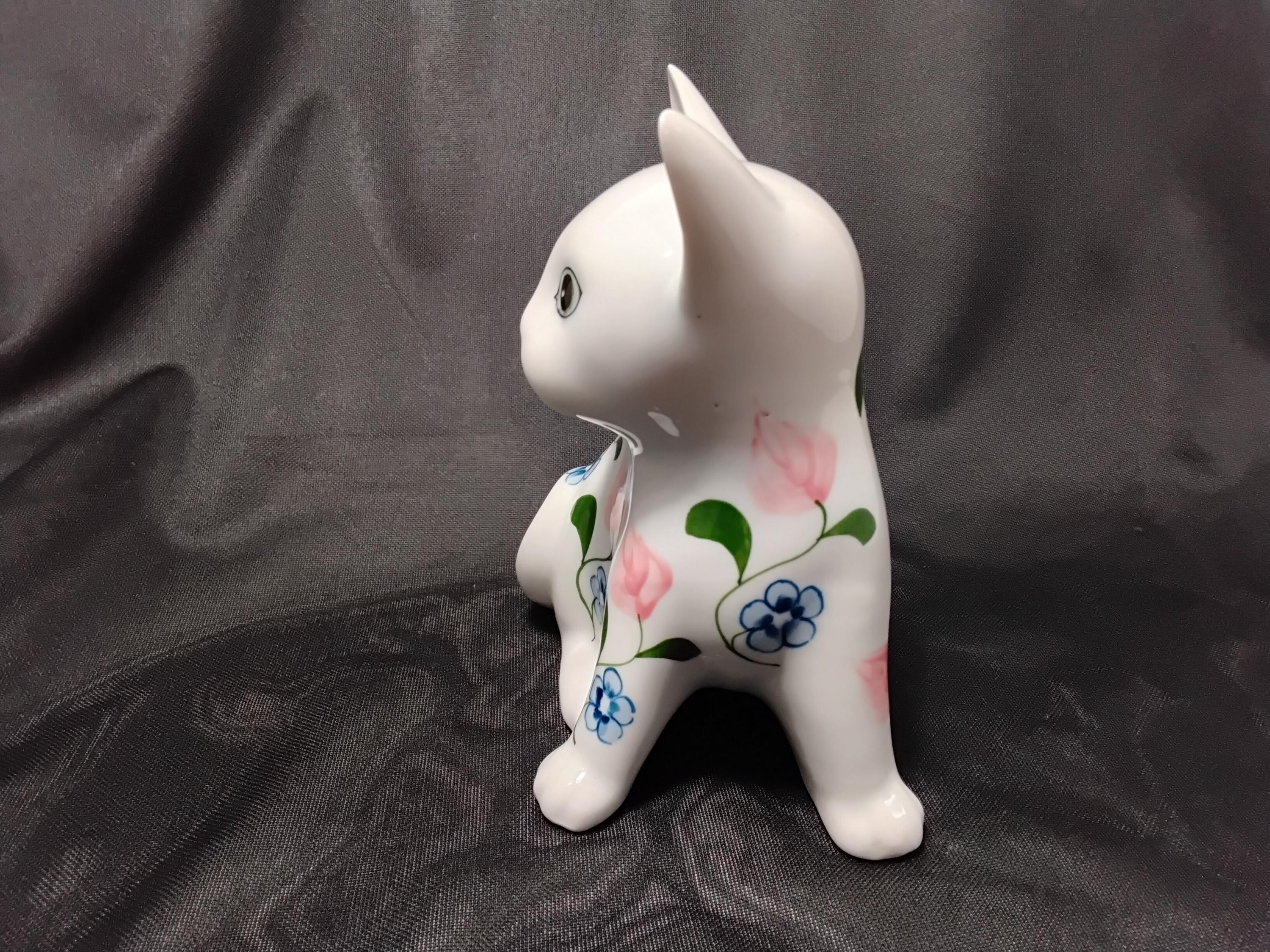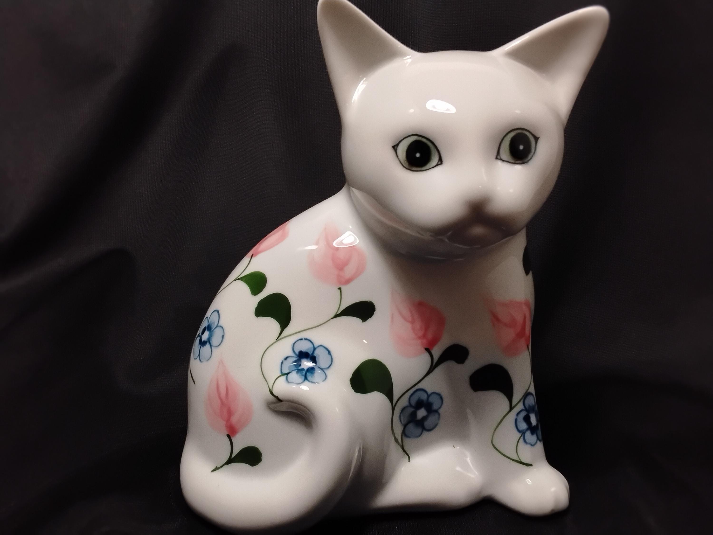 Floral design sitting cat has beautiful eyes, creamy white glaze, blue and pink flowers and is hand- painted for Frike. Vintage 1990's pretty cat is for collectors or anyone who loves cats. Measures 6" tall and 5" wide. Appears new, no chips or cracks.