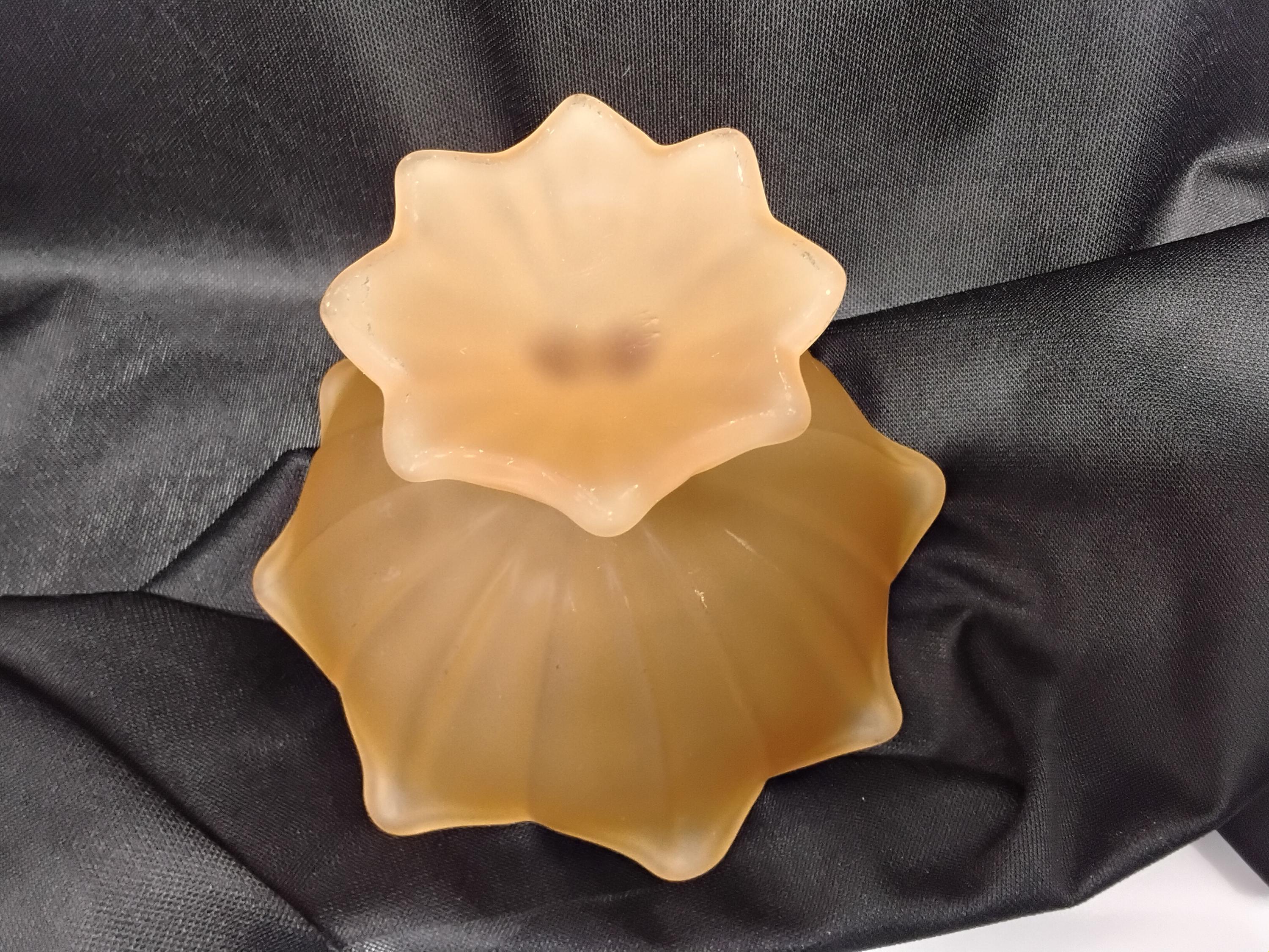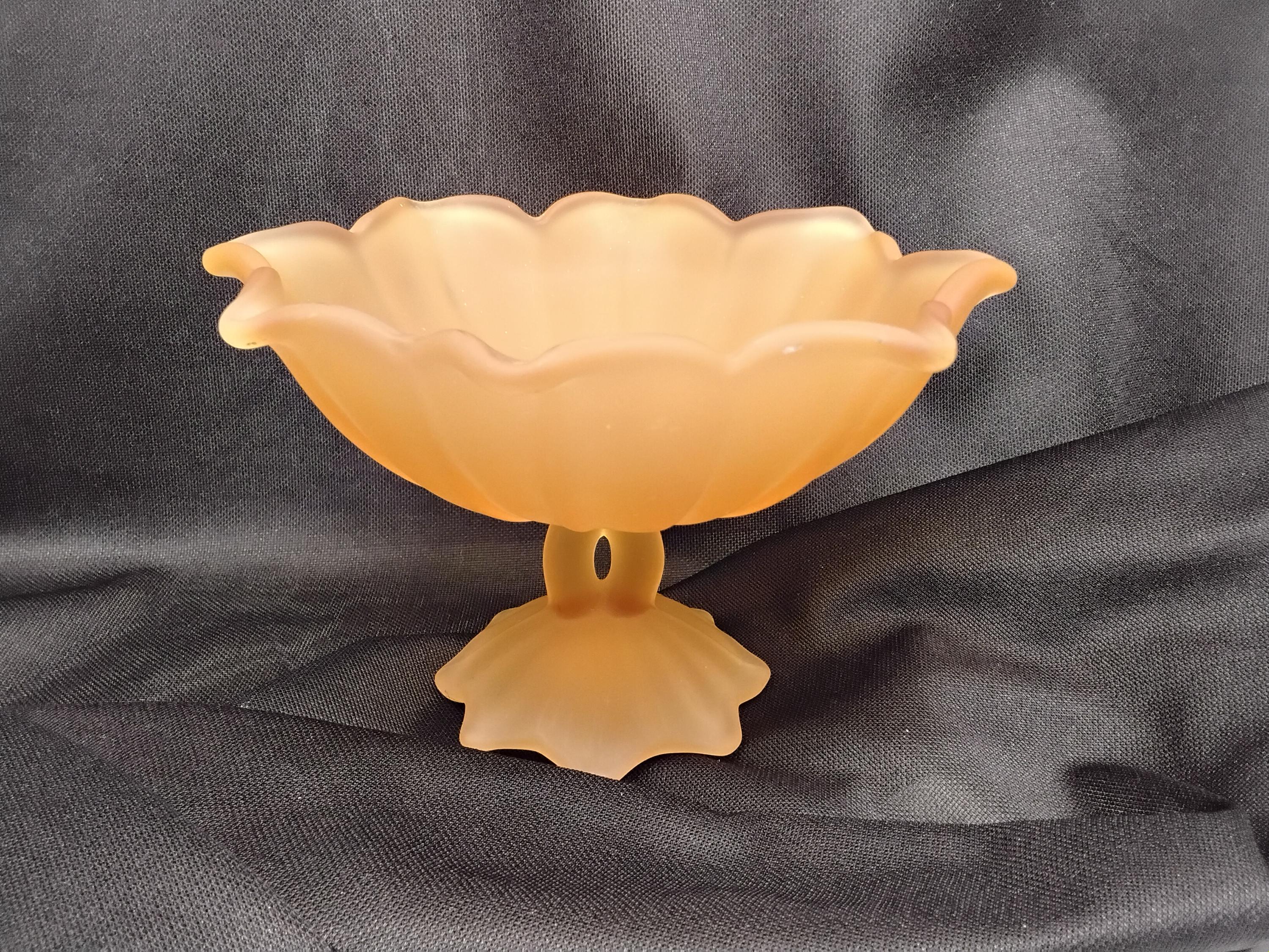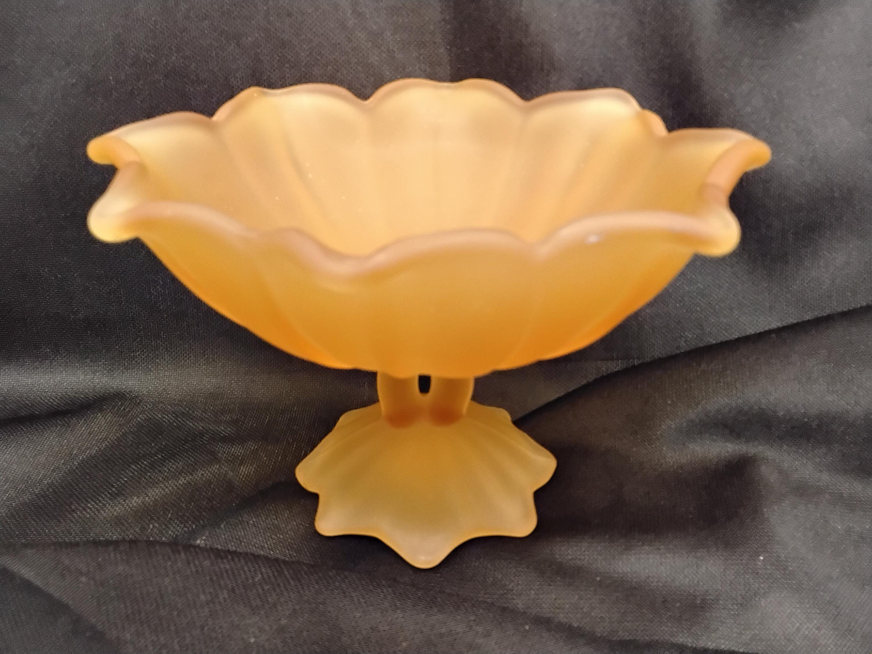 Vintage 1940's Westmoreland frosted/satin pressed glass compote dish in Amber/ Peach color is stunning. A footed Lotus flower design in pressed glass is vintage decor at its best. To use or display this will elevate any decor. Marked on bottom but very hard to see, it is raised initial of WG. Measures 6" wide, 3.5" tall. Excellent condition, no chips or cracks. Weighs 14oz. Unique color and style.