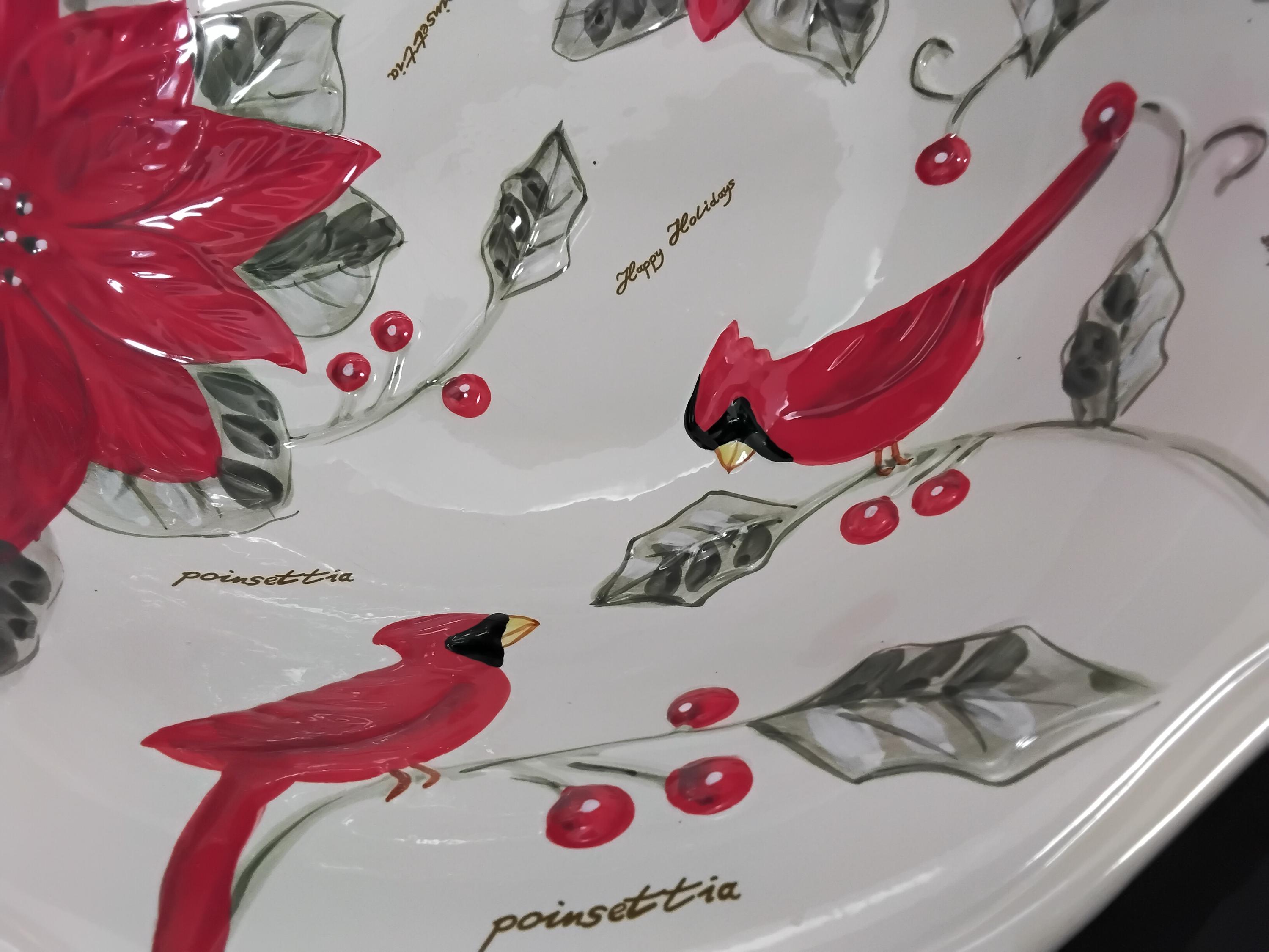 Lovely Christmas large serving bowl by Gibson Elite is unique with large poinsettas and pretty cardinal birds, holly and berries. A raised design to stand out on a white background. So beautiful for the holiday table. Marked on bottom. This is microwave safe and dishwasher safe bowl. Measures 4.5" tall and 14" round. Very good condition, very slight sign of wear on bottom. Eye catching and unique.