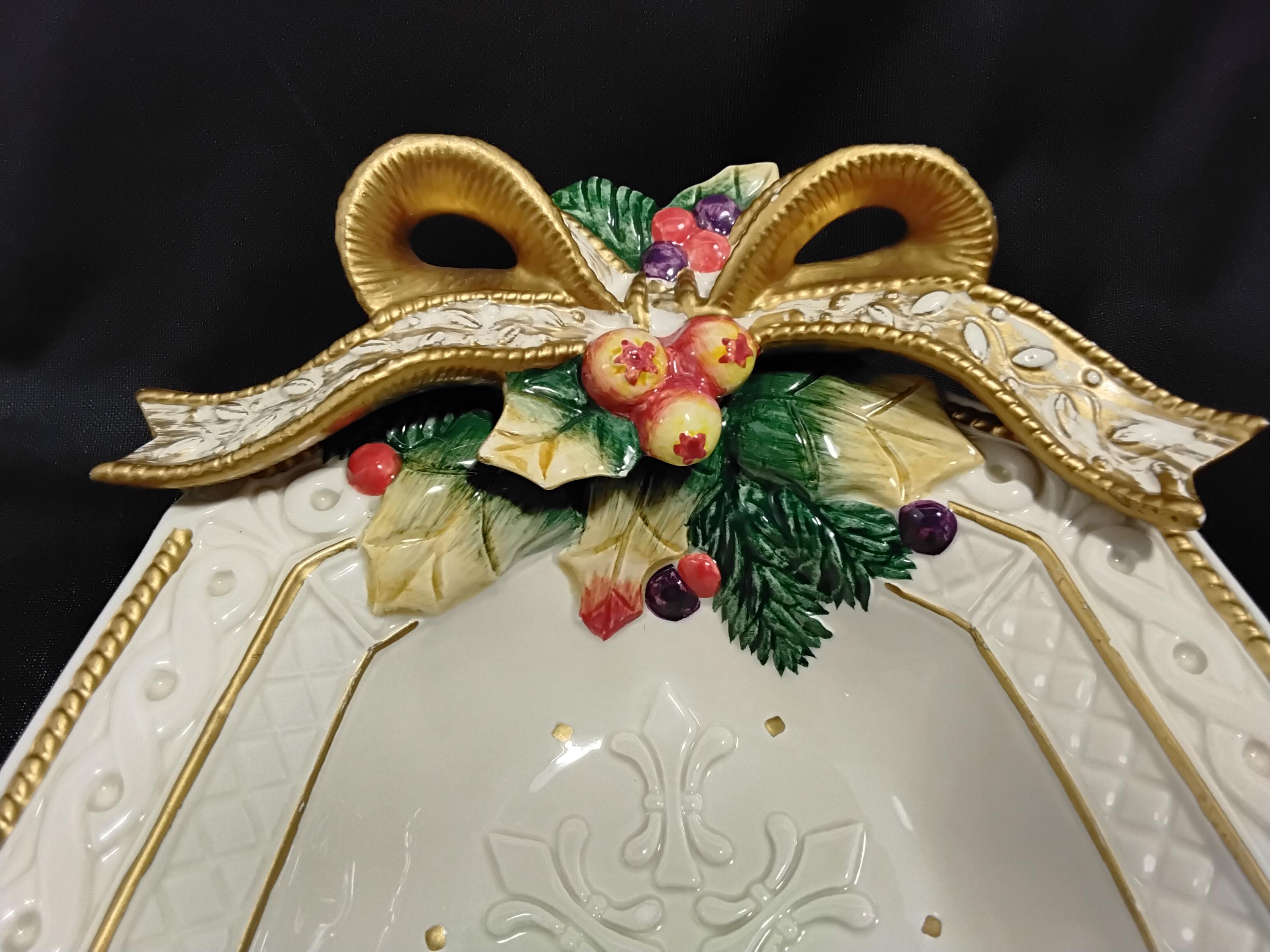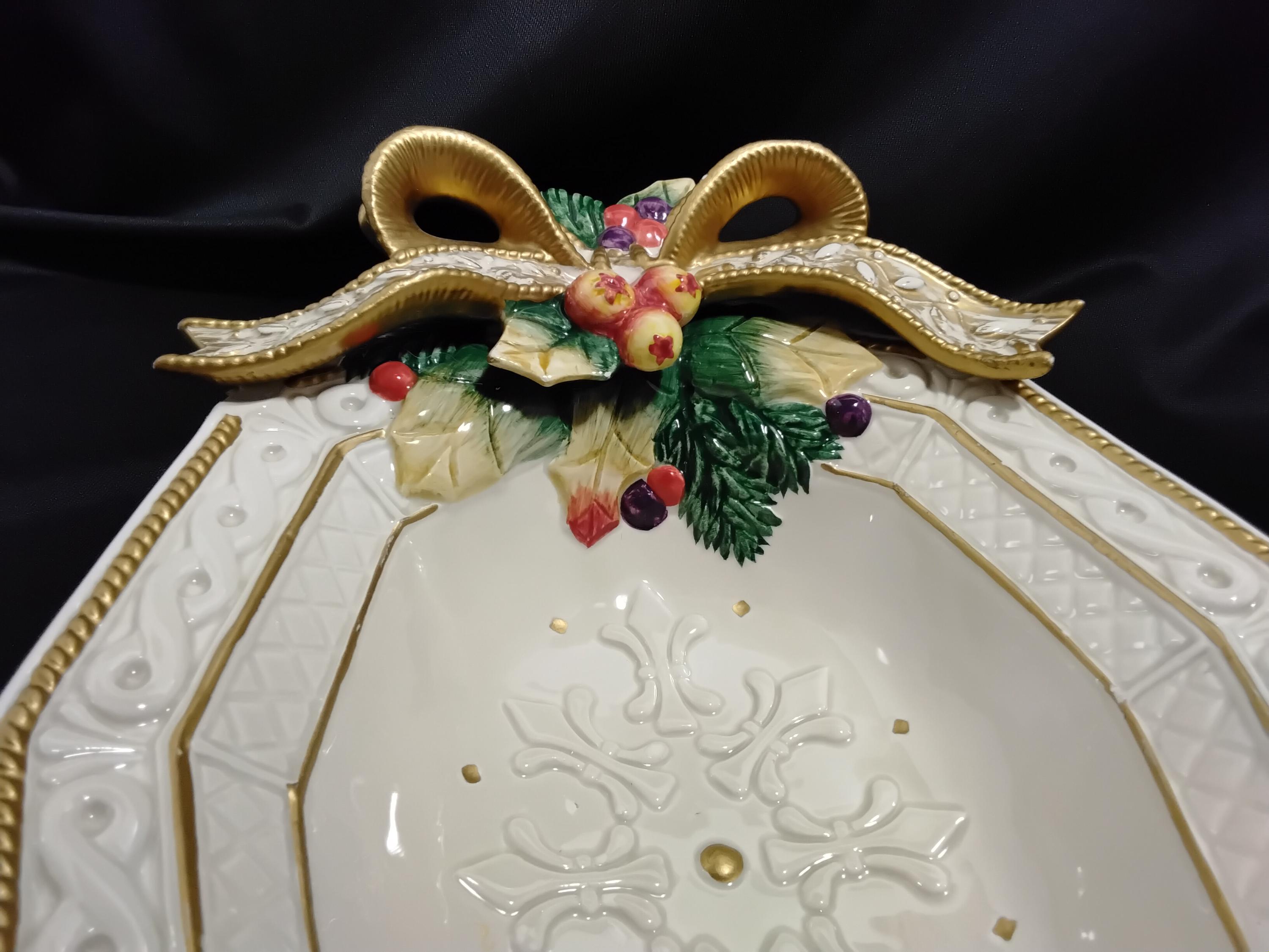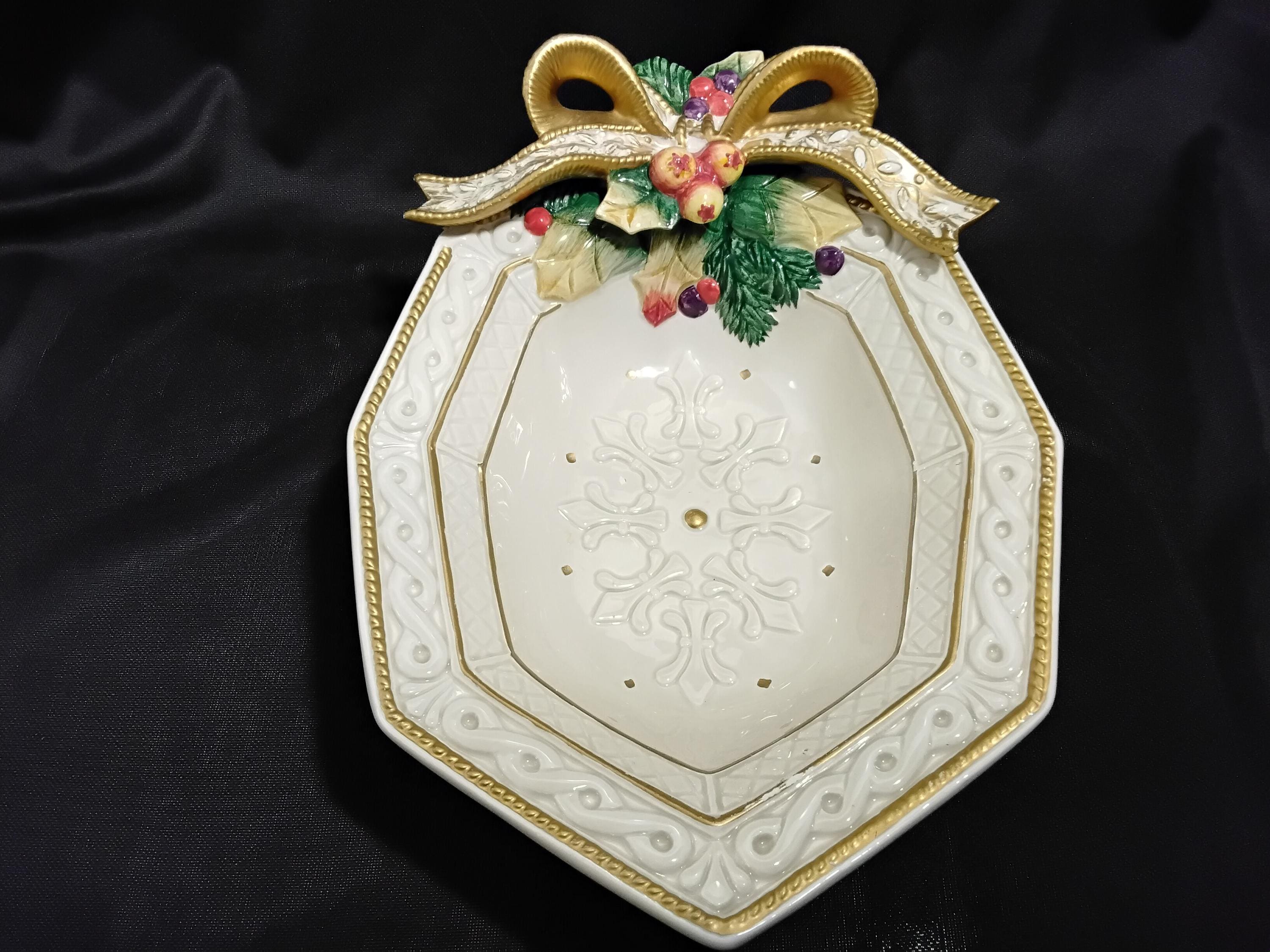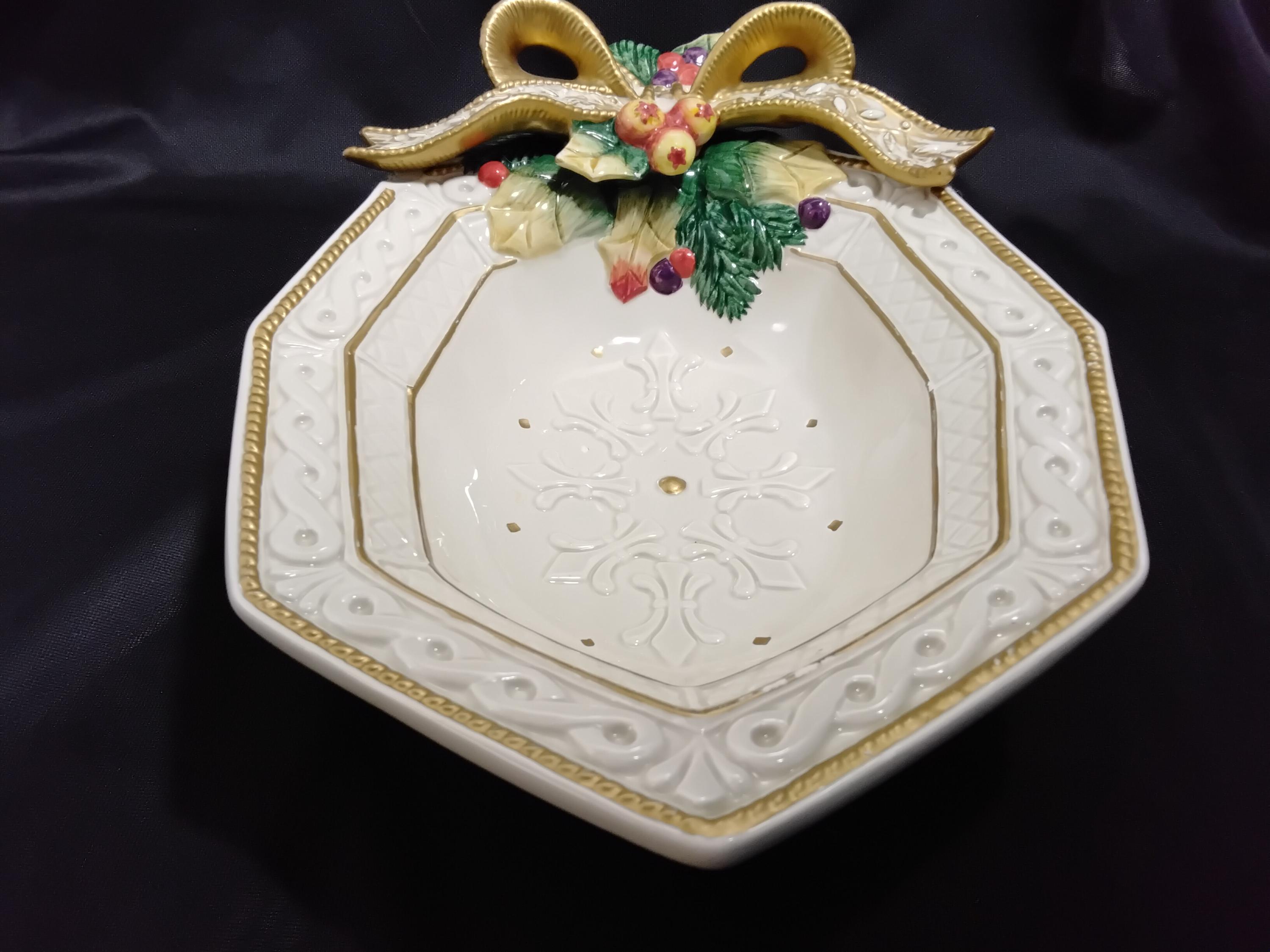 Beautiful Vintage Snowy woods cranberry, fruit, candy, nuts etc, bowl is a rare find. Made of eartenware in a pretty off white base with gold edgeing and an ornate bow adorns the top in festive colors. Much detail has gone into this. It will be a unique but beautiful addition to the holiday table.Measures 7.5" wide, 10.5" length, Stands apx. 2" tall. Excellent condition, no chips, no cracks, there is some ware on the gold edging but forgiveable, I hope to you as well. Collectors item and makes a beautiful hostess gift.