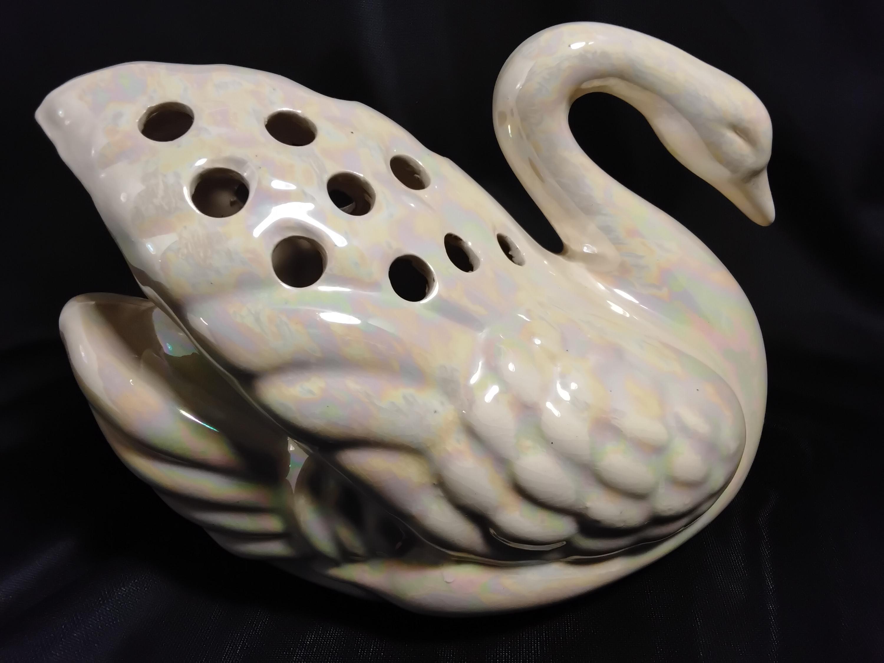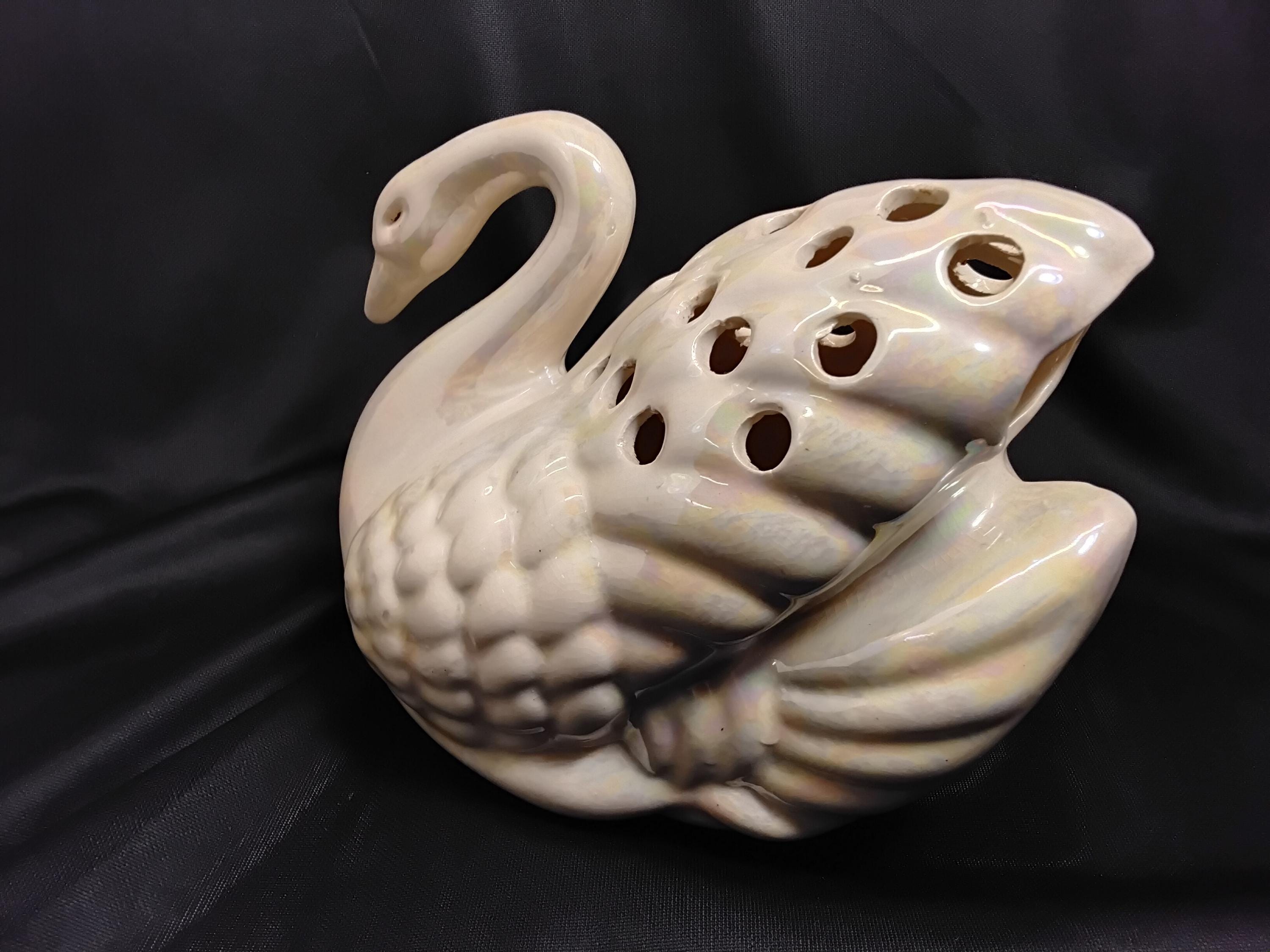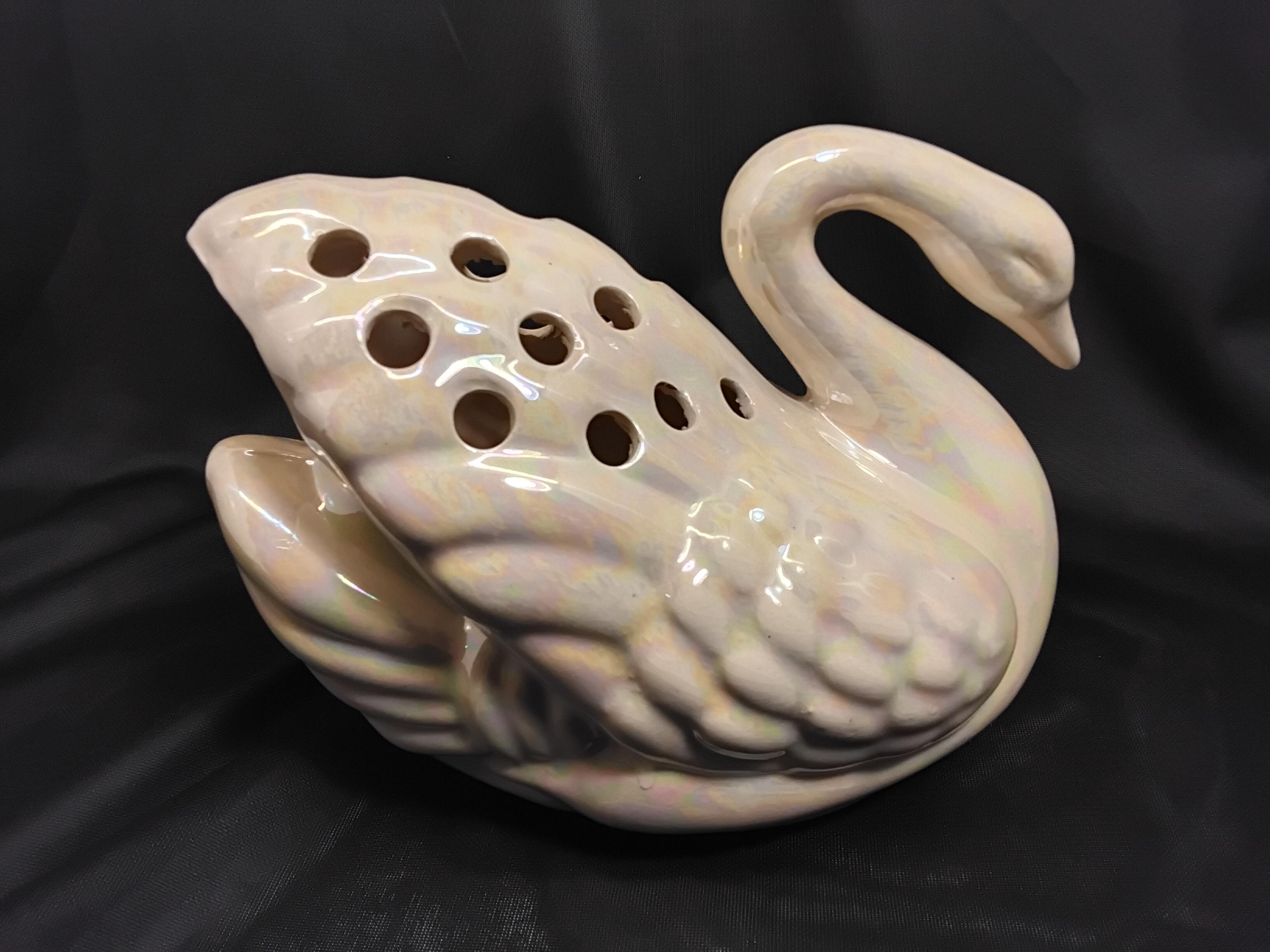 Beautiful vintage 50' to 60's Swan Frog Planter is unique,the irridescent pearly lustreware is perfectly done. A stunning mid century addition to any home is quaranteed to be noticed and loved. Holds 22 flowers for a full bouquet. Made of ceramic, use as a planter, vase or a decorative ornament. Excellent condition, no chips or cracks. Measures 8" tall, 12" wide. Works with almost any decor.