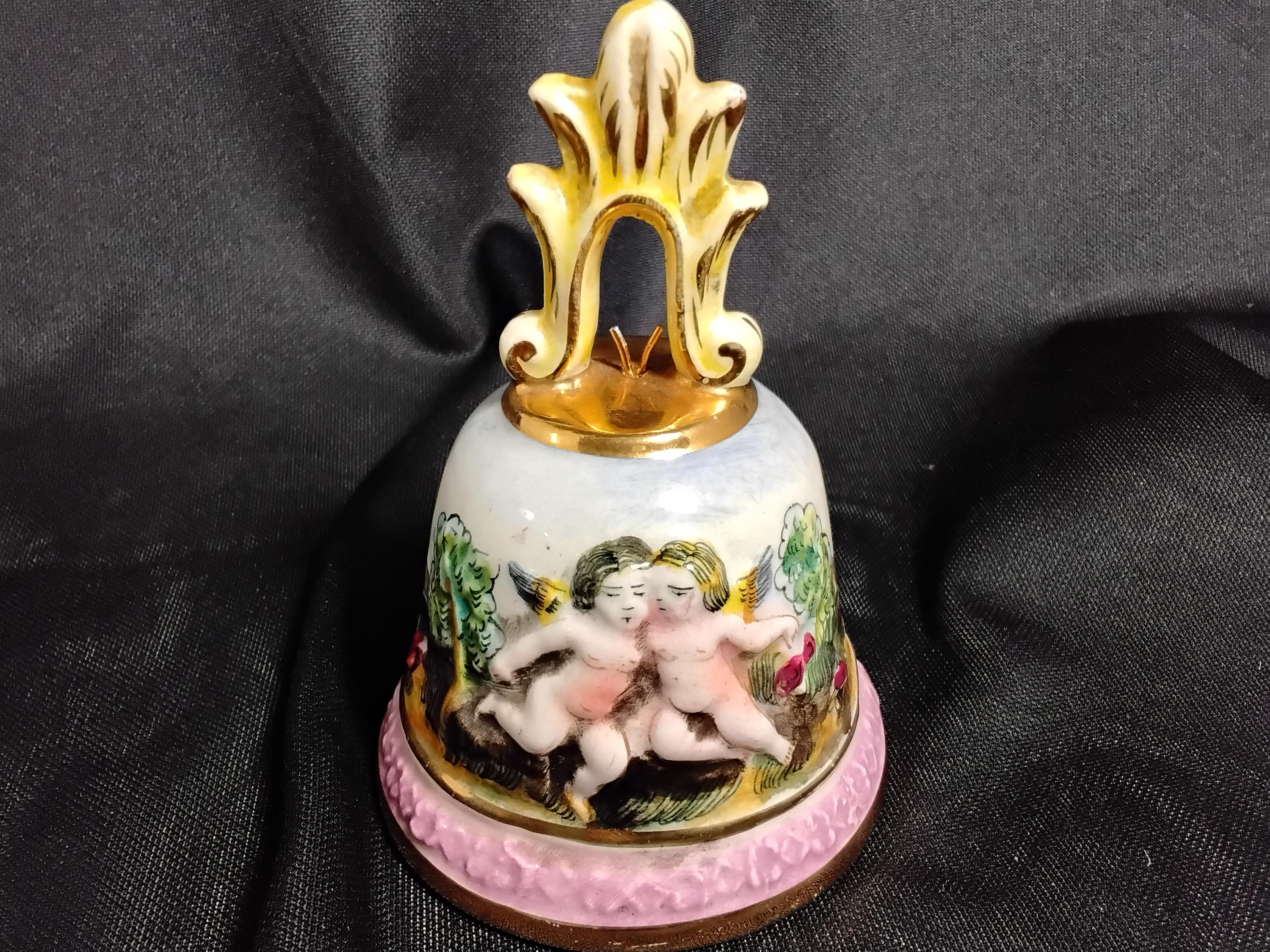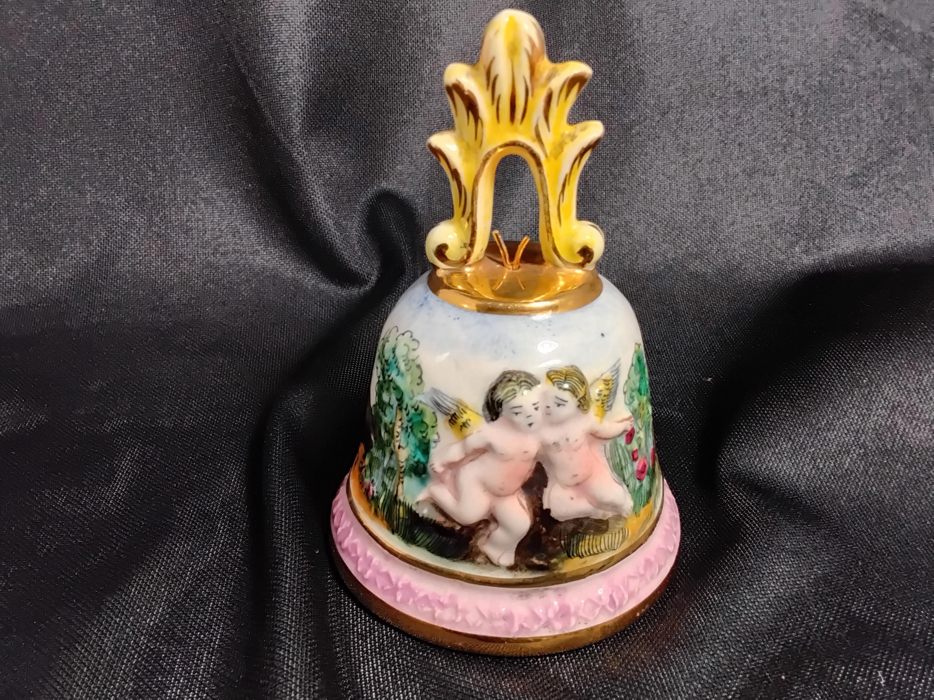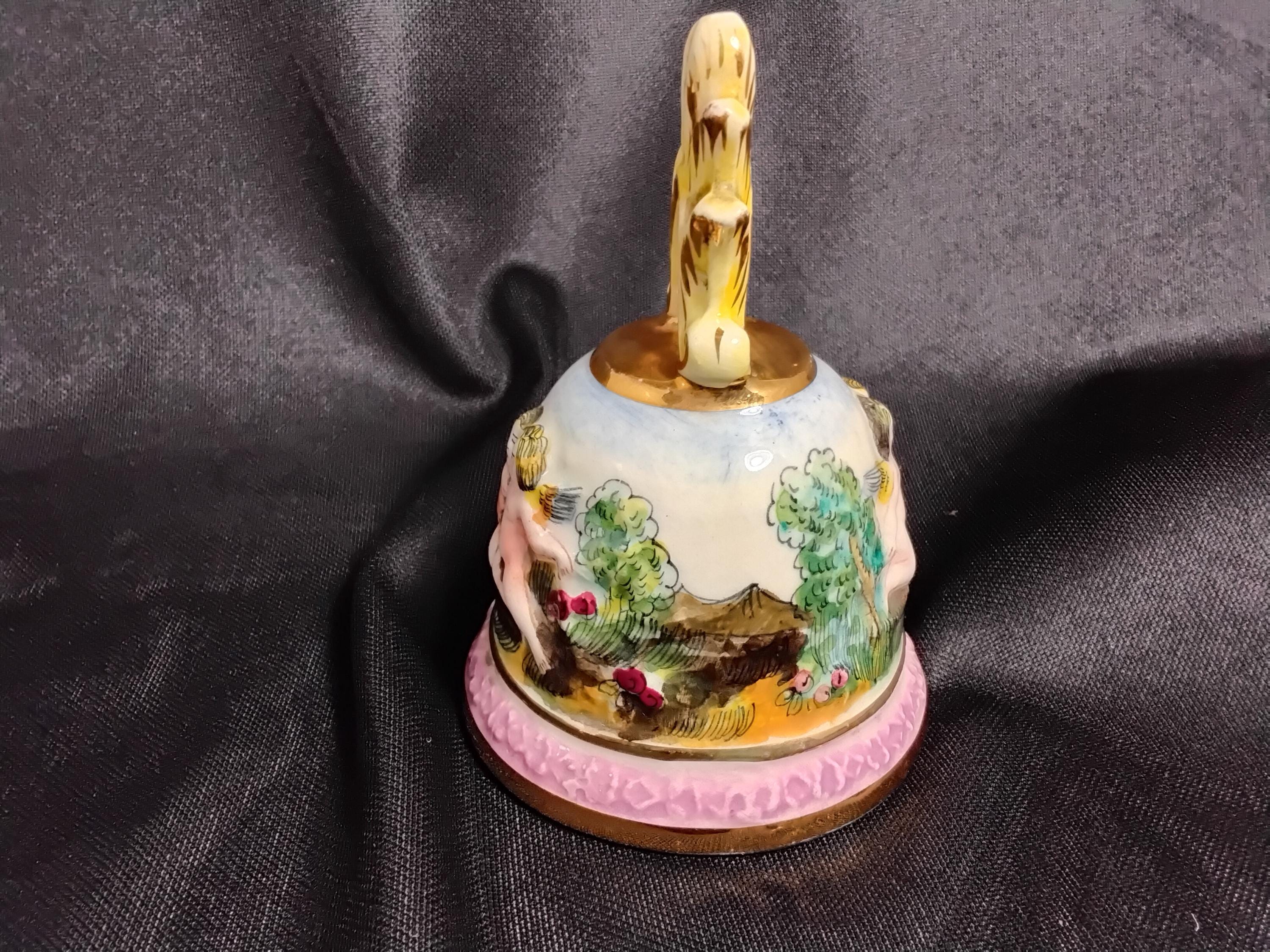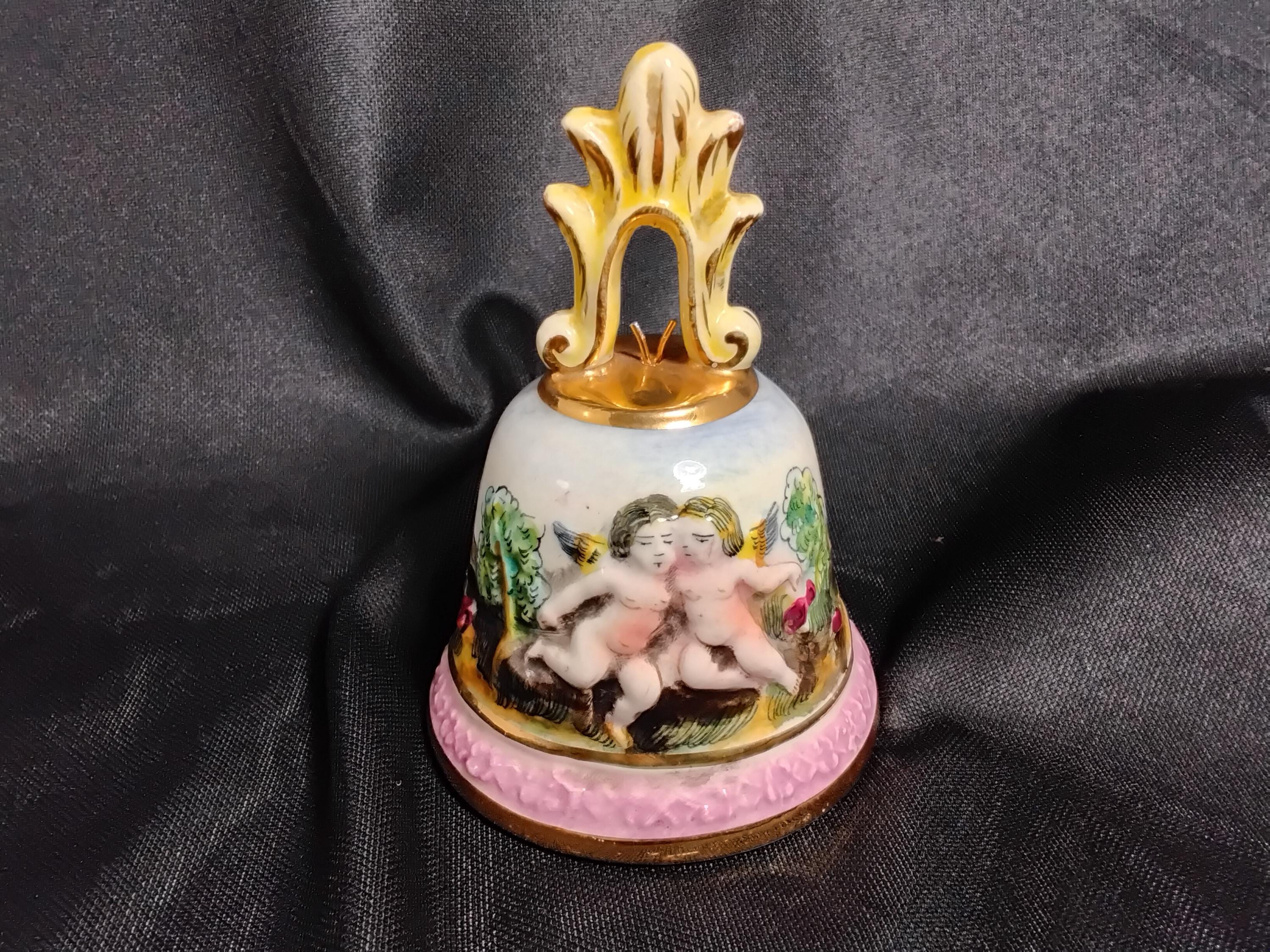 Beautiful Capodiamonte bell is vintage mid 20th century. This was a limited edition then and highly collectable. Made in Italy, made of porcelain, all hand made and hand painted. Cherubs in a Garden is a rare piece. Marked inside bell # 3183 capodiamonte Italy. Colors are green, pink, light blue, with gold accents. Excellent condition, no chips or cracks. Slight signs of wear on inside rim of bell. Measures 4.5" tall, 3.5" wide.