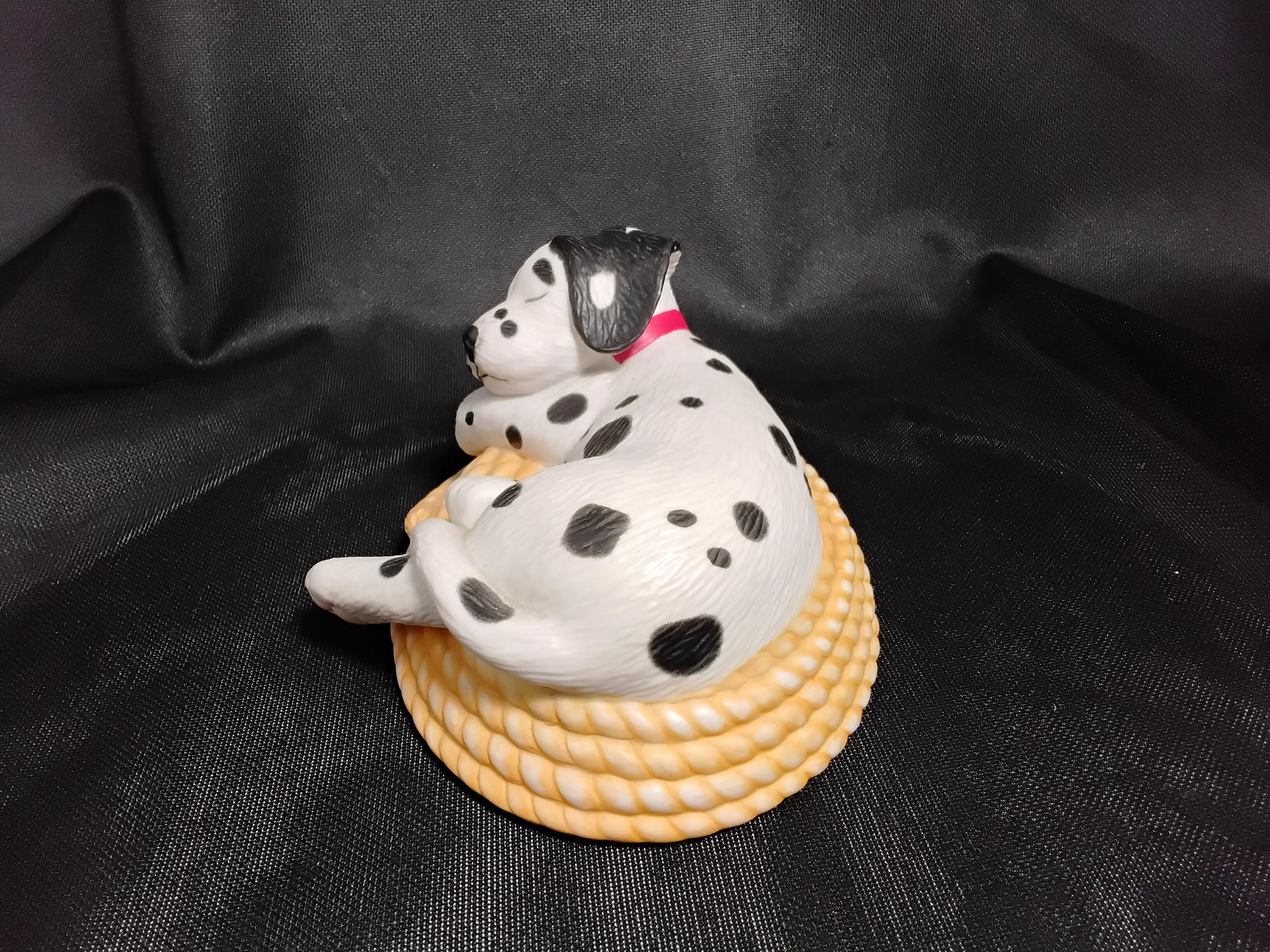 Adorable Dalmation Puppy sleeping in a basket is made of fine porcelain and hand painted. Made in 1994 by Princton Gallery, this vintage piece is in excellent condition, no chips or cracks. Collectors and dog lovers alike can display this with any decor. Measures 3" tall and 5.5" long, weighs 8oz. Marked on bottom. A black and white spotted puppy sleeping in a yellow basket, how adorable!