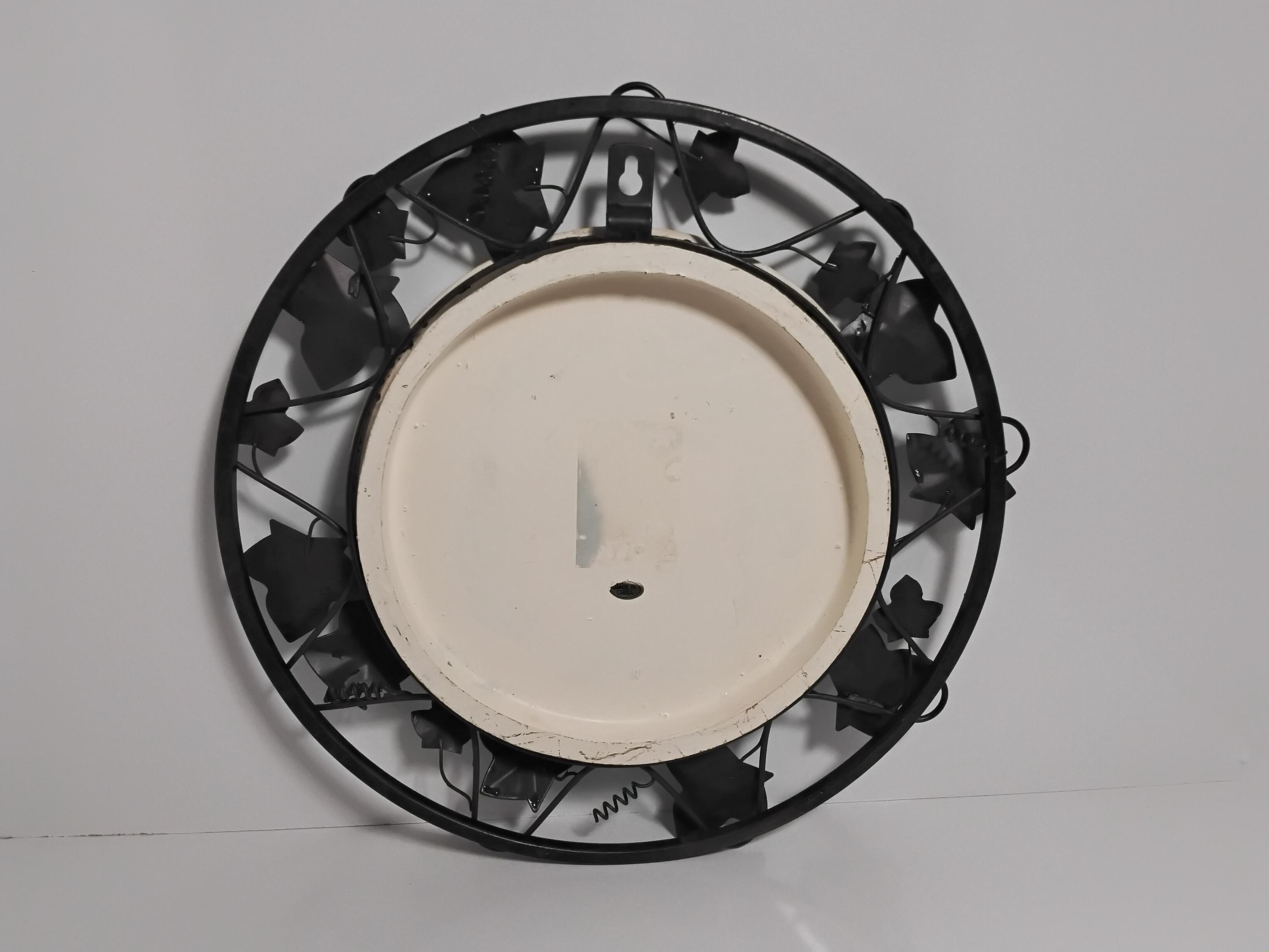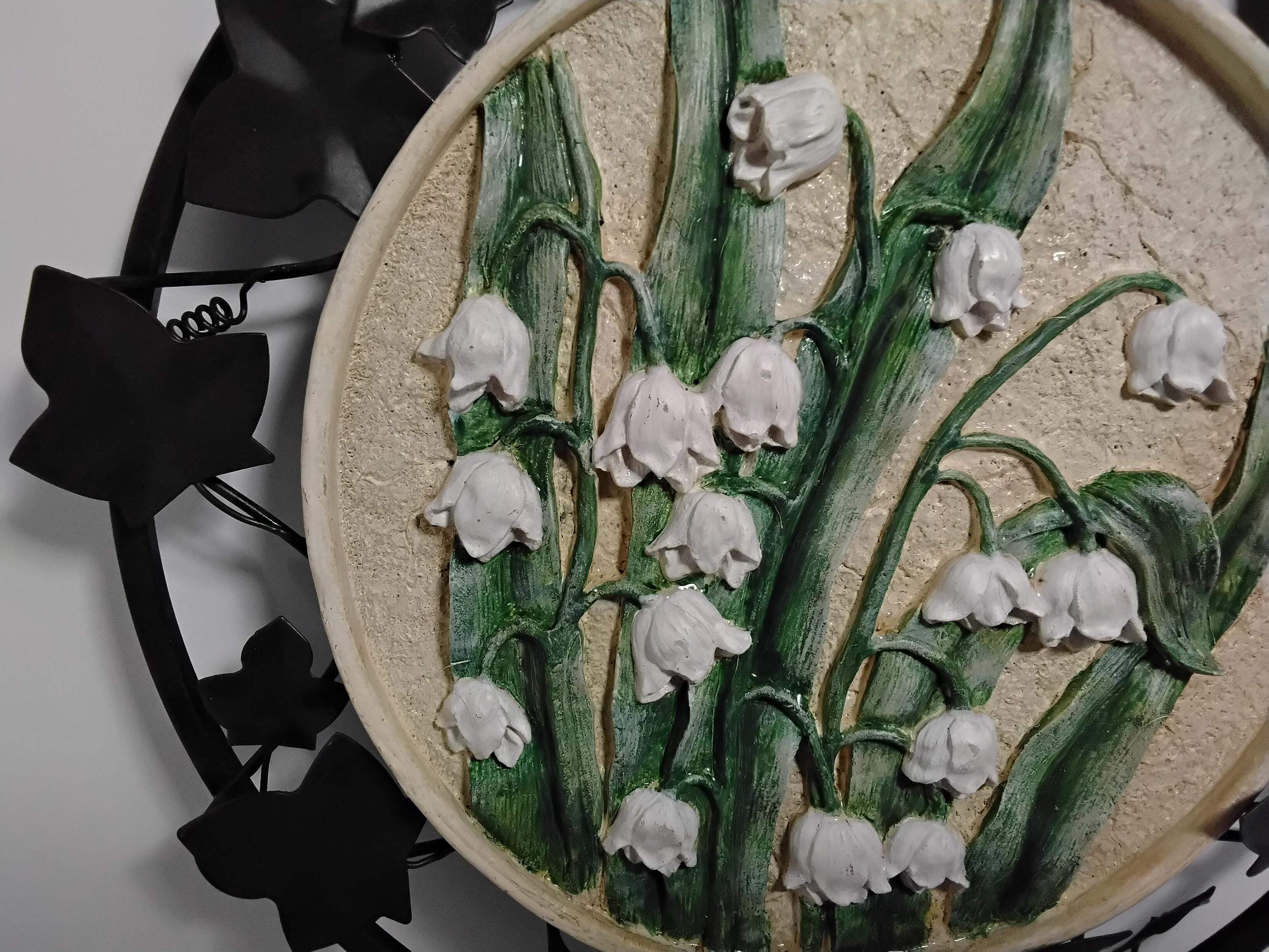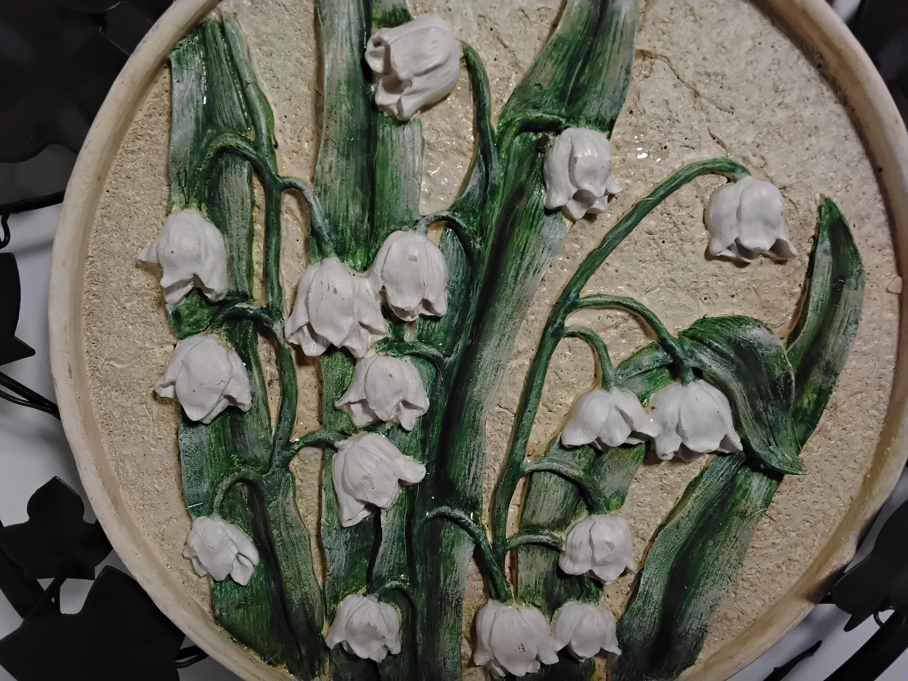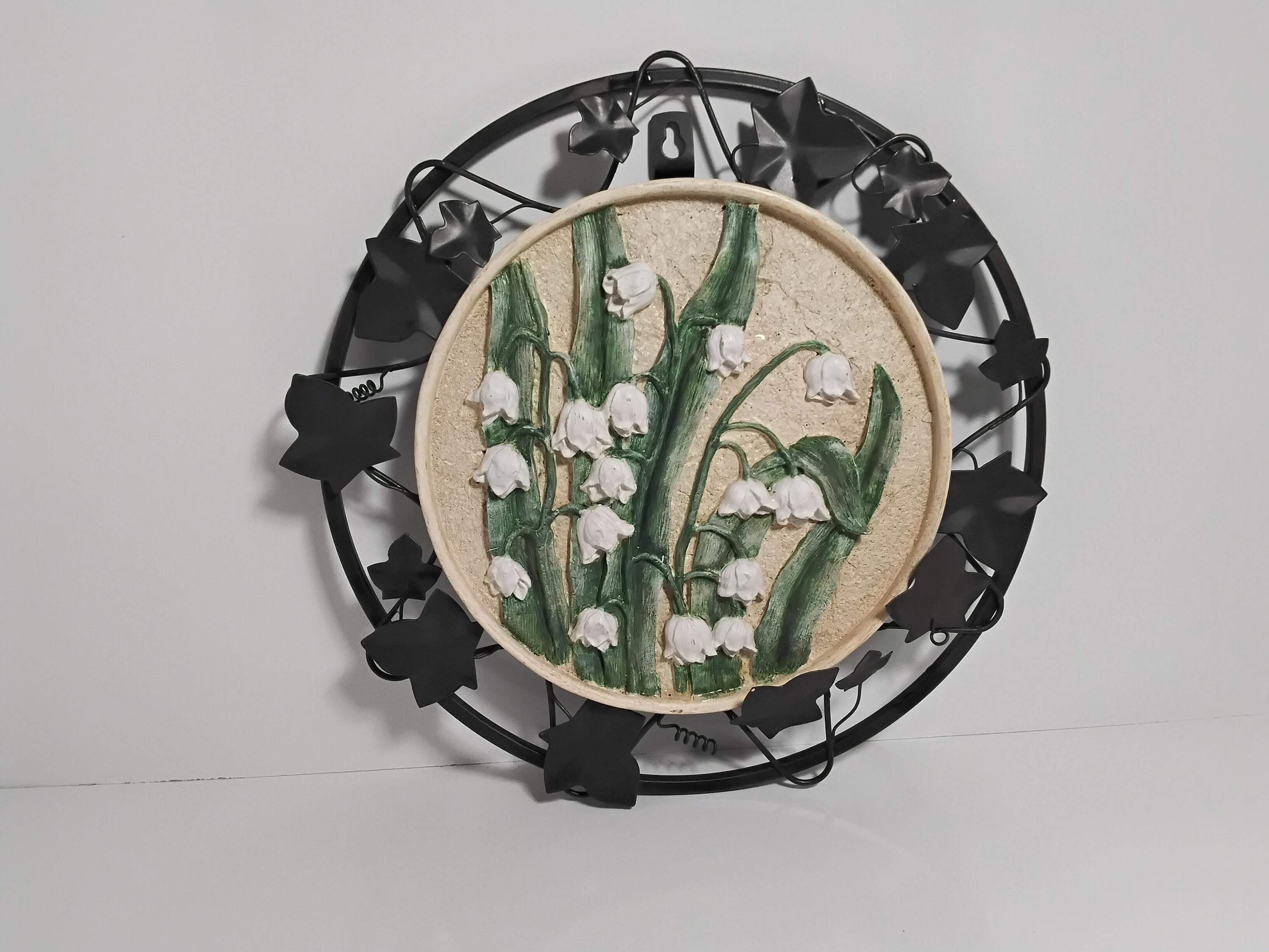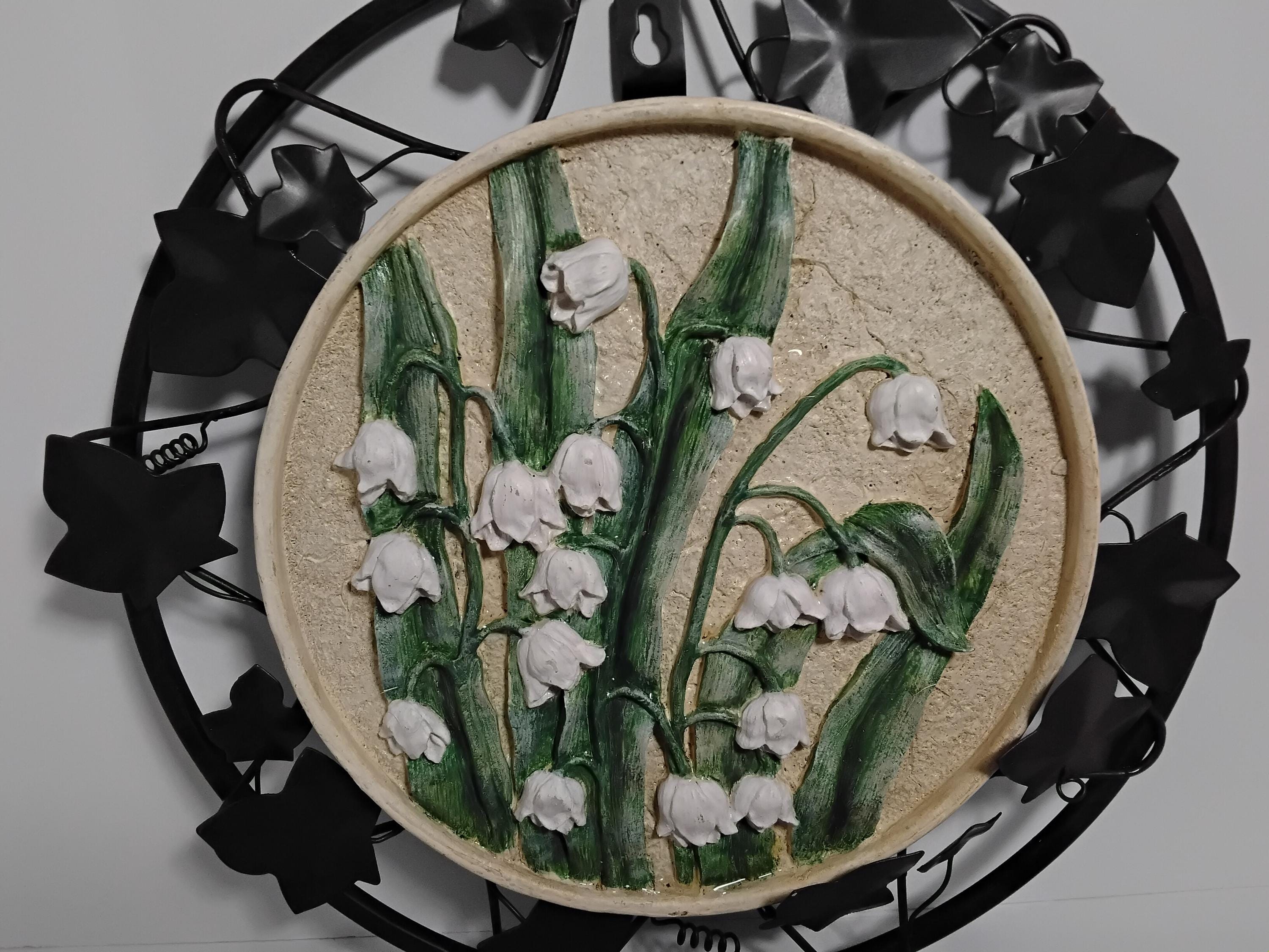 Lilly of the Valley textured wall plaque is vintage 80's. A lovely piece with a bronze color wrought iron frame of leaves. The pretty flowers are handmade in resin set into a wooden base. Handmade and hand painted. A great plaque to use indoors or outdoors. From cottage design to contemporary decor, this will fit in any decor. Measures 12" around. Weight is 2lbs. 4oz. Excellent condition, no chips or cracks. For Collectors of art or just lovers of art.