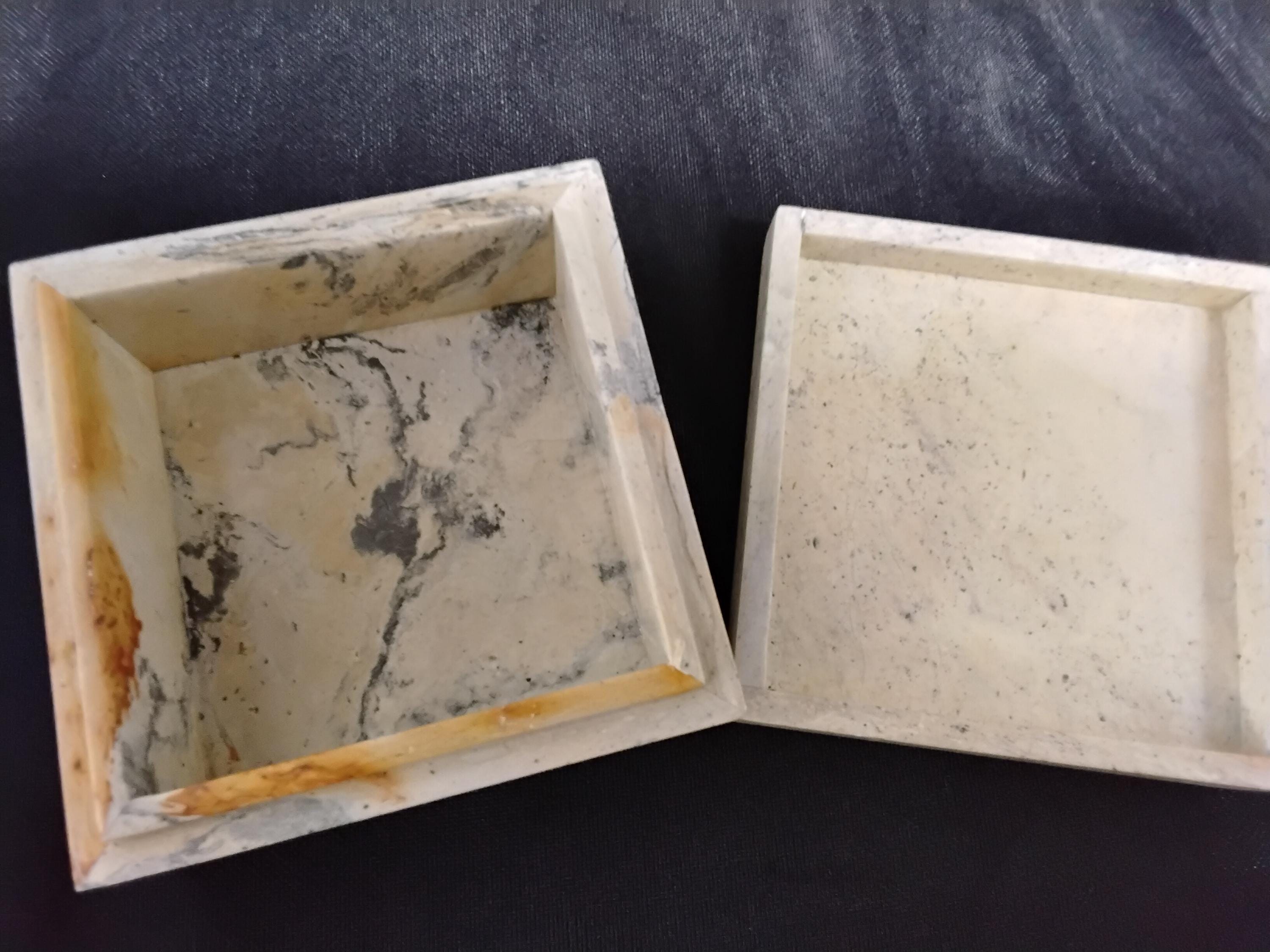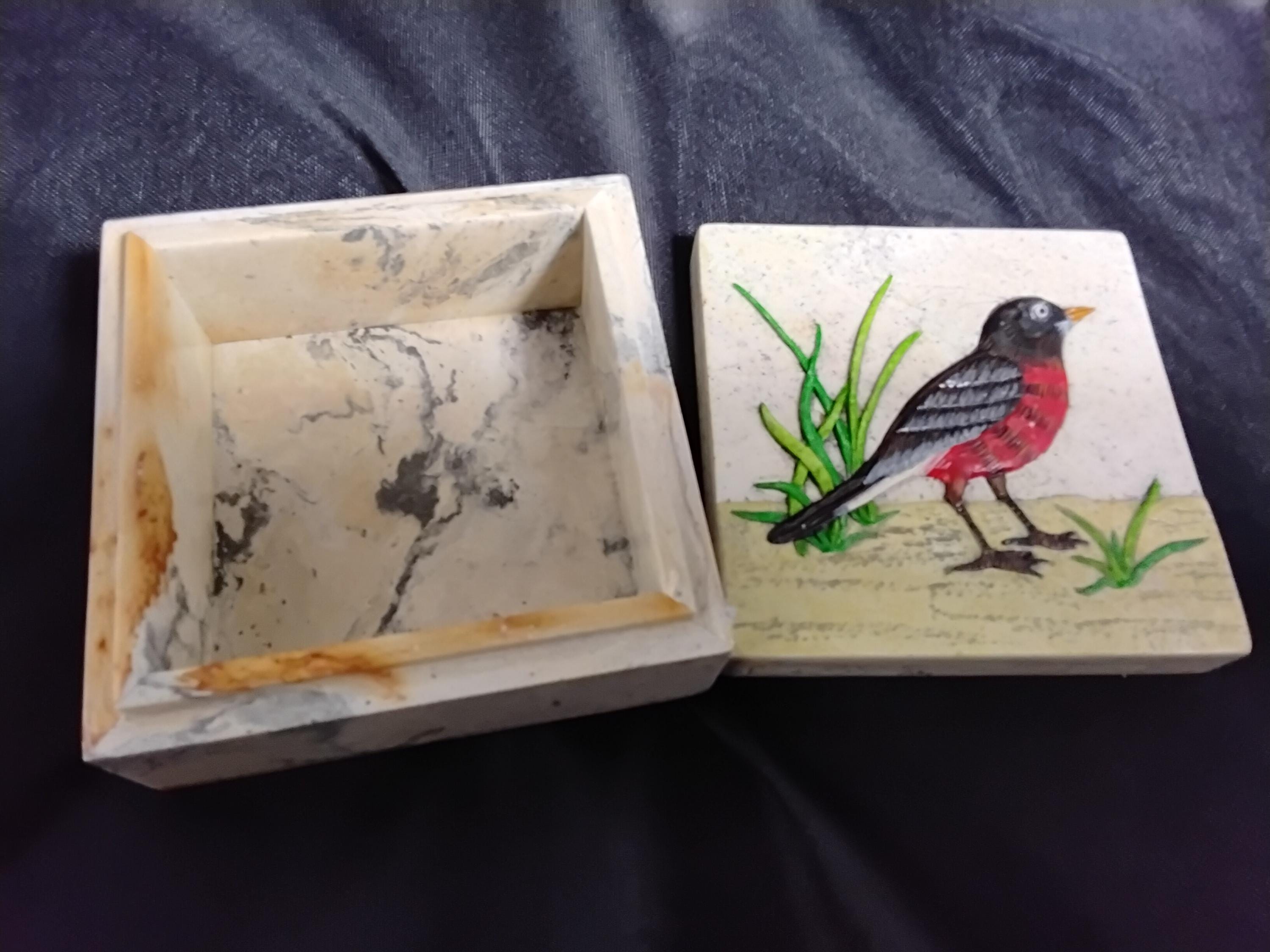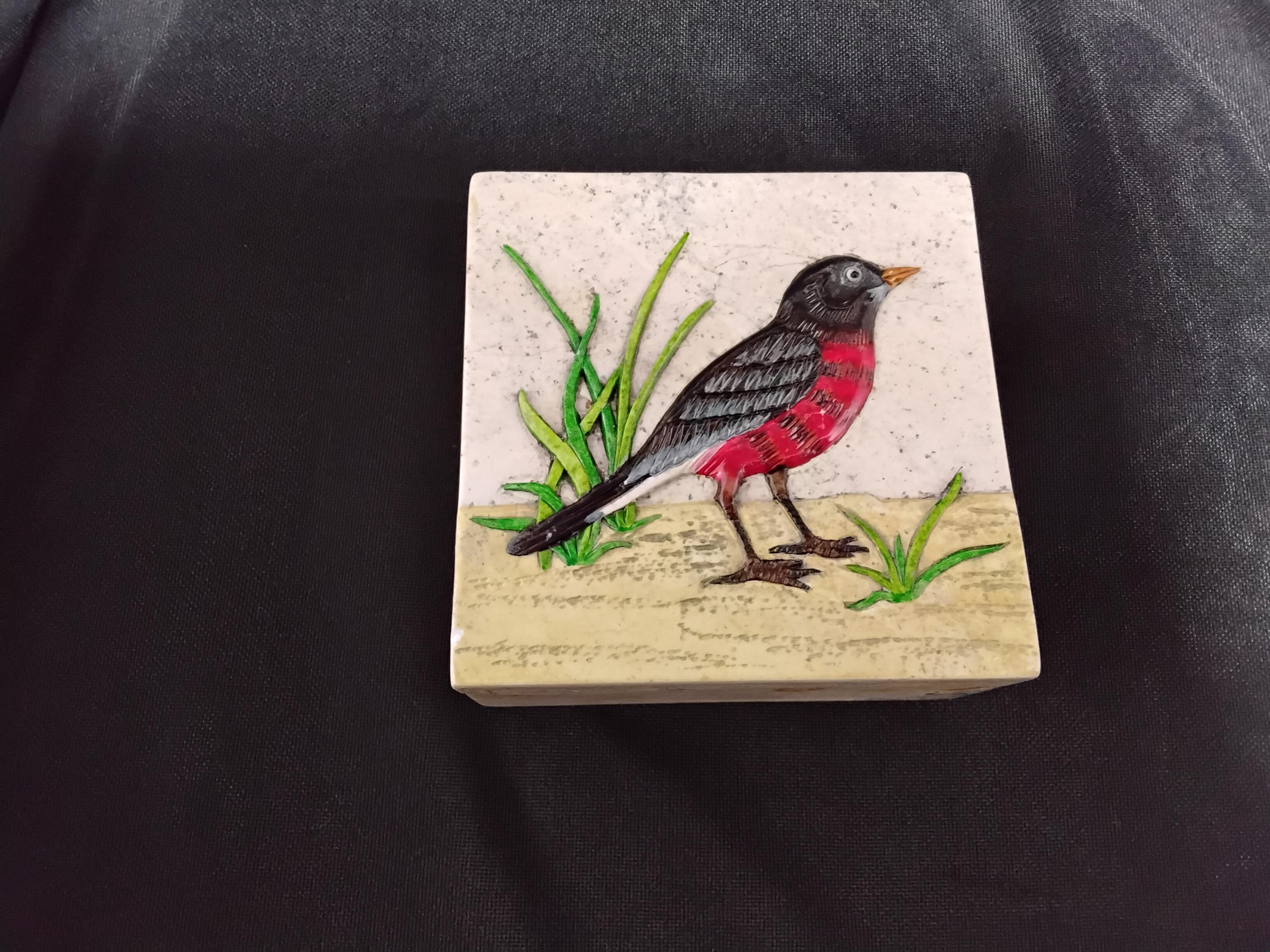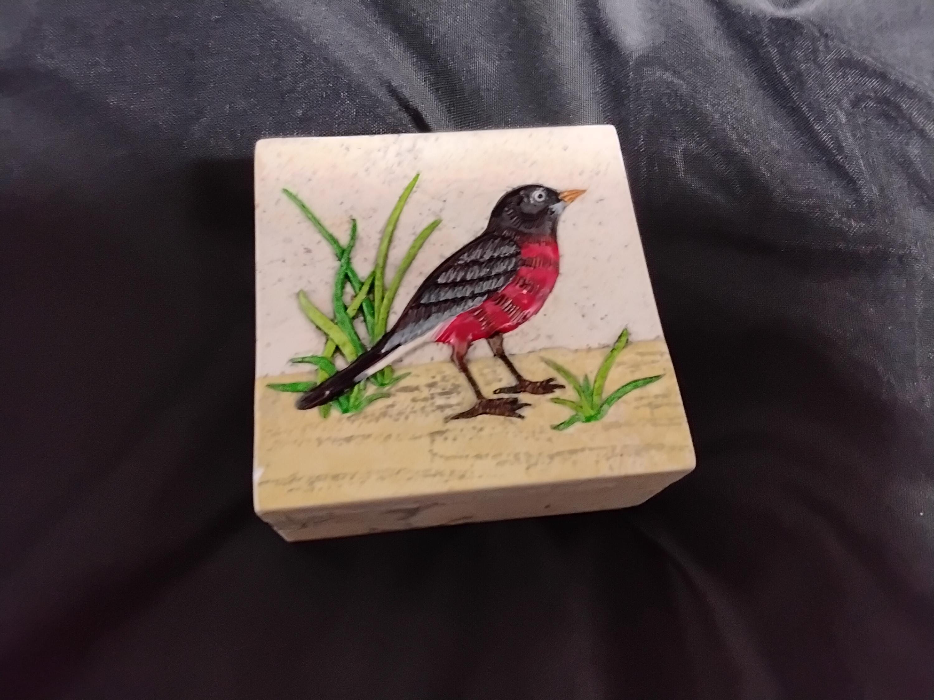 Unique and collectable Stone trinket/jewelry box is vintage 80's. Beautiful carved red robin is a raised design. Hand made in Vietnam and hand painted. This box stands out in any decor. Beautifully done and in great condition, no chips or cracks. Measures 4" long, 4" wide and 2" tall. A bit of weight to it. 1lb 10oz. A unique collectable that, I think, will stand out from the rest.
