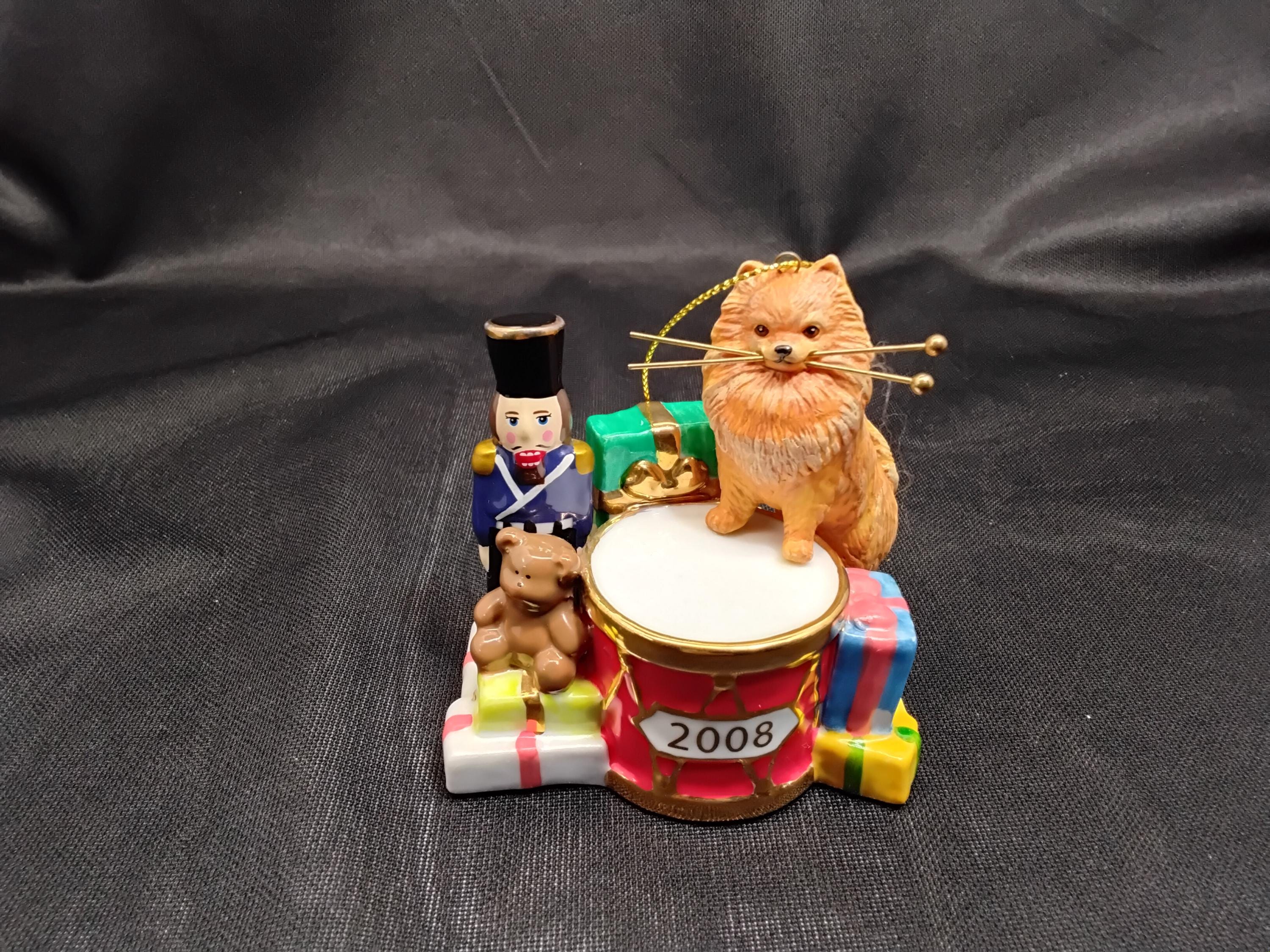 Beautiful Danbury Mint Vintage 2008 Christmas Drummer, Pomeranian dog hanging tree ornament is part of a series of collectable annual christmas tree ornaments. Made of ceramic and cold cast porcelain. Festive colors and gold accents. Original tag and in very good condition. No chips or cracks. Well made and highly collectable. Measures 3.5" x 3.5", weight is 4oz. A great addition to your Christmas tree.