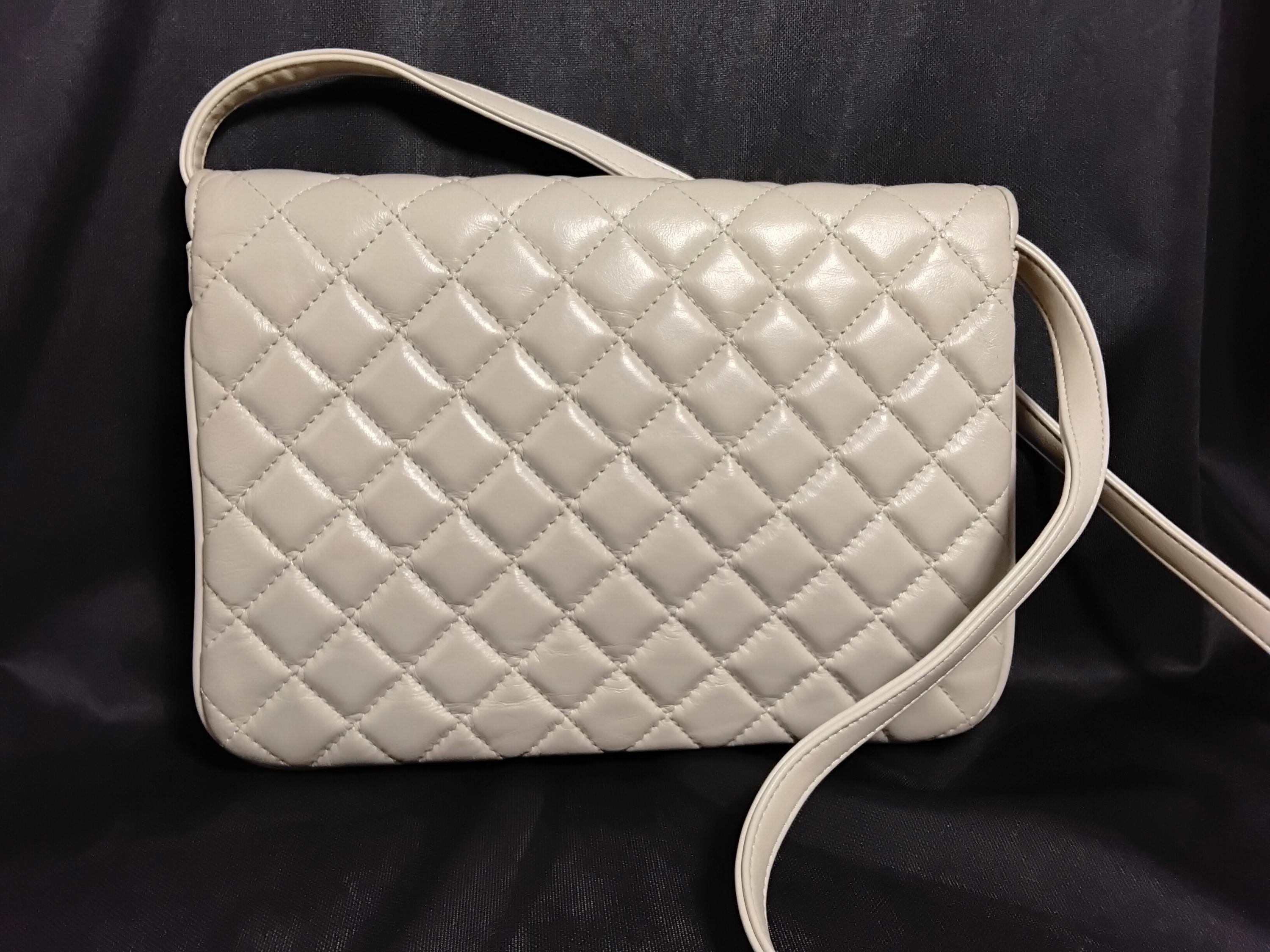 Vintage Charter Club Quilted Leather Hand Bag That can be worn 3 different ways. with a tassel pull front and magnetic snap closer. Inside Bag is two sections and a inside zipper excellent condition like new color is soft grey leather is a soft leather to the touch acute functional bag that can go with any outfit. it is 10 inches long and 7 1/2 inches wide and 10 inches tall and the drop is 16 shoulder strap.