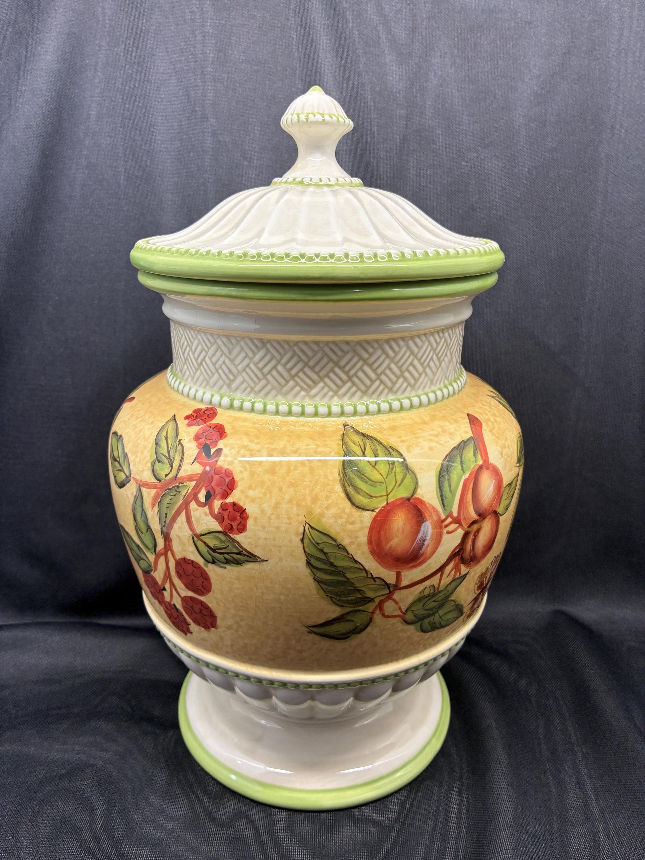 Vintage Raymond Waites certified international corporation cookie jar/canister part of the Tuscan or Umbria collection, ceramic hand painted yellow, green, red, fruit 11 inches tall 7 inches diameter. excellent condition no chips, cracks, marks.