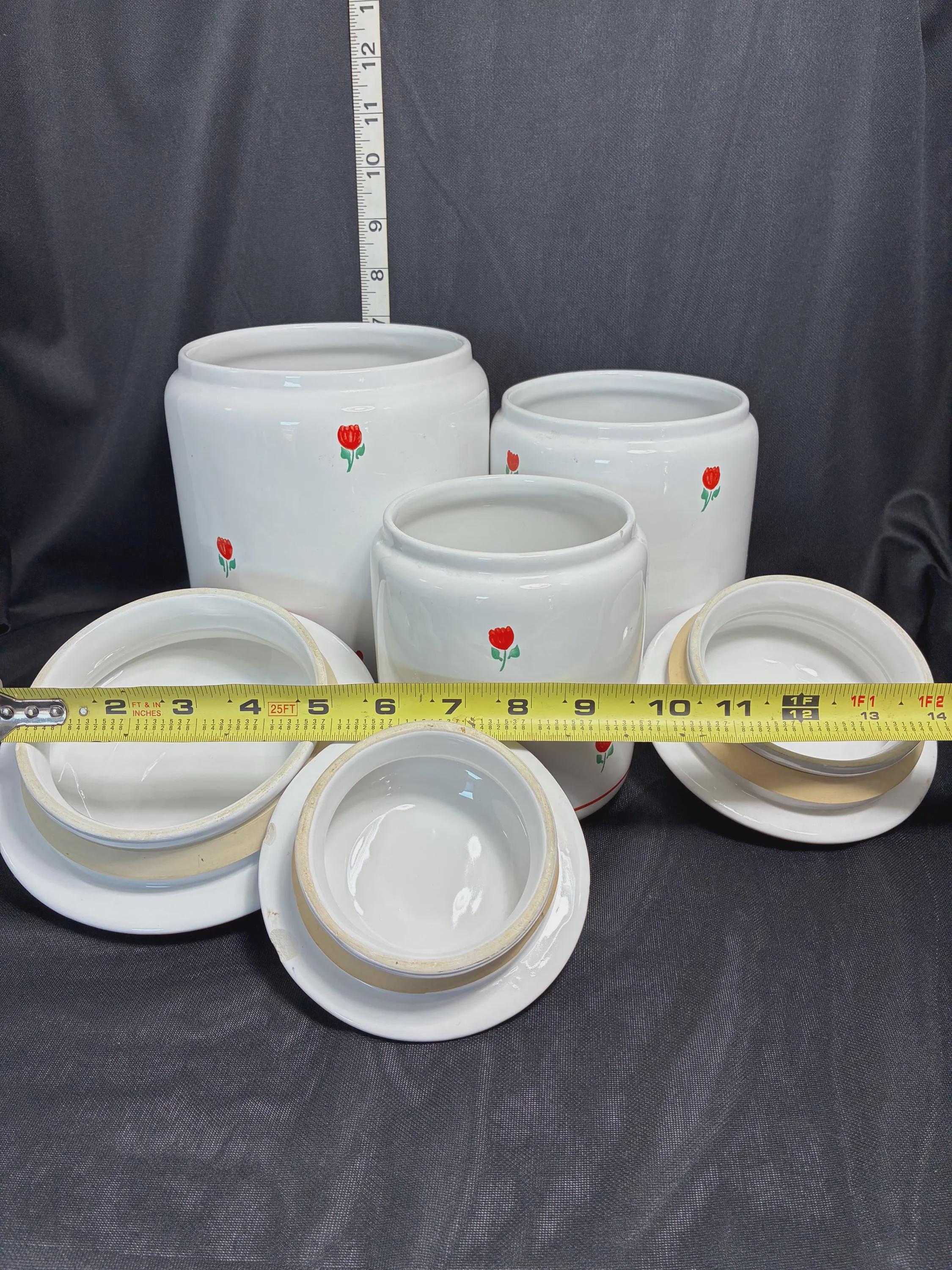 Vintage set of three ceramic canisters made by R. B. Bernarda in Portugal white with red roses, green stems and leaves glazed all has original sealer bands on the lid. The biggest canister is 7 inches tall 6 inches diameter. The medium is 5 inches diameter the small one is 4 inches diameter. The small canister lid has three inside chips. Can’t be seen with lid on the canister.