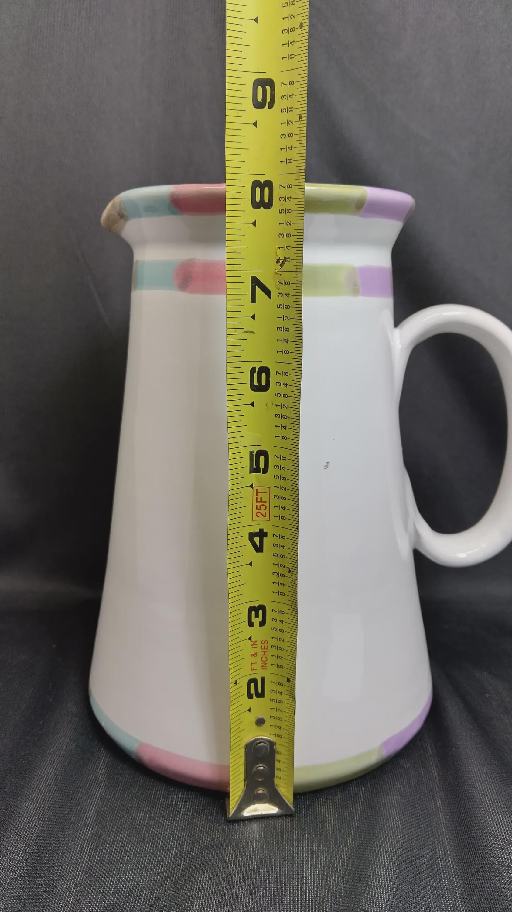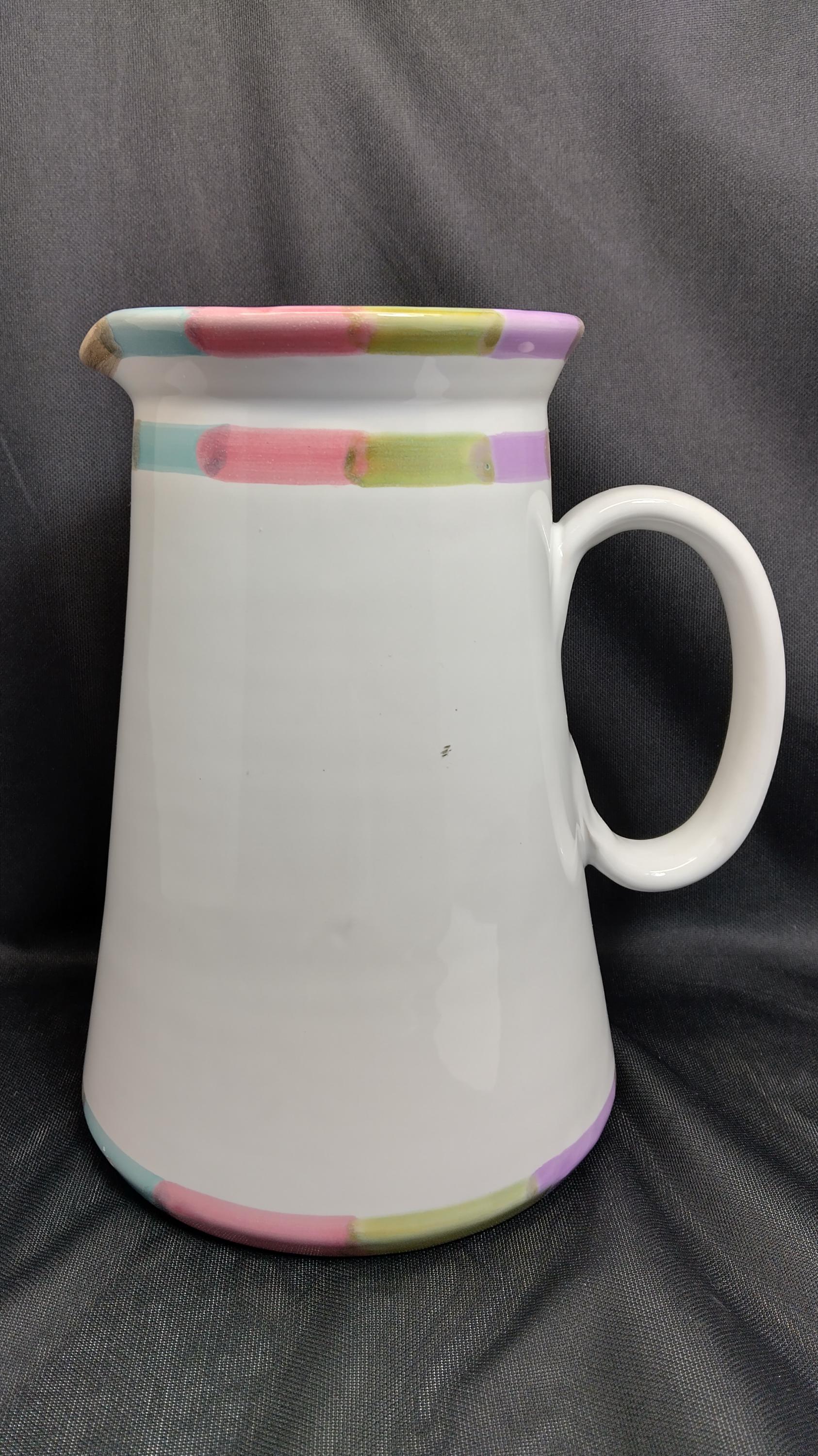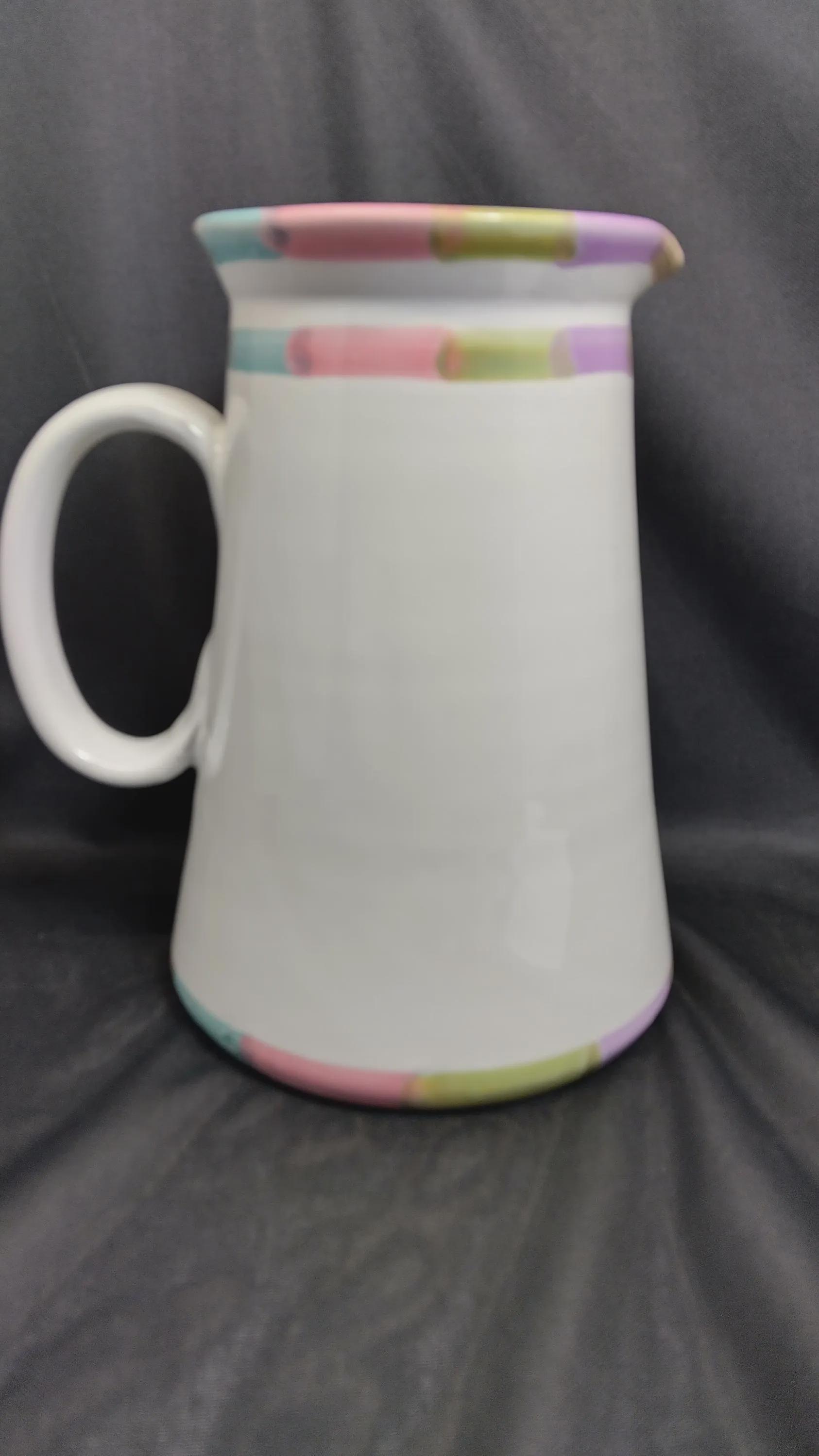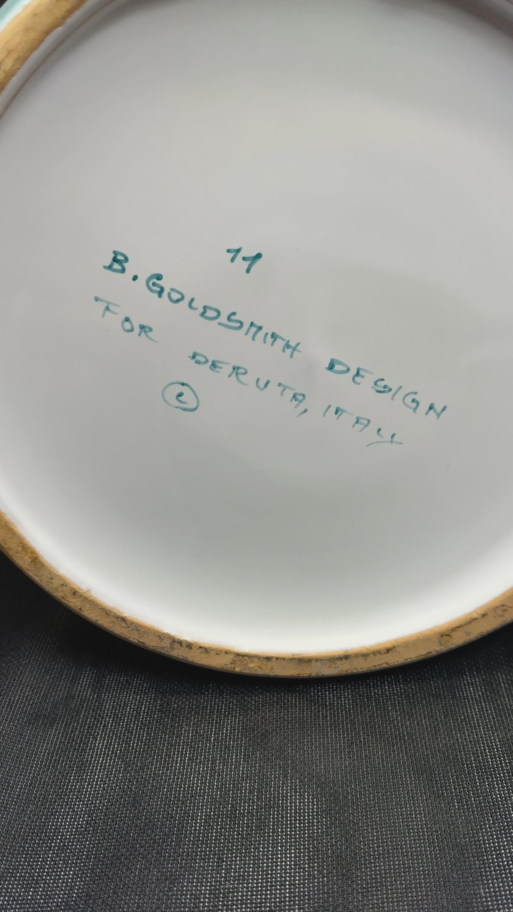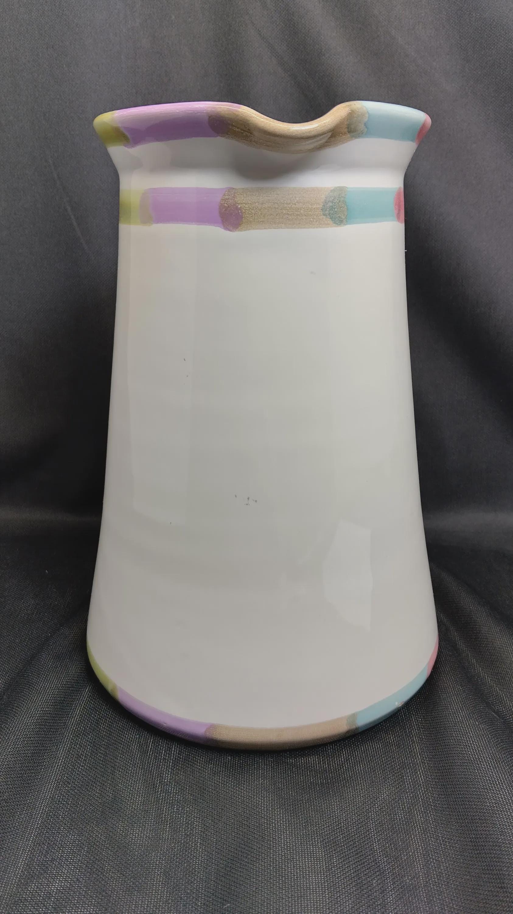 Vintage pitcher collectible item featuring a hand written Mark number 11 designed by Bill Goldsmith for Deruta Italy marked with a circle L symbol. This is part of a collection design by Bill Goldsmith a renowned ceramics manufacturers appears to be of the bello or Circo designs both exclusive and classic lines known for vibrant hand-painted details Majolica ware. Approximately 8 in tall 5 in diameter excellent condition no chips marks scratches of any kind.