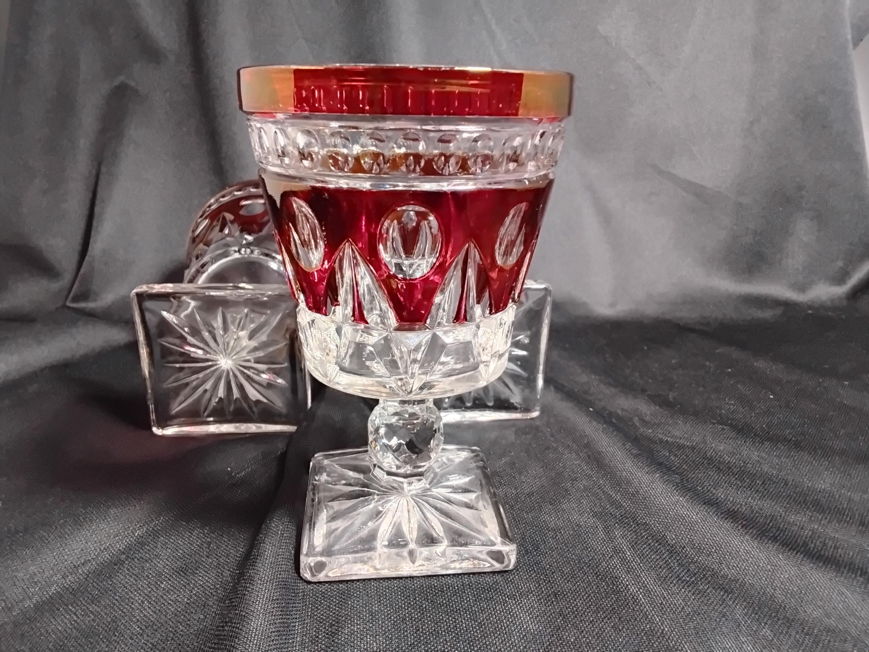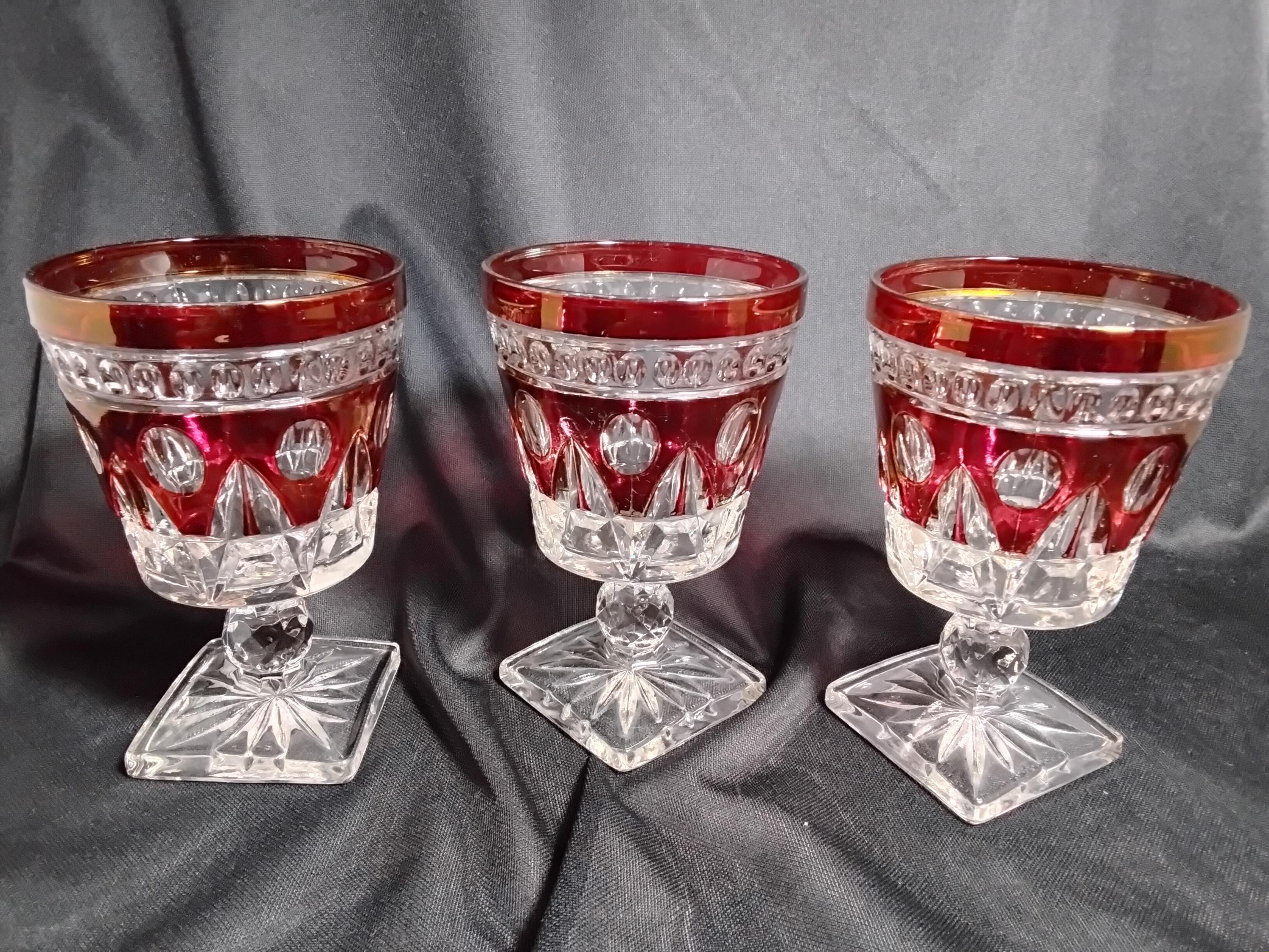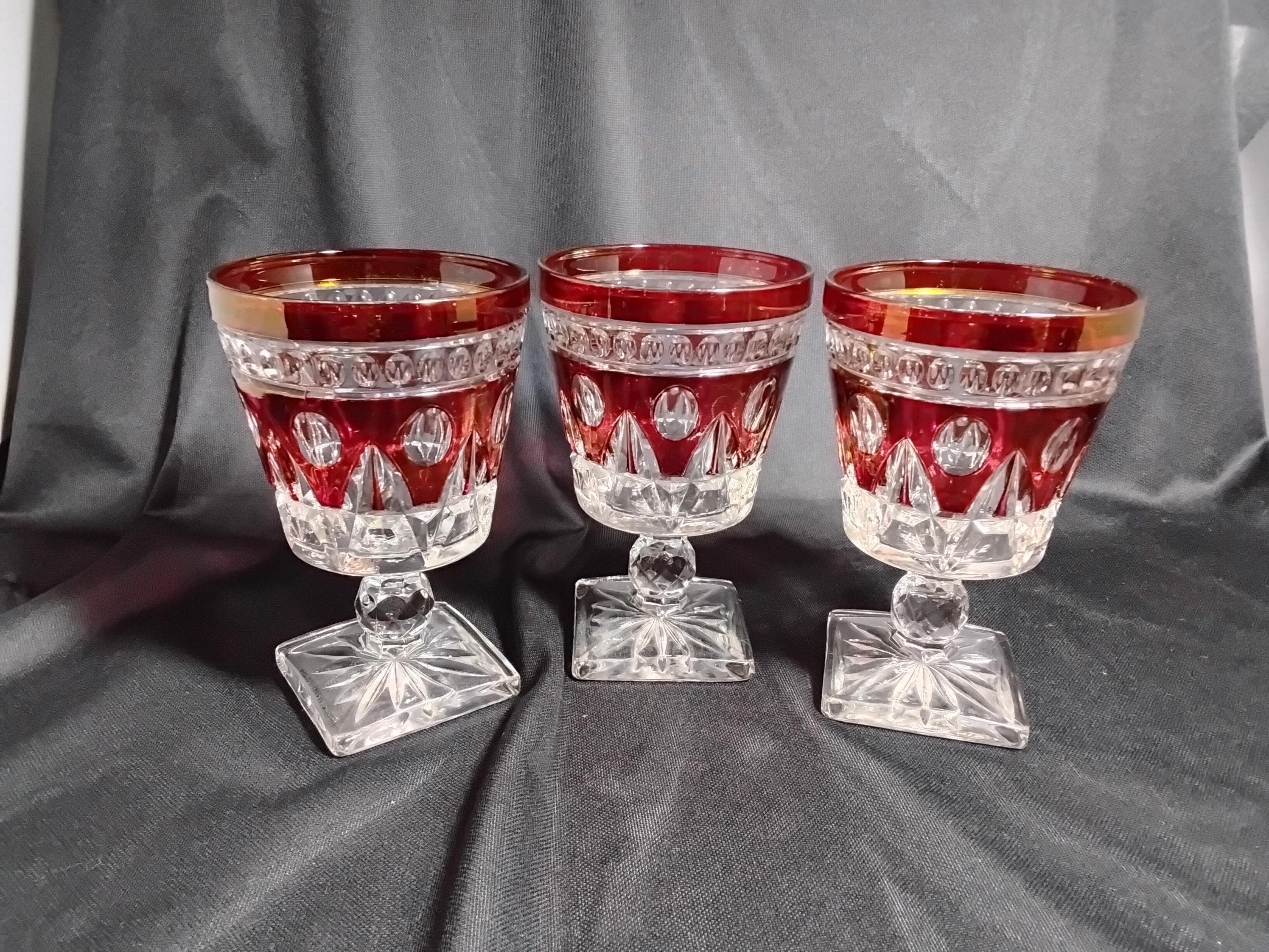 Beautiful regal looking Park Lane Ruby Red Flash water goblets by Indiana Glass are vintage from 1957 through early 1980's. The are in very good condition considering there age. Pattern is a unique thumprint design and a square starburst design on the base. To use or collect and display. They are unique and cango with any decor. Each glass is 5 1/4" tall, 4" wide. Each weigh 12oz. Set of 3.