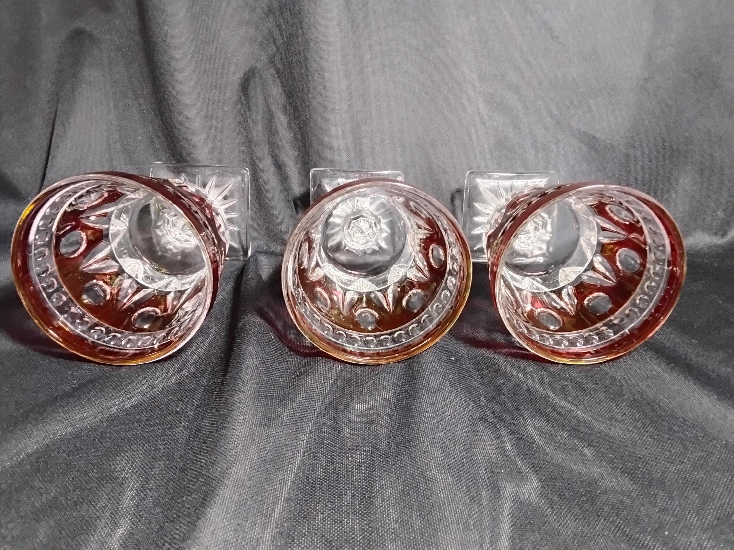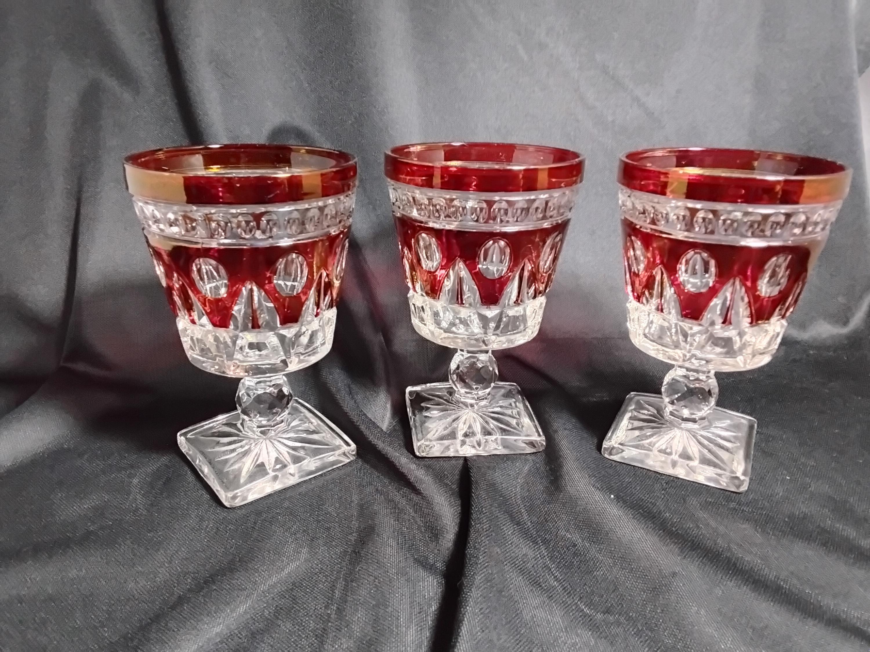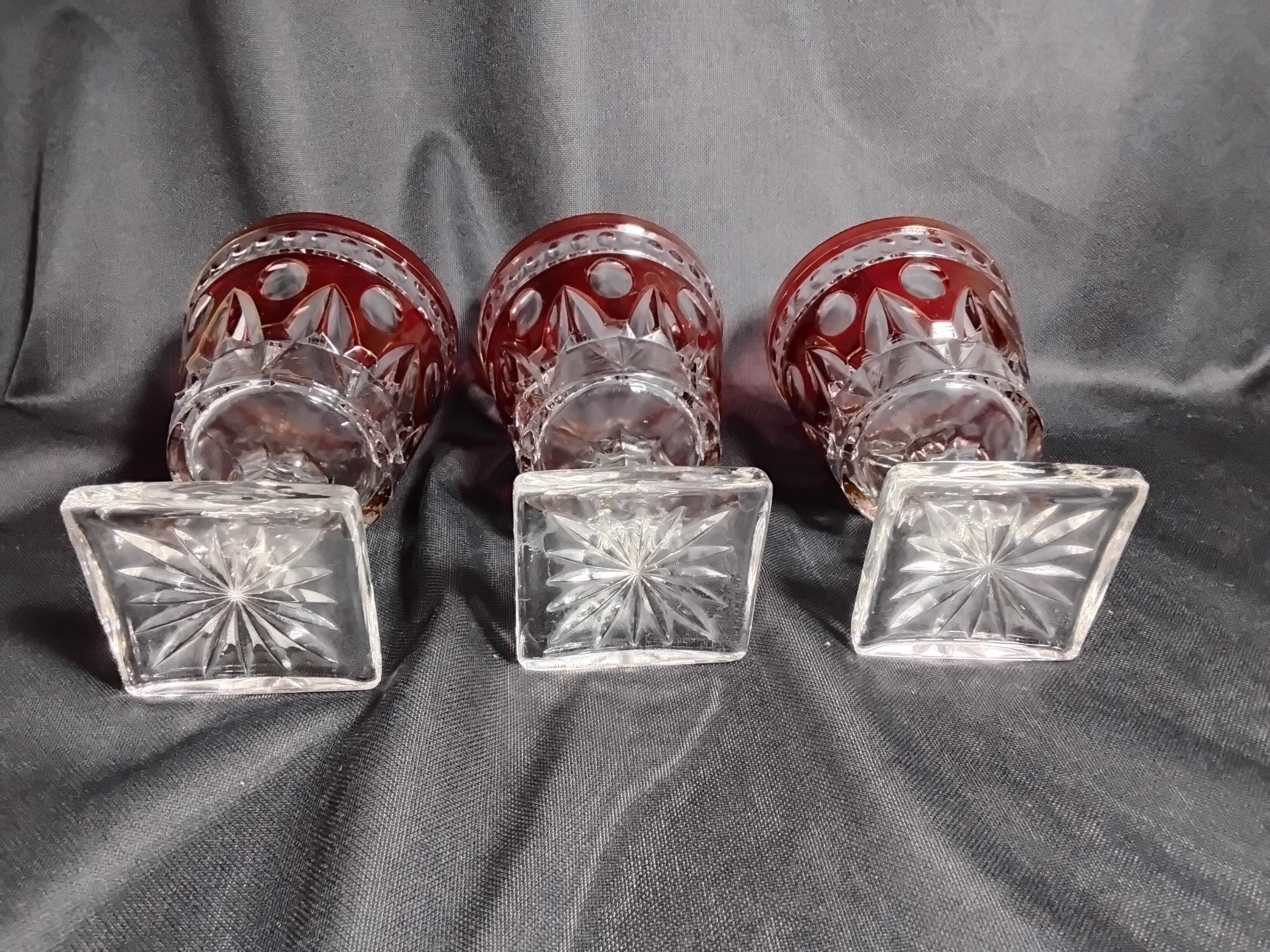 Beautiful regal looking Park Lane Ruby Red Flash water goblets by Indiana Glass are vintage from 1957 through early 1980's. The are in very good condition considering there age. Pattern is a unique thumprint design and a square starburst design on the base. To use or collect and display. They are unique and cango with any decor. Each glass is 5 1/4" tall, 4" wide. Each weigh 12oz. Set of 3.