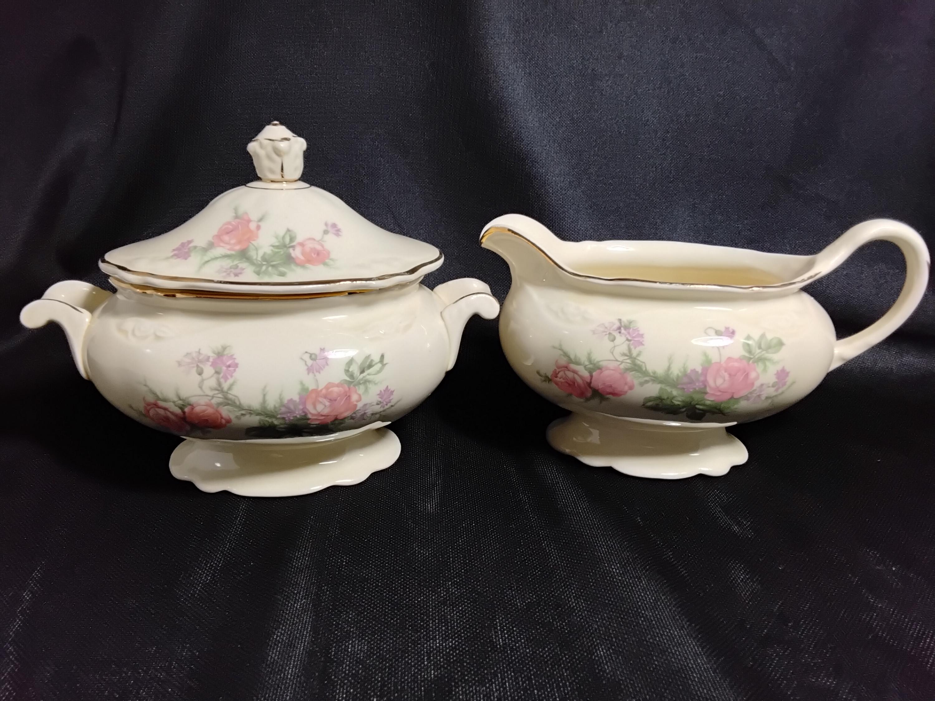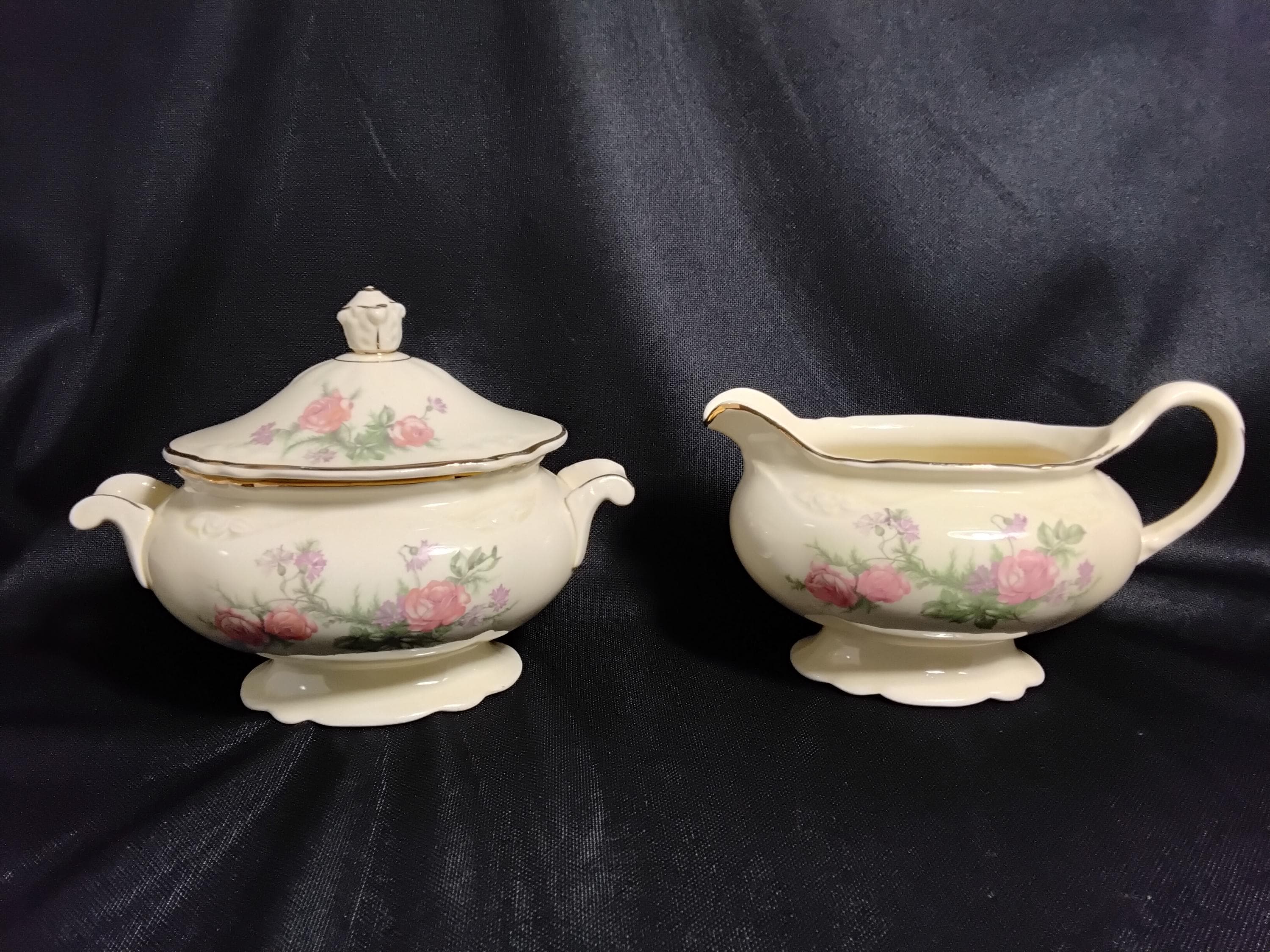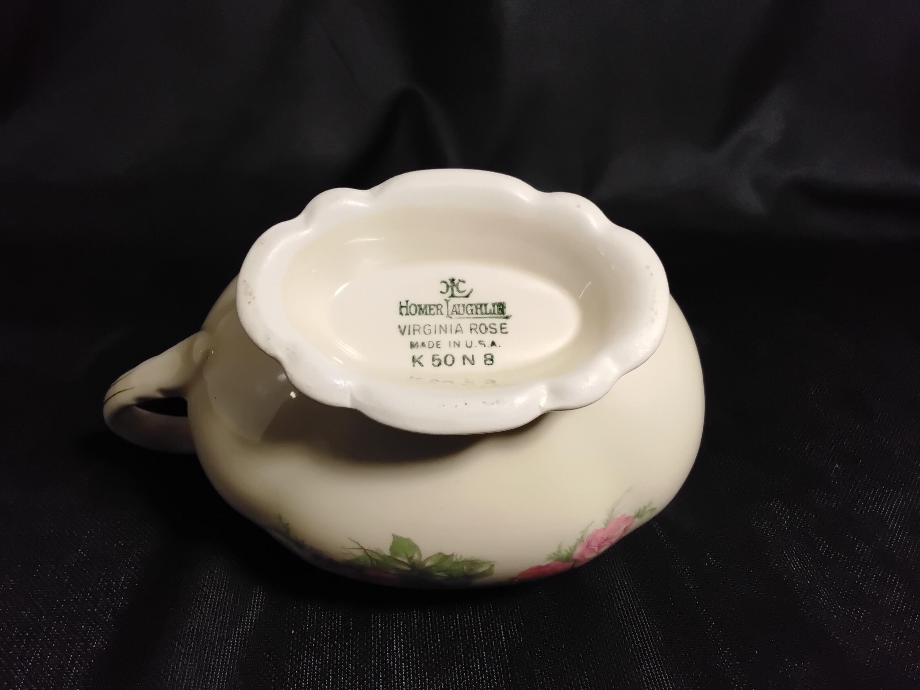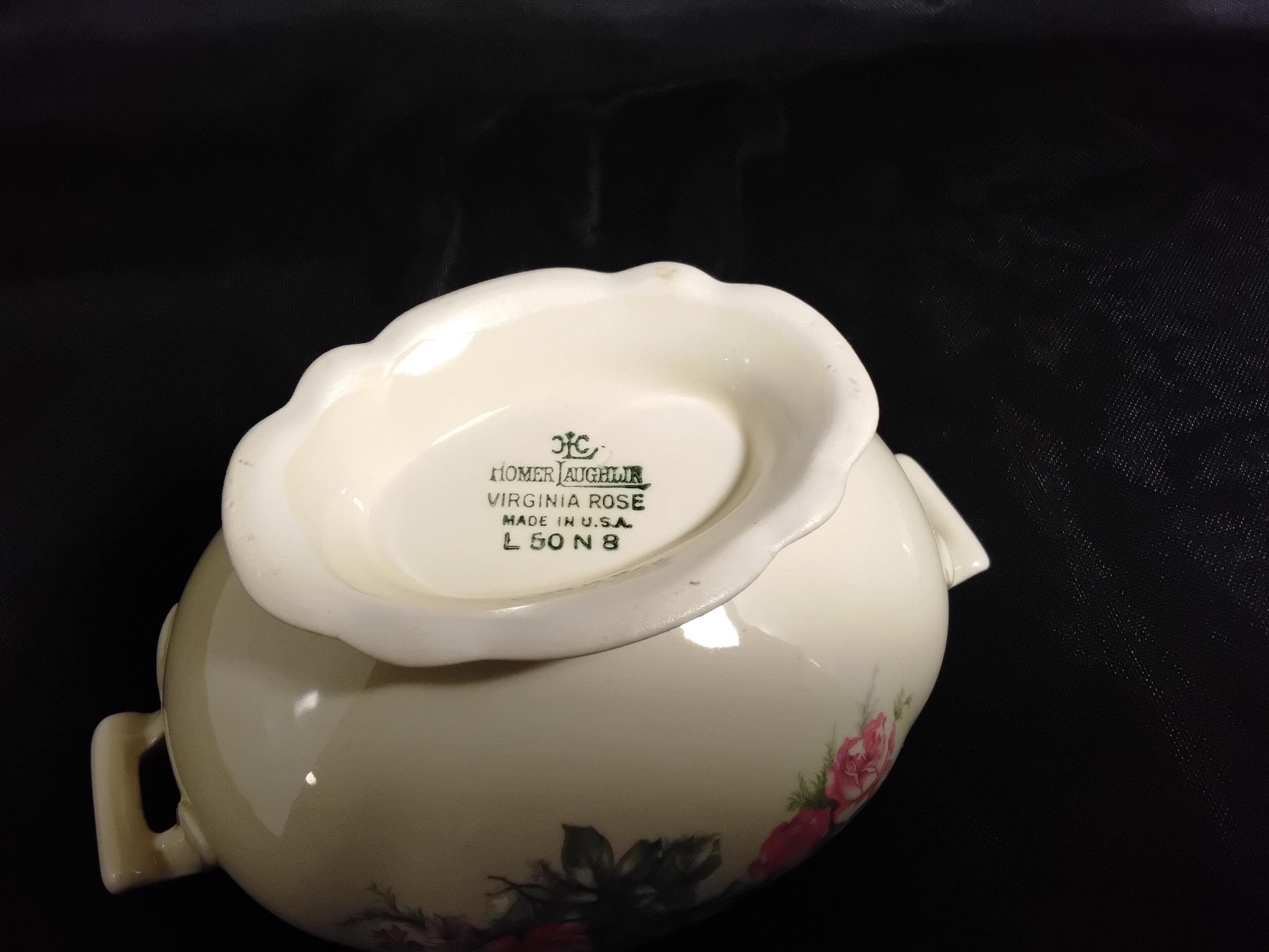 Homer Laughlin mid century 1950's sugar and creamer set is beautiful. The sought after Virginia Rose pattern is done in Nautilus Eggshell and marked K50 N 8. For the creamer, sugar is marked L50 N 8.Pretty gold trim with embossed floral design, creamy eggshell glaze is stunning. Collectors and lovers of Homer Laughlin will love this. Sugar measures 5.5" tall, 7.5" long, 3" wide. Creamer is 3" tall, 6" long, 3" wide. Excellent condition, no chips or cracks, normal wear on bottoms. Appears never used.