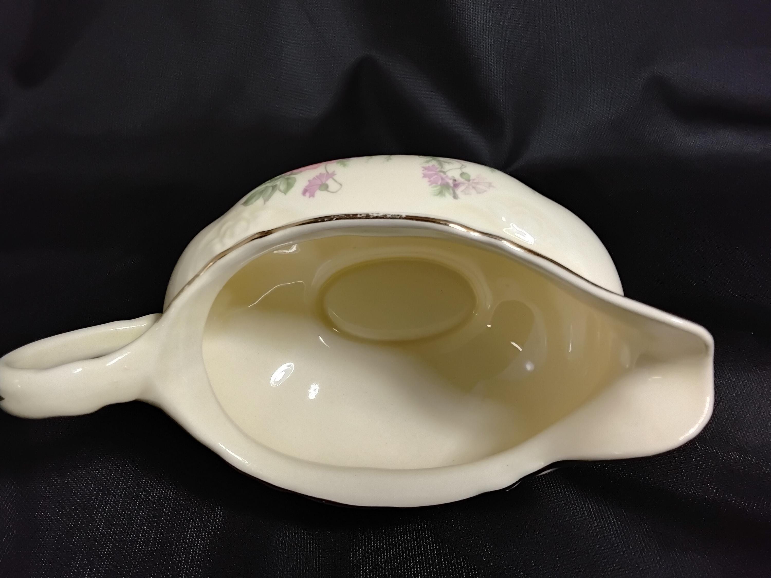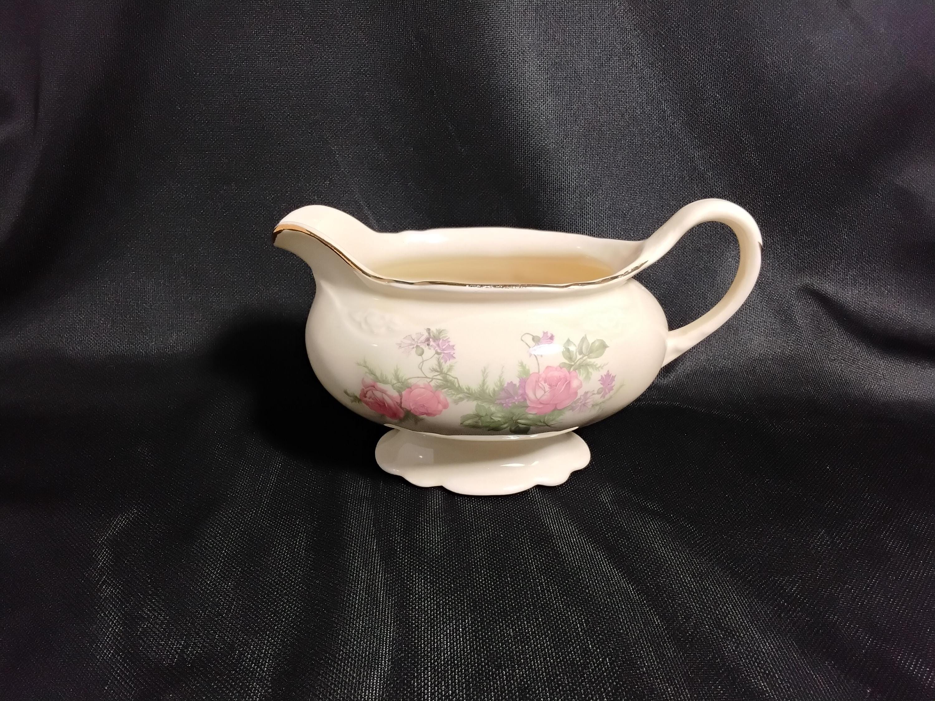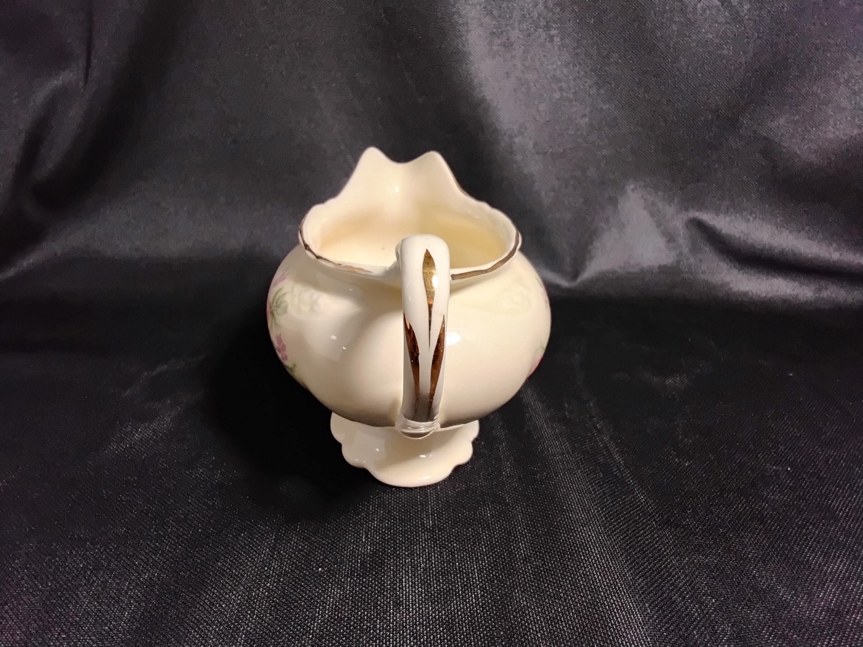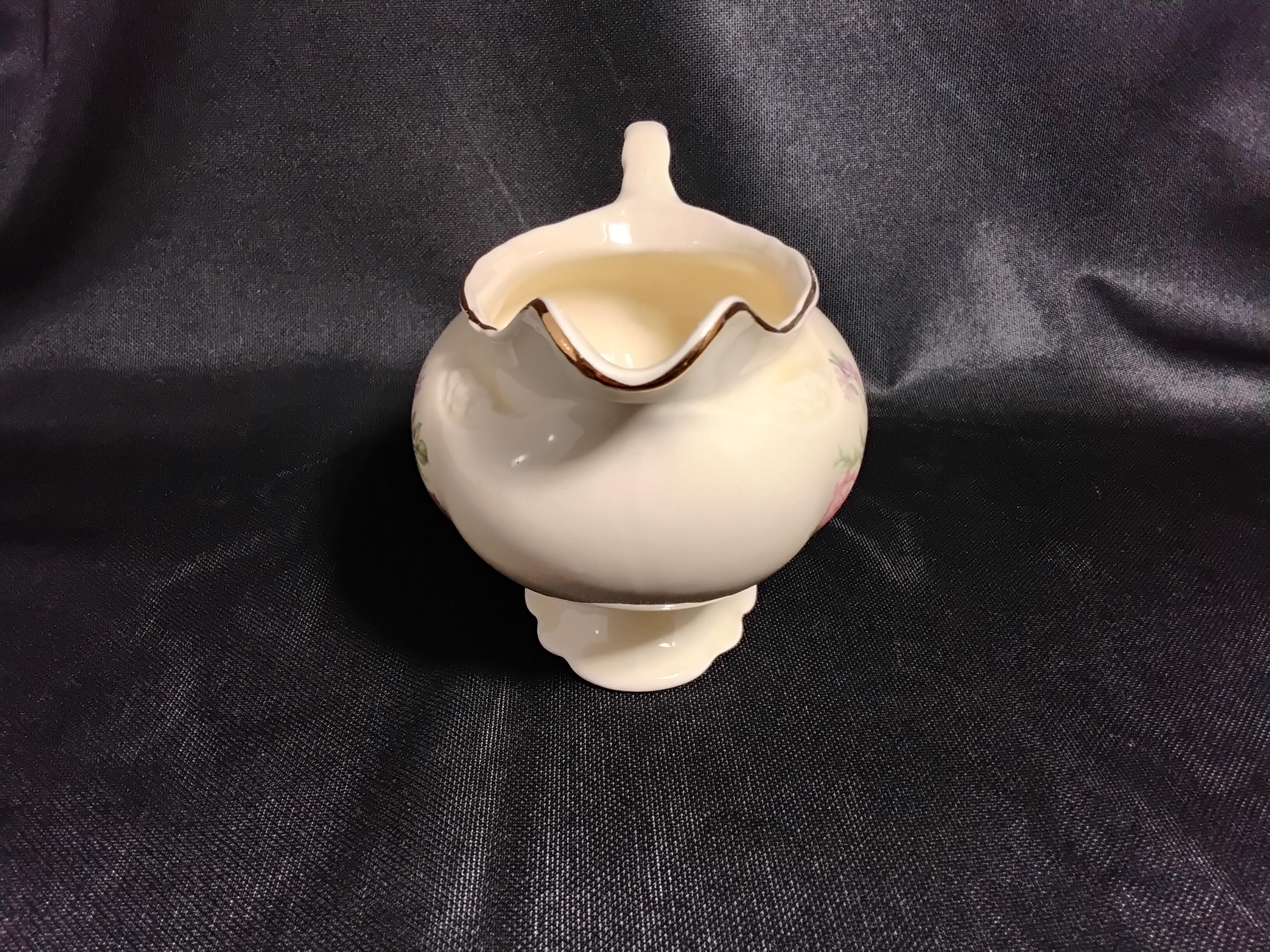 Homer Laughlin mid century 1950's sugar and creamer set is beautiful. The sought after Virginia Rose pattern is done in Nautilus Eggshell and marked K50 N 8. For the creamer, sugar is marked L50 N 8.Pretty gold trim with embossed floral design, creamy eggshell glaze is stunning. Collectors and lovers of Homer Laughlin will love this. Sugar measures 5.5" tall, 7.5" long, 3" wide. Creamer is 3" tall, 6" long, 3" wide. Excellent condition, no chips or cracks, normal wear on bottoms. Appears never used.