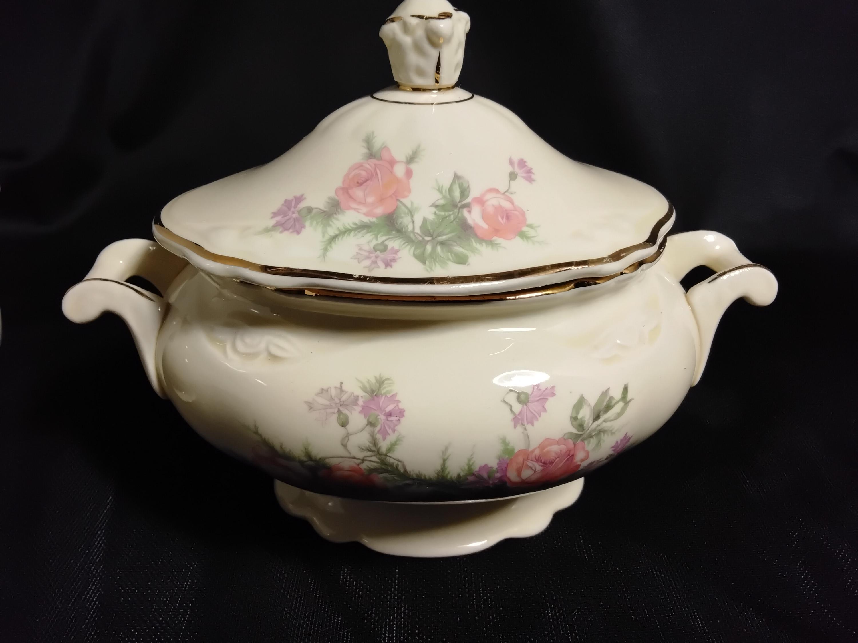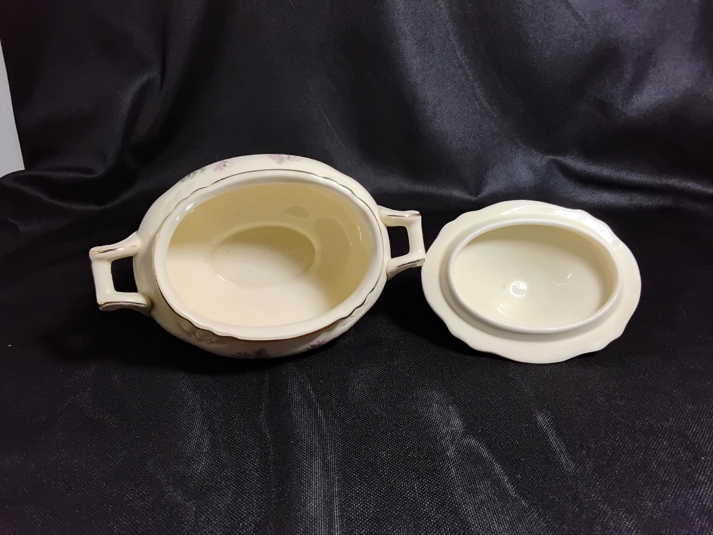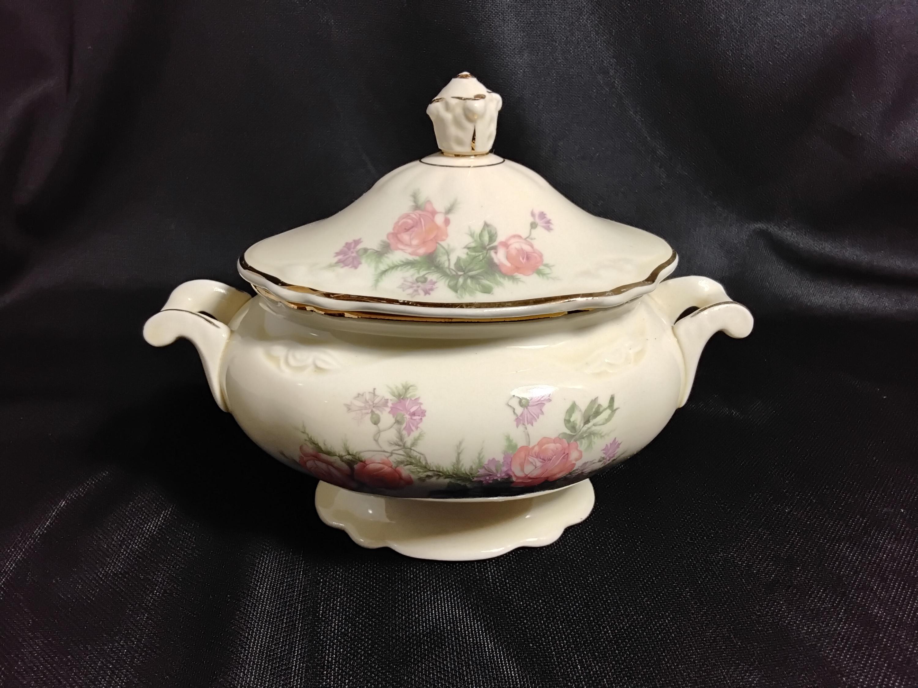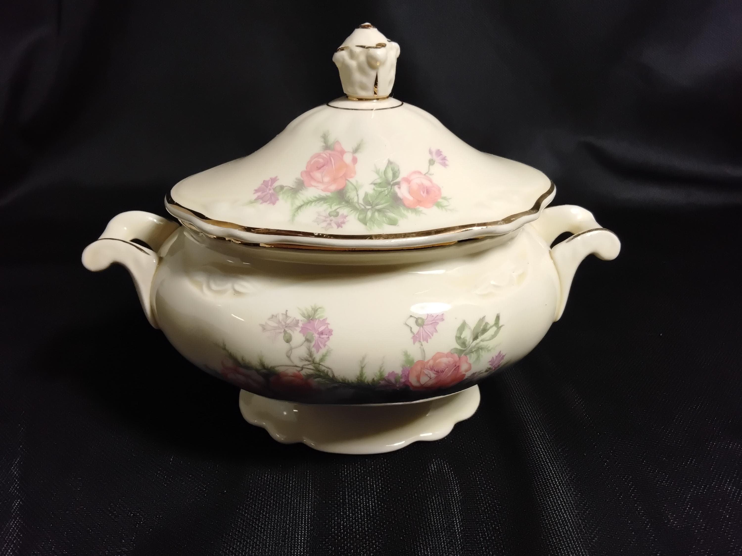 Homer Laughlin mid century 1950's sugar and creamer set is beautiful. The sought after Virginia Rose pattern is done in Nautilus Eggshell and marked K50 N 8. For the creamer, sugar is marked L50 N 8.Pretty gold trim with embossed floral design, creamy eggshell glaze is stunning. Collectors and lovers of Homer Laughlin will love this. Sugar measures 5.5" tall, 7.5" long, 3" wide. Creamer is 3" tall, 6" long, 3" wide. Excellent condition, no chips or cracks, normal wear on bottoms. Appears never used.