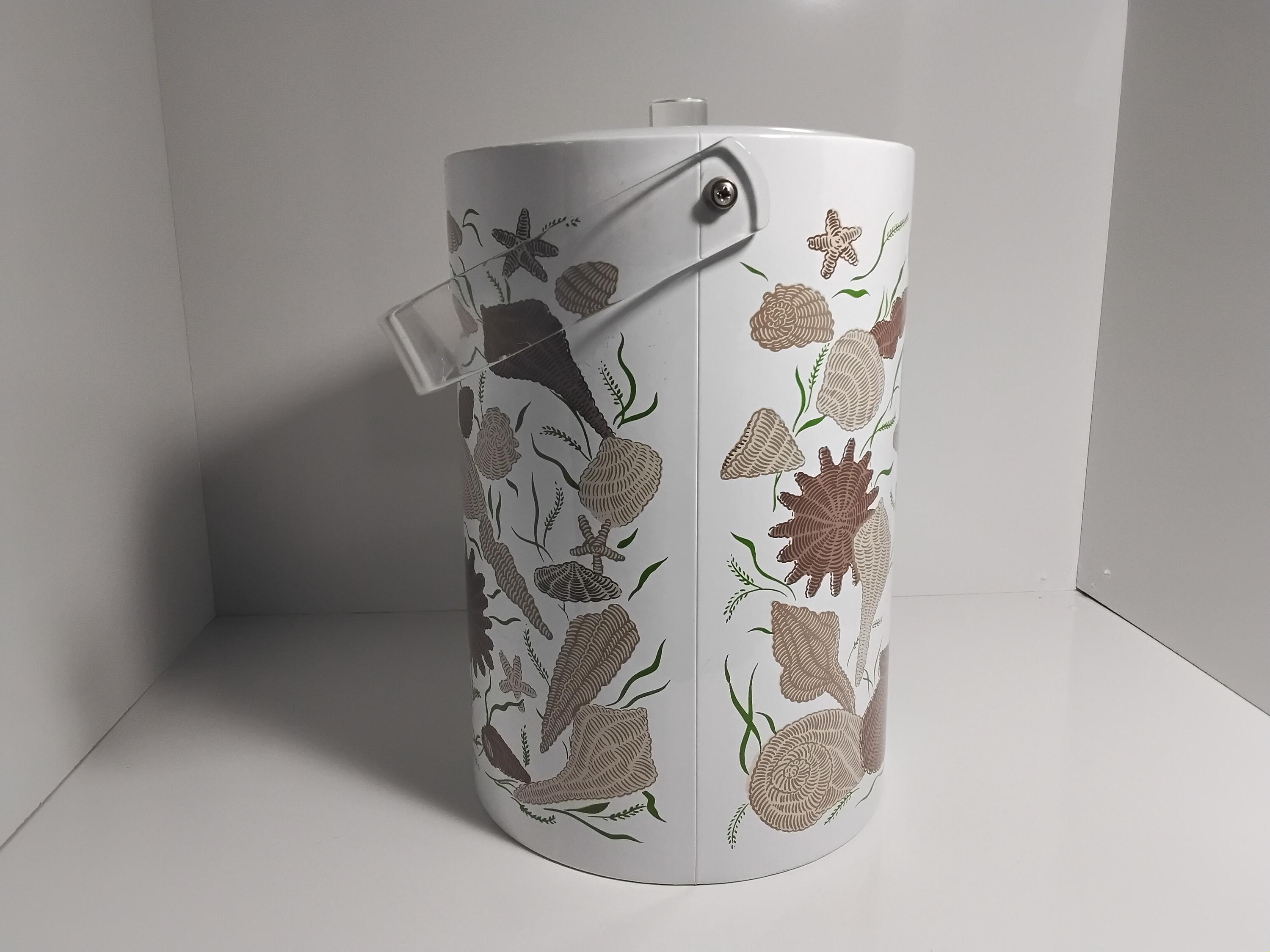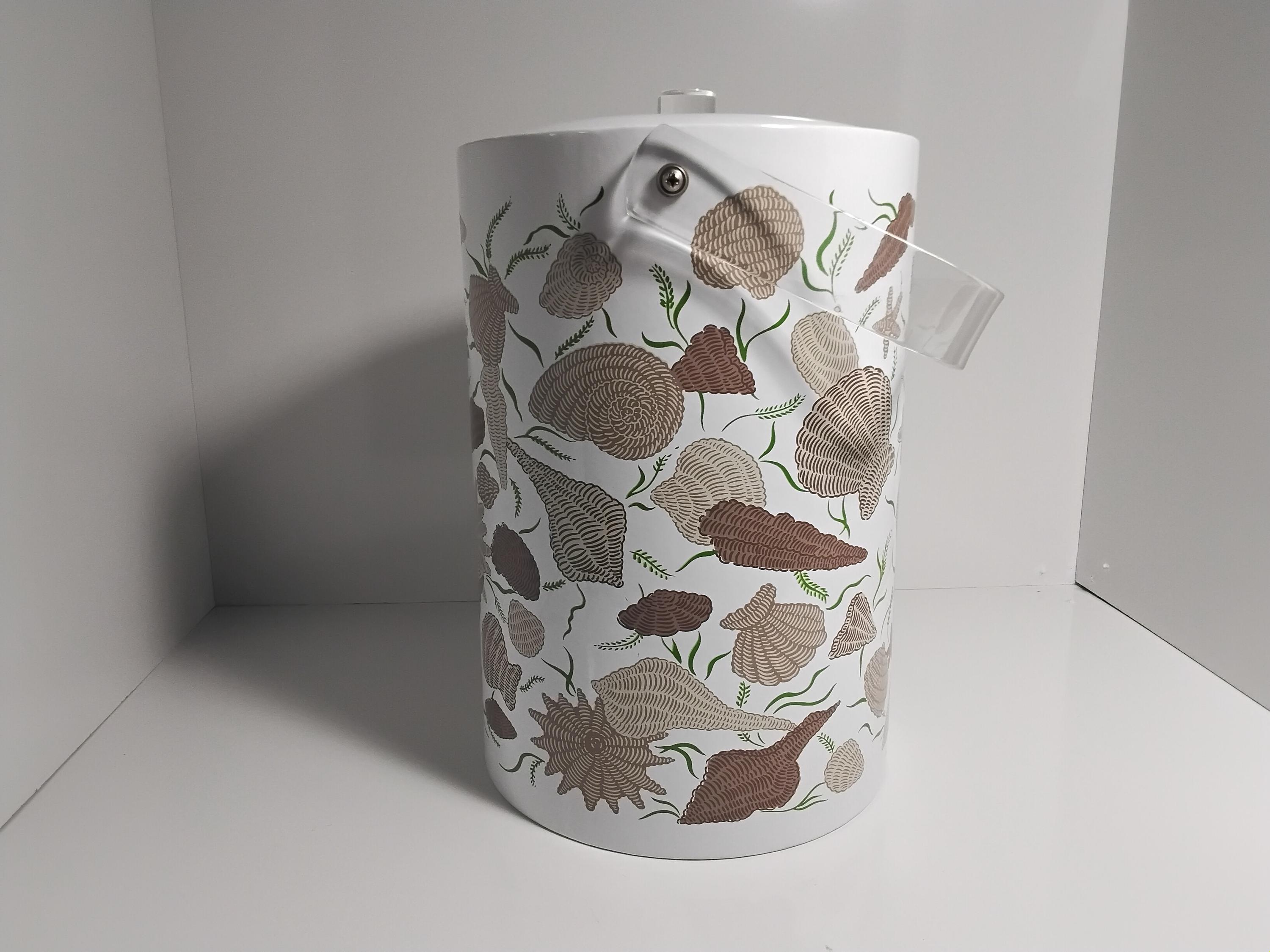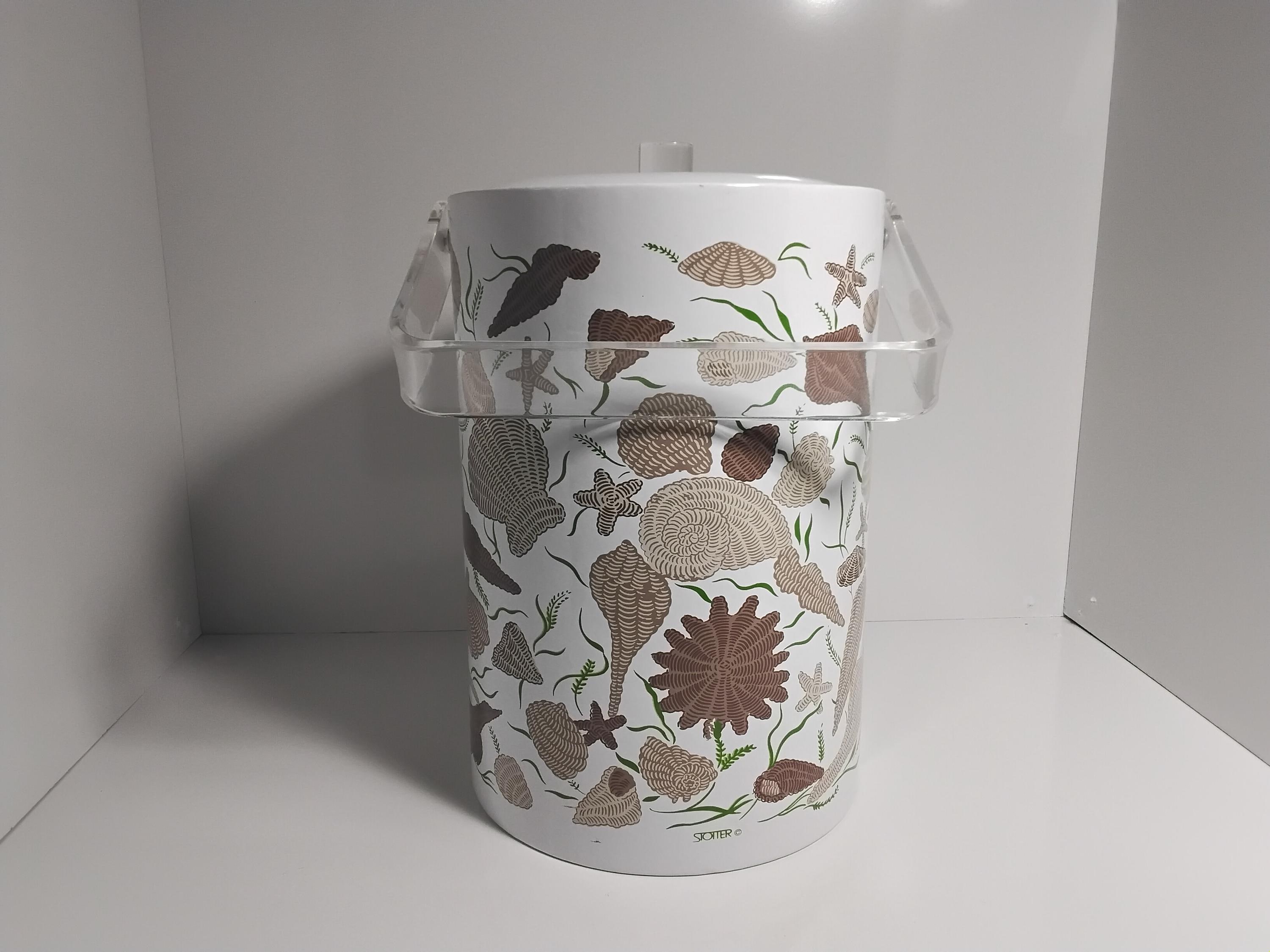 Mid century modern pretty ice bucket by Stotter aka. Taste Setter by Stignia. Vintage 1970's design is classic with lucite handle and acrylic knob. Insulated inside. Perfect condition, no flaws. Measures 11.5" tall, 7.5" diameter. Outter material is vinyl. Great addition to your bar or in the kitchen. Coastal decor or really any decor. Colors are brown, taupe, green. Very pretty. Appears never used.