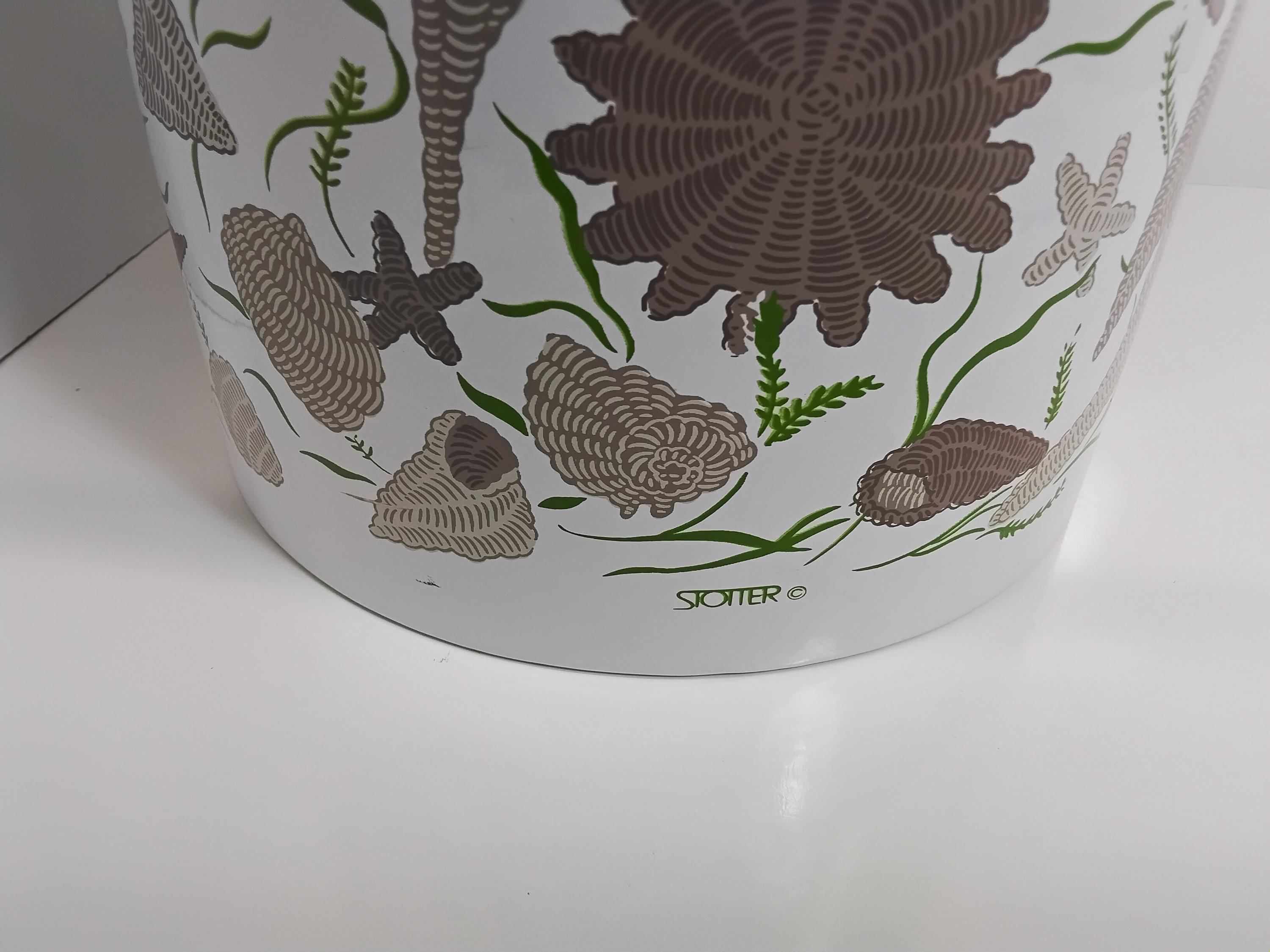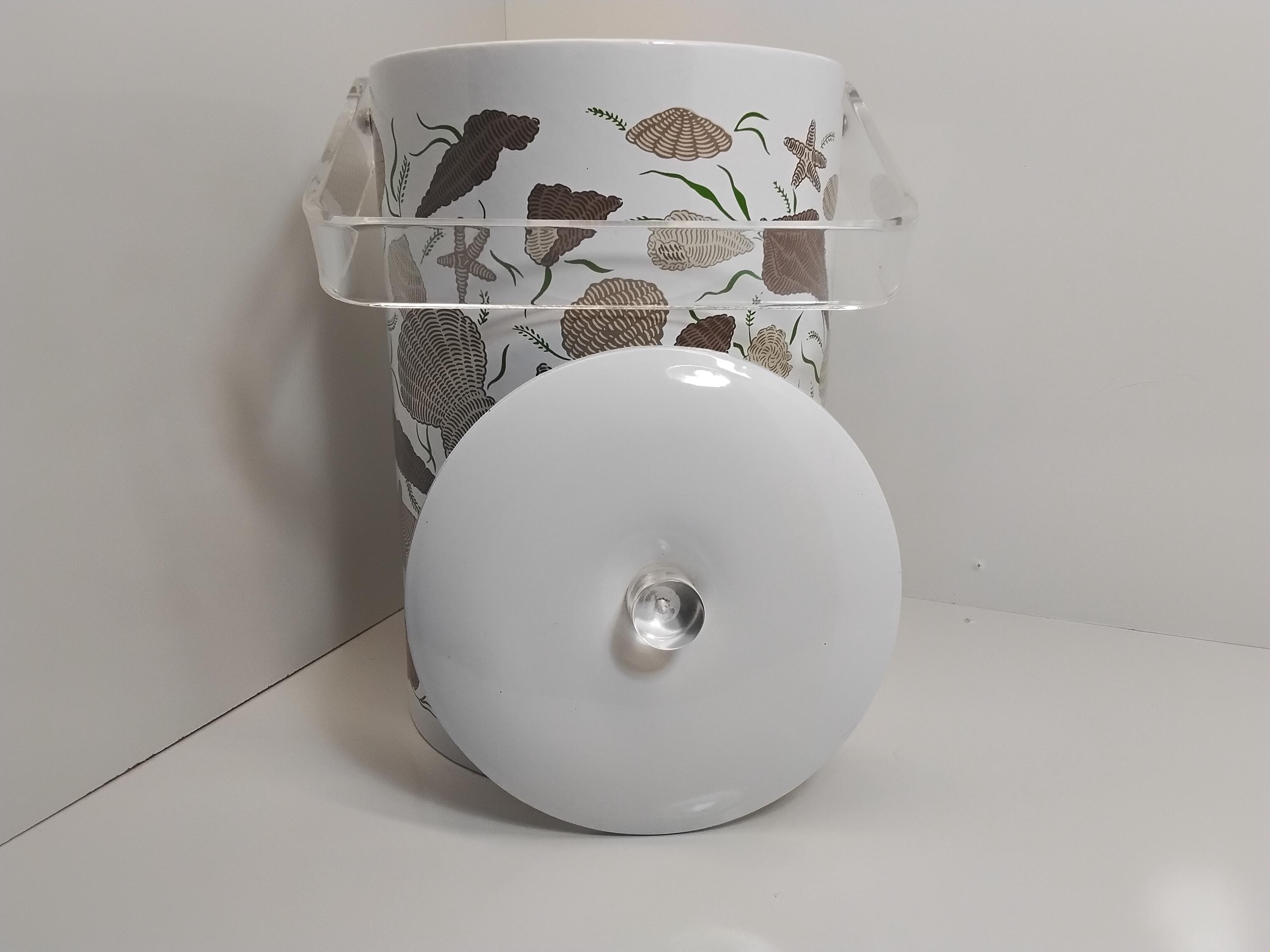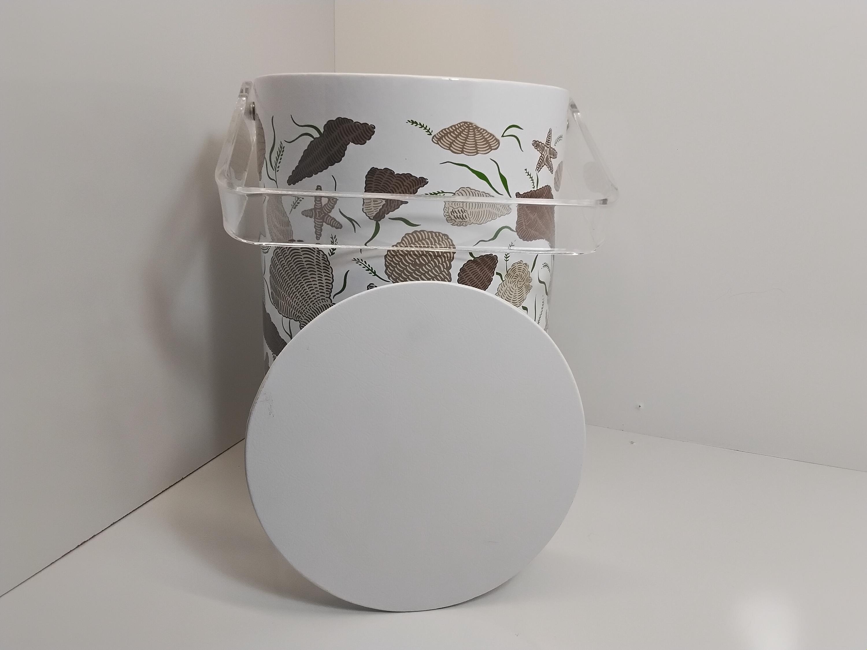 Mid century modern pretty ice bucket by Stotter aka. Taste Setter by Stignia. Vintage 1970's design is classic with lucite handle and acrylic knob. Insulated inside. Perfect condition, no flaws. Measures 11.5" tall, 7.5" diameter. Outter material is vinyl. Great addition to your bar or in the kitchen. Coastal decor or really any decor. Colors are brown, taupe, green. Very pretty. Appears never used.