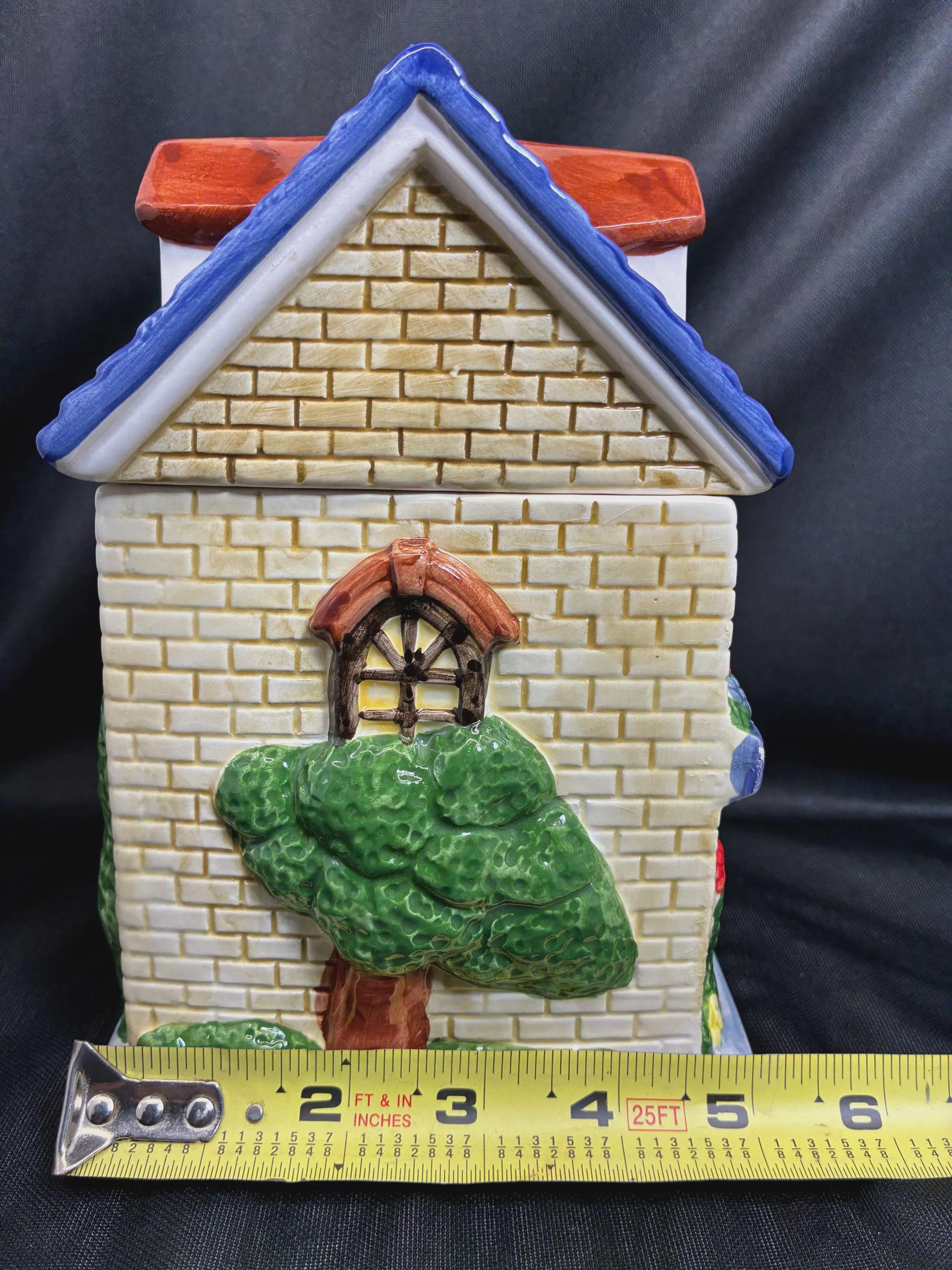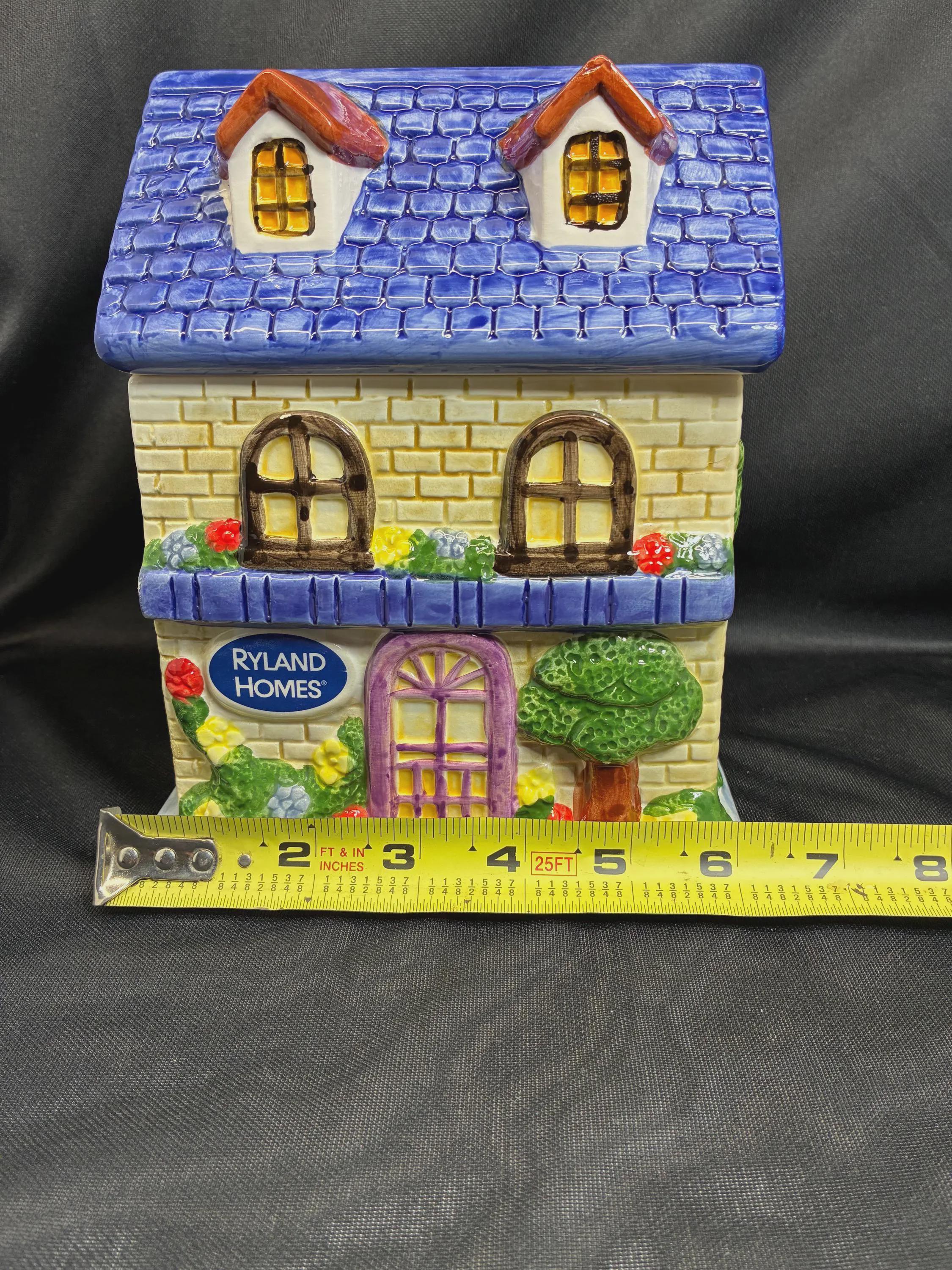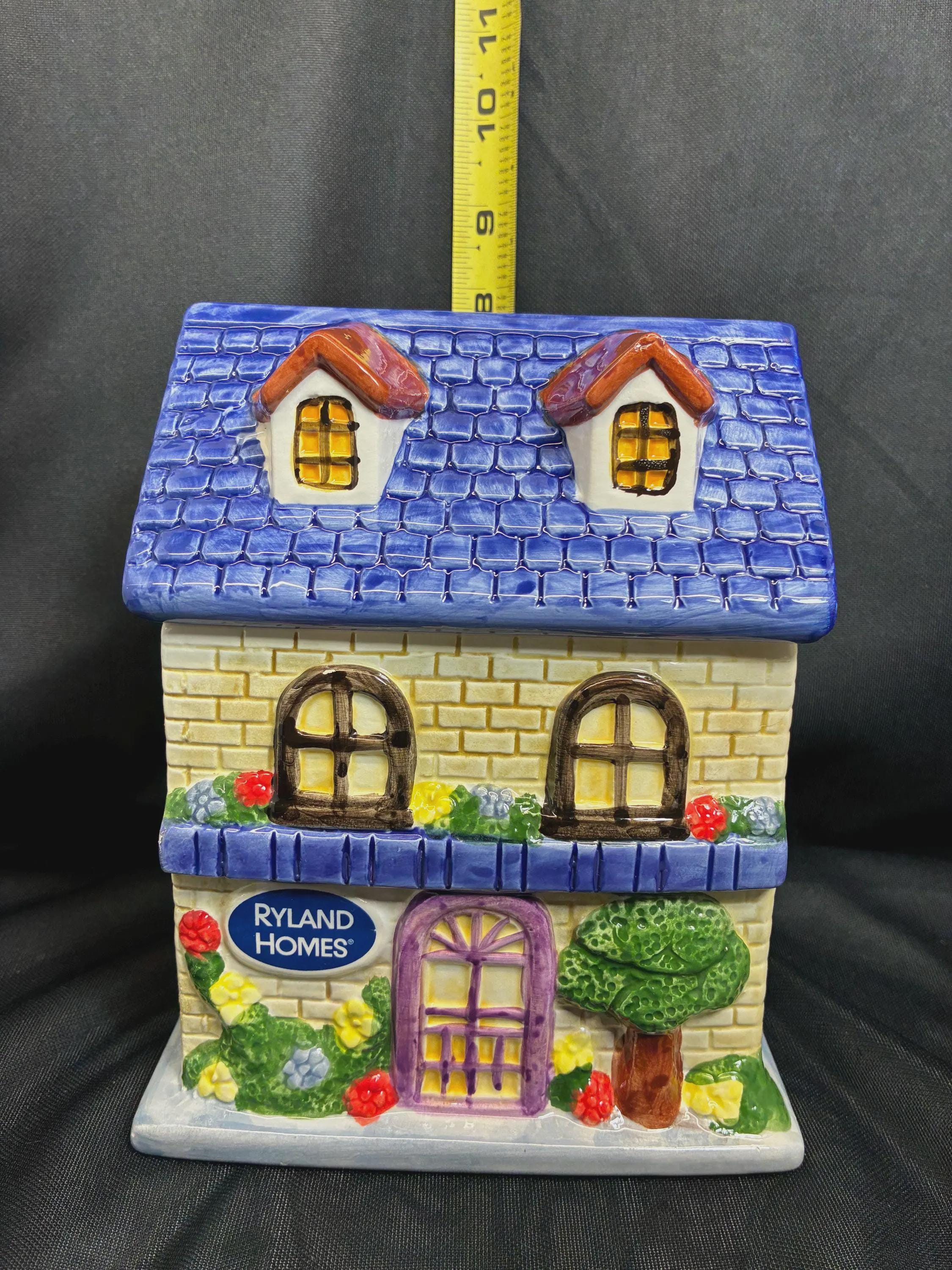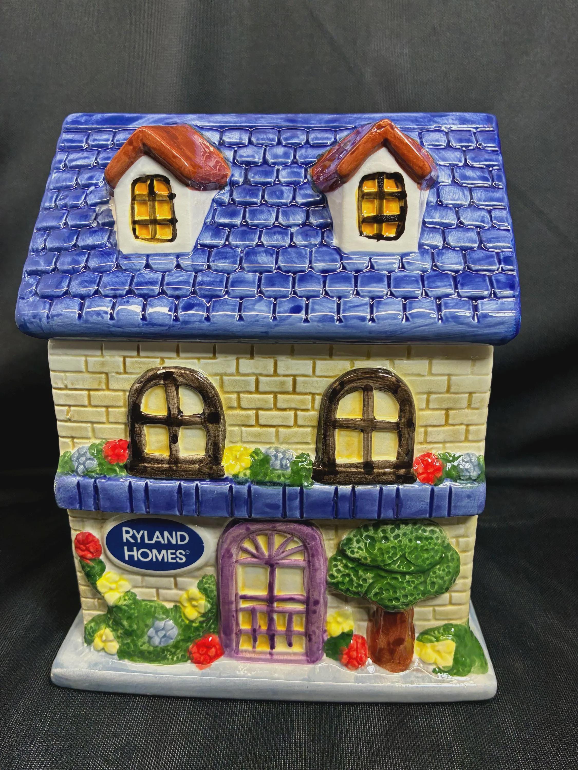 Vintage cookie jar house by Ryland Holmes collector item real estate company. This is an novelty ceramic house excellent condition one small chip on the roof blue edge. Please see photo approximately 8 inches tall 6 inches long 5 inches from front to back.