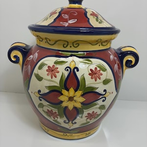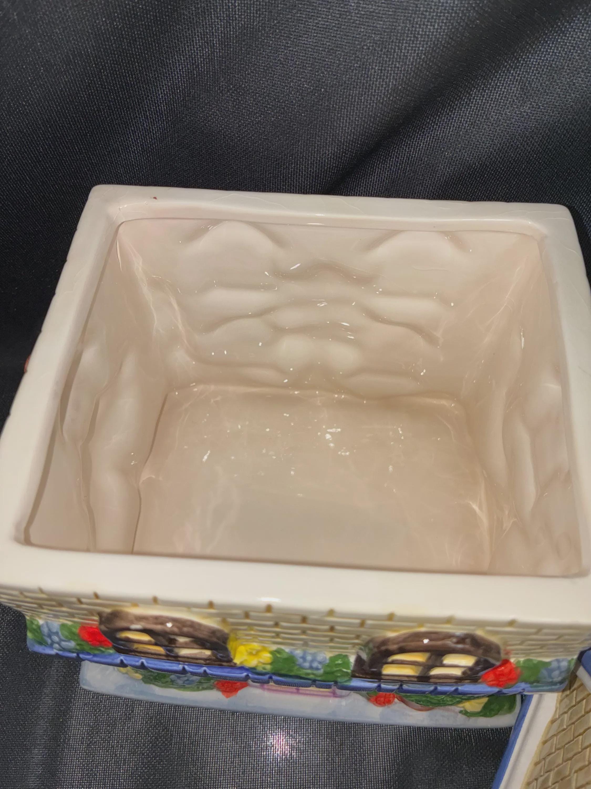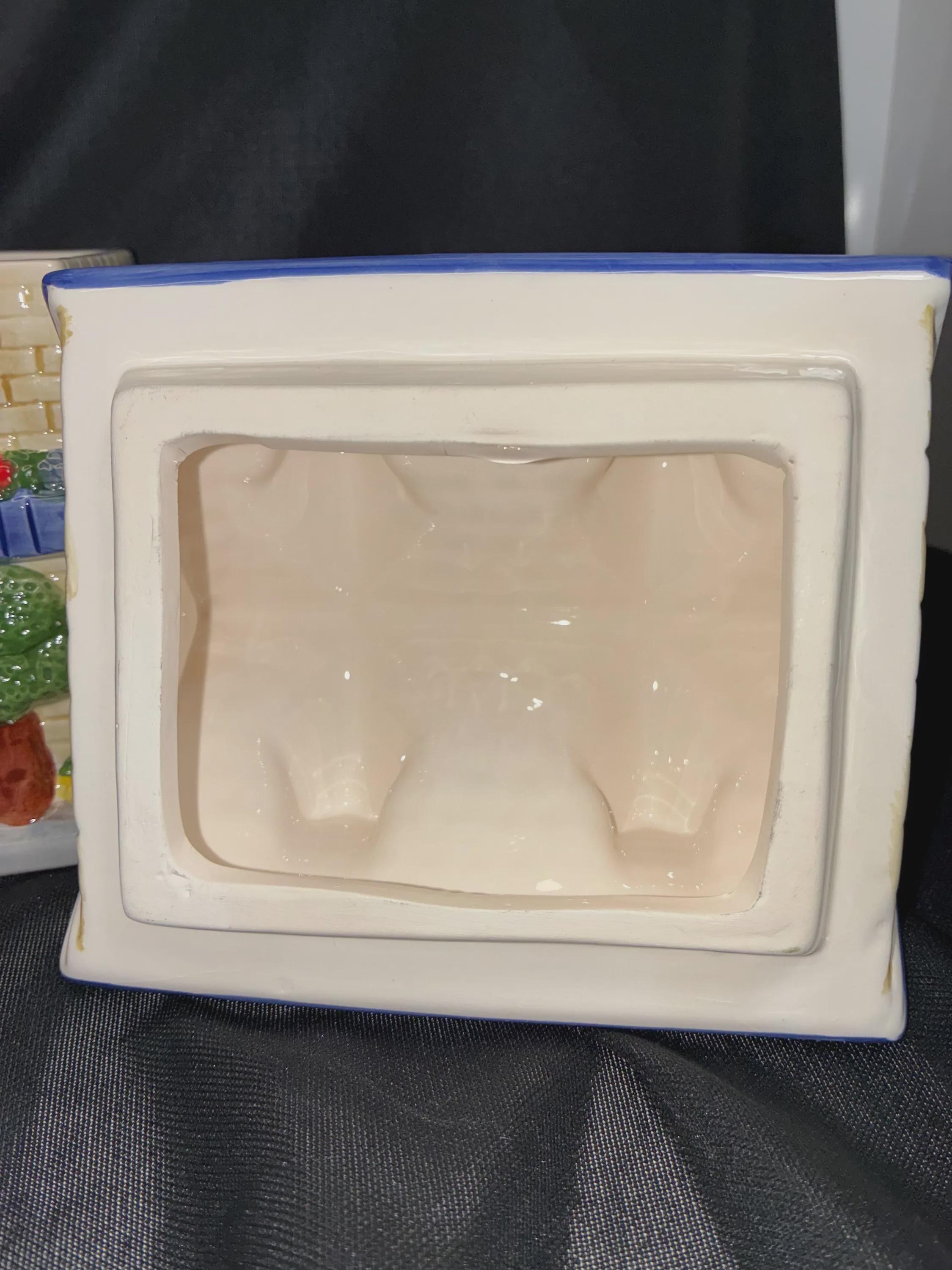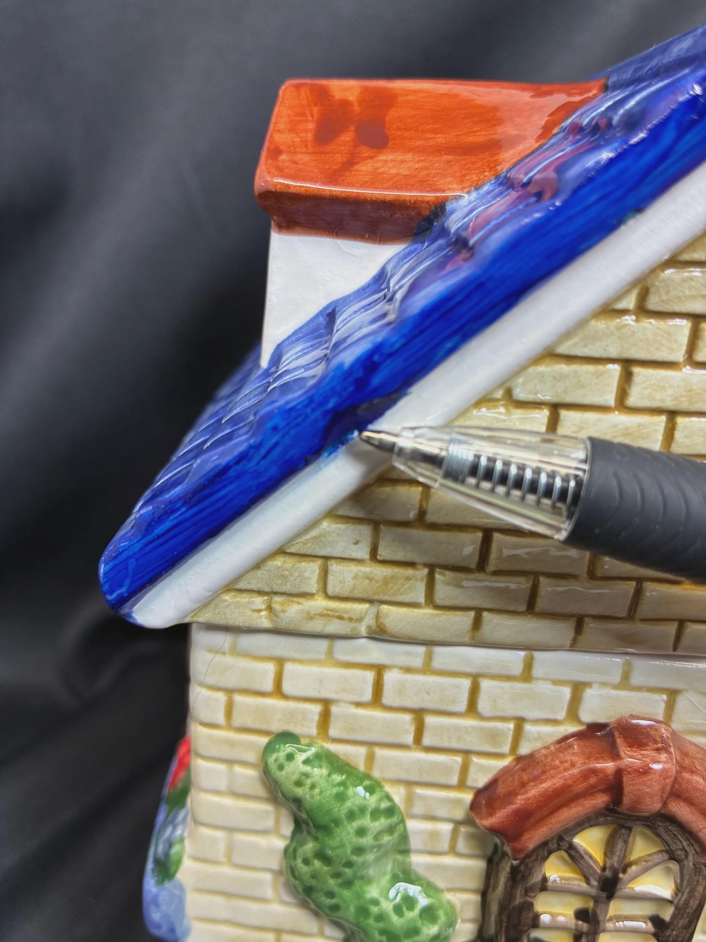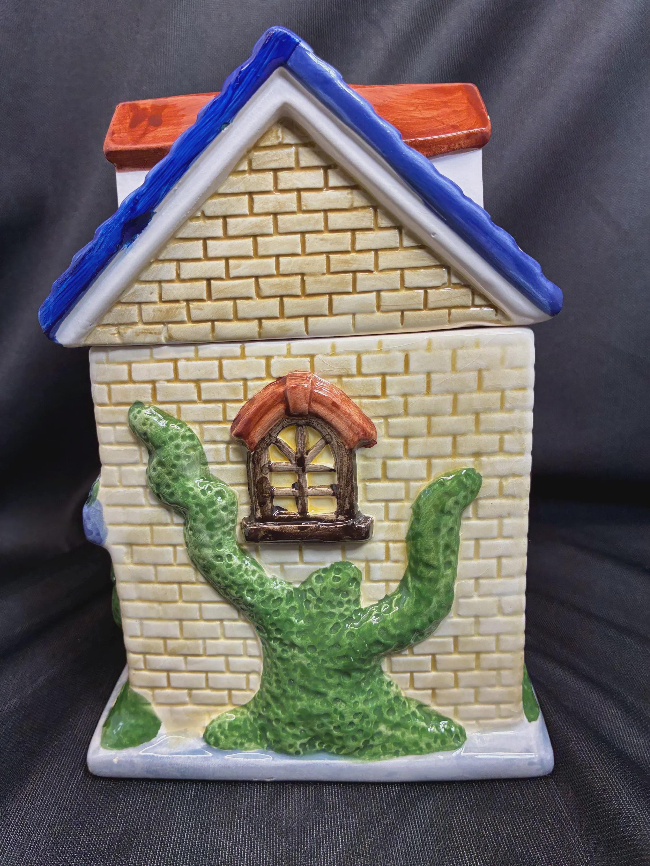 Vintage cookie jar house by Ryland Holmes collector item real estate company. This is an novelty ceramic house excellent condition one small chip on the roof blue edge. Please see photo approximately 8 inches tall 6 inches long 5 inches from front to back.