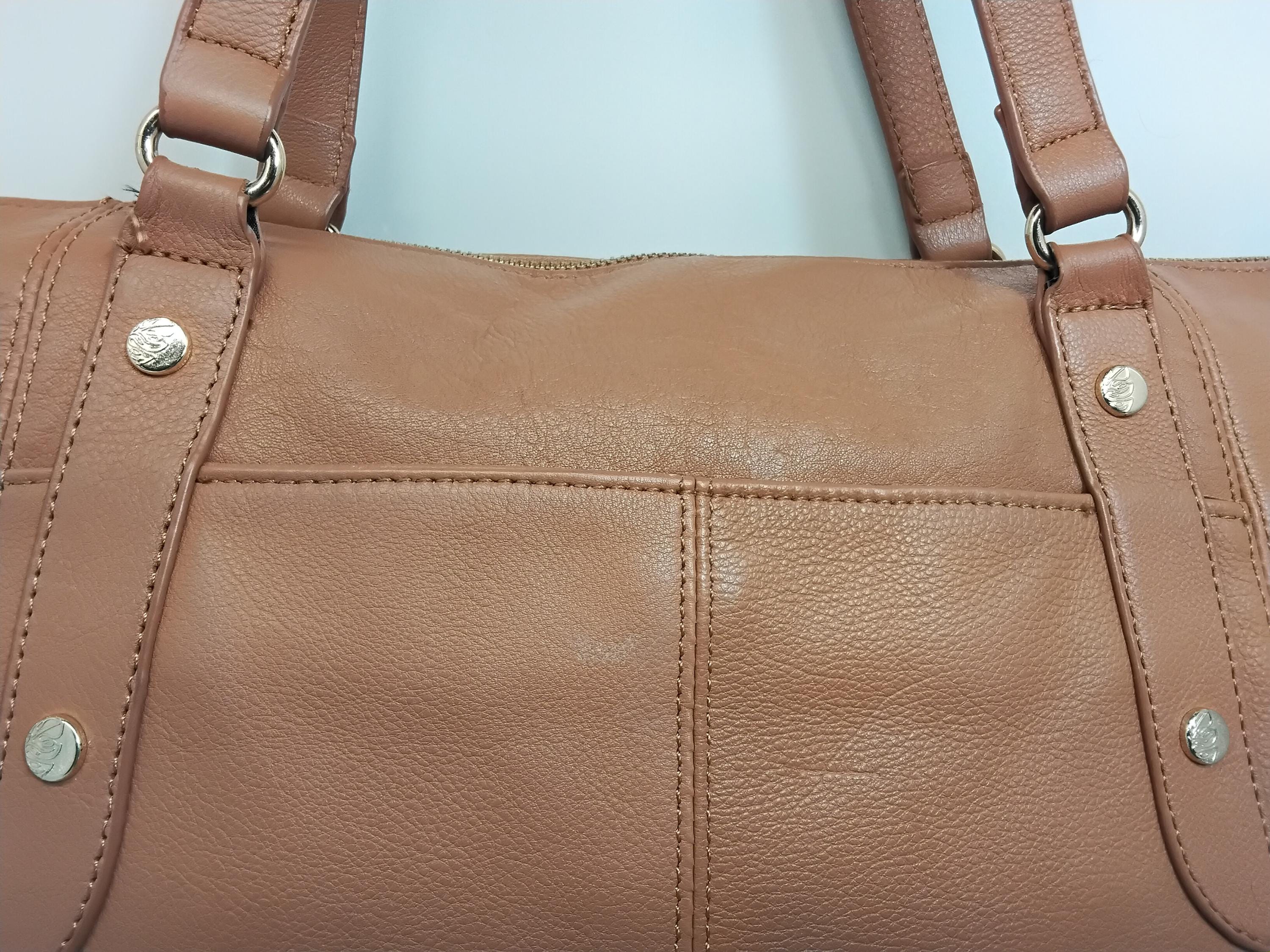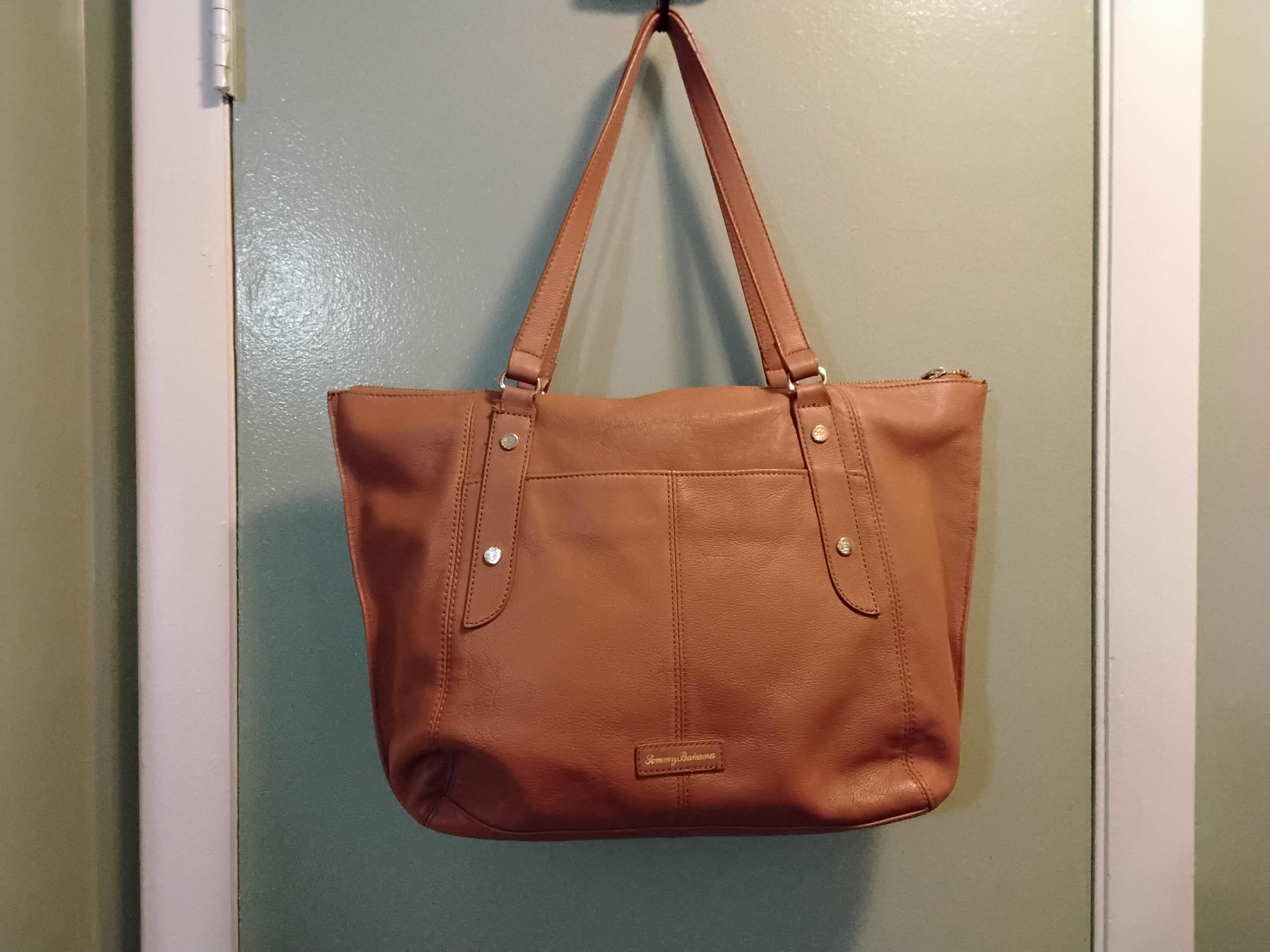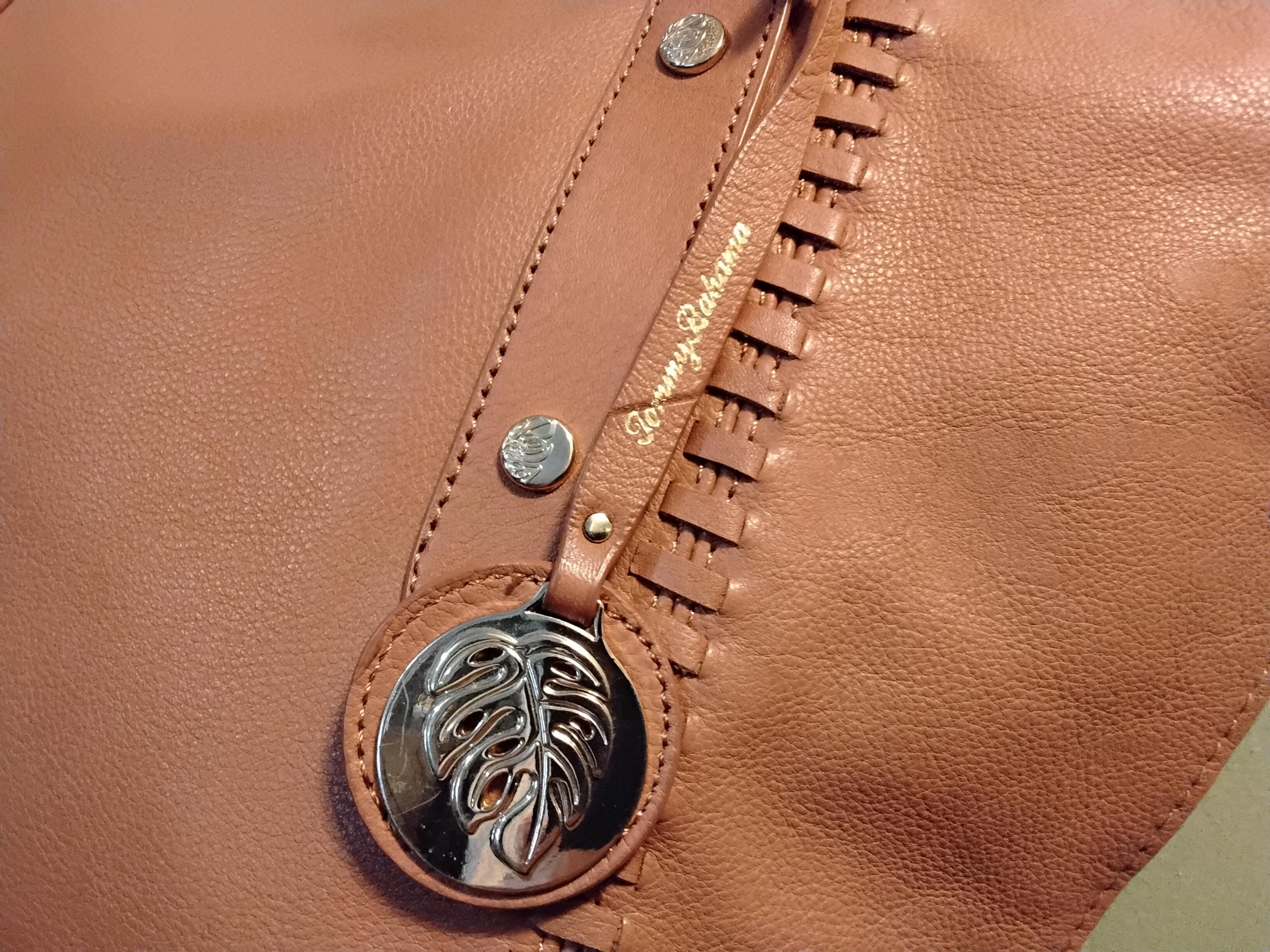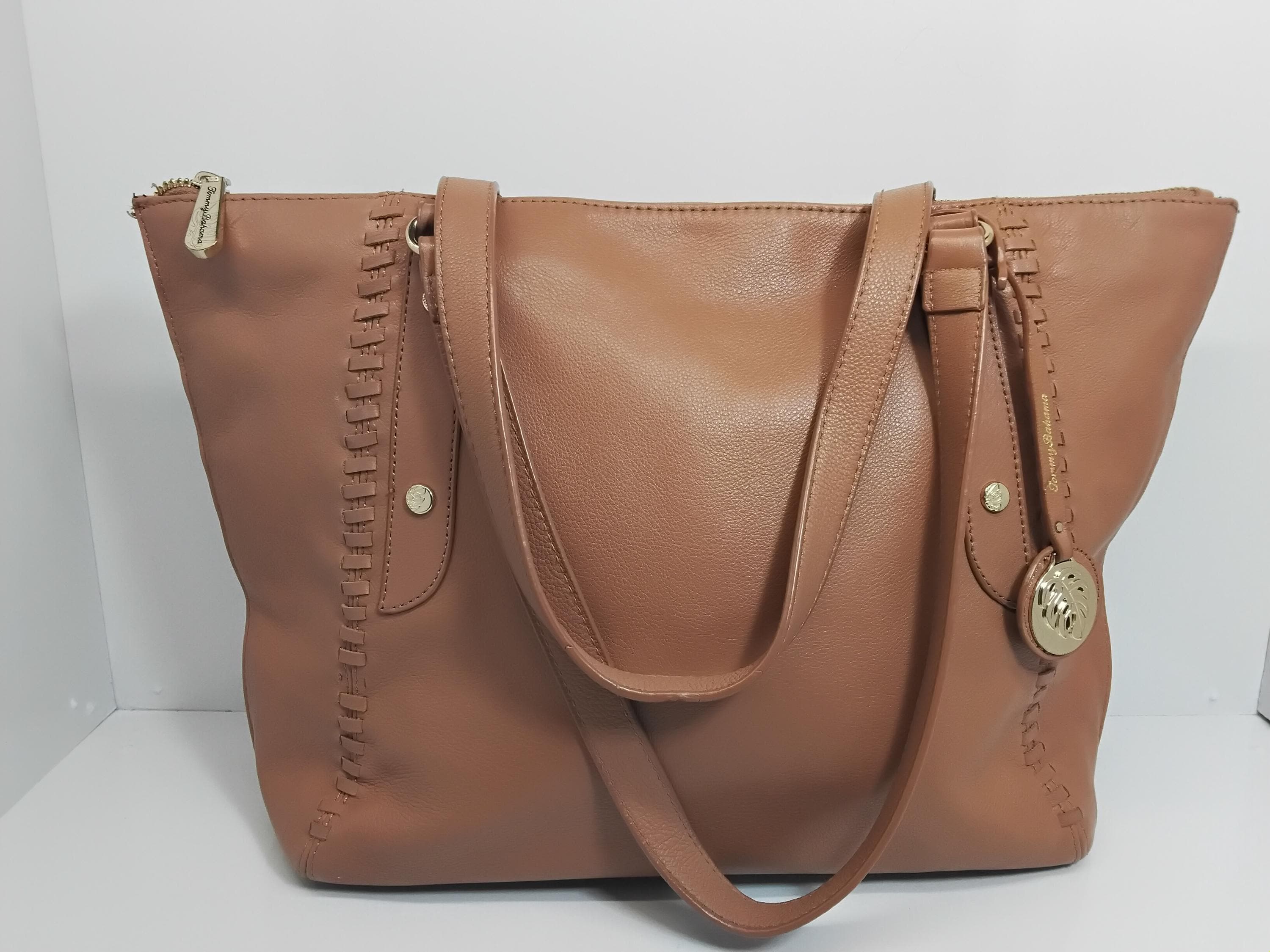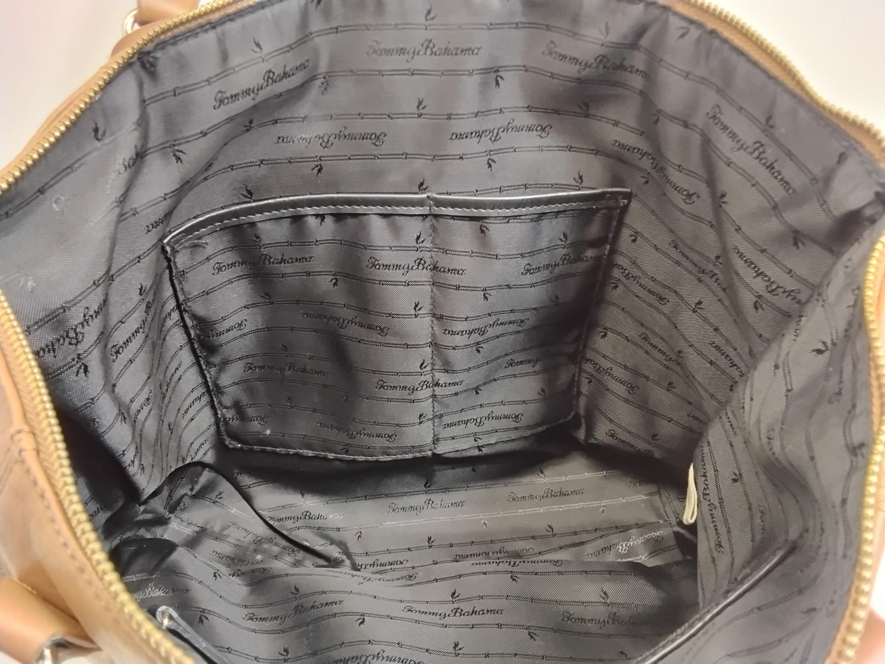 Beautiful " Lido Key" tote bag by Tommy Bahama is casual sophistication. Roomy and a compliment to any outfit. Color is a wheat/tan color a rich neutral. Gold metal hardware. New wot, never used. Well constructed in genuine leather. No flaws, excellent condition. Measures, 16" long, 13" tall, 12" handle drop. Braided stitching and bag tag are nice details.