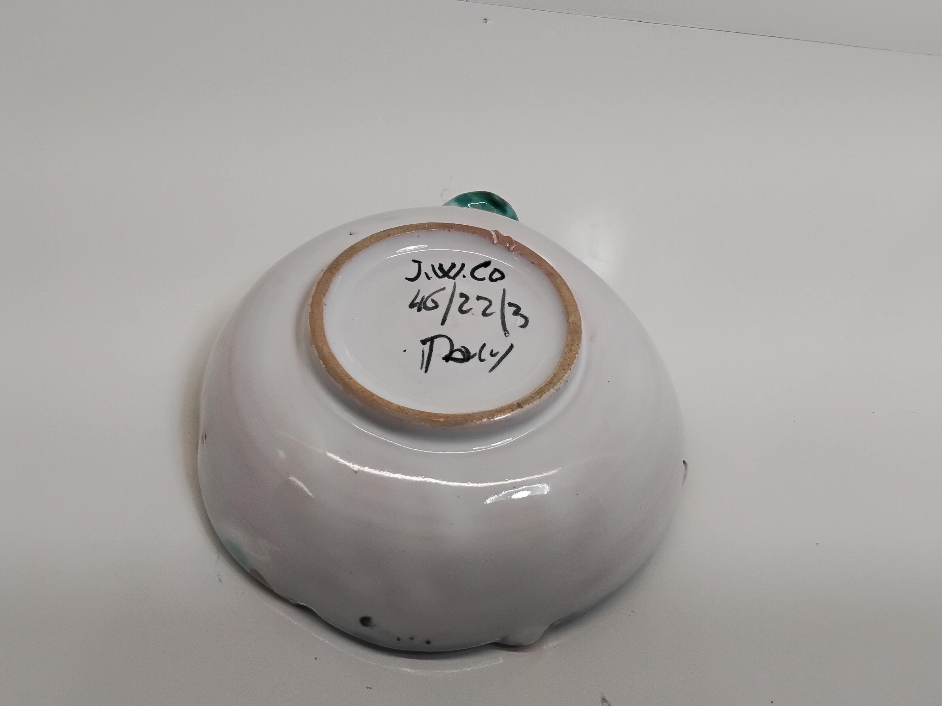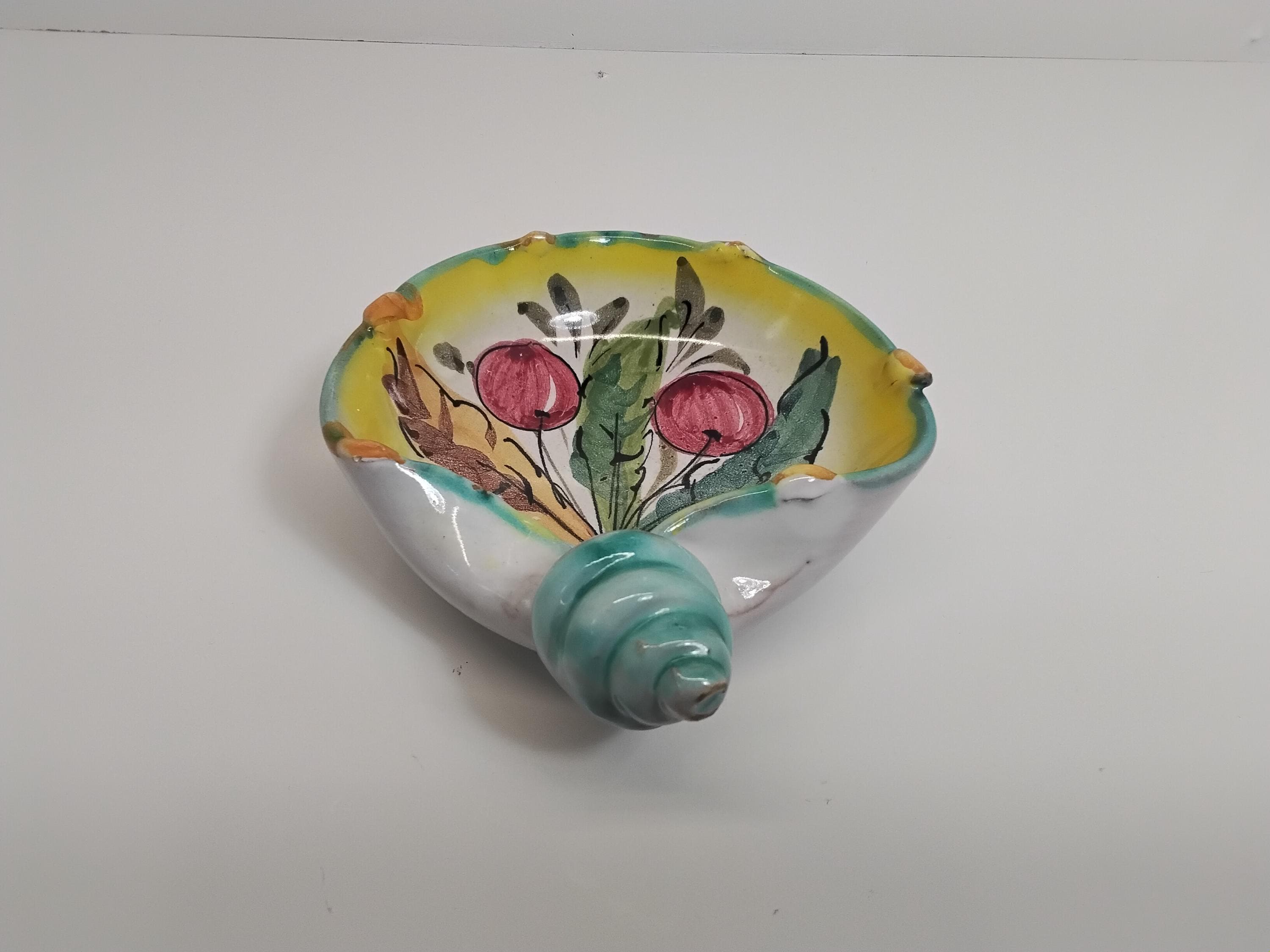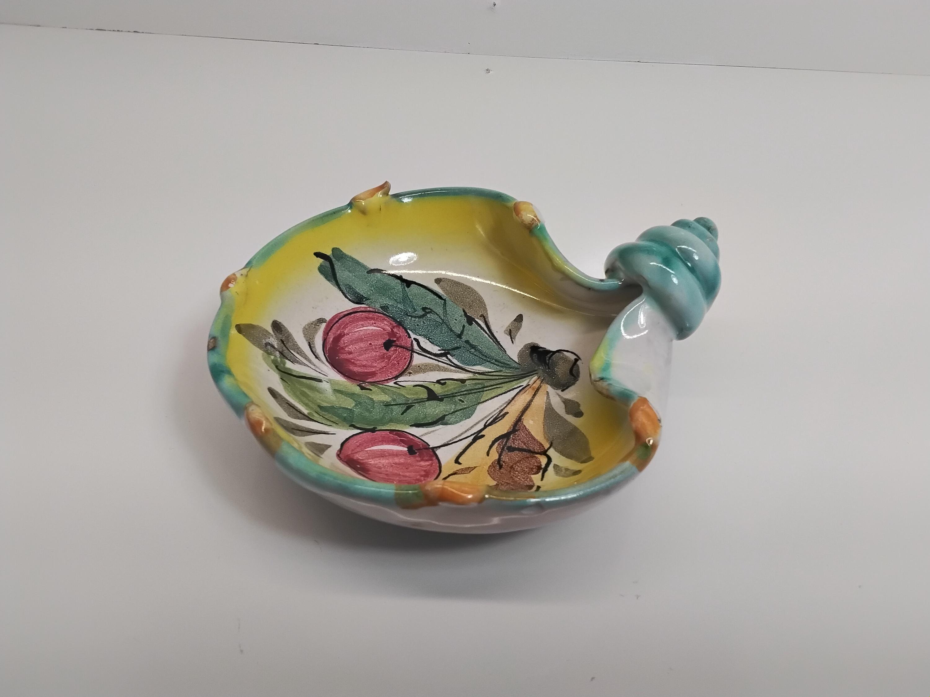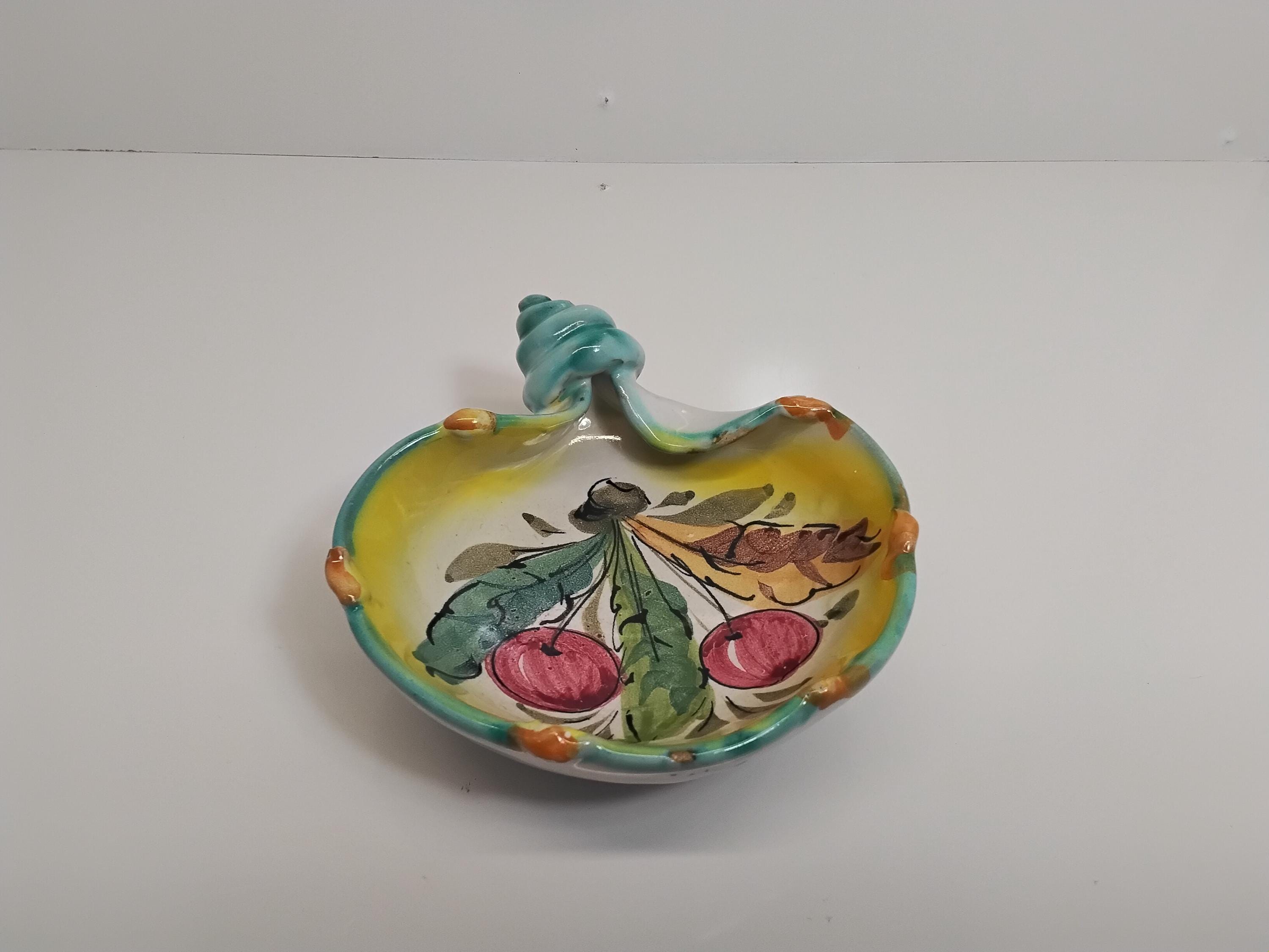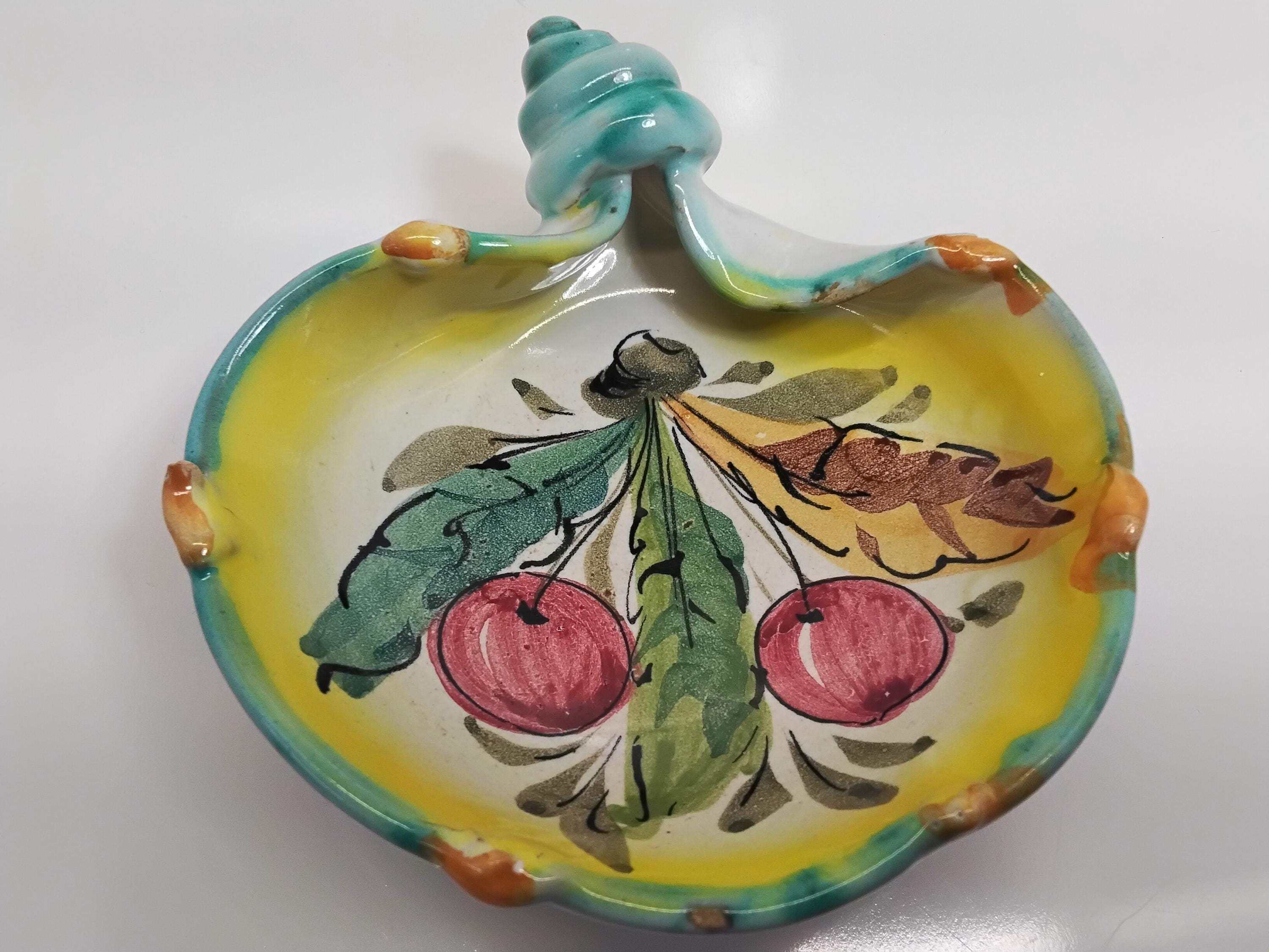 Rare find! Pretty shell shaped majolica pottery made in Italy. Colorful cherry motif, colors of red, green blue, yellow, and orange. Made in Italy retailed by John Wanamaker Co. In the 1950's in New York and Philadelphia.Measures 5" wide, 5.5" long. Signed on bottom. Slight signs of wear. Very good condition, no cracks, no chips. Use as a trinket dish or for candy or just a beautiful display.