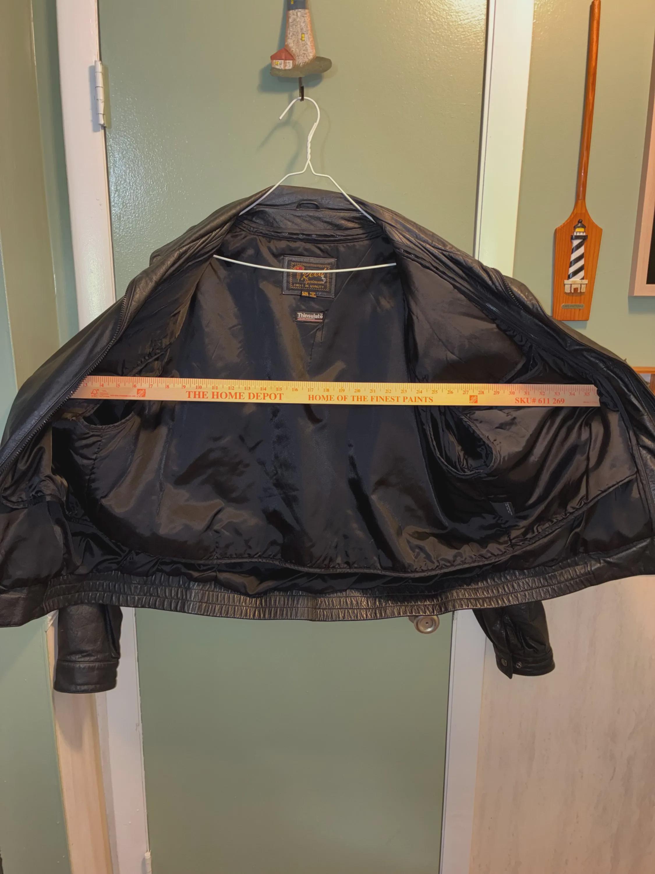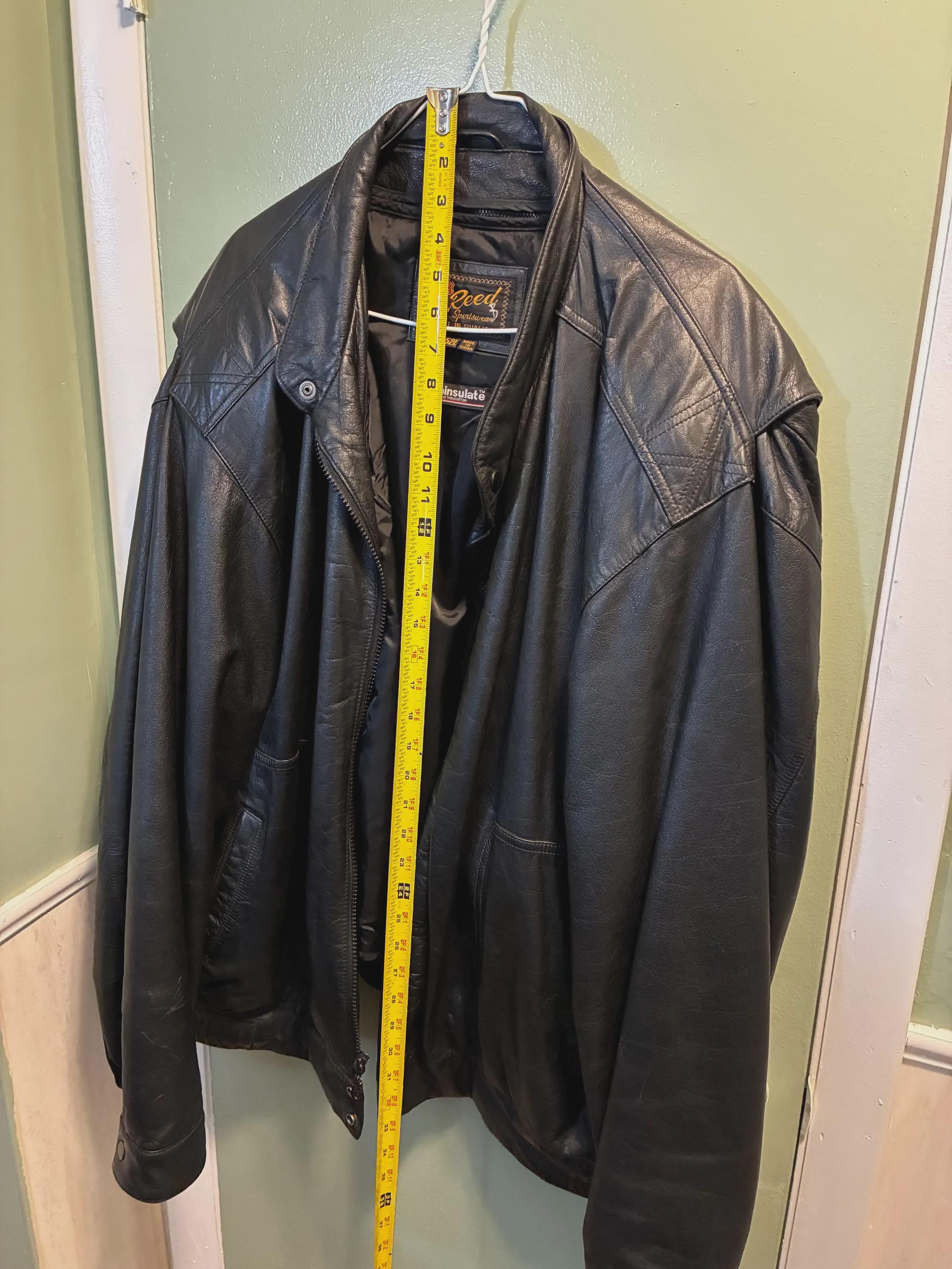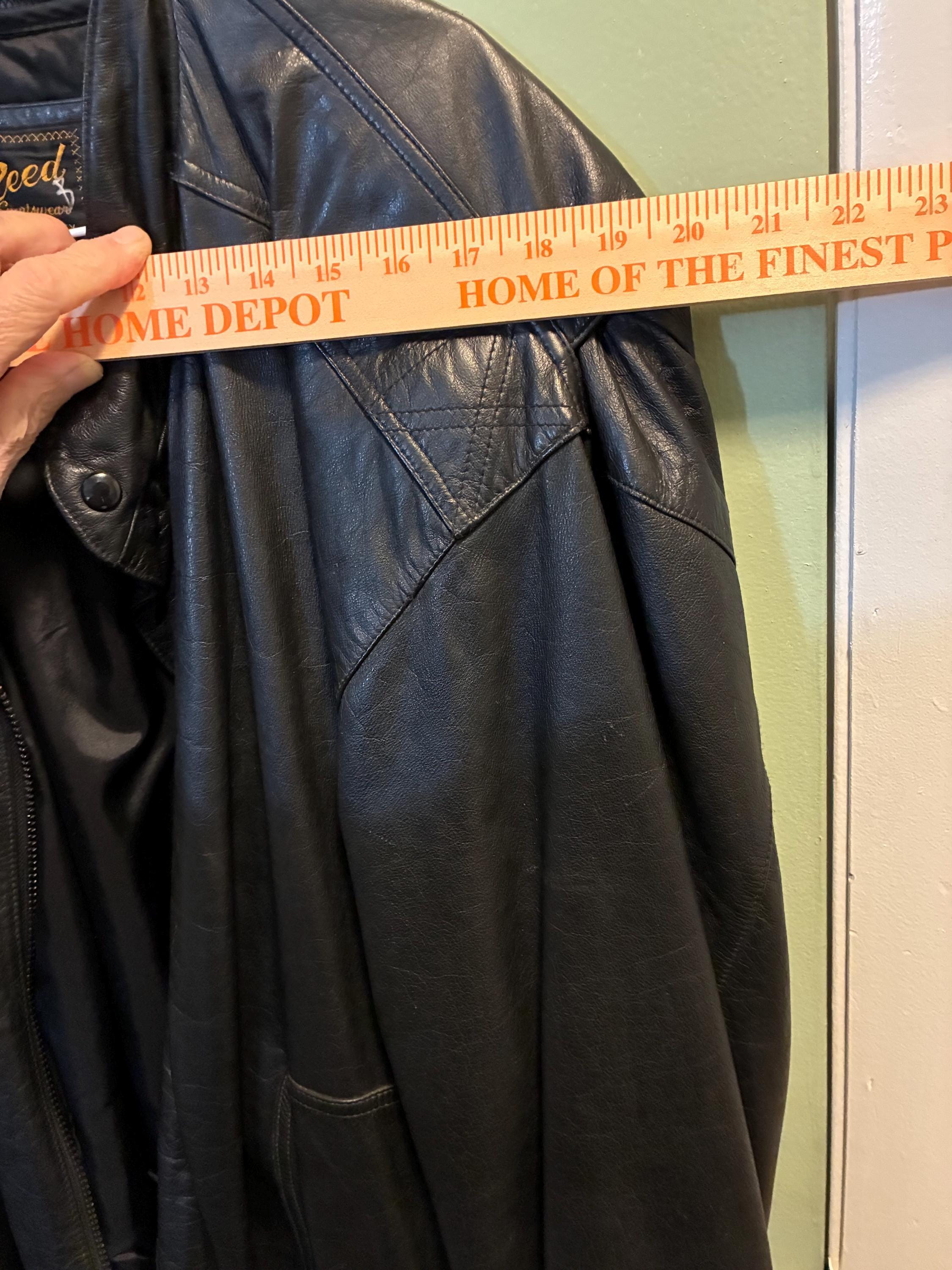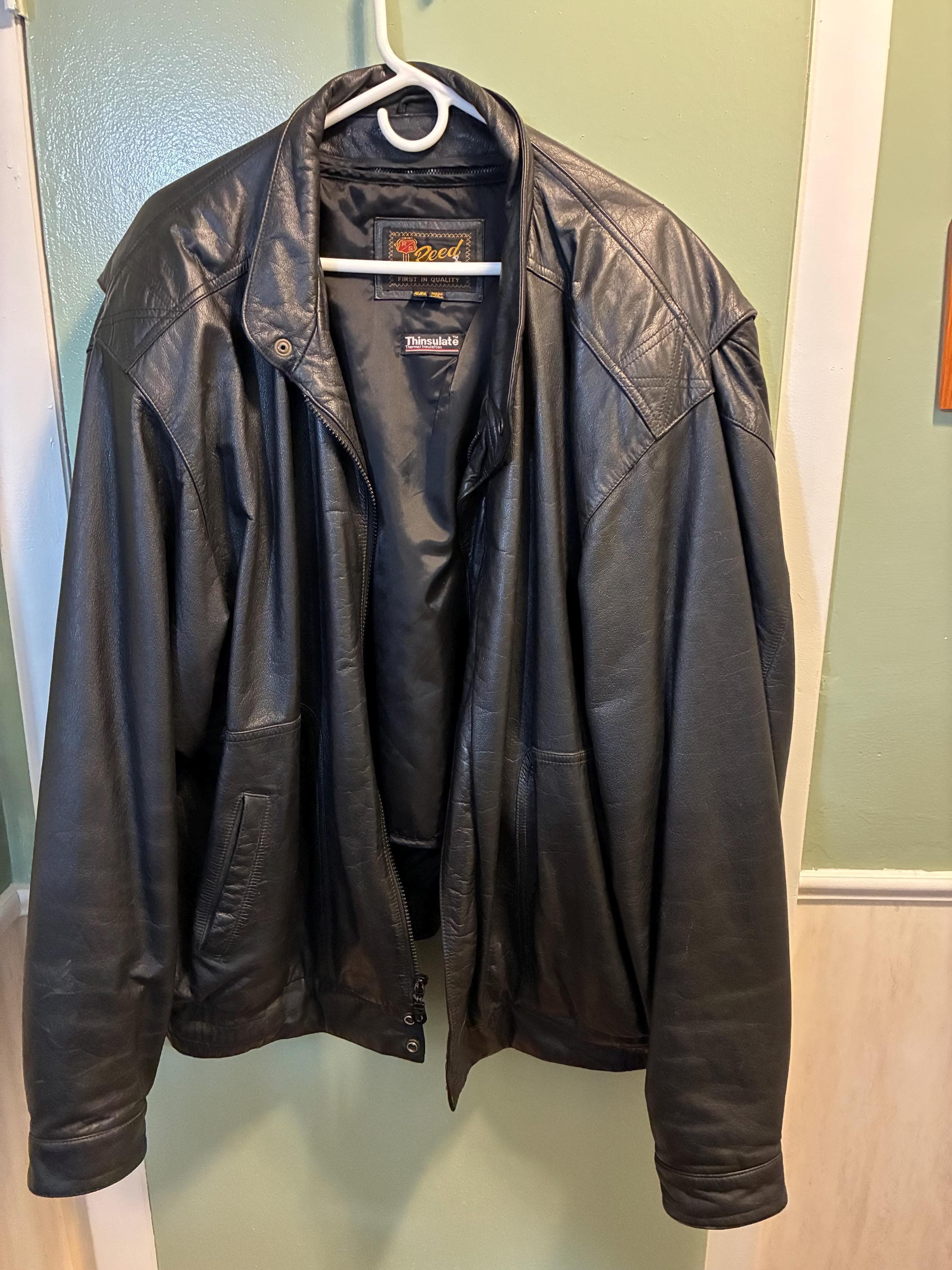 Vintage bomber jacket style sportswear, black leather jacket, 52 long by Reed first in quality with a 3M Thinsulate Thermal insulation liner like new 1970s to 1980s era zippers are in excellent condition and the whole jacket is in excellent condition. Very warm wind and rain resistant liner feels silky. measurements are approximately 19 inches shoulder to shoulder front and back 28 inches from collar down to bottom of the back 20 to 22 inches across the back lower waist area 33 inches from collar to the bottom of the front snap Buttons. please see photos.