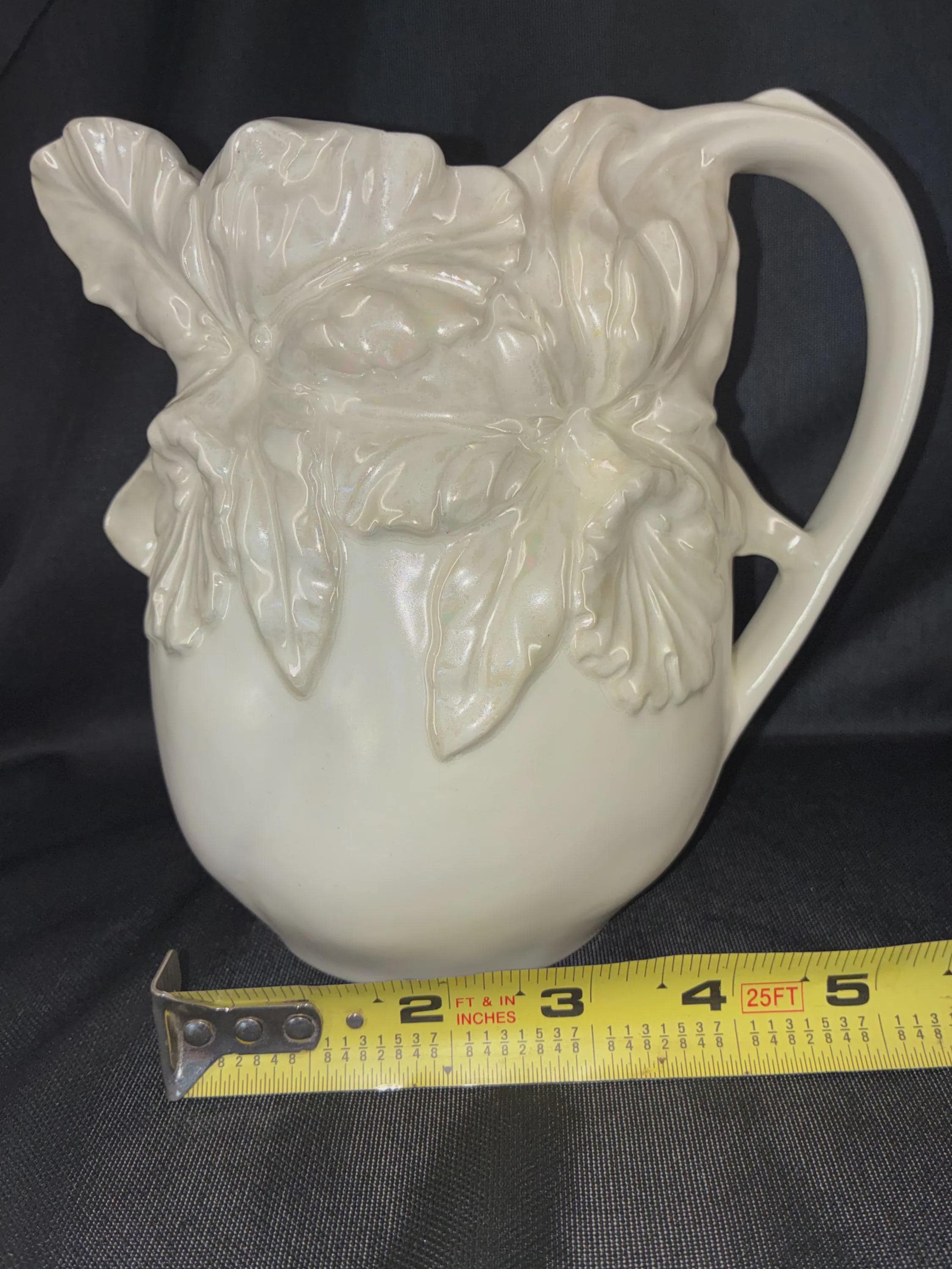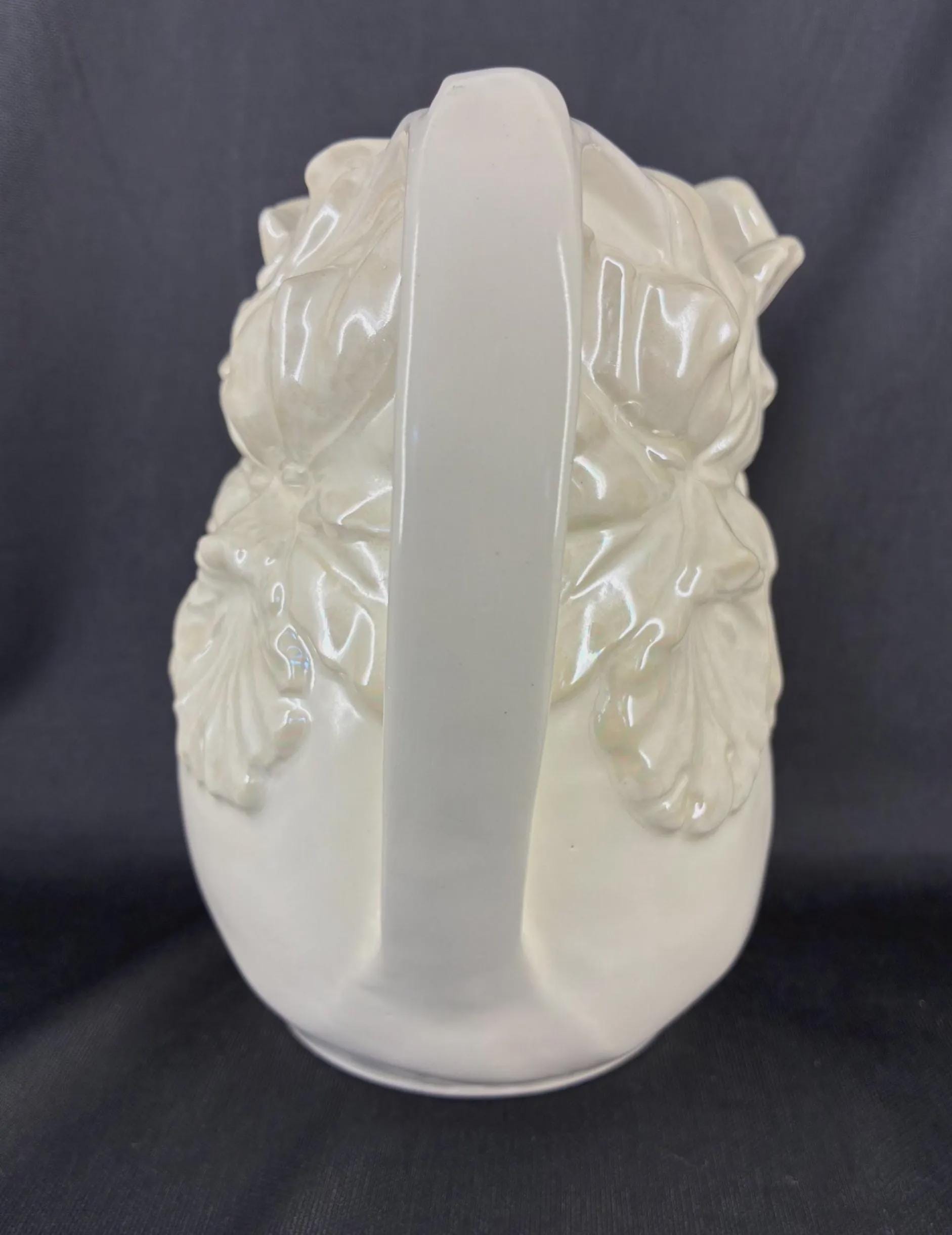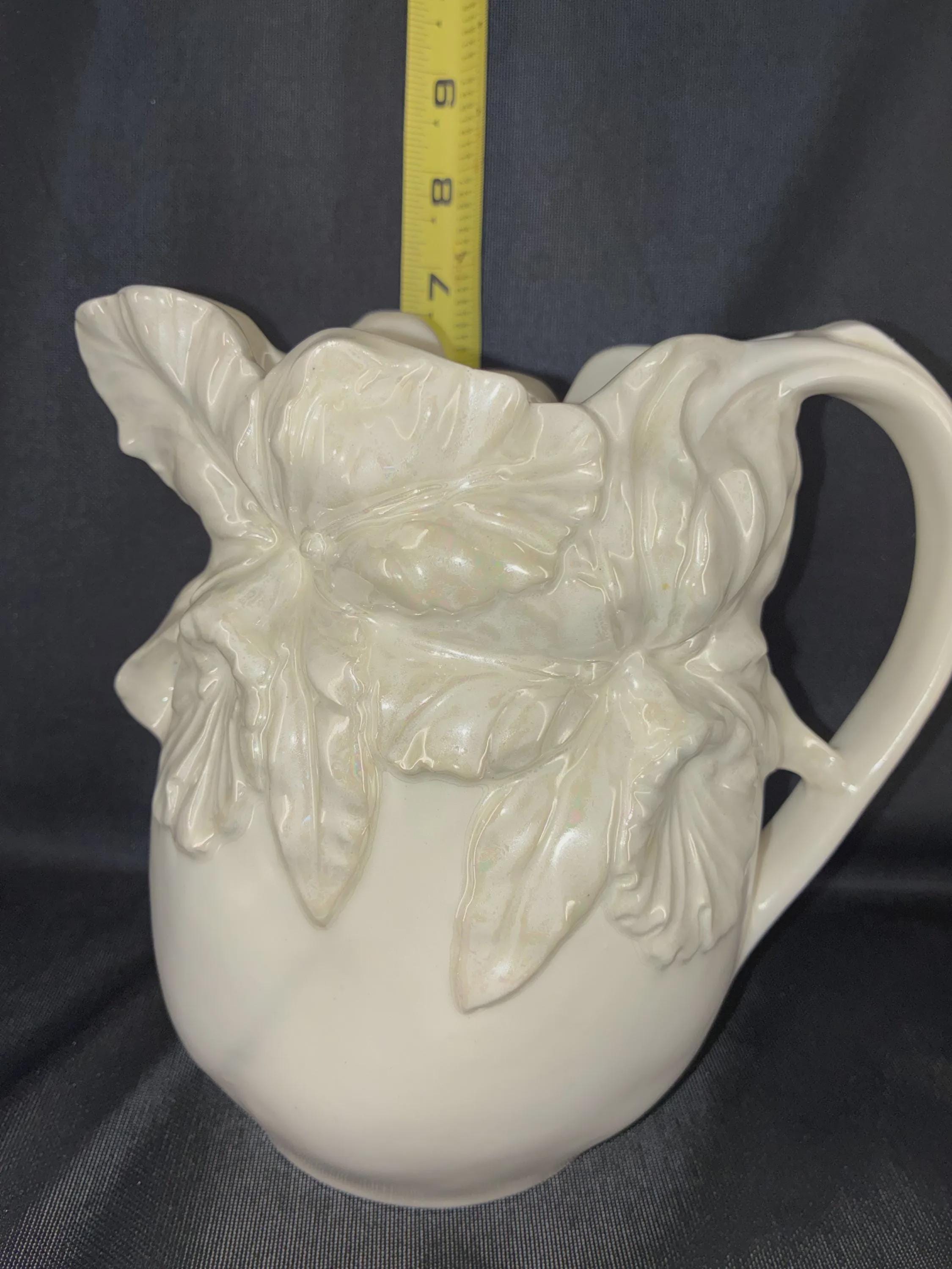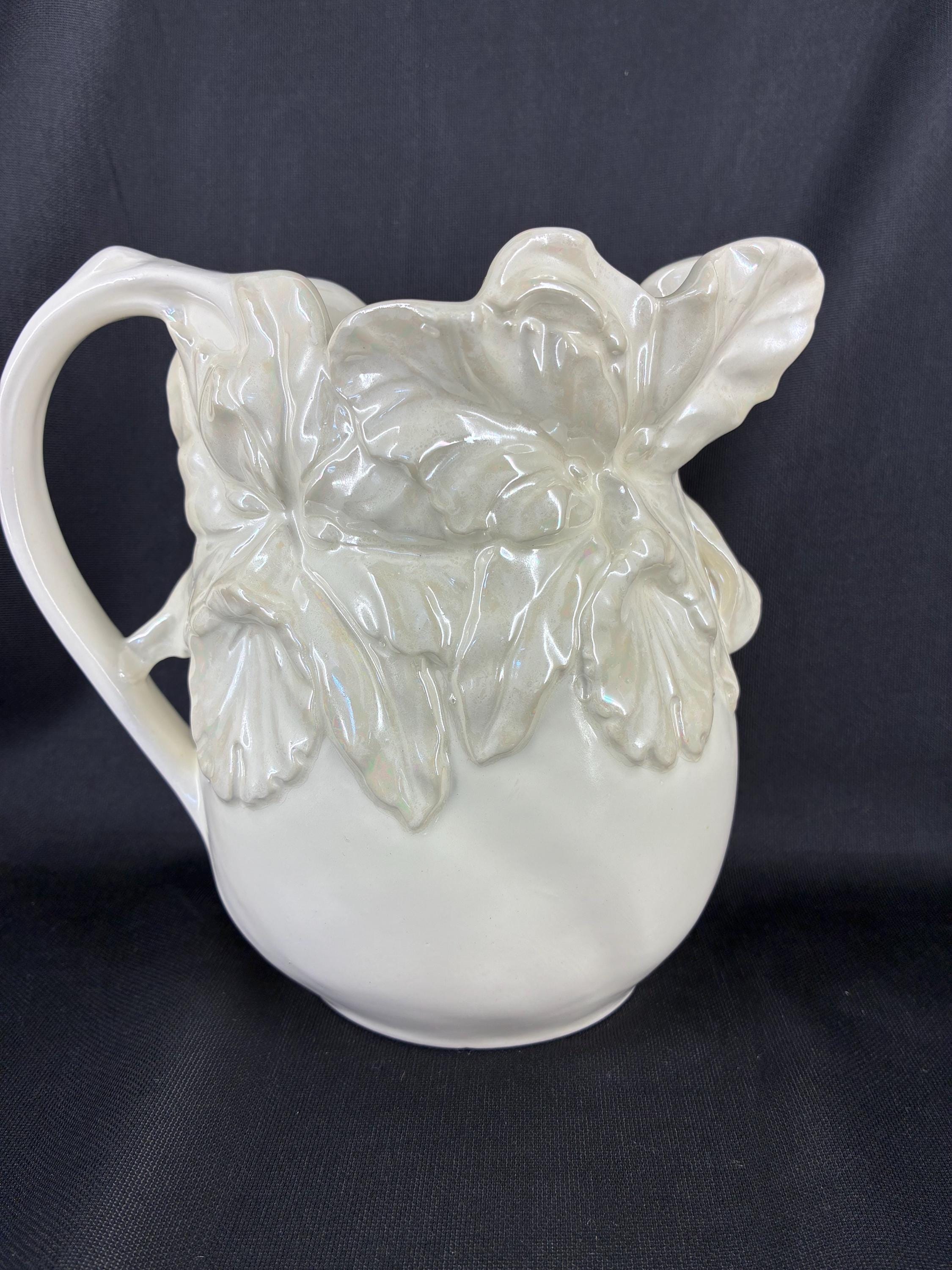 Vintage white ceramic pitcher marked Walden on the bottom this pitcher has an elegant, embossed flower/floral design around the top Portion where the poor spout is with an almost iridescent look to it. Rare 1950s 7 inches tall 6-inch diameter wide 4 inches diameter at the bottom holds a liter of fluid.