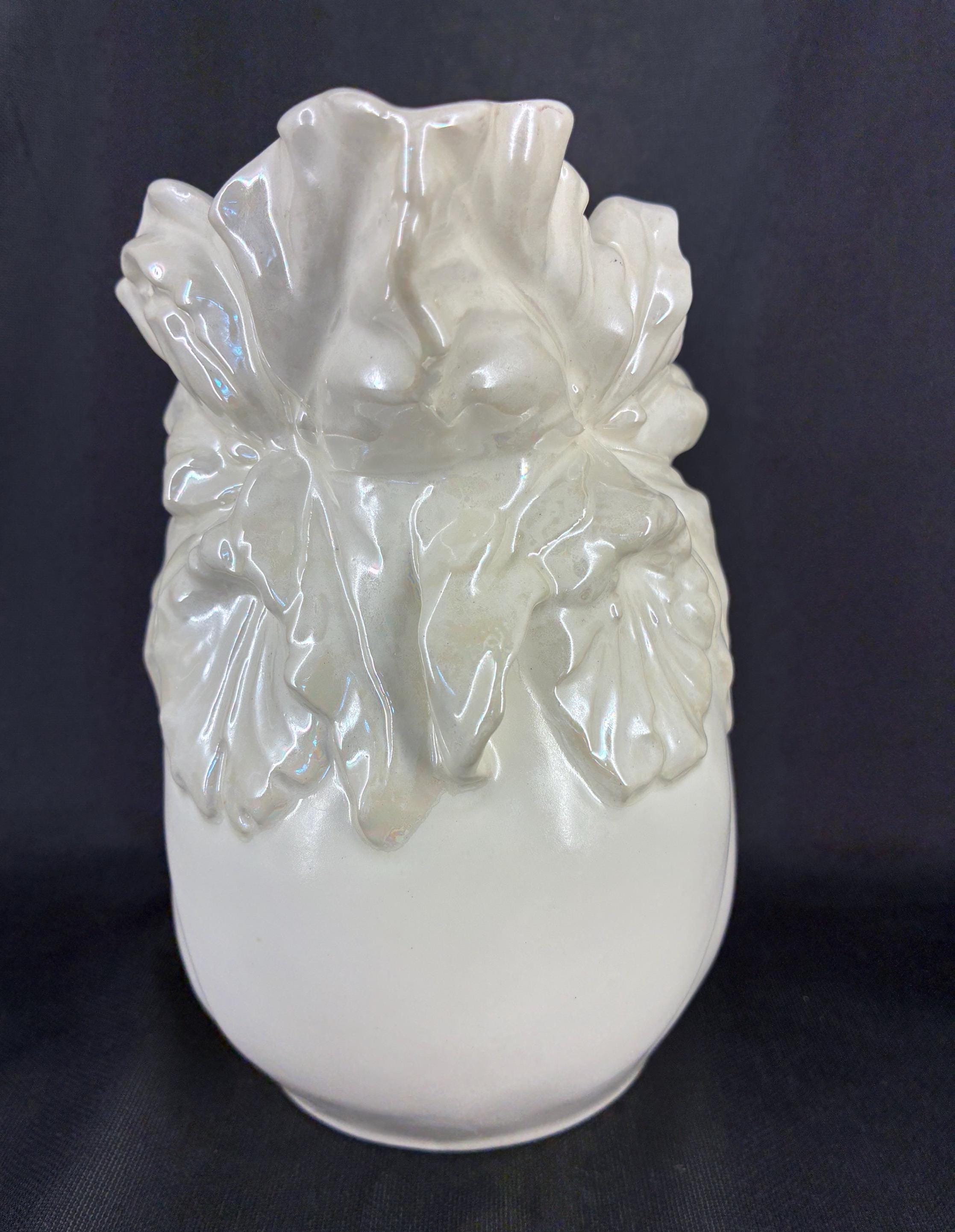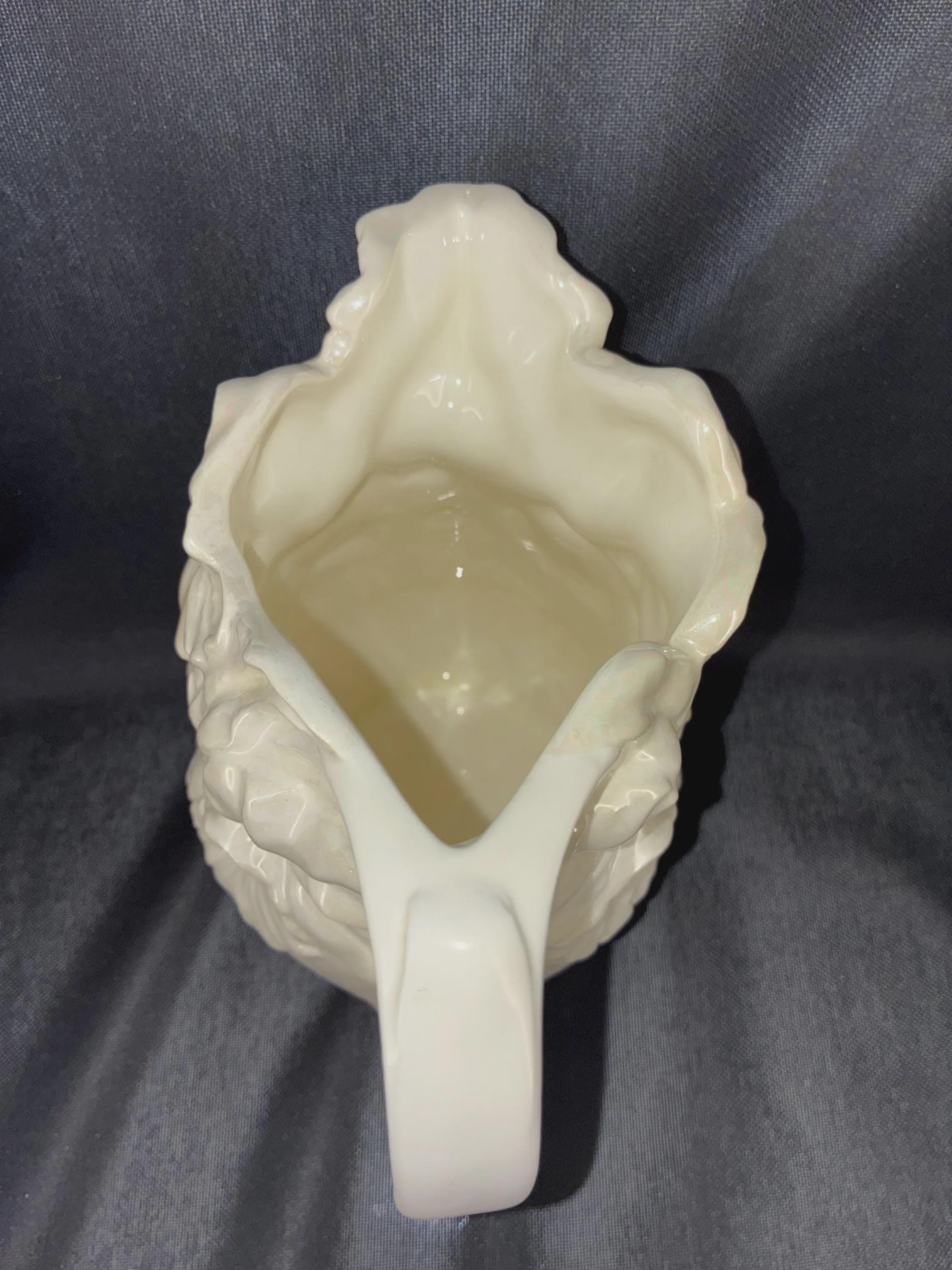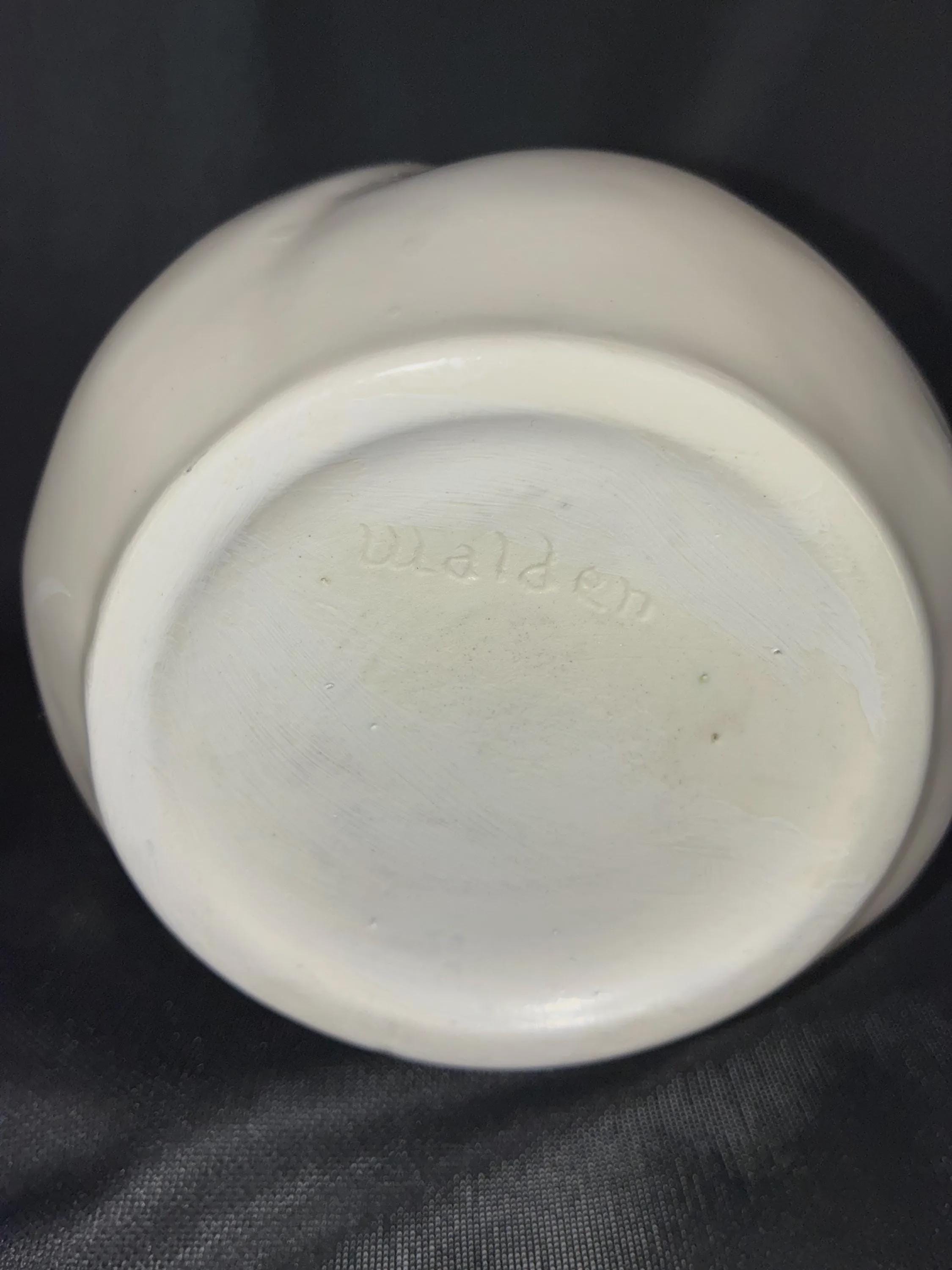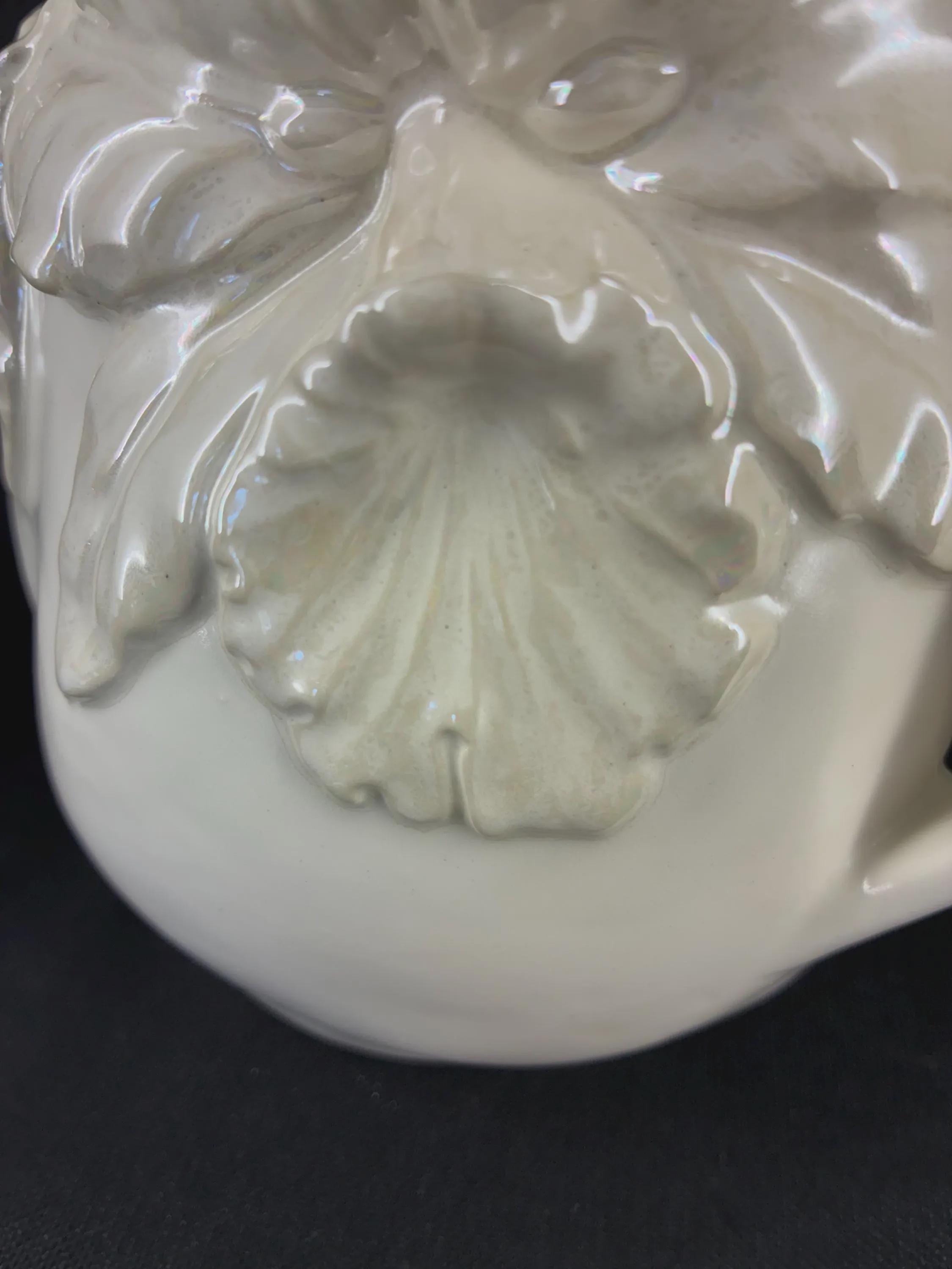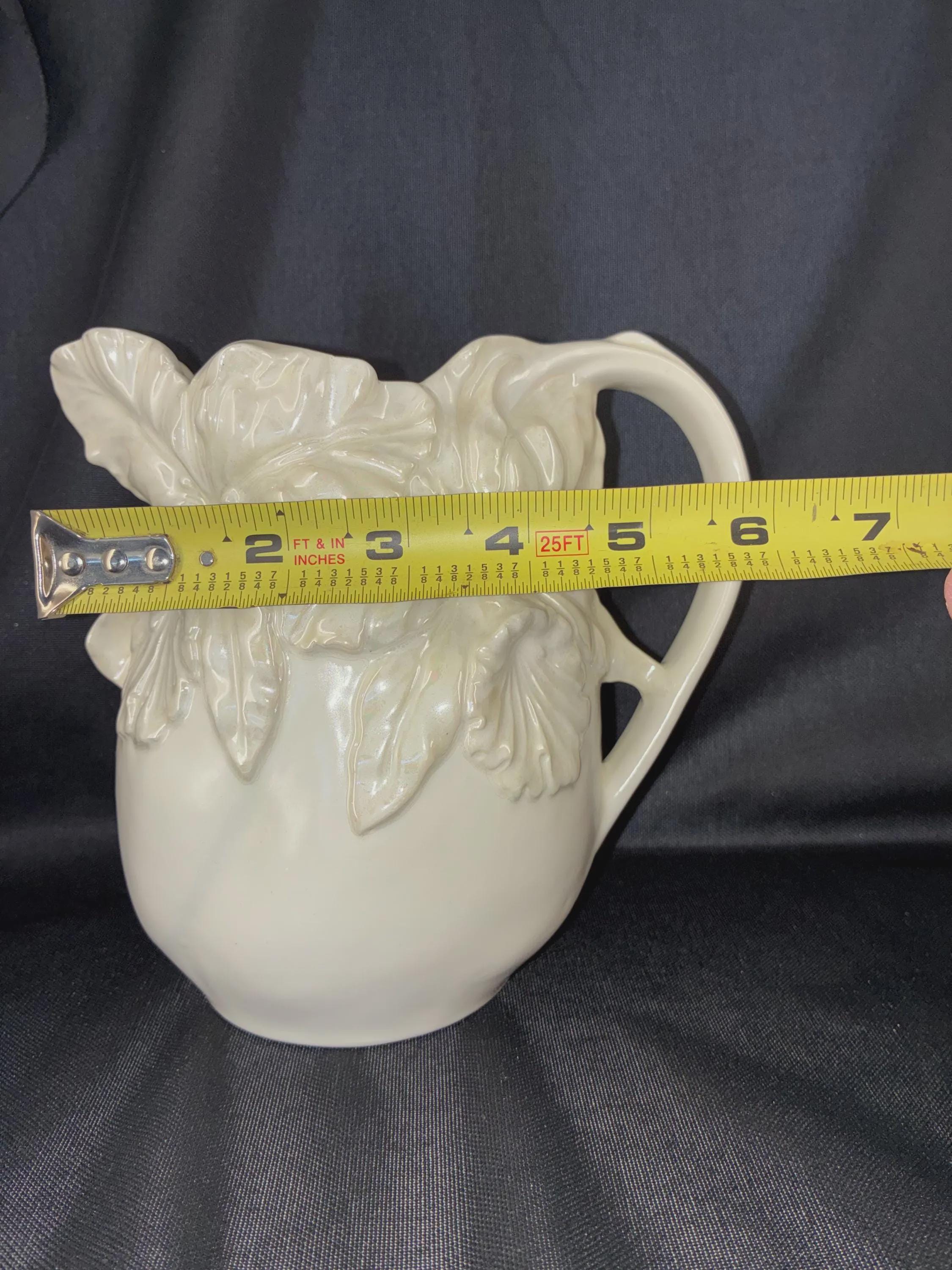 Vintage white ceramic pitcher marked Walden on the bottom this pitcher has an elegant, embossed flower/floral design around the top Portion where the poor spout is with an almost iridescent look to it. Rare 1950s 7 inches tall 6-inch diameter wide 4 inches diameter at the bottom holds a liter of fluid.