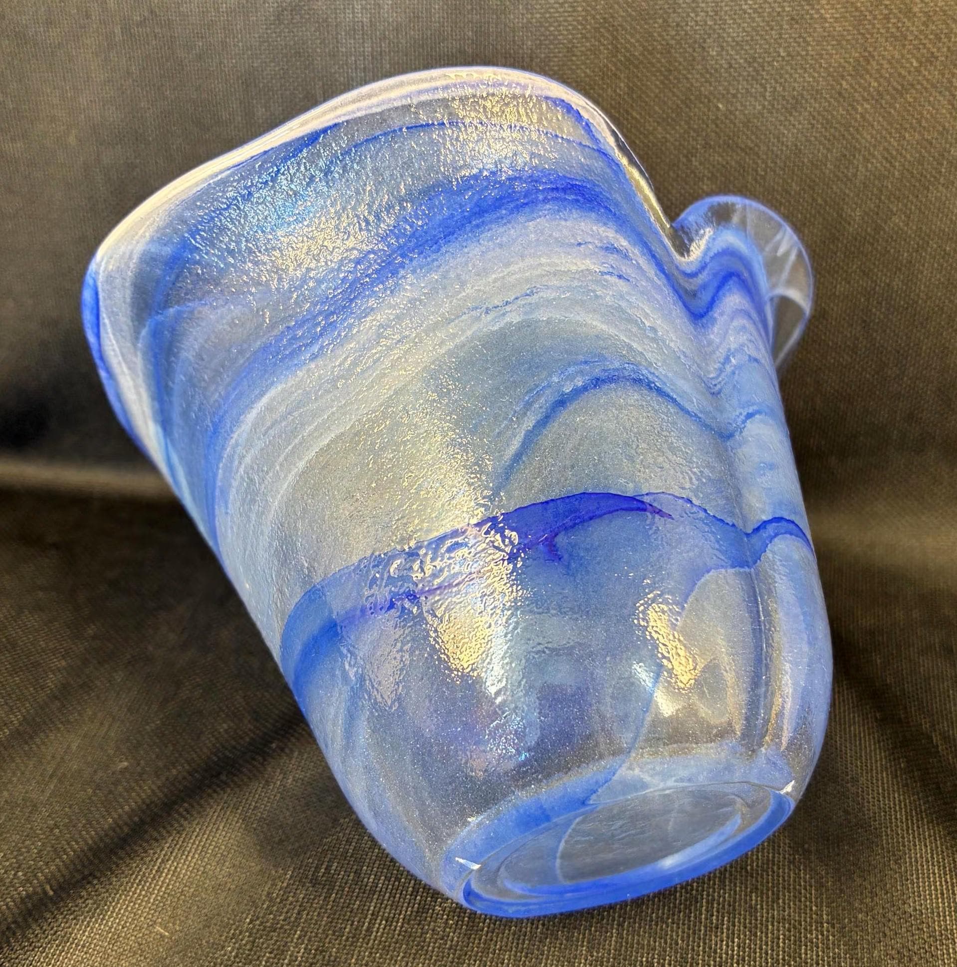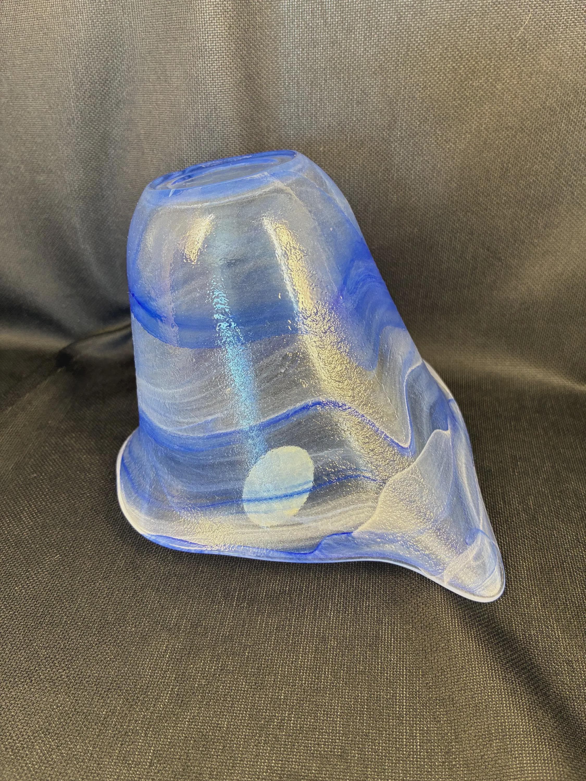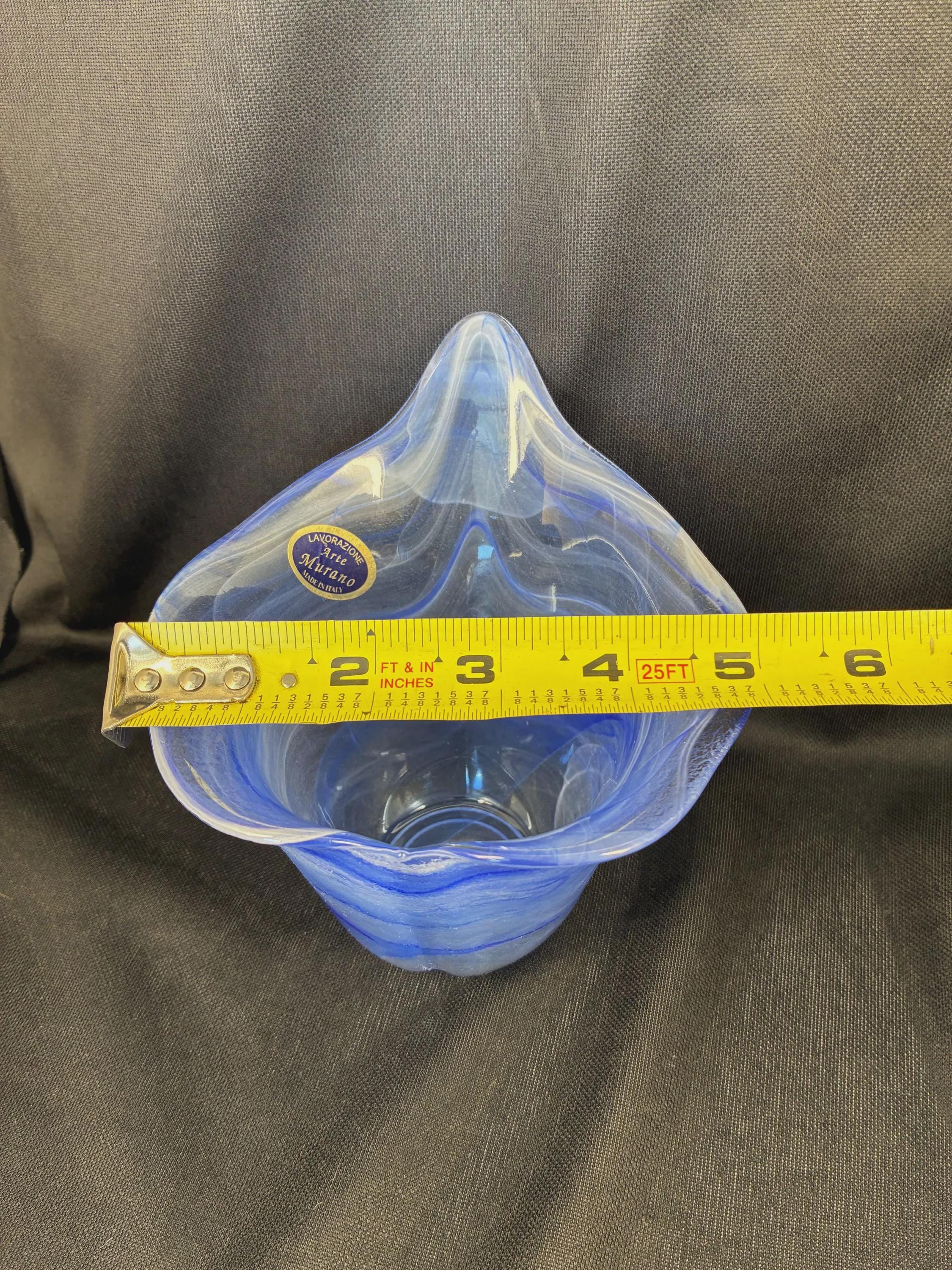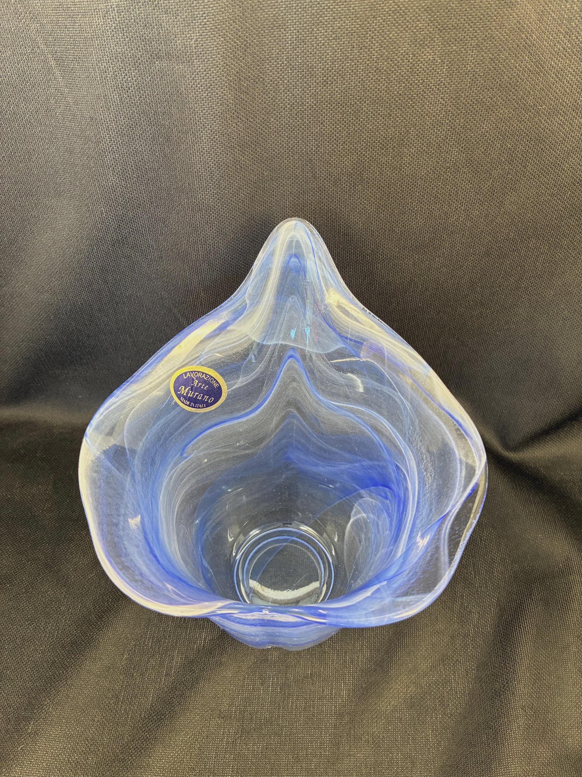 Vintage Lavorazione Murano made in Italy glass bowl handblown featuring an organic sculptural ruffle shaped reminiscent of ocean waves with blue and white swirls with sticker label still fixed to the glass bowl this glass incorporates Lattimo milky white glass swirl technique combined with blue glass excellent condition approximately 5 inches high 5 inches diameter.