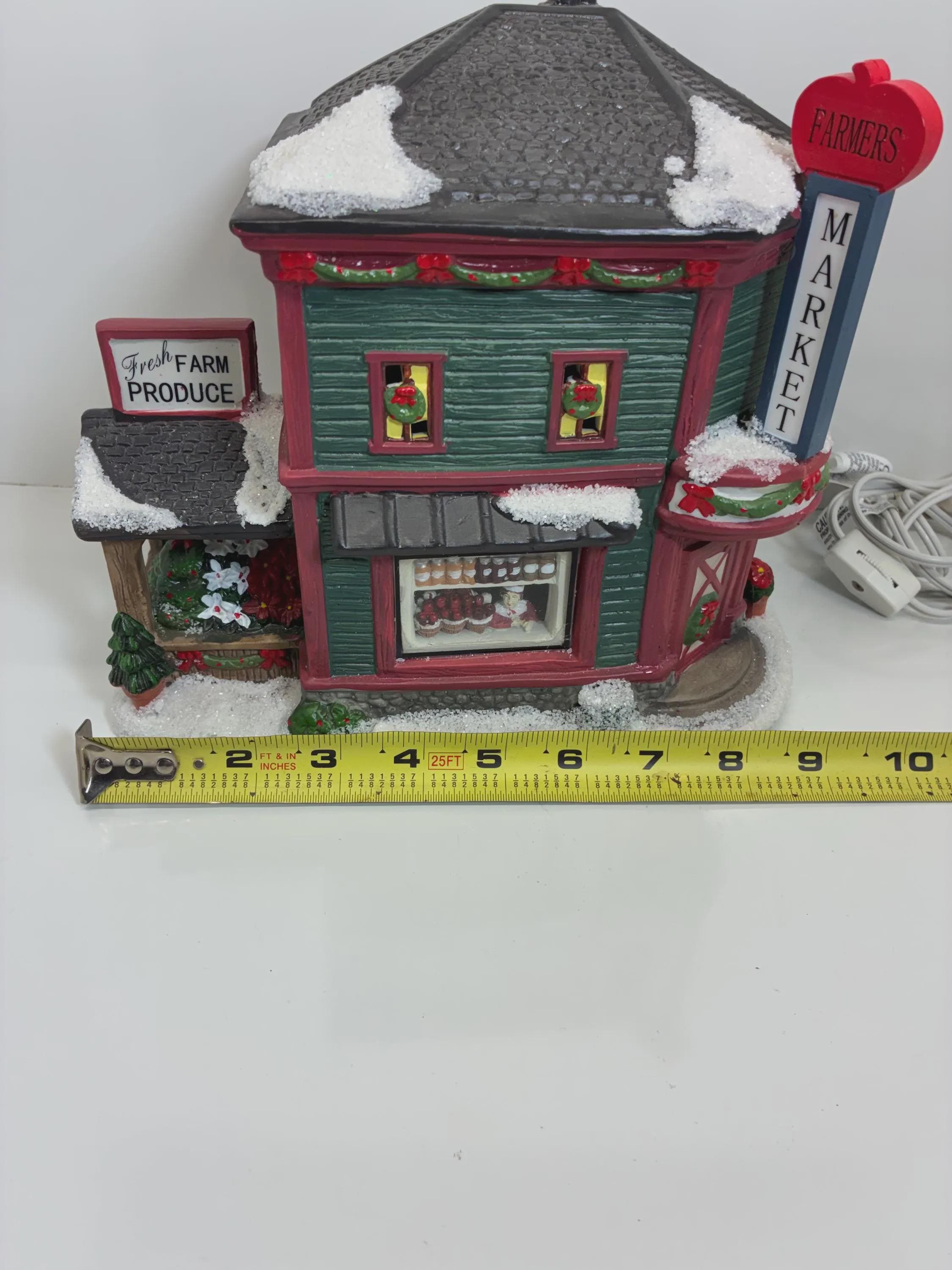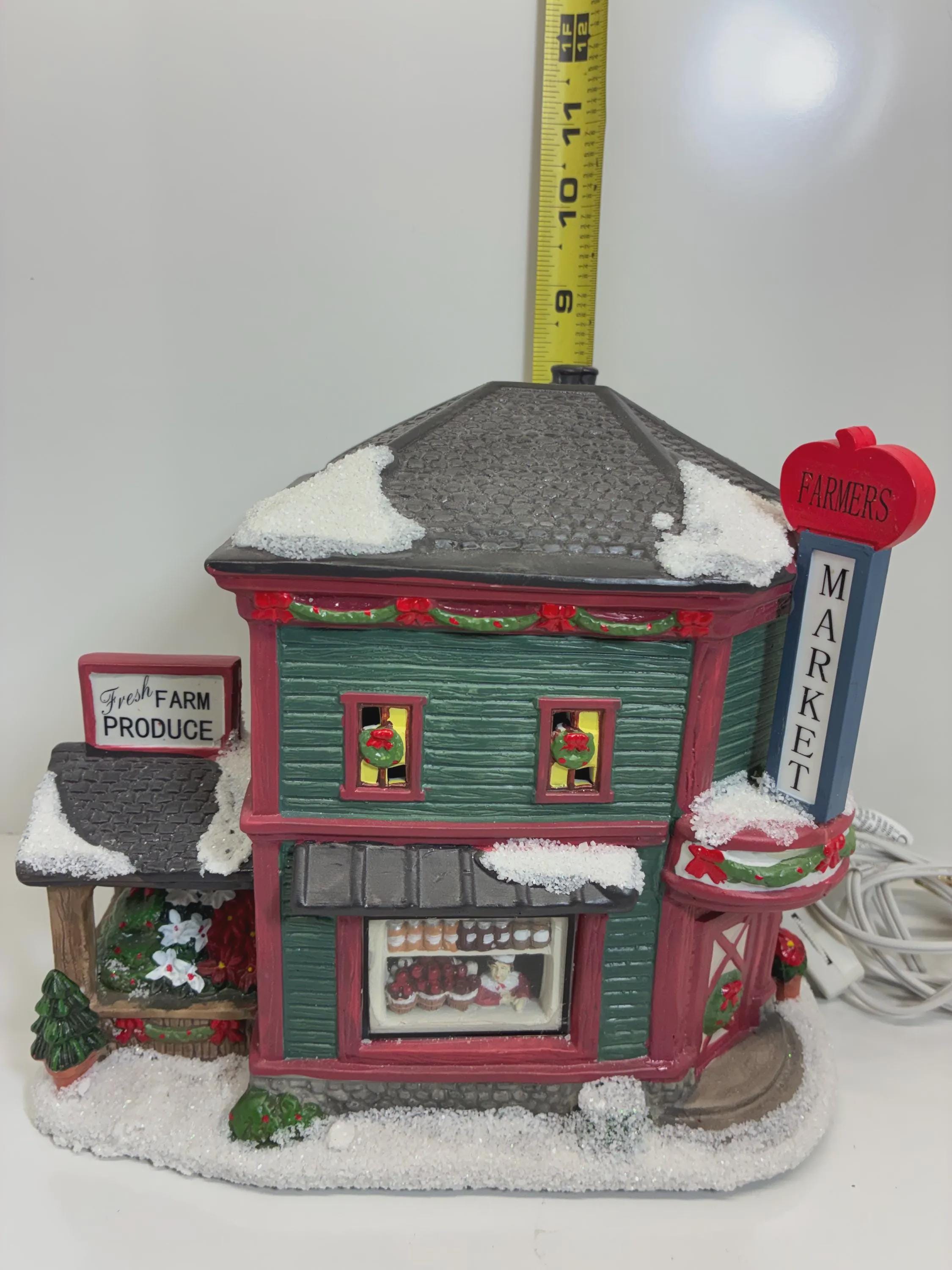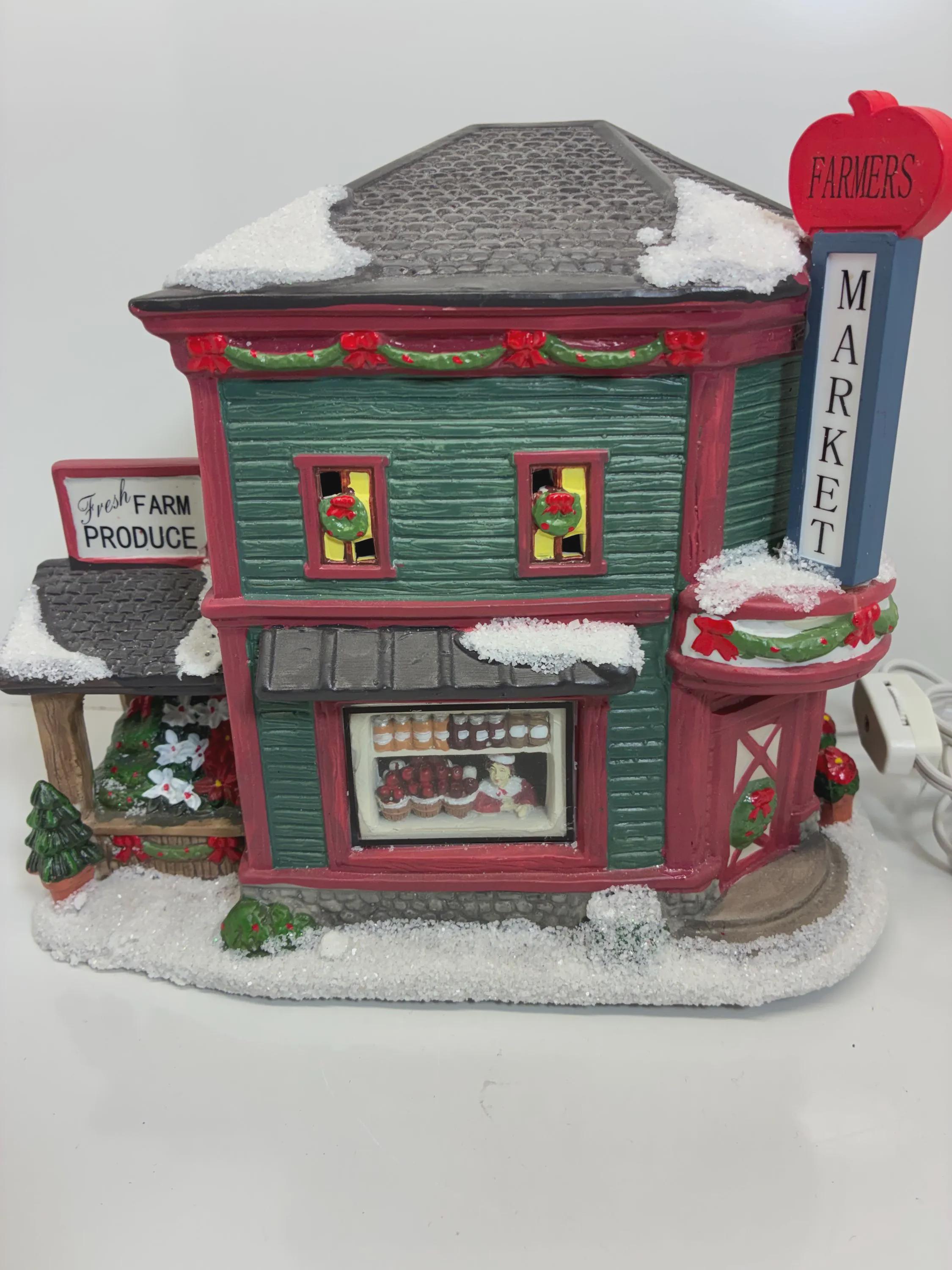 Vintage farmers market Christmas lighted, ceramic store, collectors edition Saint Nicholas Square hand painted handmade 6 inch cord and bulb excellent condition approximately 8 1/2 inches tall 9 inches long 6 inches wide from front to back no brakes chips, cracks of any kind beautiful store.