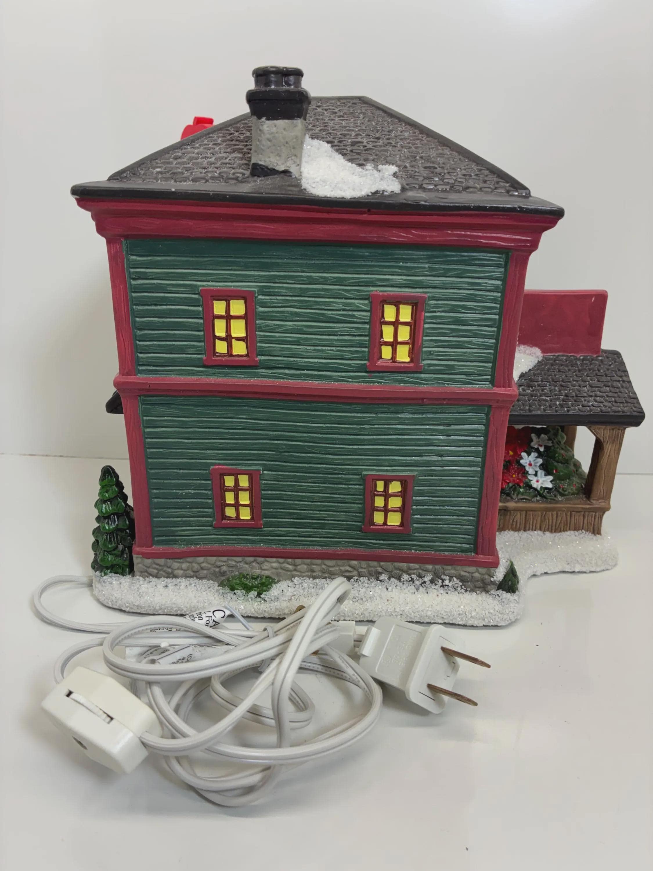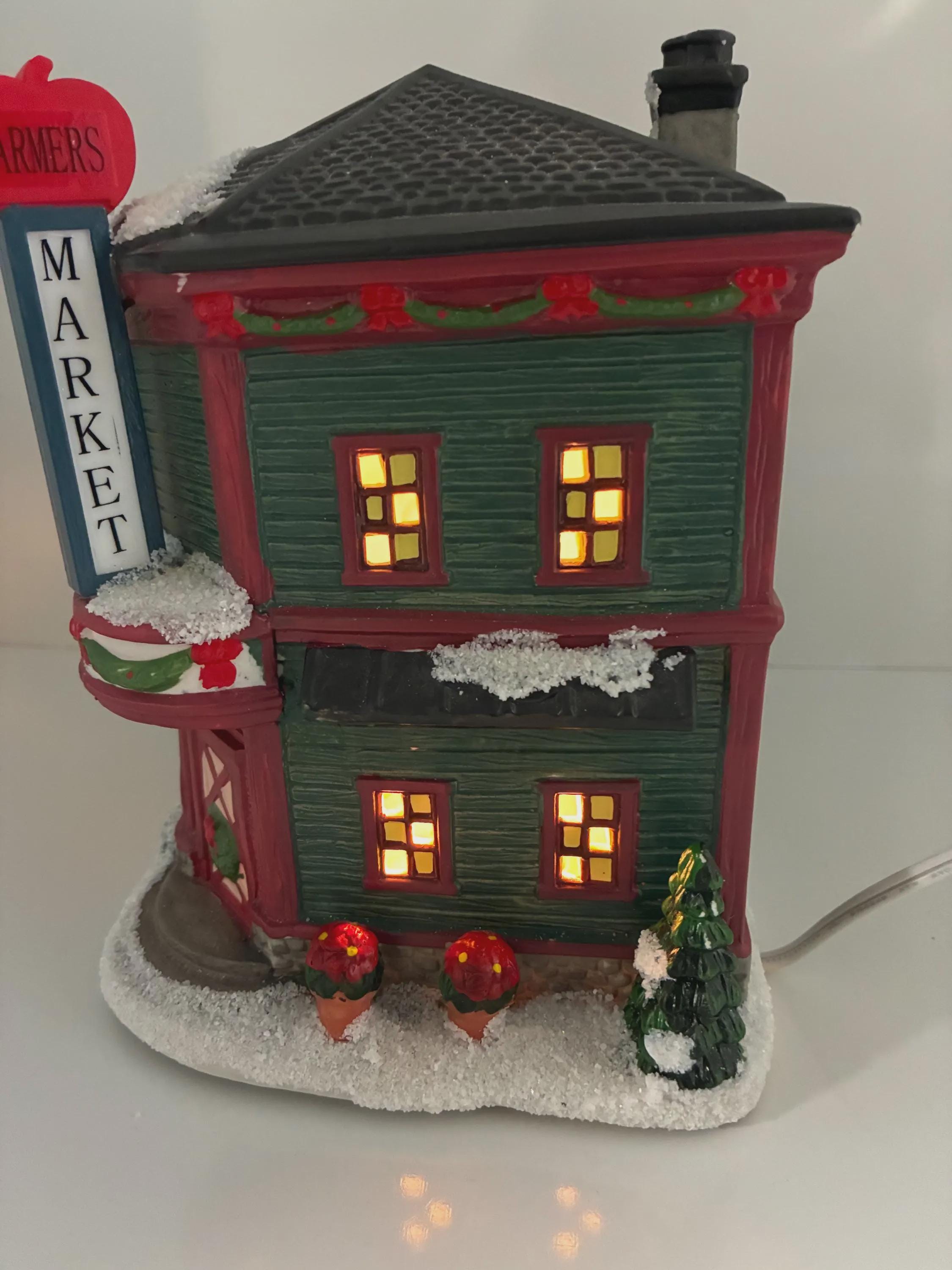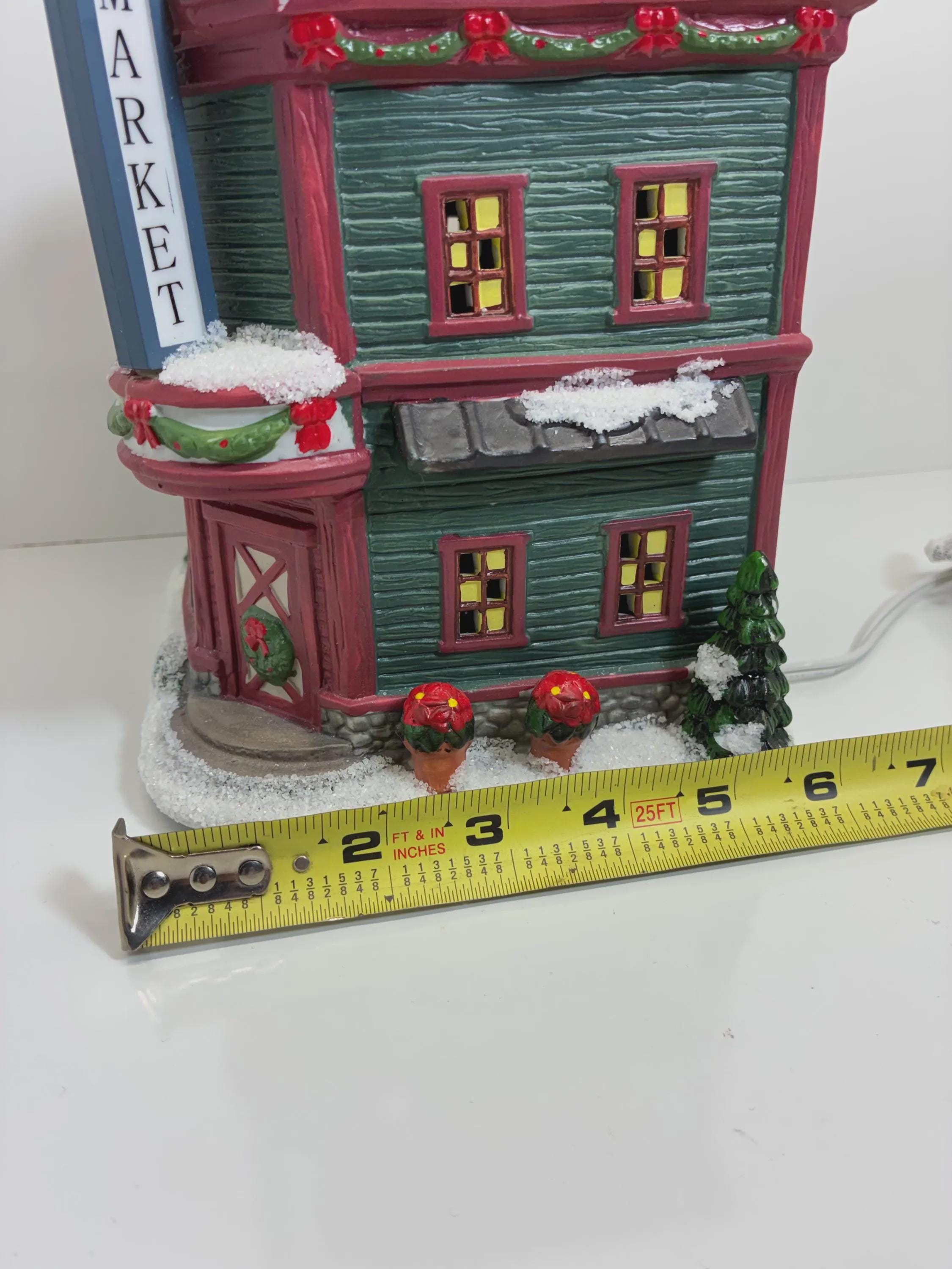 Vintage farmers market Christmas lighted, ceramic store, collectors edition Saint Nicholas Square hand painted handmade 6 inch cord and bulb excellent condition approximately 8 1/2 inches tall 9 inches long 6 inches wide from front to back no brakes chips, cracks of any kind beautiful store.