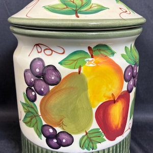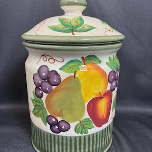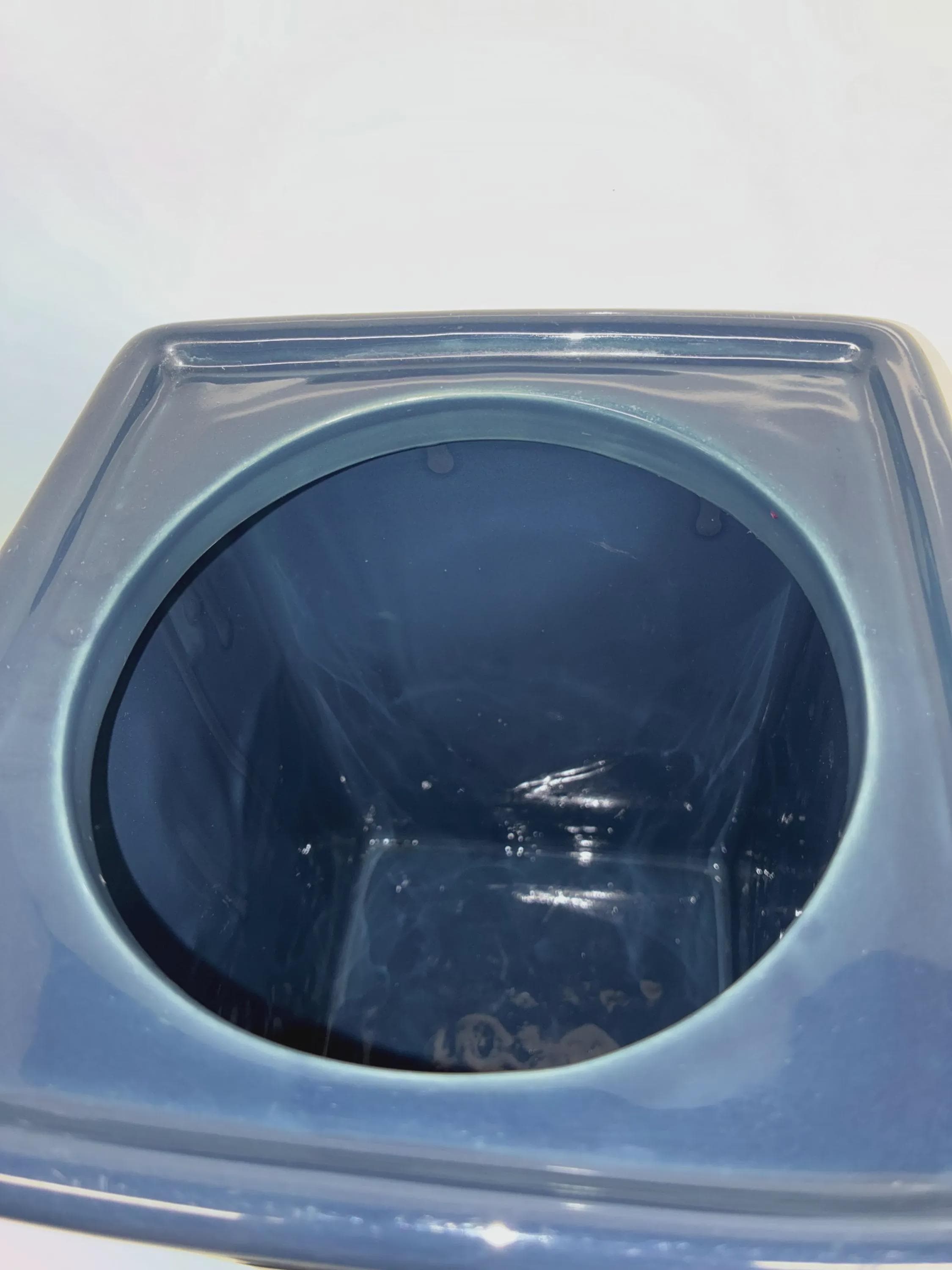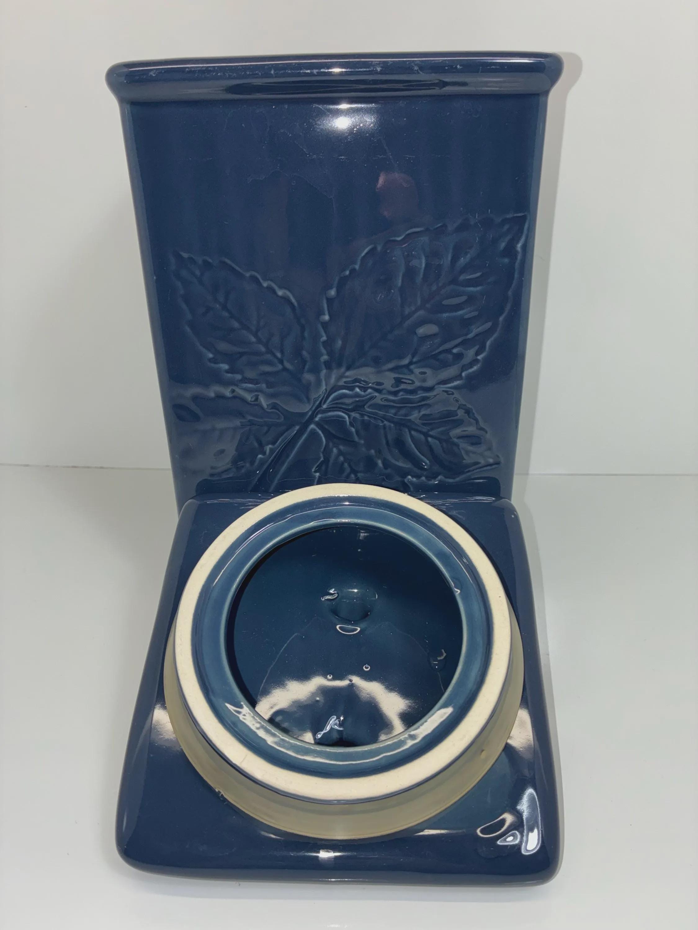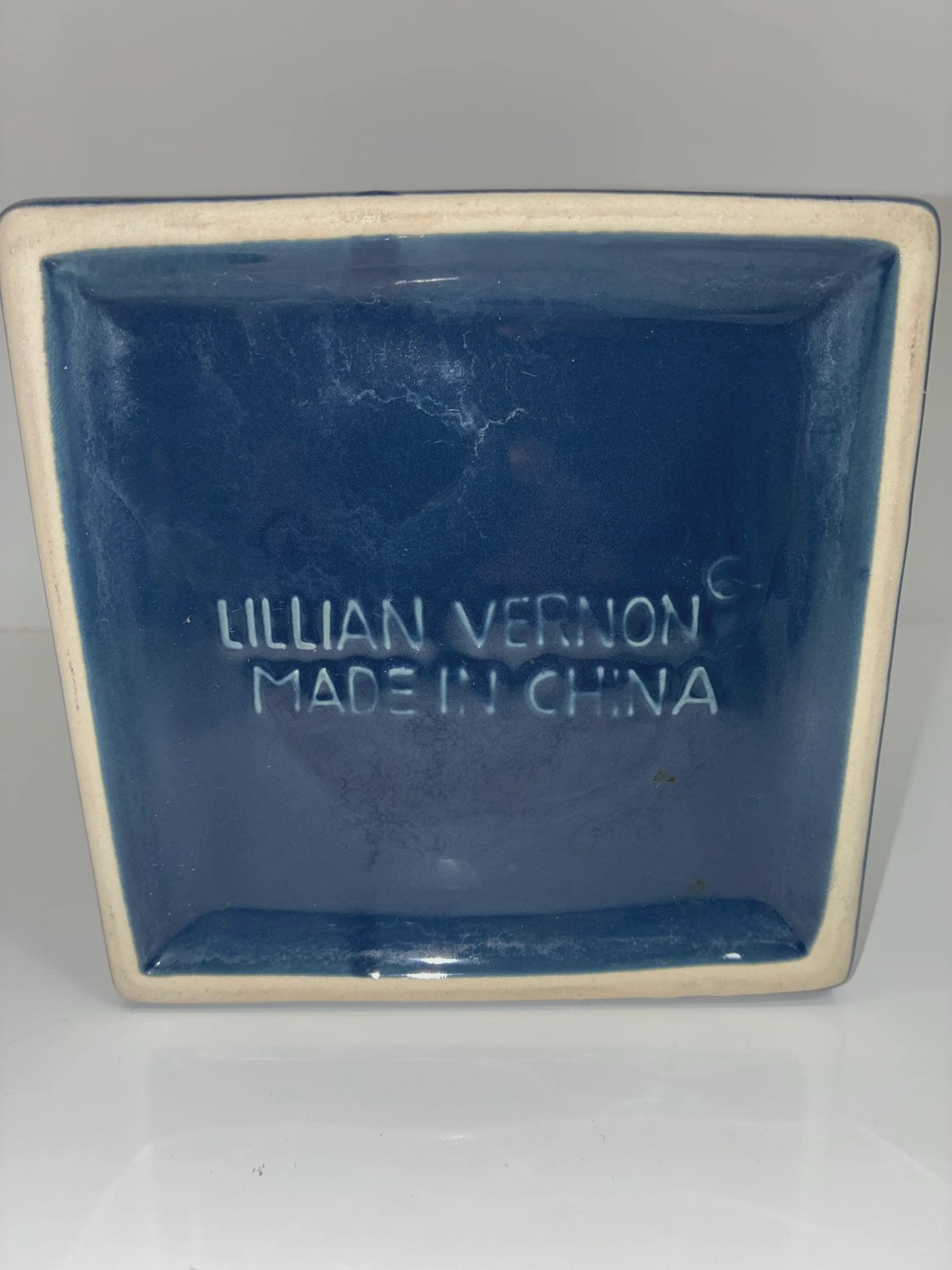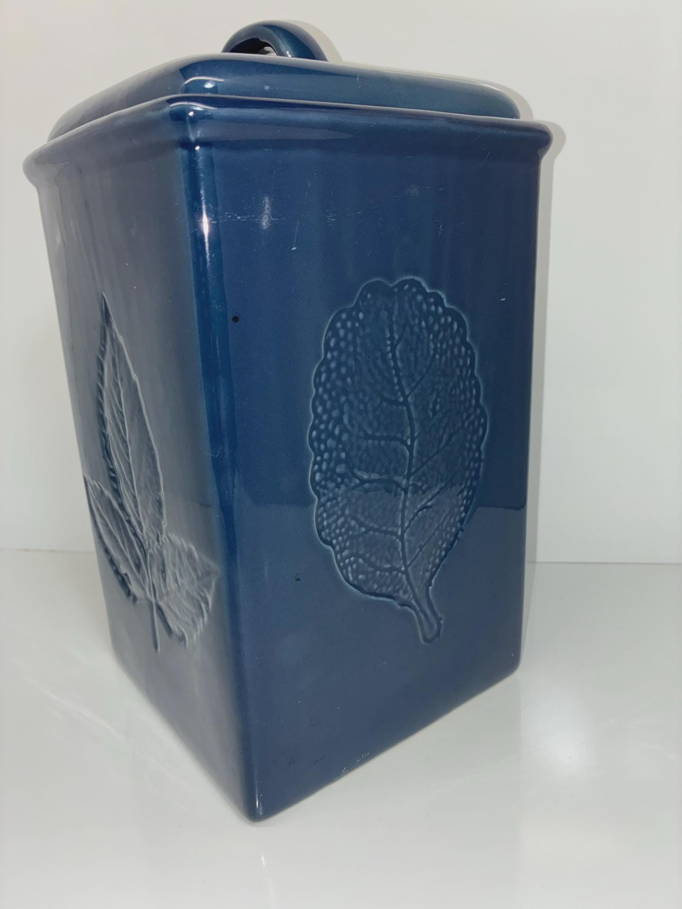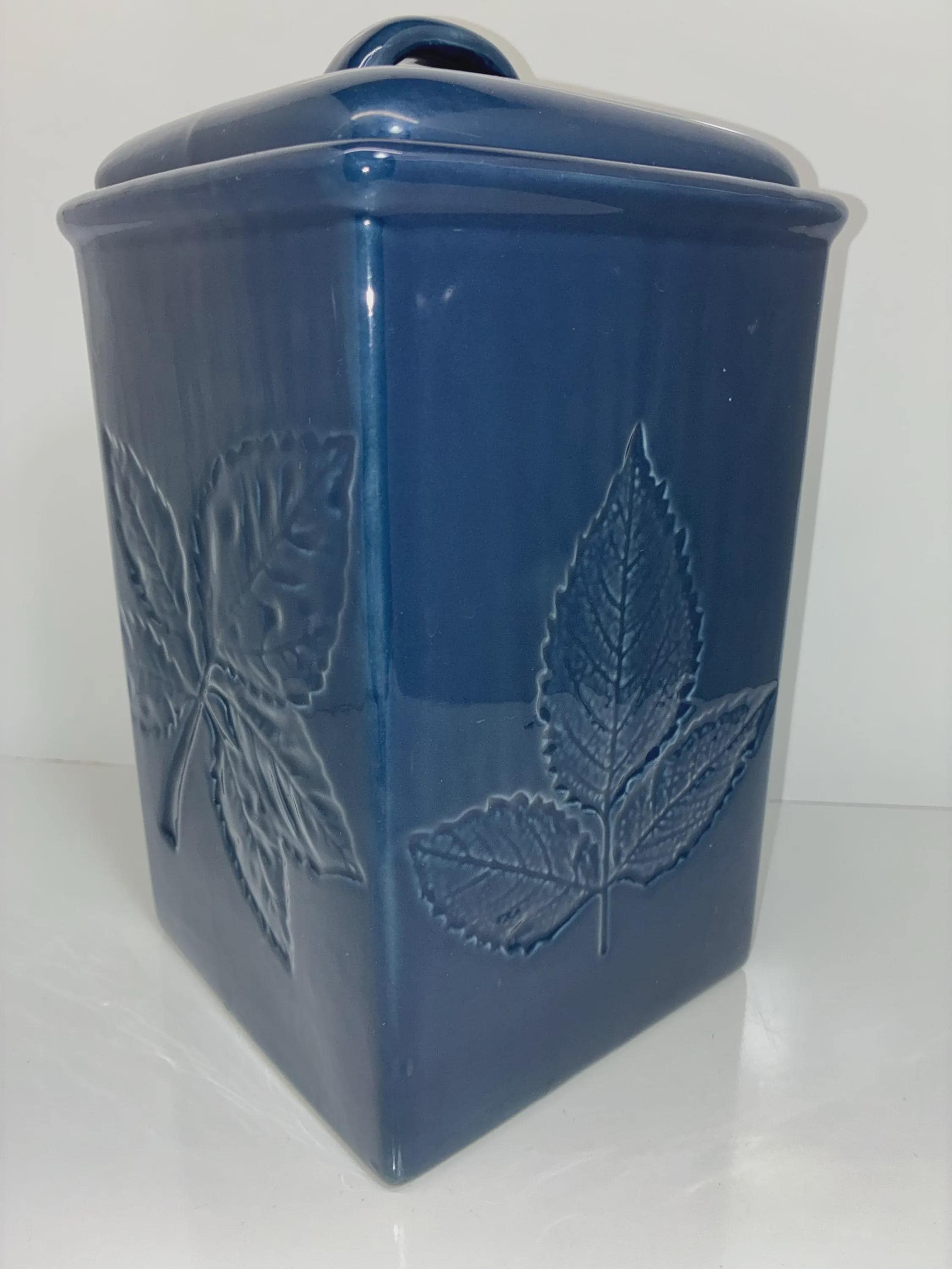 Vintage Lillian Vernon blue ceramic canister with leaf raised embossed leaf motive on all four sides signed on the bottom lid seal fits snuggly approximately 11 inches high 10 inches high without Lid. 6 in. Square. in excellent condition no scratches, cracks, chips, of any kind.