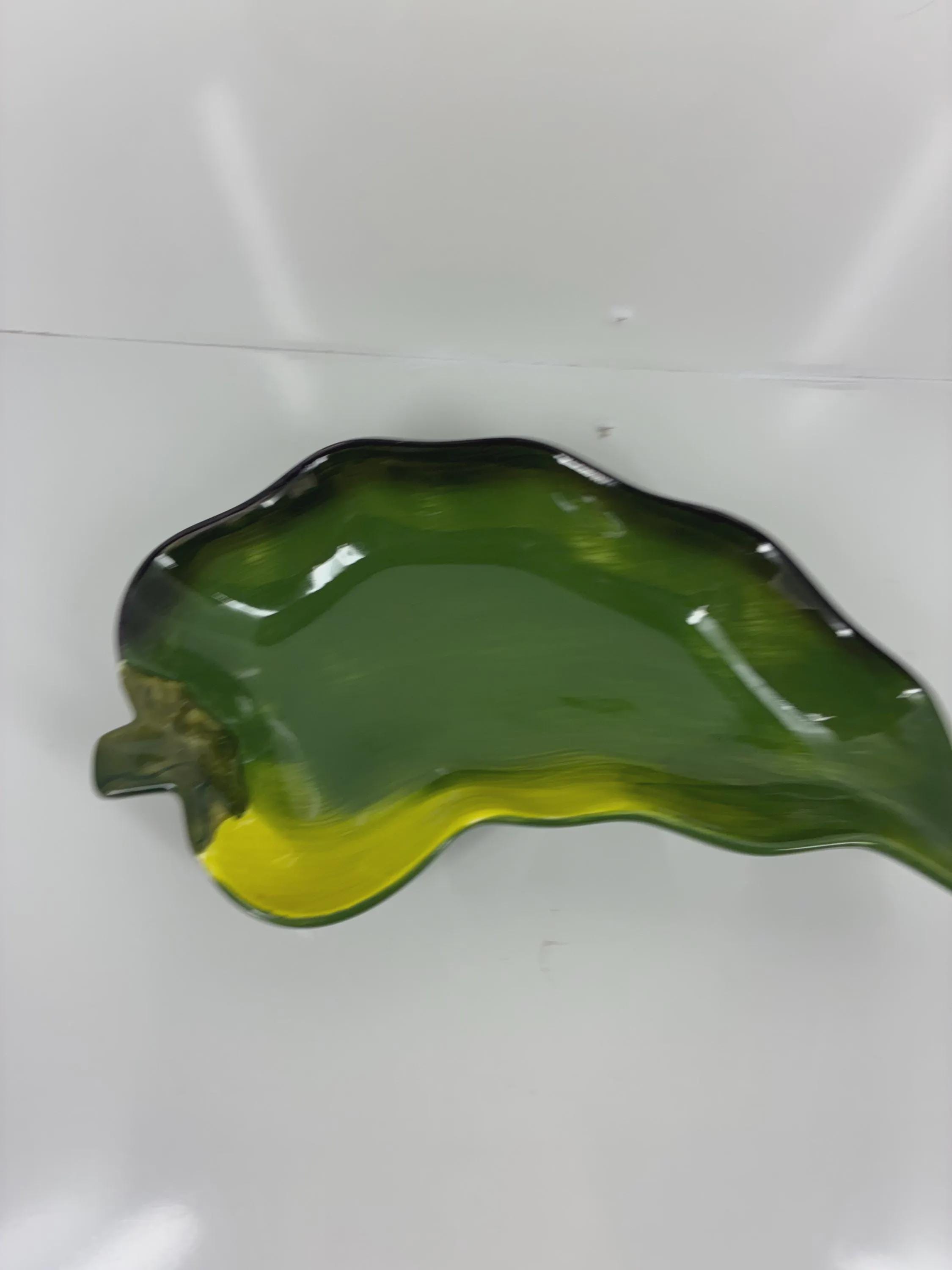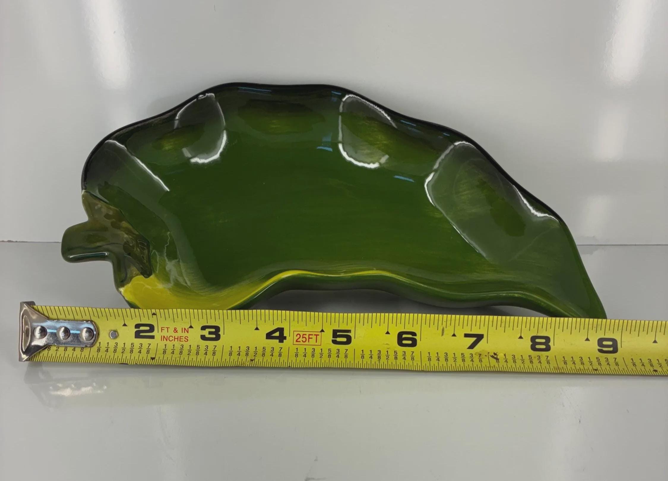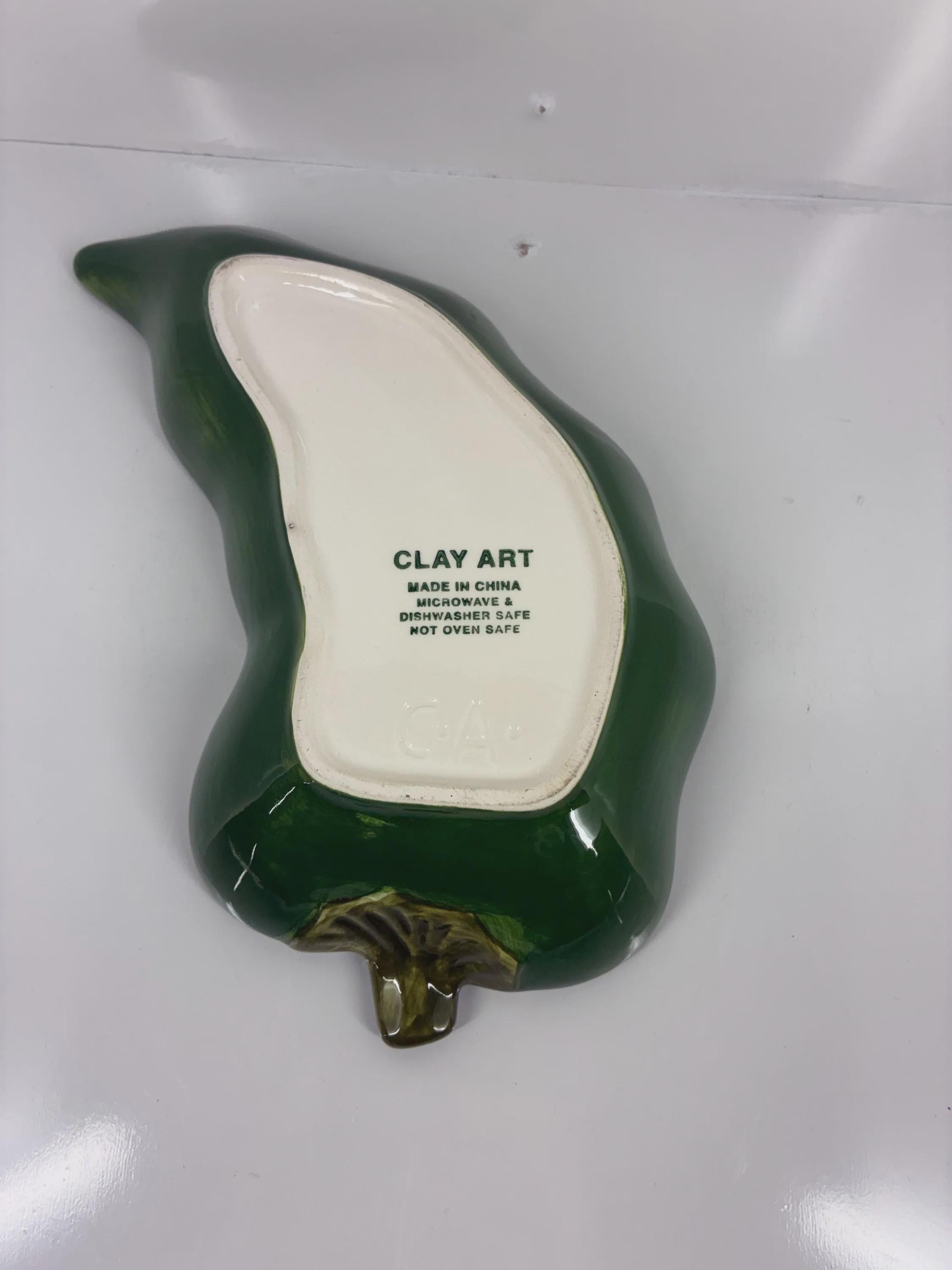 Vintage clay art La Mesa salsa dip bowl jalapeño serving dish like new made in China microwave and dishwasher safe not oven safe letters on the bottom C. A. approximately 9 inches long 5 inches wide one and a half inches deep.