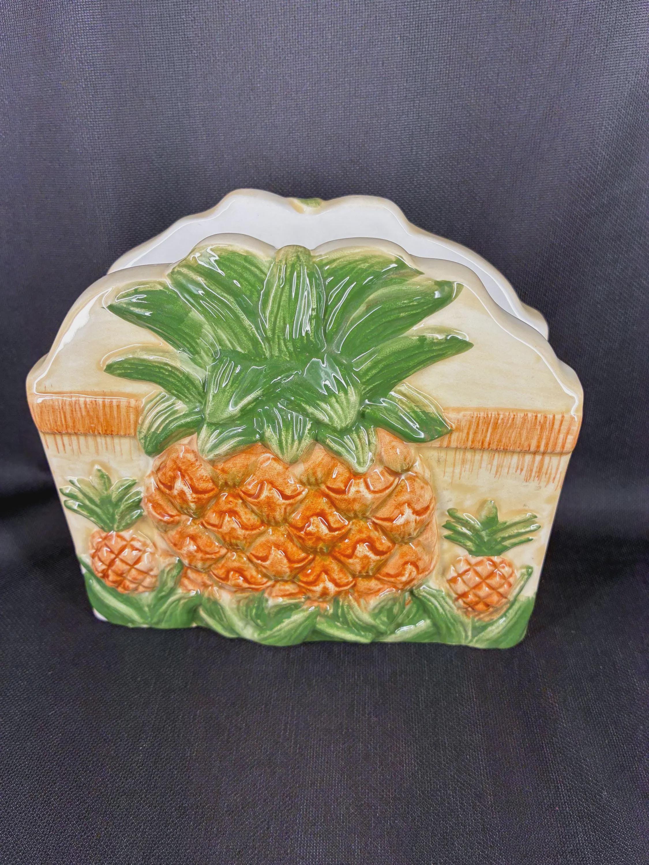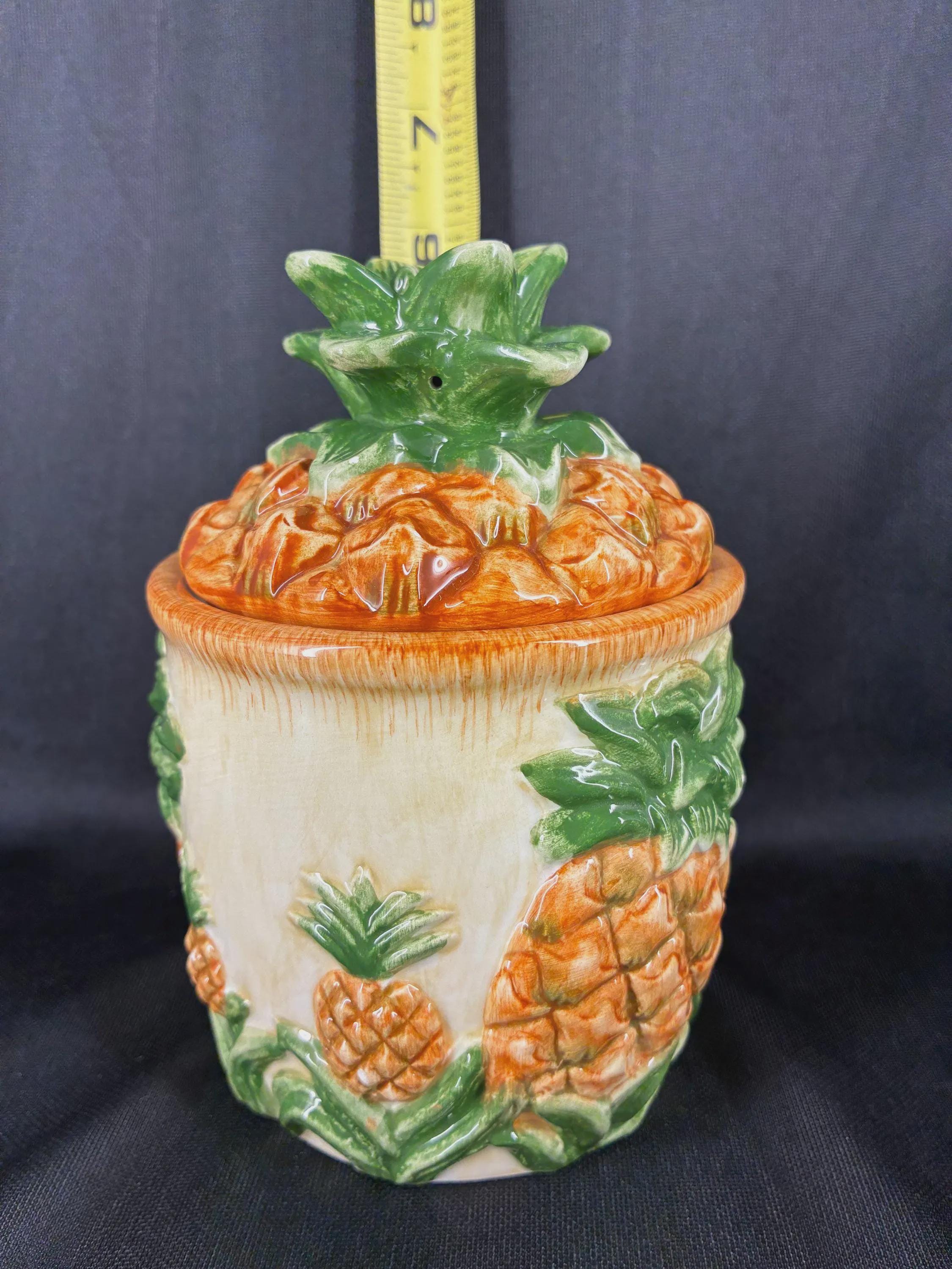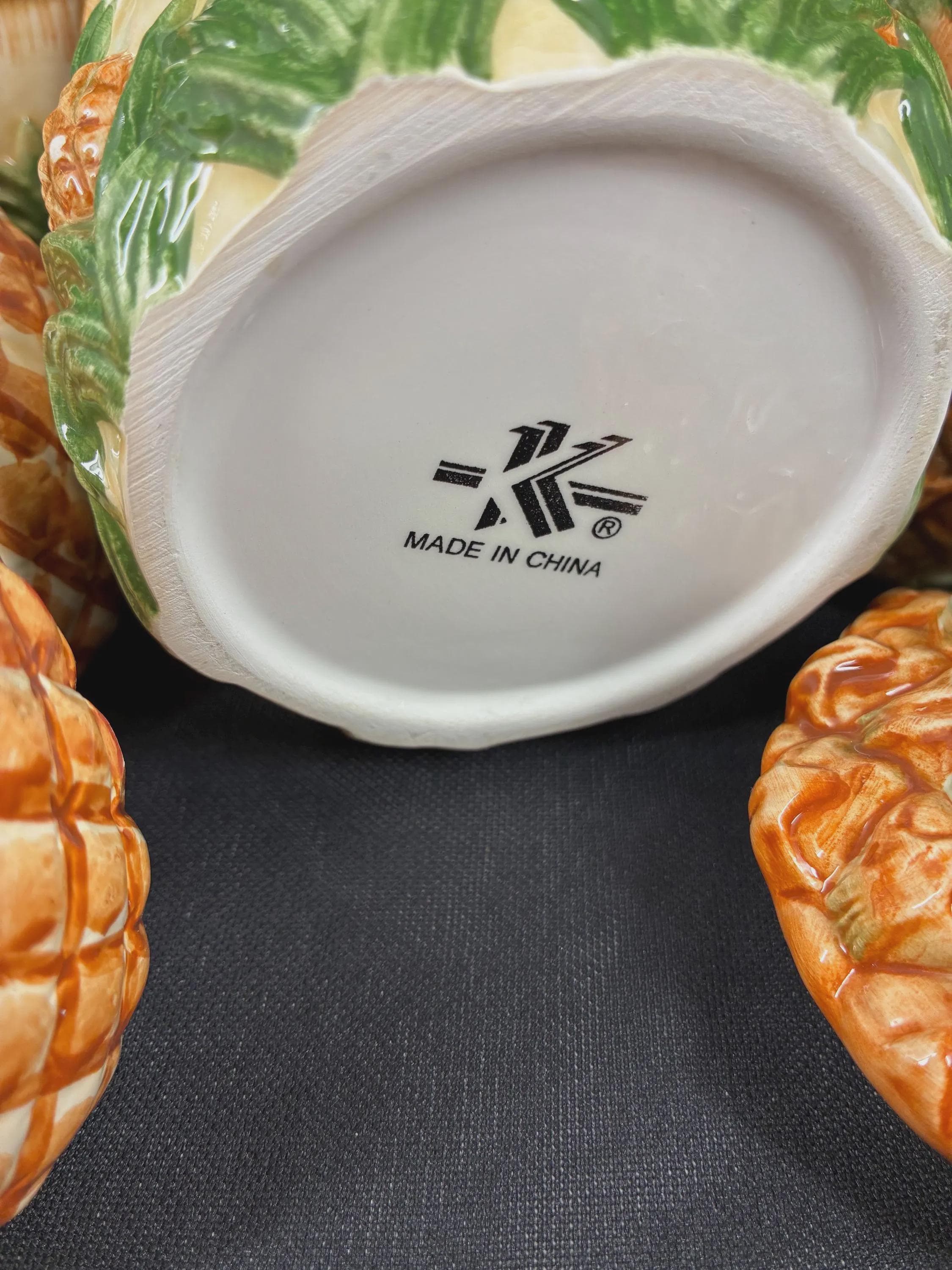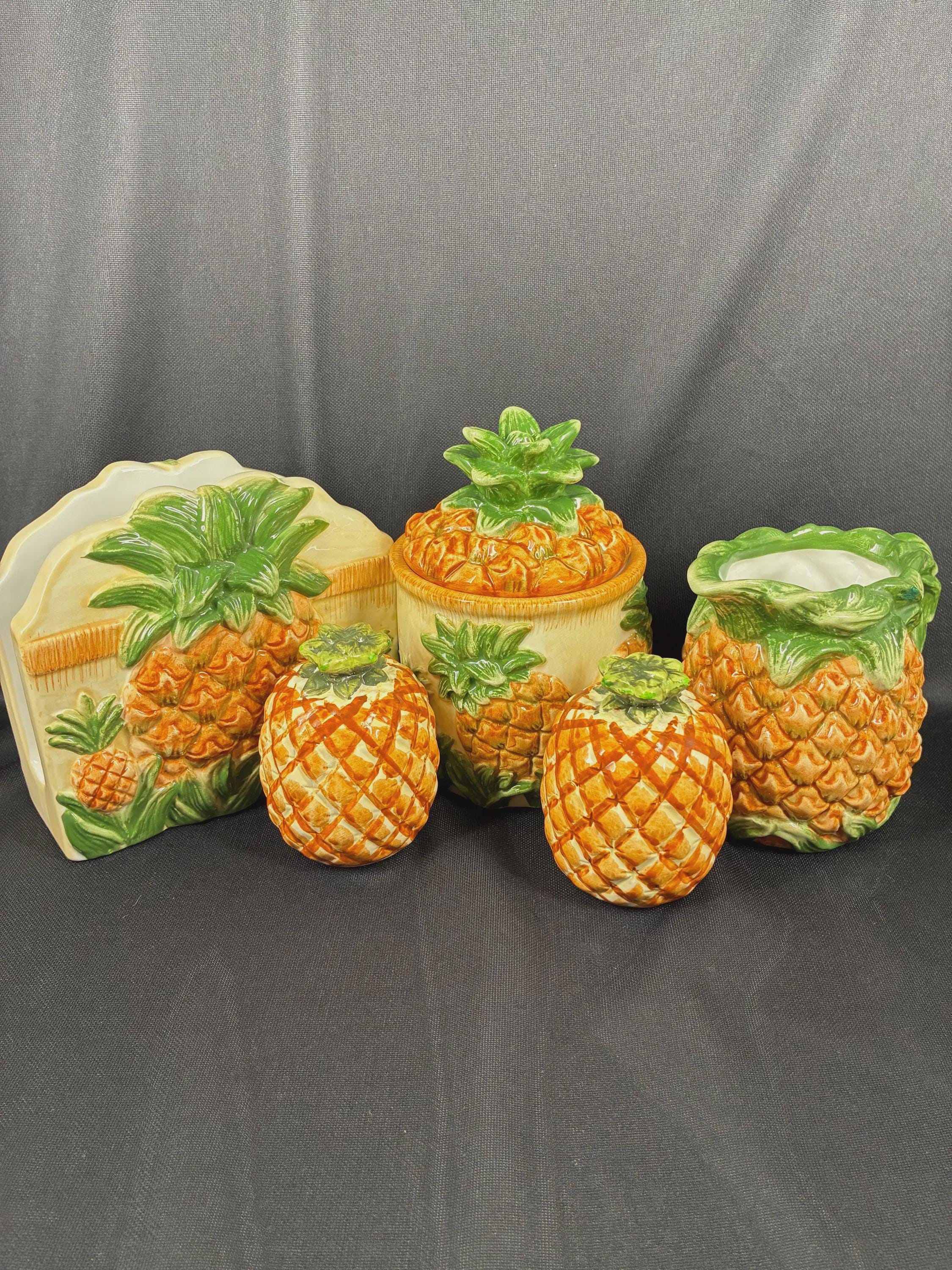 Vintage ceramic kitchenware featuring a bright motif design with textured pineapple and husks and green leafy accents hand painted, handmade stamped on the bottom with a K made in China. Sugar canister is approximately 6 inches high 4 inches diameter with lid. creamer pitcher approximately 4 inches high 5 inches across from tip of spout to outside of handle, napkin holder is 5 inches high 5 1/2 inches long, salt and pepper shakers are 3 1/2 inches high 2 1/2 inches diameter with their stoppers used set the salt and pepper shakers have very few flaws on the top husks otherwise everything is perfect.