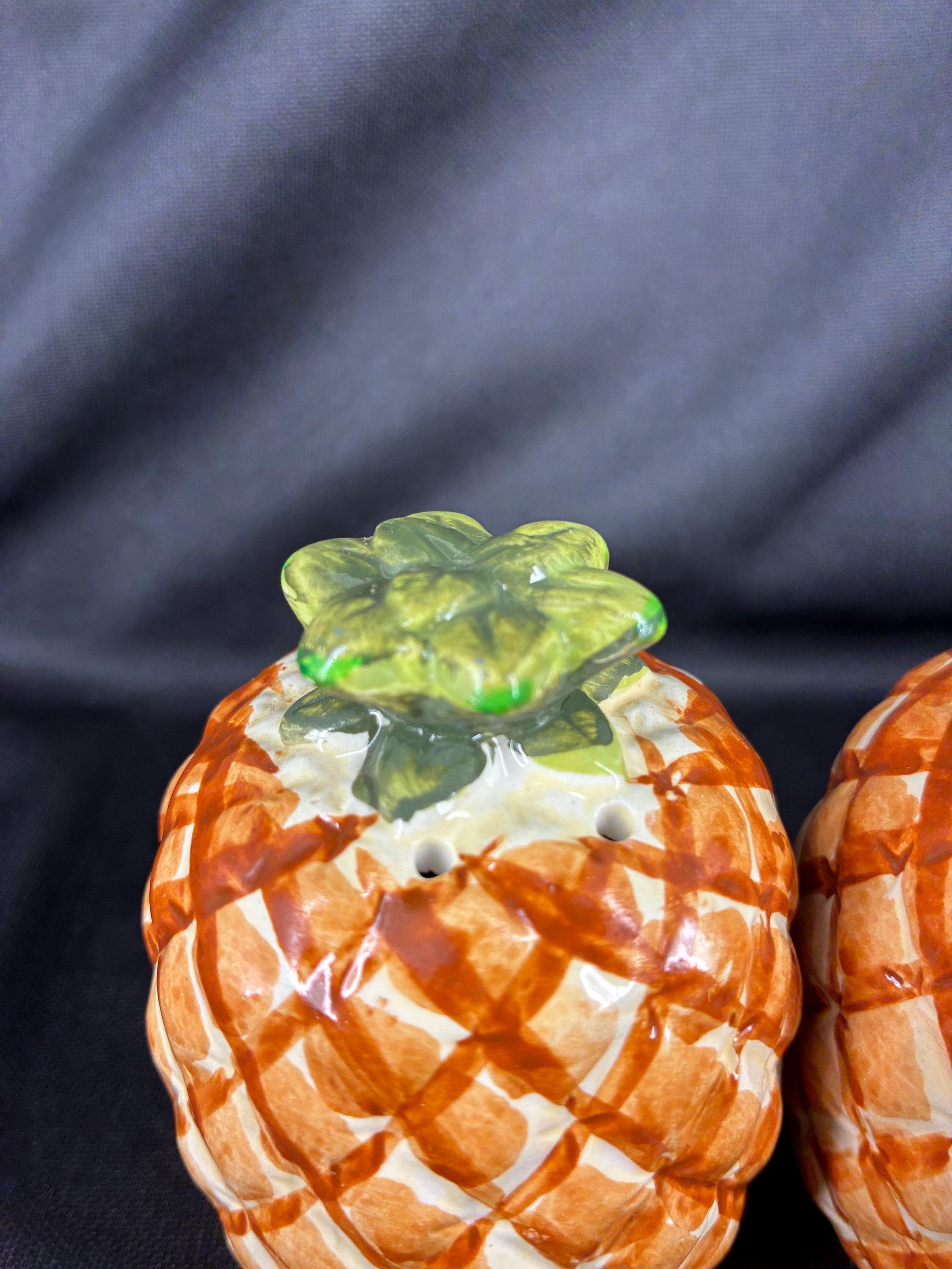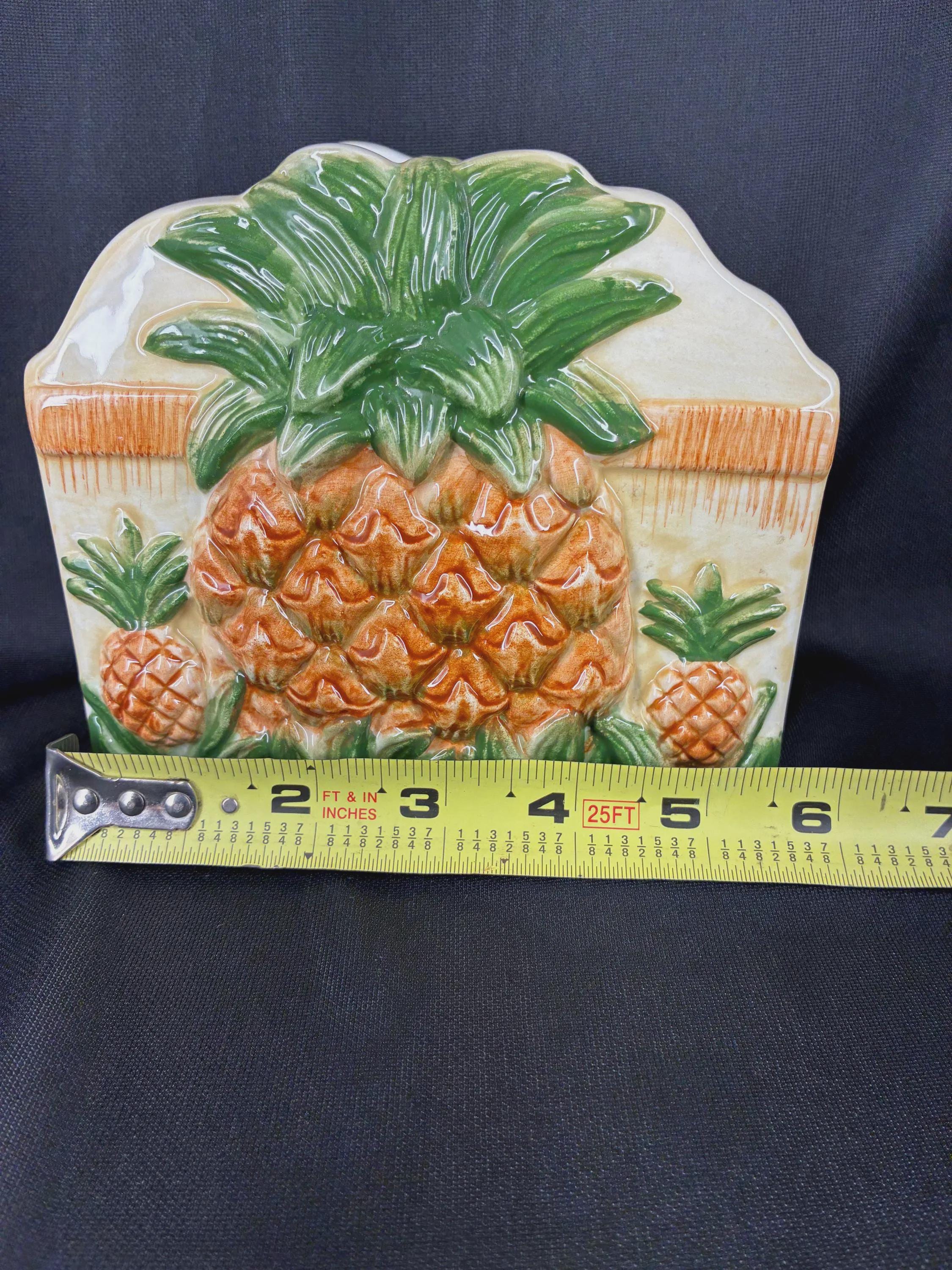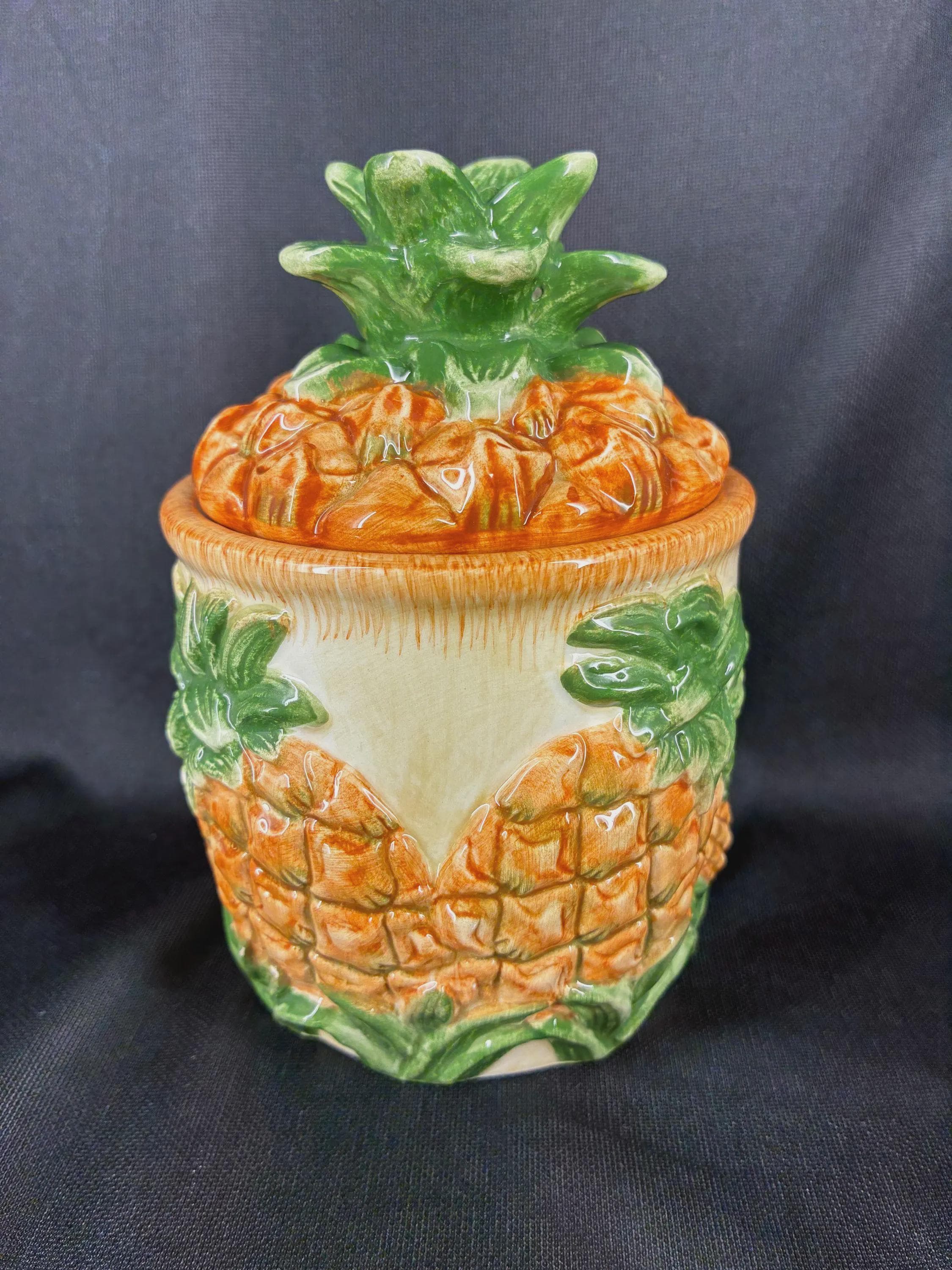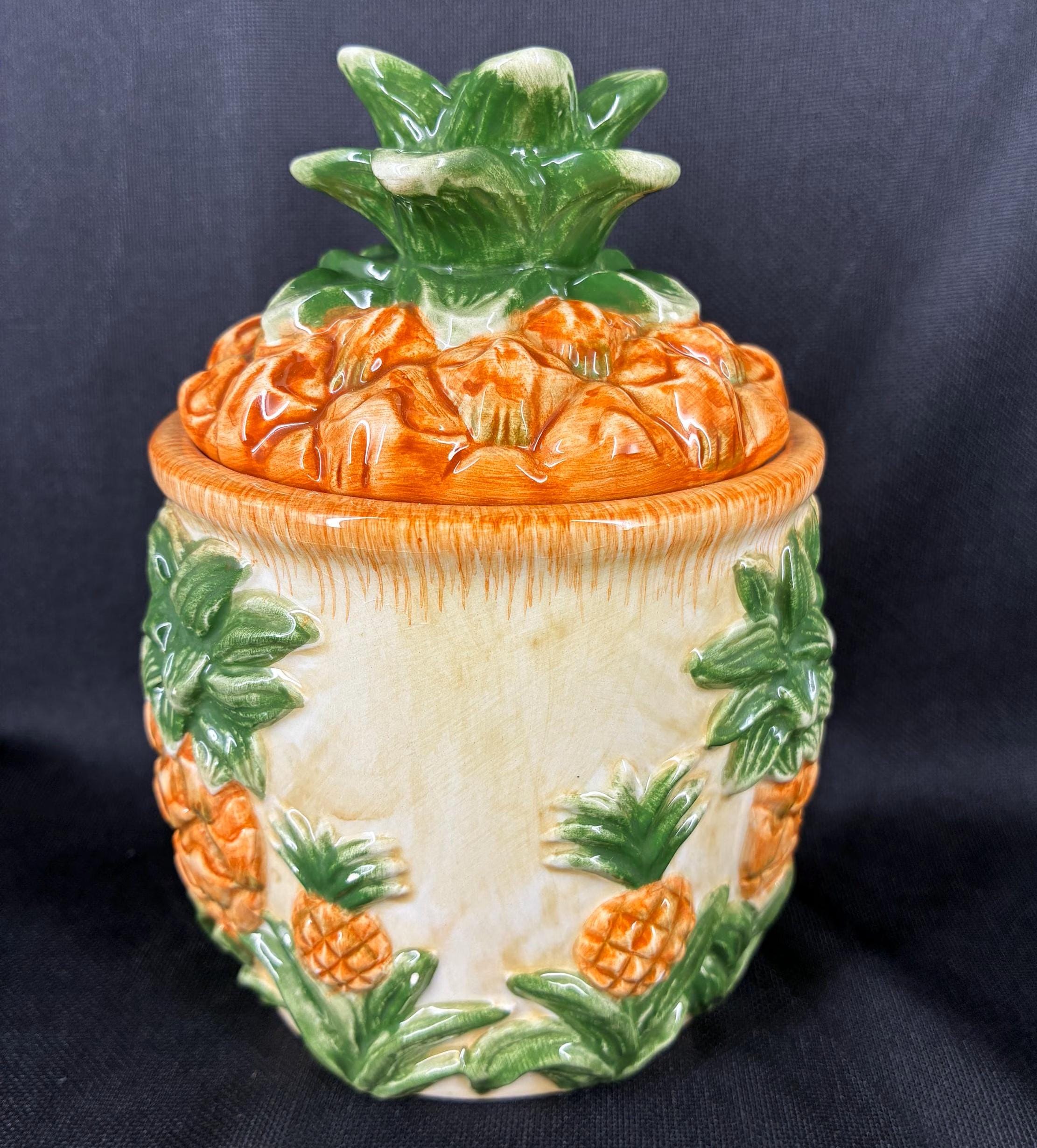 Vintage ceramic kitchenware featuring a bright motif design with textured pineapple and husks and green leafy accents hand painted, handmade stamped on the bottom with a K made in China. Sugar canister is approximately 6 inches high 4 inches diameter with lid. creamer pitcher approximately 4 inches high 5 inches across from tip of spout to outside of handle, napkin holder is 5 inches high 5 1/2 inches long, salt and pepper shakers are 3 1/2 inches high 2 1/2 inches diameter with their stoppers used set the salt and pepper shakers have very few flaws on the top husks otherwise everything is perfect.