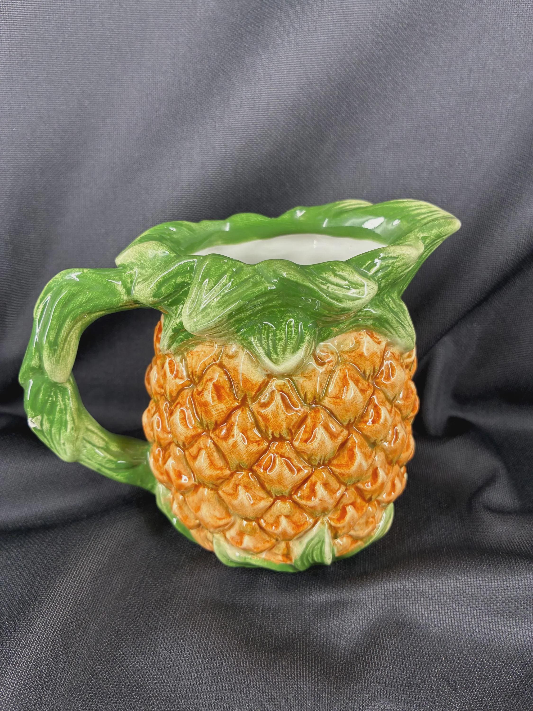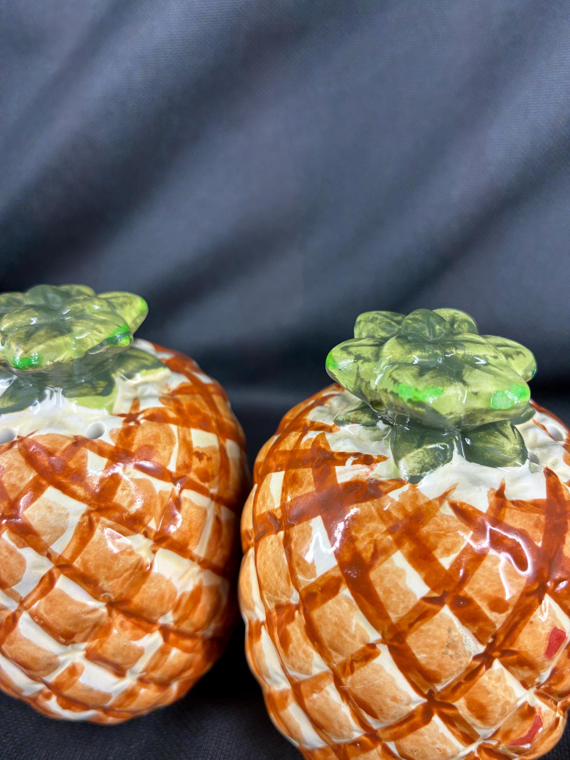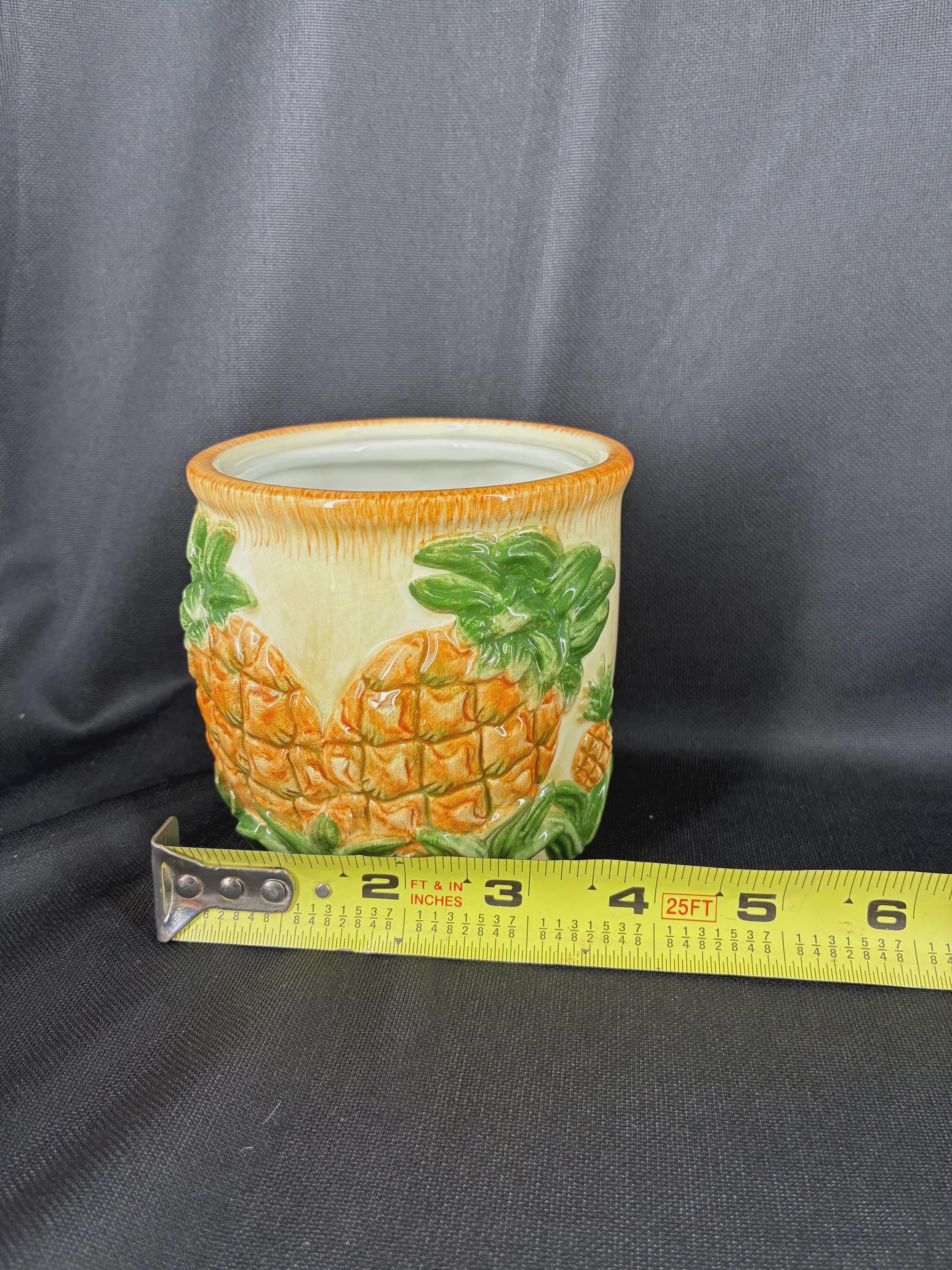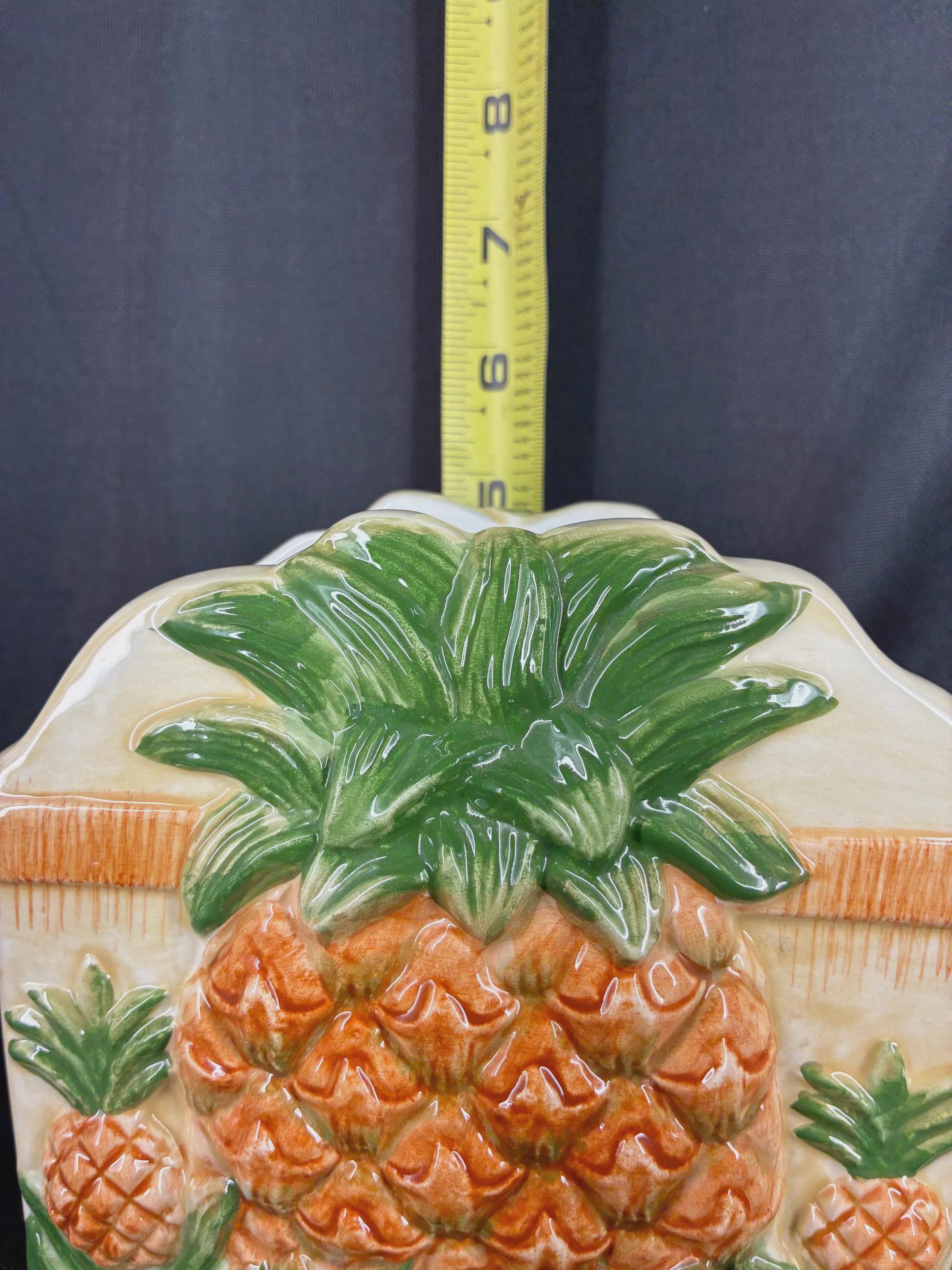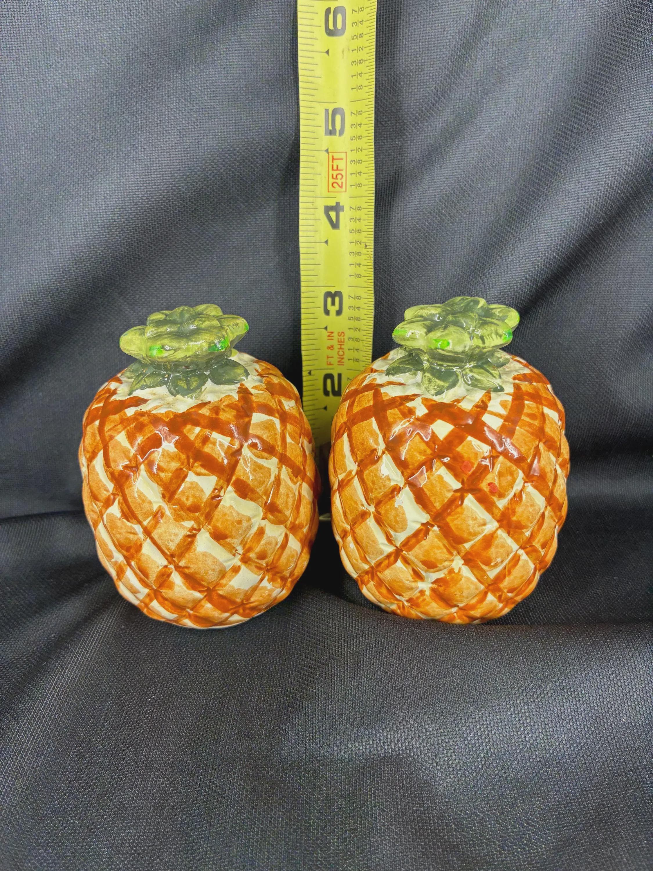 Vintage ceramic kitchenware featuring a bright motif design with textured pineapple and husks and green leafy accents hand painted, handmade stamped on the bottom with a K made in China. Sugar canister is approximately 6 inches high 4 inches diameter with lid. creamer pitcher approximately 4 inches high 5 inches across from tip of spout to outside of handle, napkin holder is 5 inches high 5 1/2 inches long, salt and pepper shakers are 3 1/2 inches high 2 1/2 inches diameter with their stoppers used set the salt and pepper shakers have very few flaws on the top husks otherwise everything is perfect.
