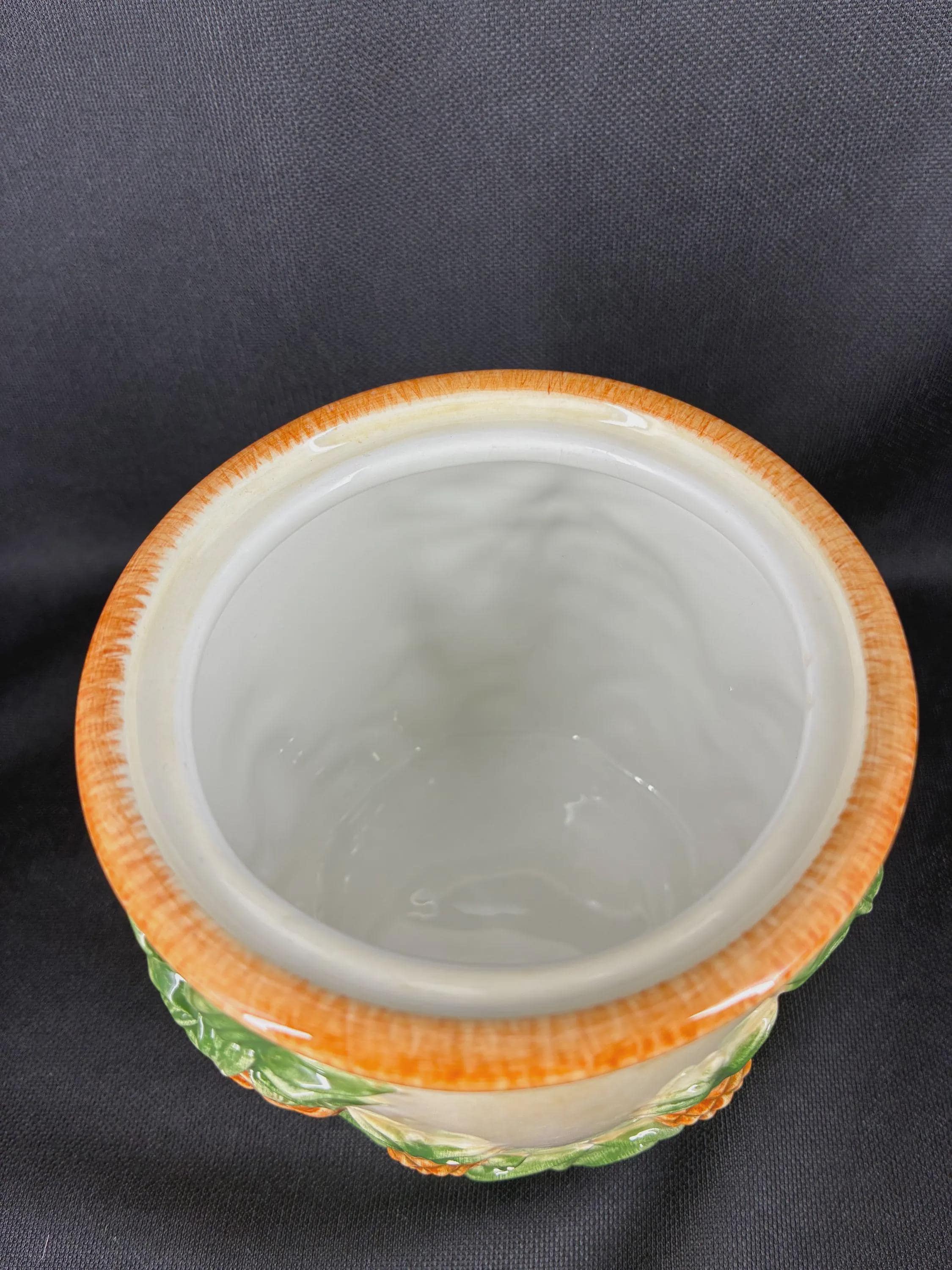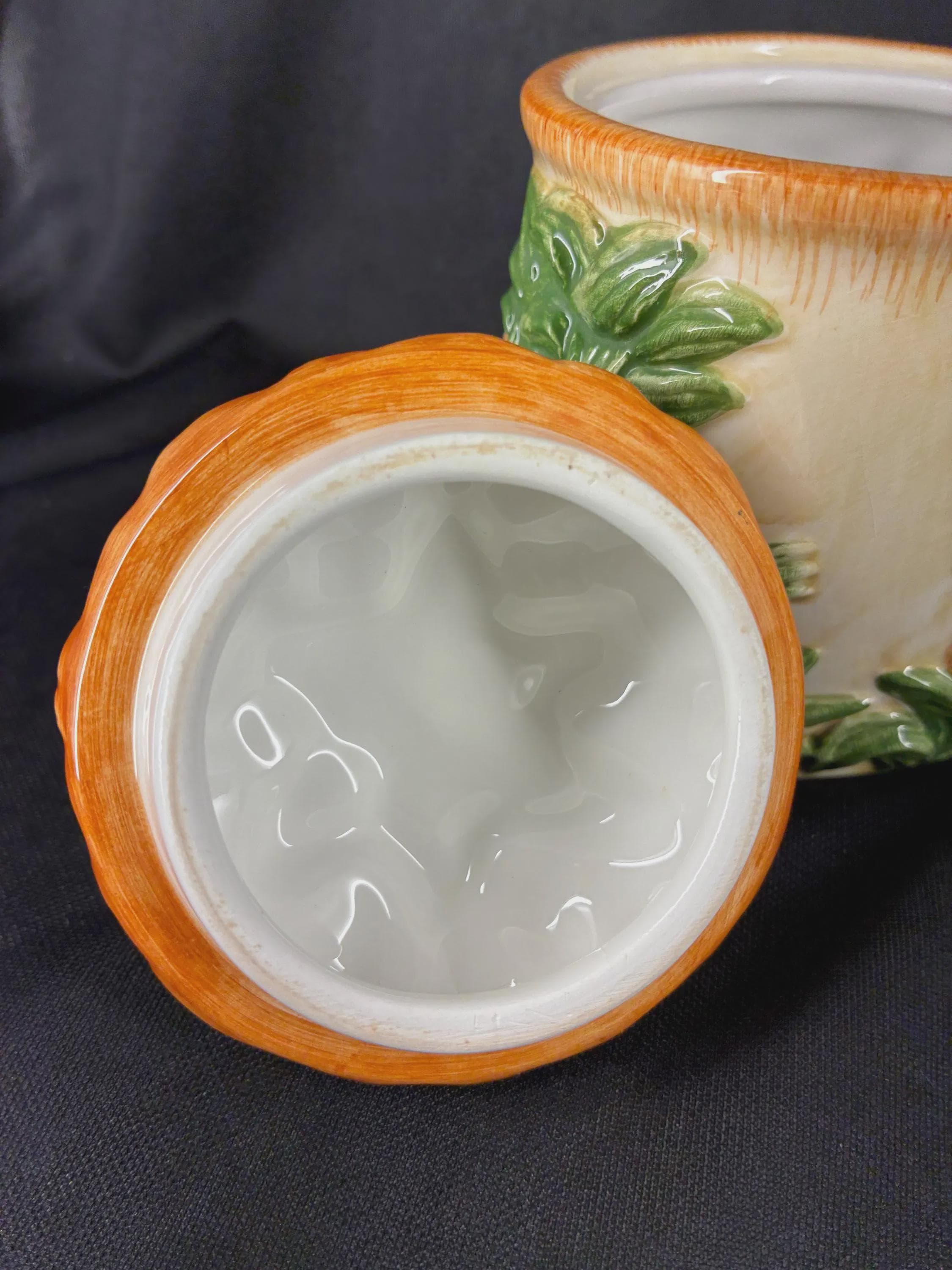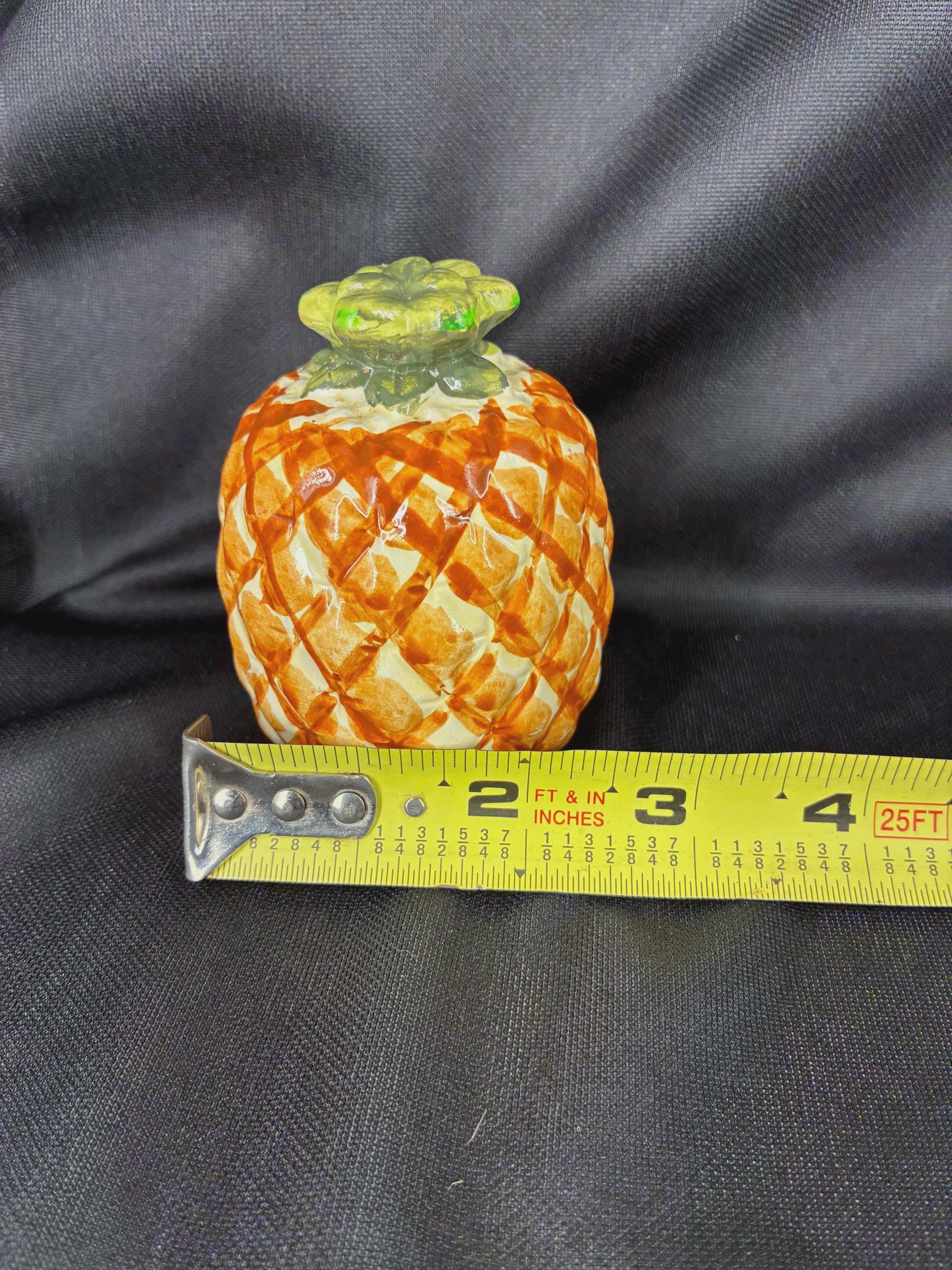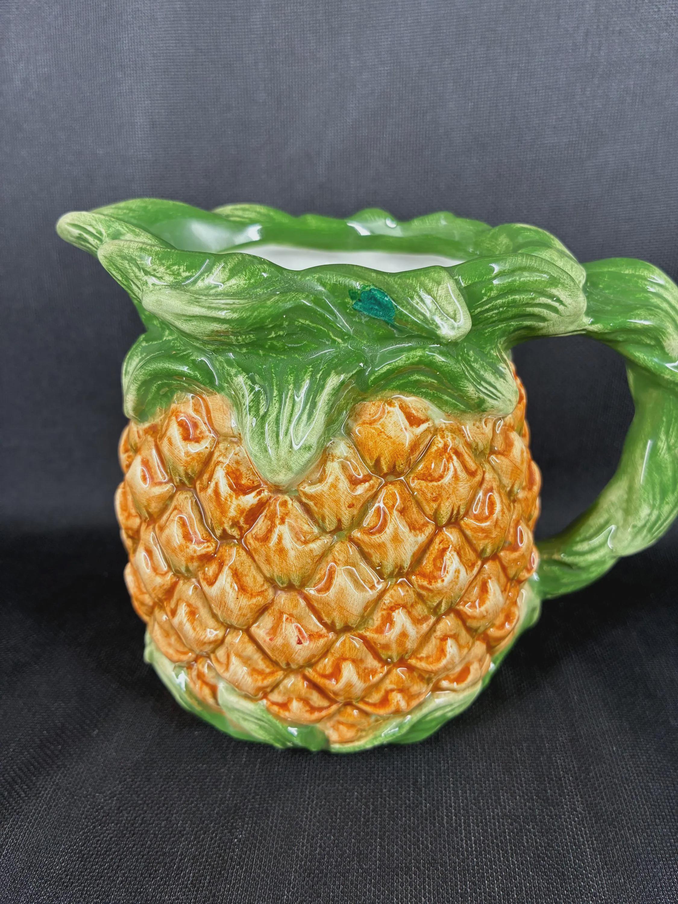 Vintage ceramic kitchenware featuring a bright motif design with textured pineapple and husks and green leafy accents hand painted, handmade stamped on the bottom with a K made in China. Sugar canister is approximately 6 inches high 4 inches diameter with lid. creamer pitcher approximately 4 inches high 5 inches across from tip of spout to outside of handle, napkin holder is 5 inches high 5 1/2 inches long, salt and pepper shakers are 3 1/2 inches high 2 1/2 inches diameter with their stoppers used set the salt and pepper shakers have very few flaws on the top husks otherwise everything is perfect.