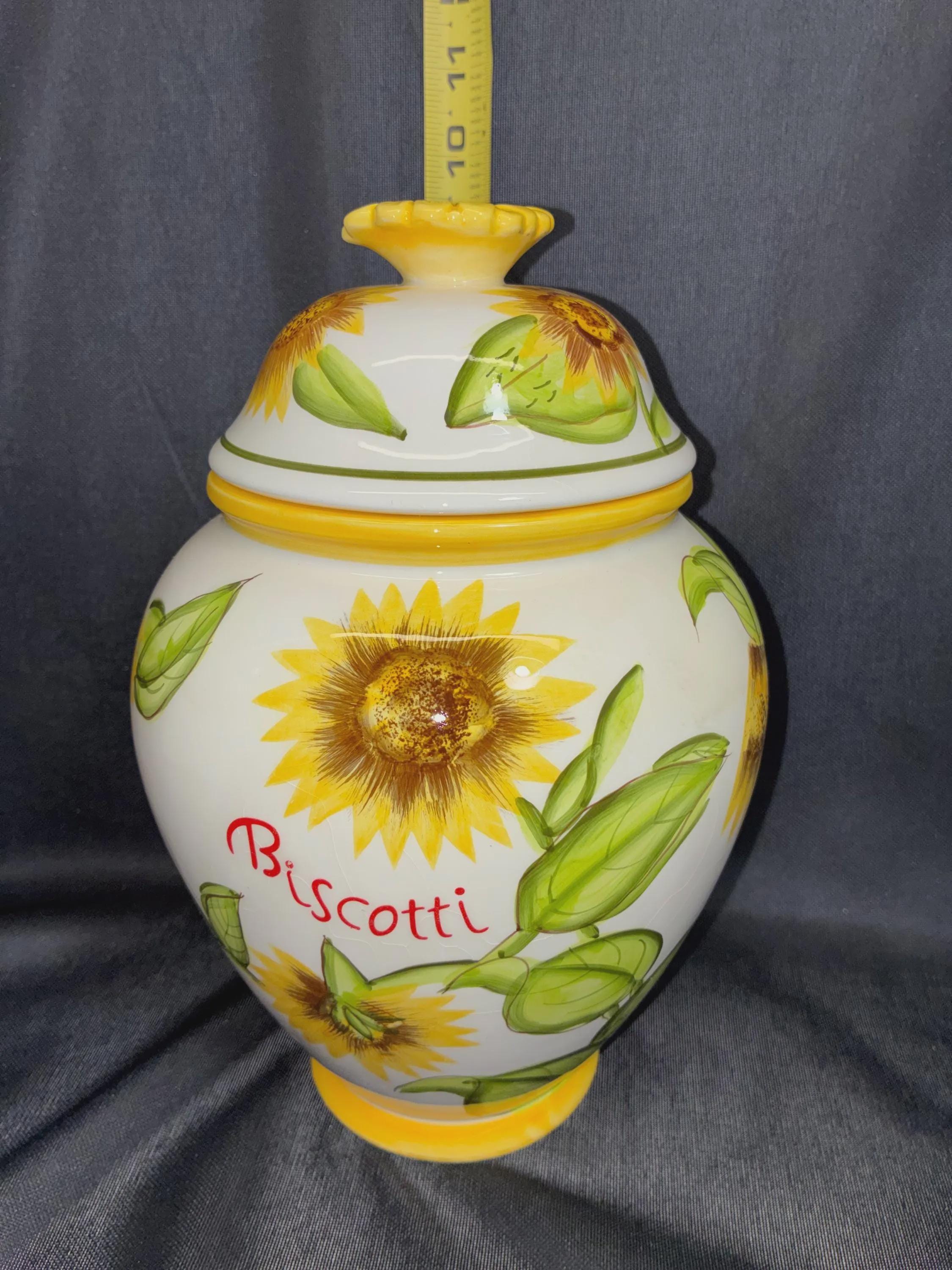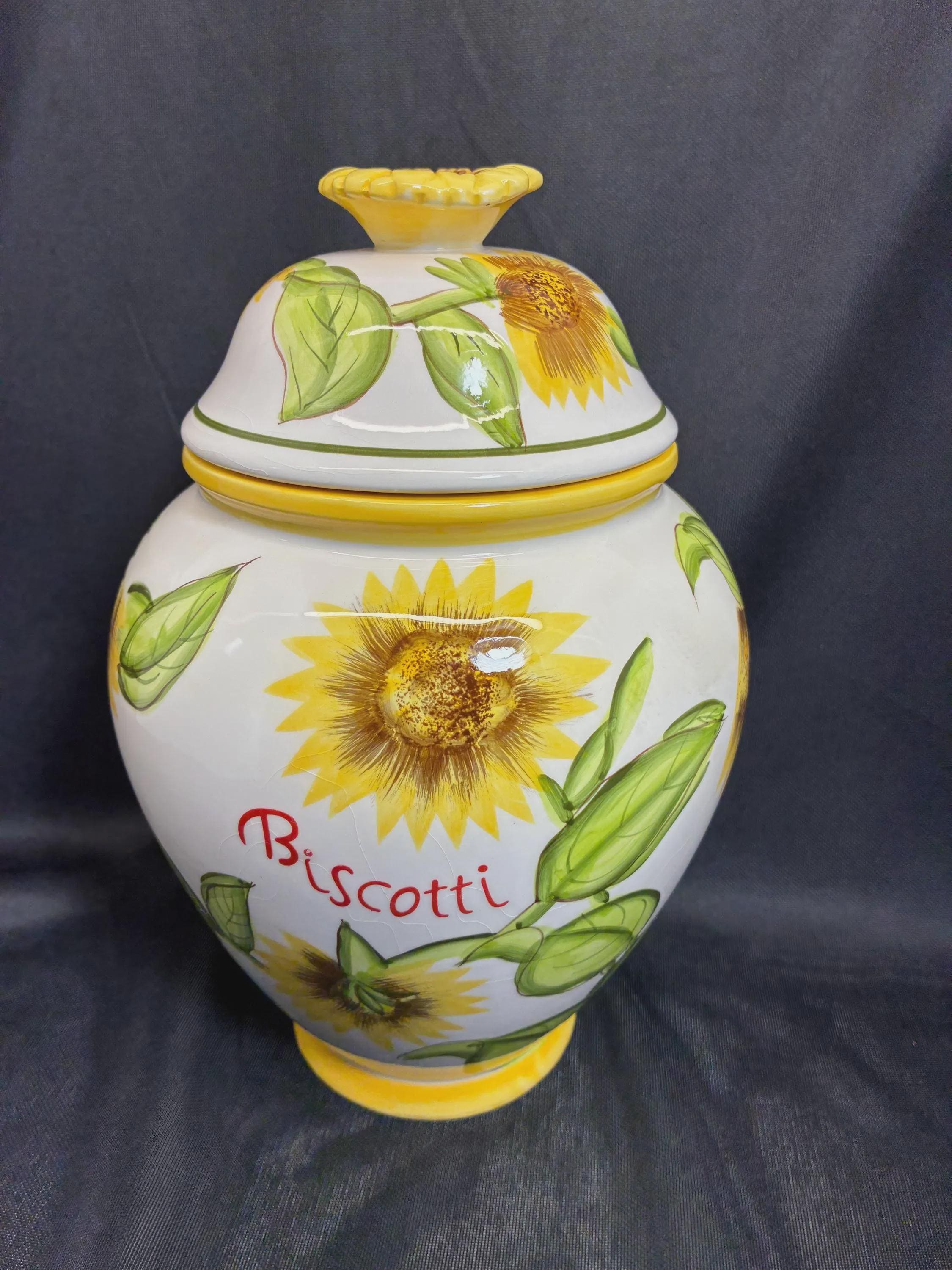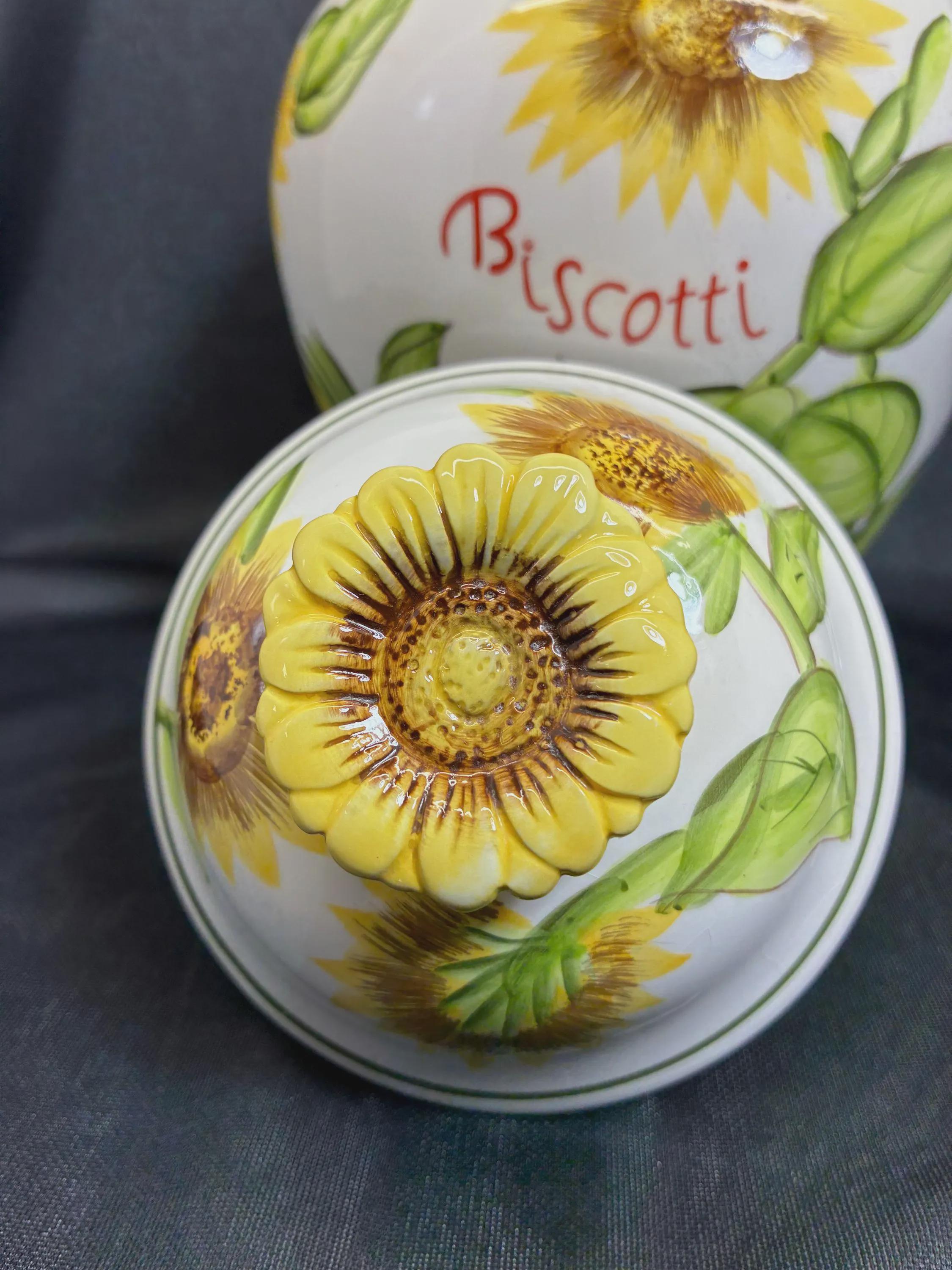 Vintage biscotti jar hand painted sunflowers on jar For Nonni's in China 1980s era 9 1/2 inches tall approximately 6 inches diameter no flaws Excellent condition.