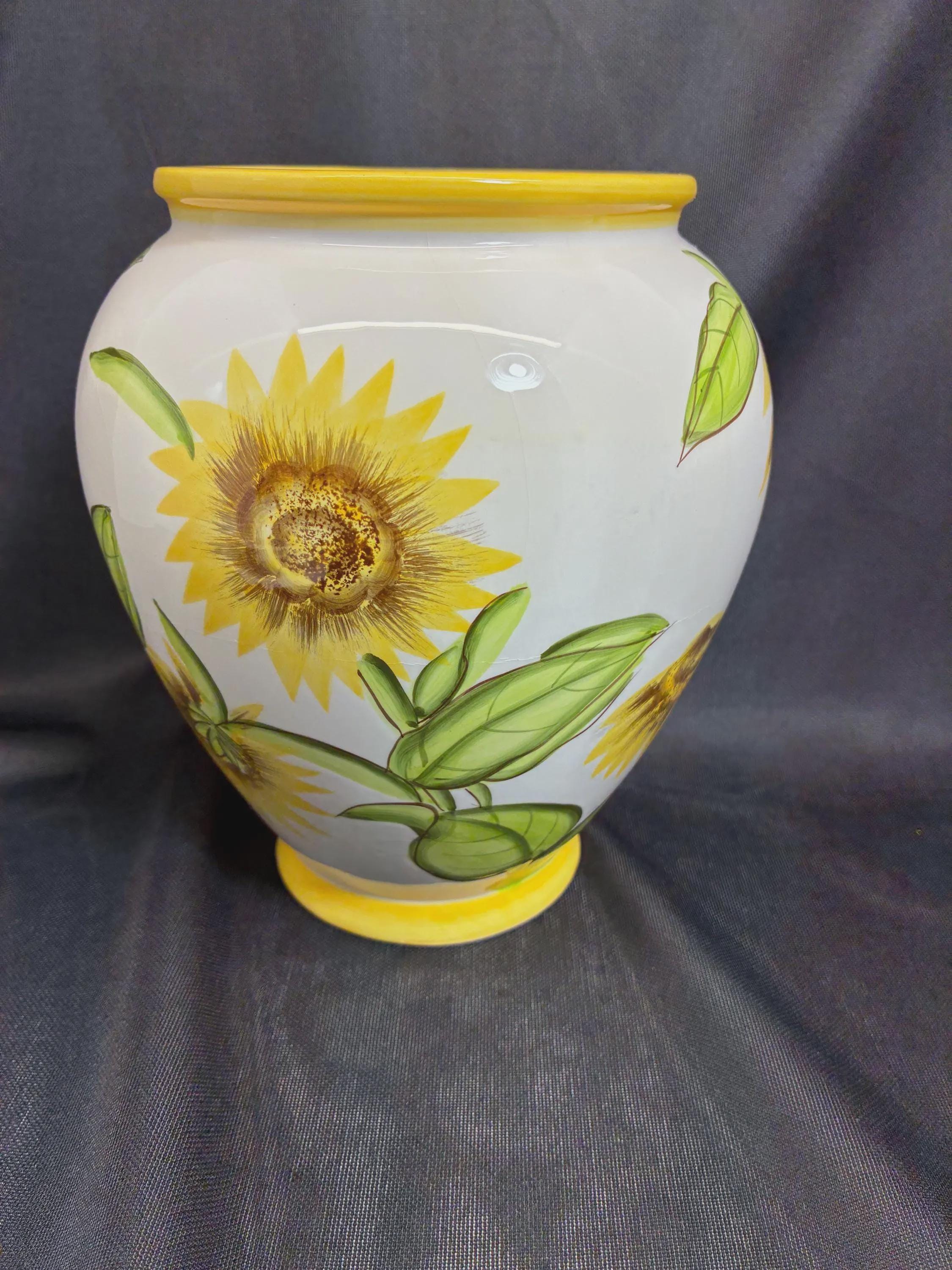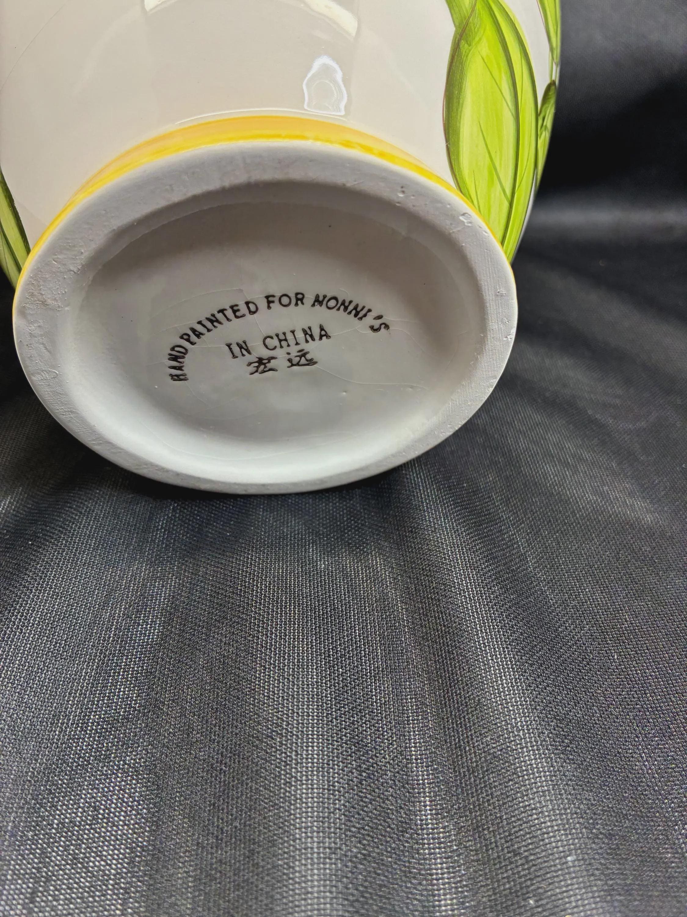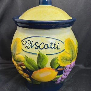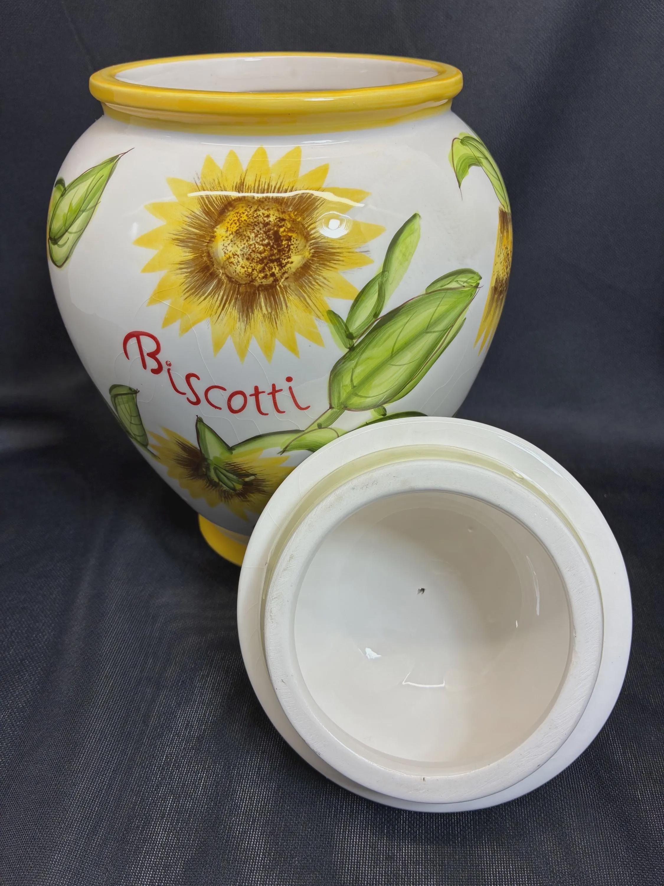 Vintage biscotti jar hand painted sunflowers on jar For Nonni's in China 1980s era 9 1/2 inches tall approximately 6 inches diameter no flaws Excellent condition.