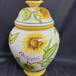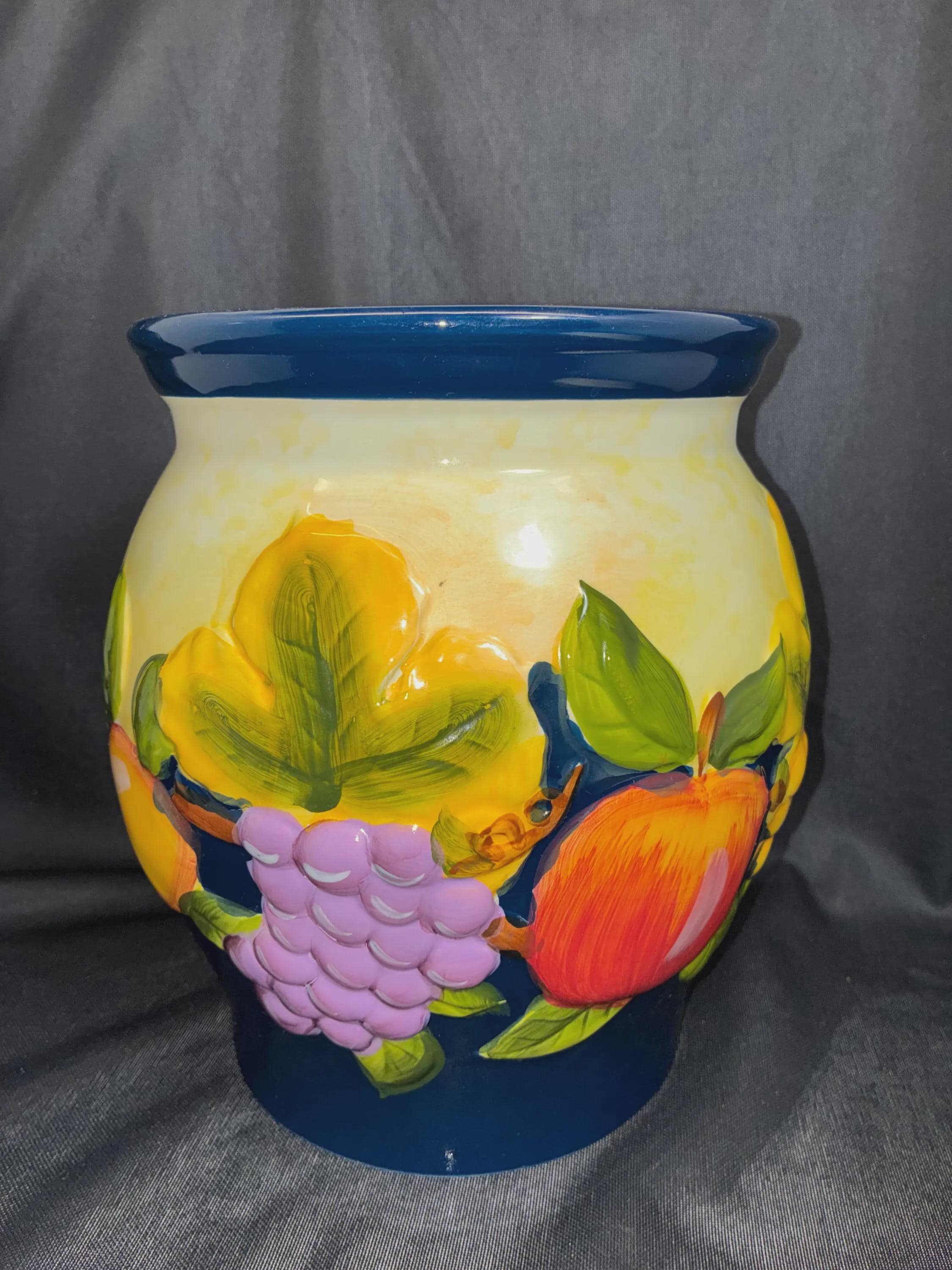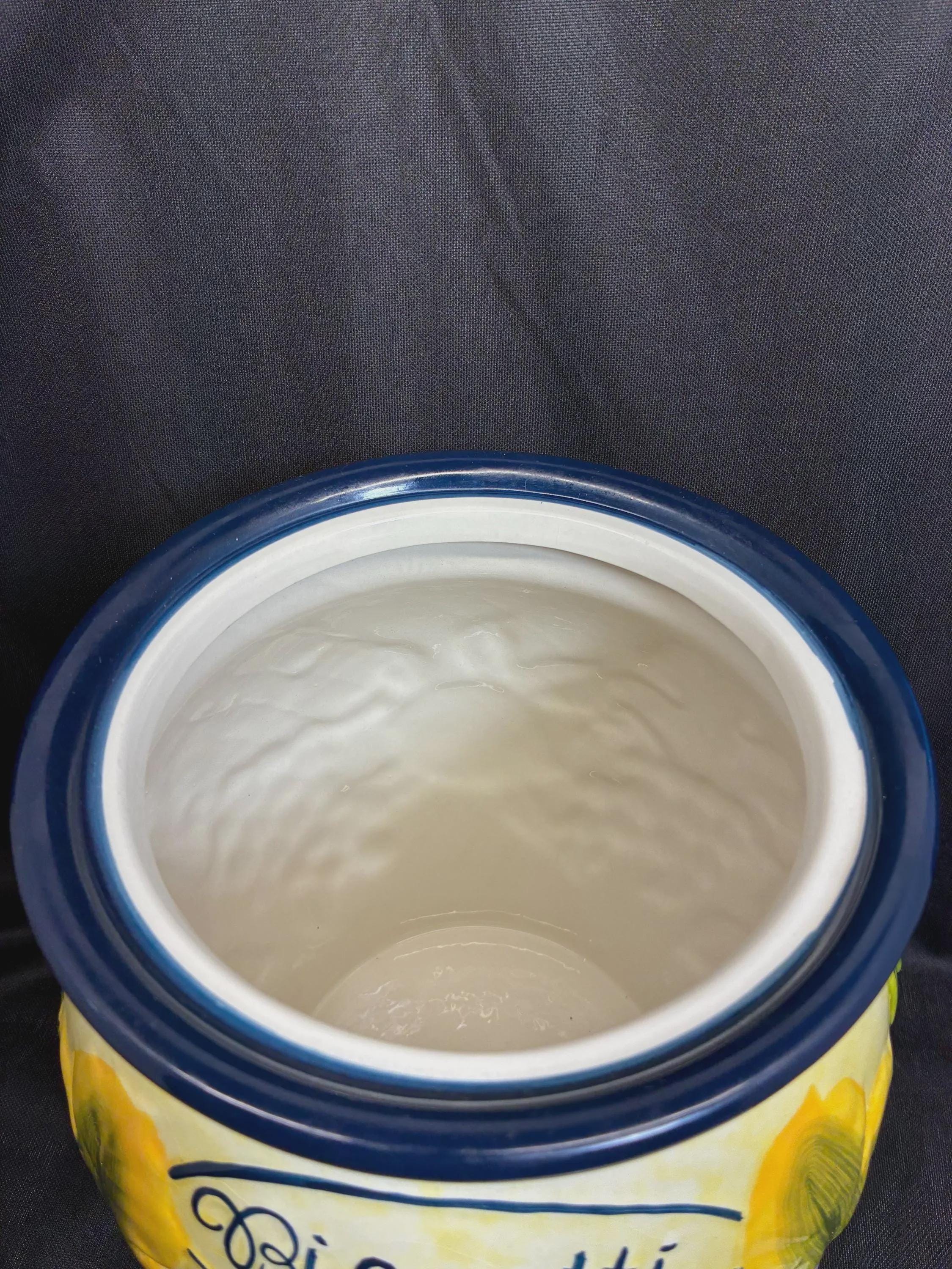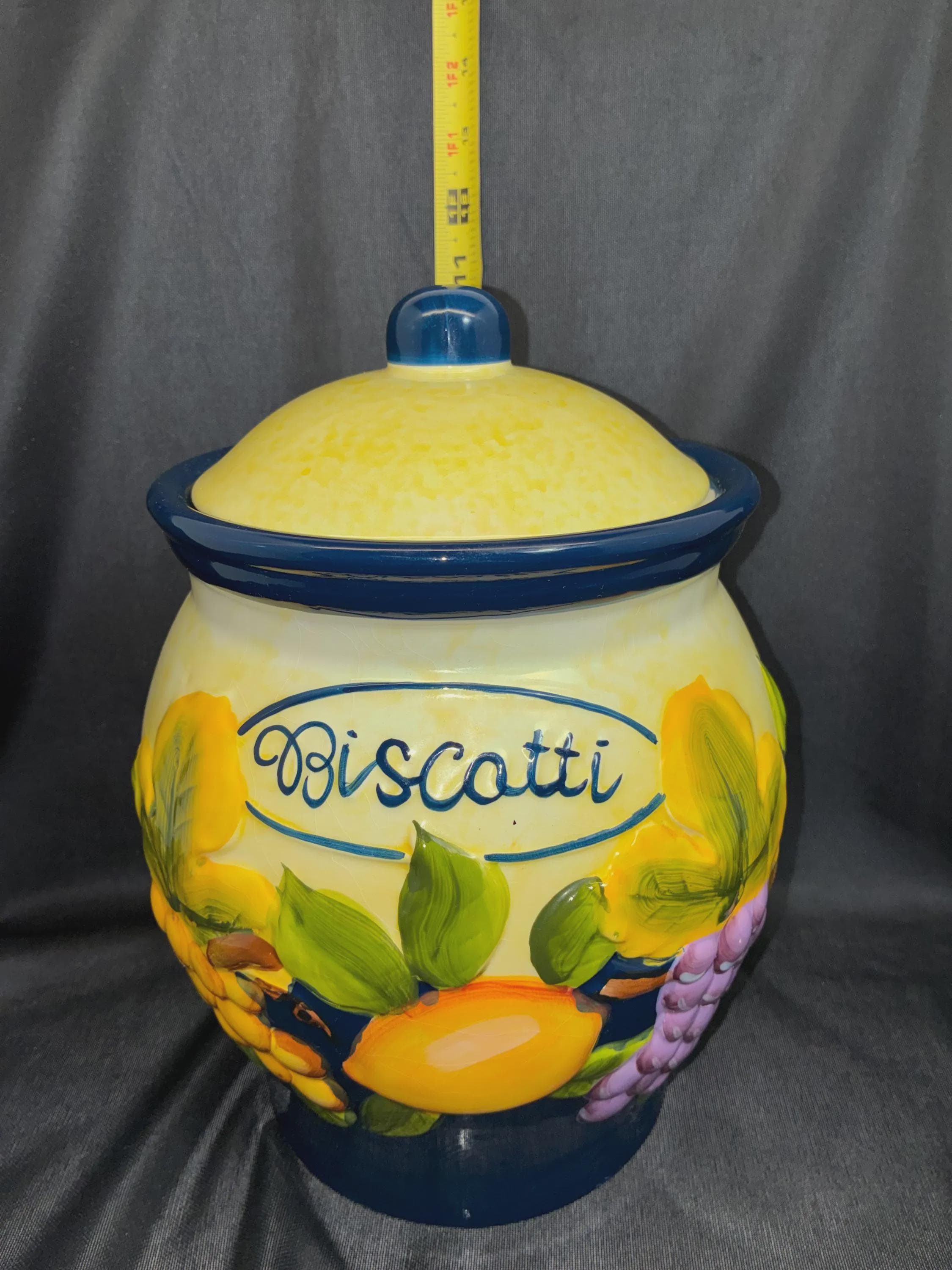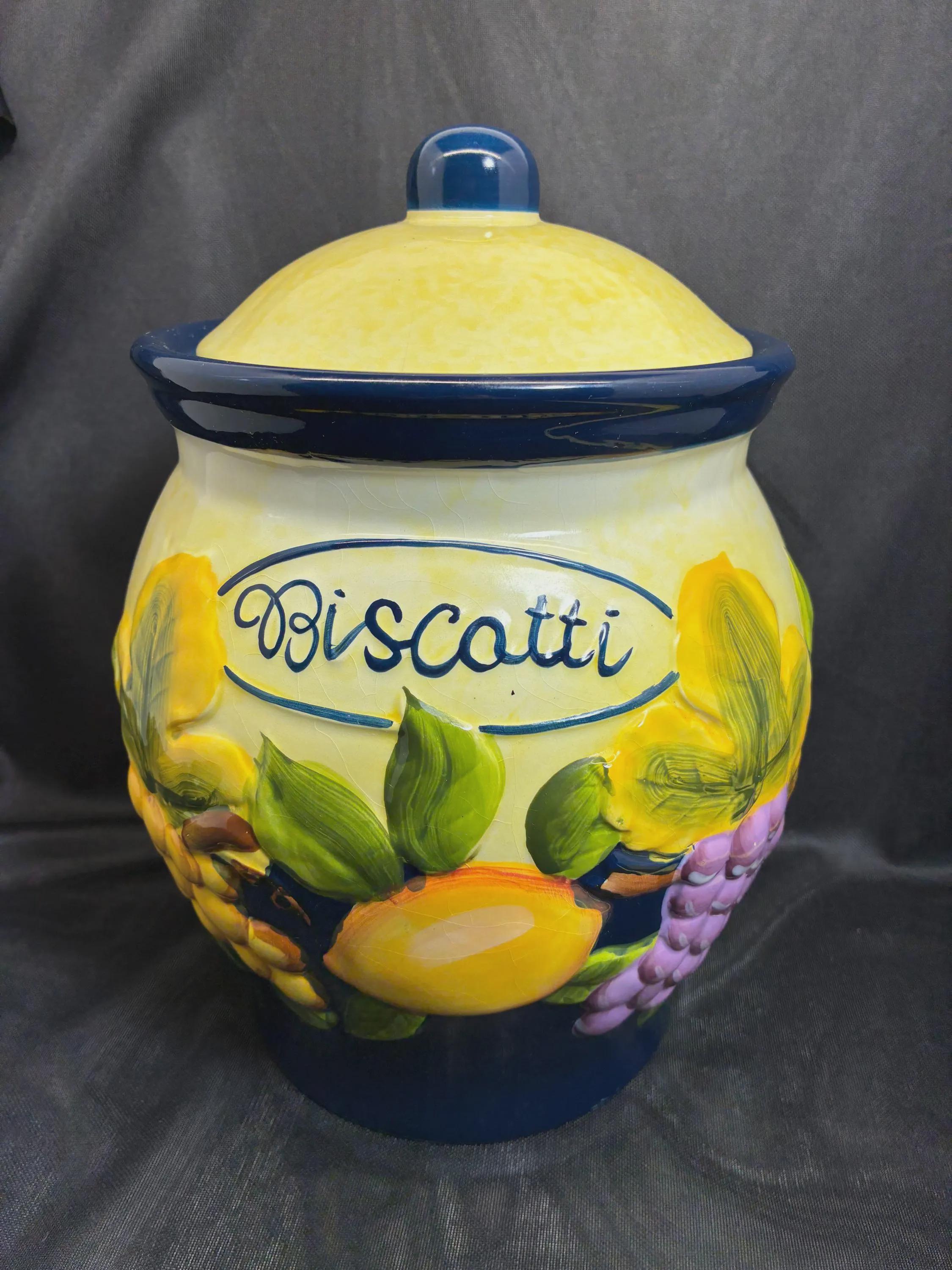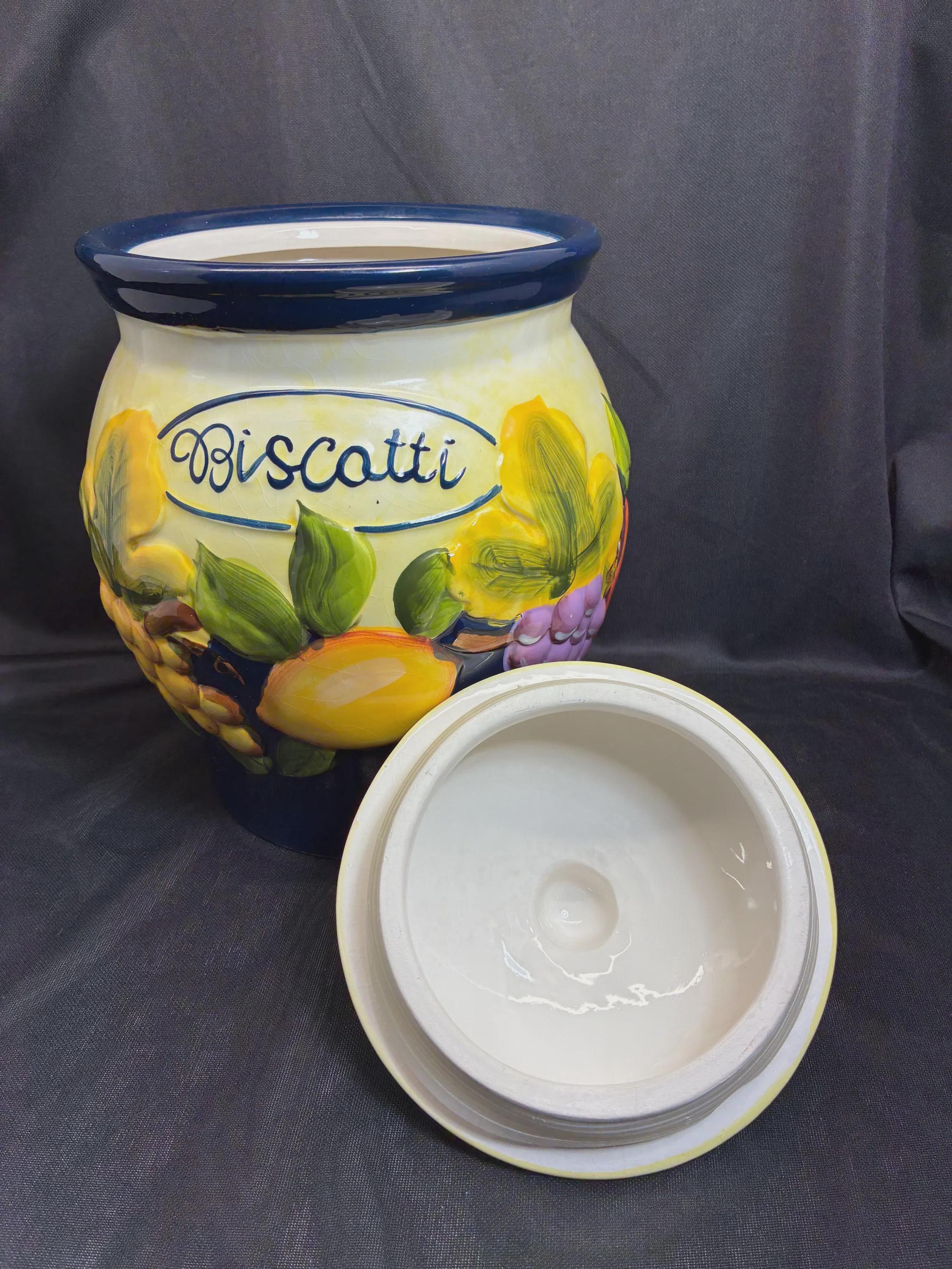 Vintage large biscotti jar hand painted for Nonni's in China. lid seal fits snuggly, raised fruits on outside of jar fruits include grapes, lemons, apples and green leaves from the 1980s era approximately 11 inches tall 8 inches in diameter excellent condition.