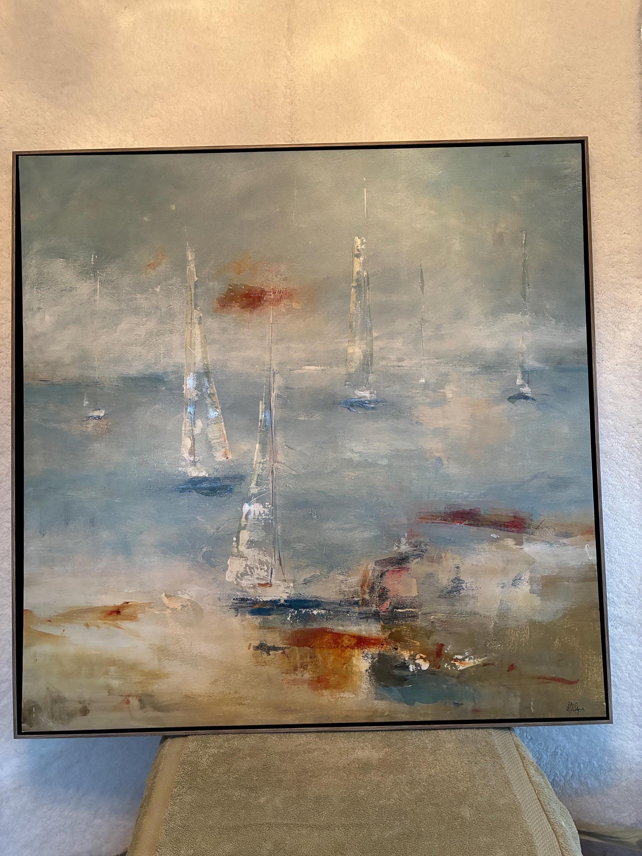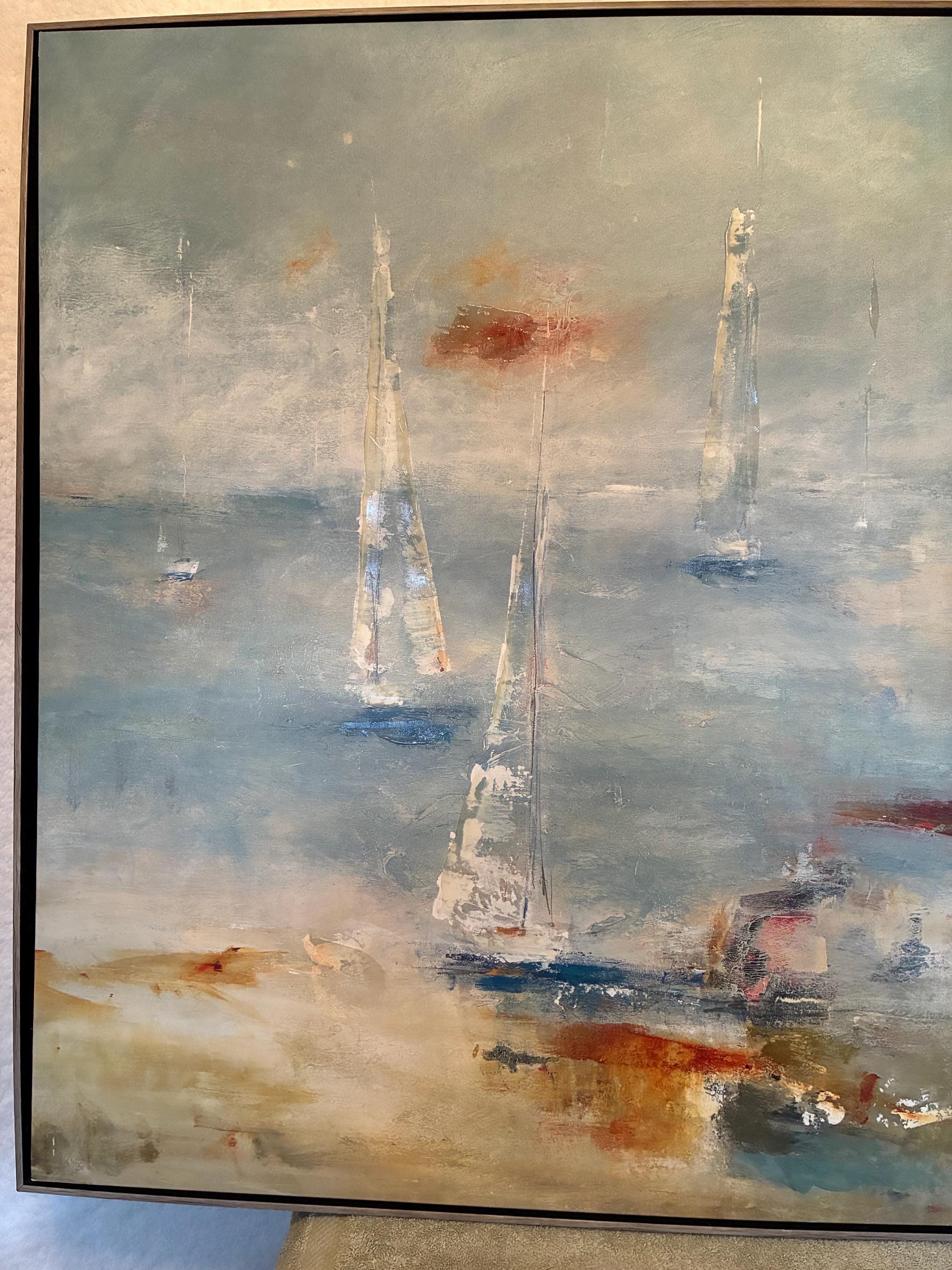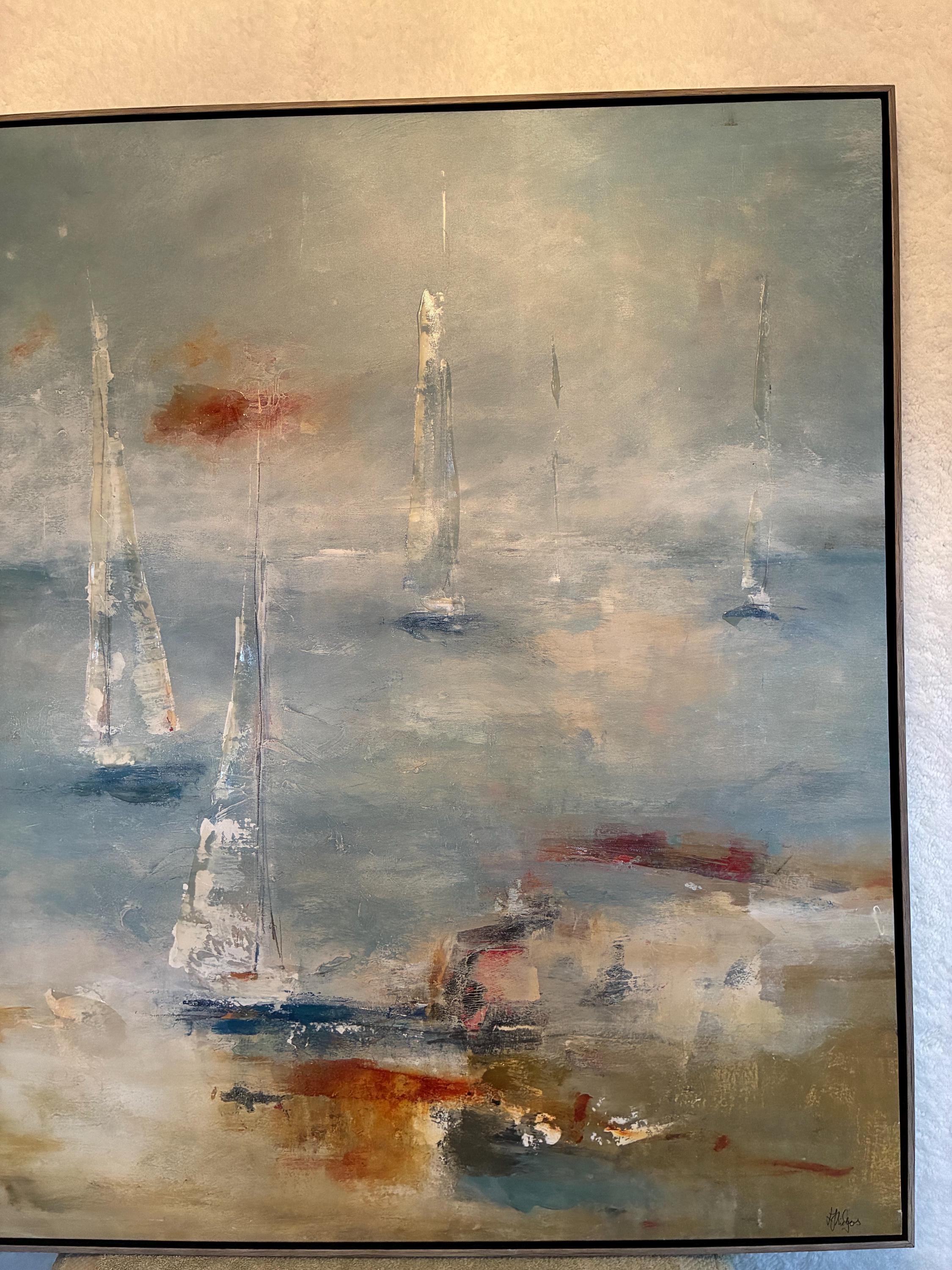 Vintage Lisa Ridger's framed graphic art print on canvas titled "sail away. The art features and impressionist painting of sailboats on the water on stretched canvas print size is approximately 36 inches x 36 inches x 2 inches in excellent condition a 1980 print.