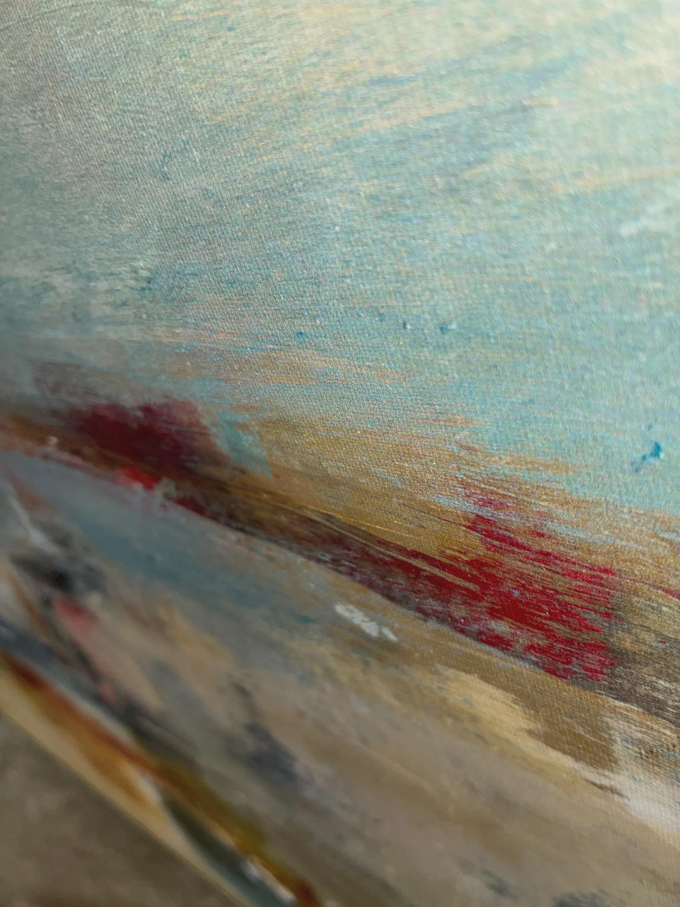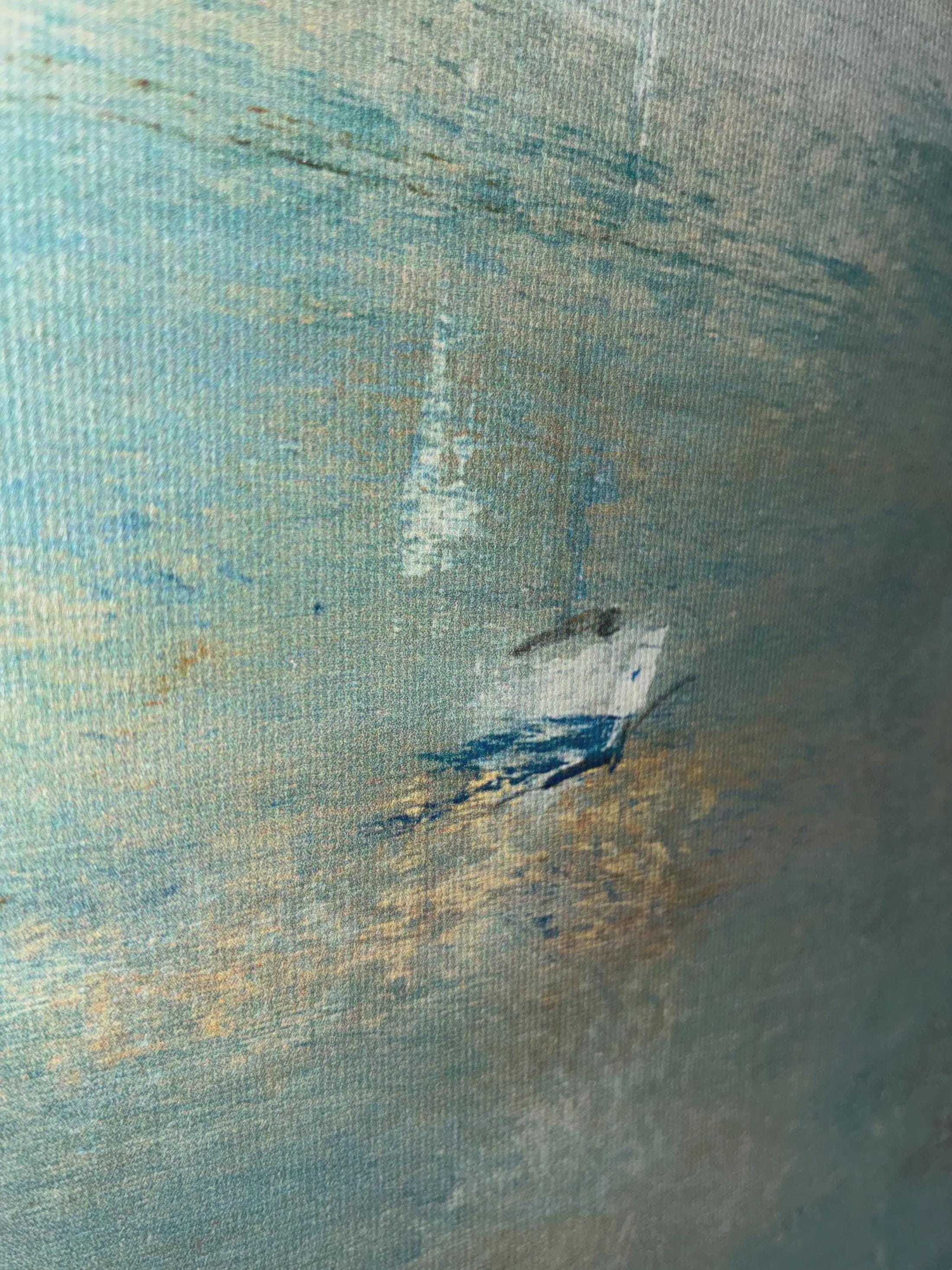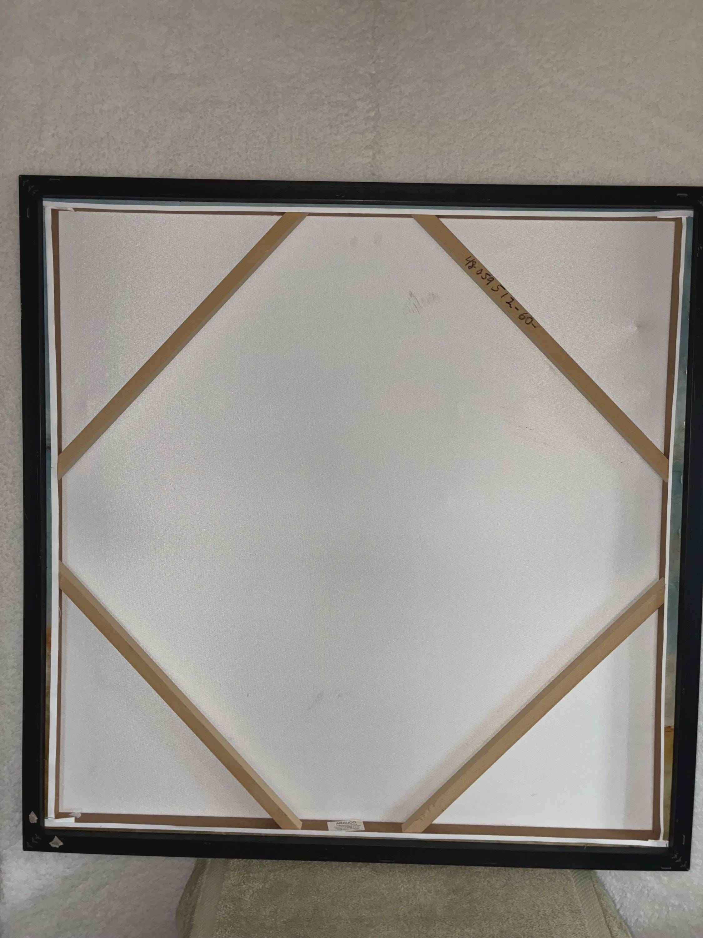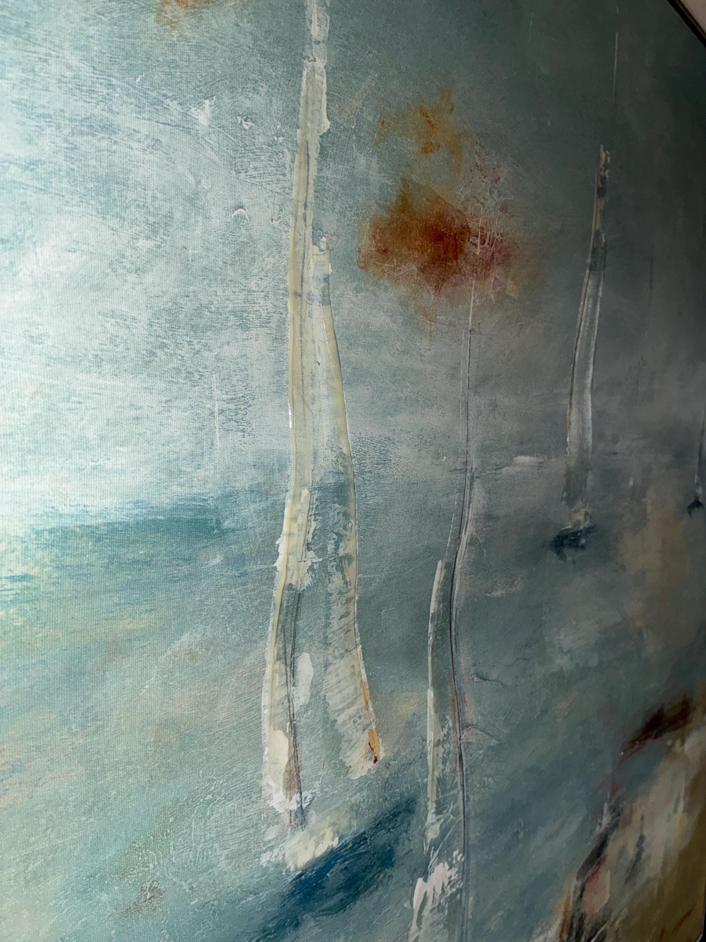 Vintage Lisa Ridger's framed graphic art print on canvas titled "sail away. The art features and impressionist painting of sailboats on the water on stretched canvas print size is approximately 36 inches x 36 inches x 2 inches in excellent condition a 1980 print.